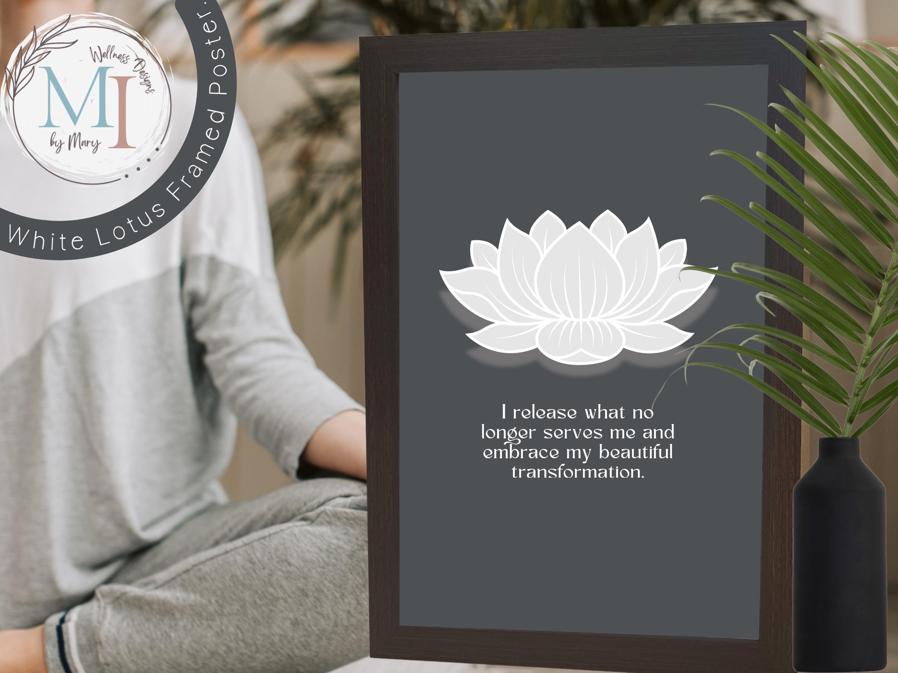 This beautifully designed framed poster features a serene white lotus on a soft gray background, symbolizing purity and transformation. The elegant white script reads: "I release what no longer serves me and embrace my beautiful transformation." Perfect for creating a calming and inspiring atmosphere in any room. 🖼️