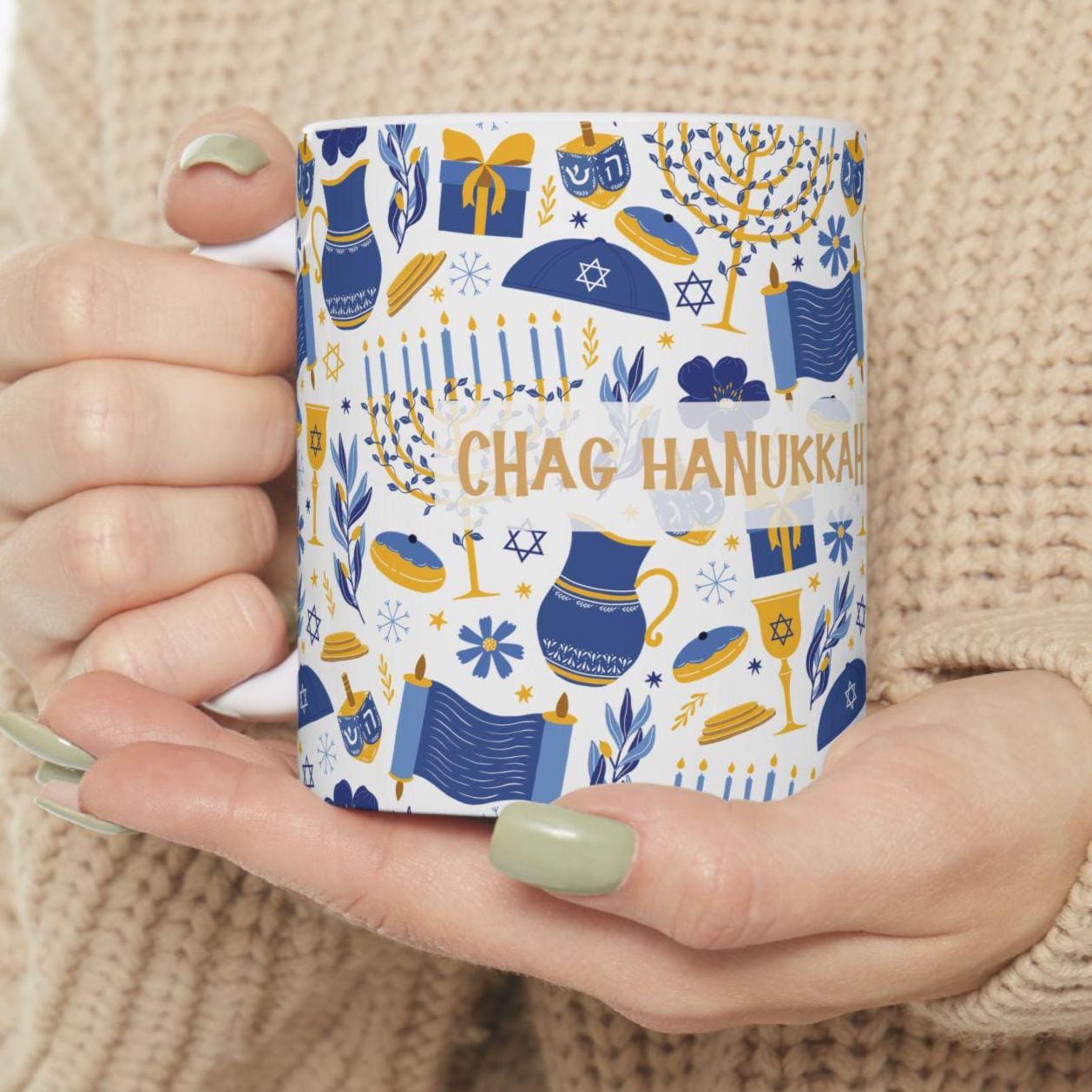 ✨ "Chag Hanukkah Sameach" – This Hebrew phrase, meaning "Happy Hanukkah," captures the joy and blessings of the holiday, making it a heartwarming and central feature of the mug design.