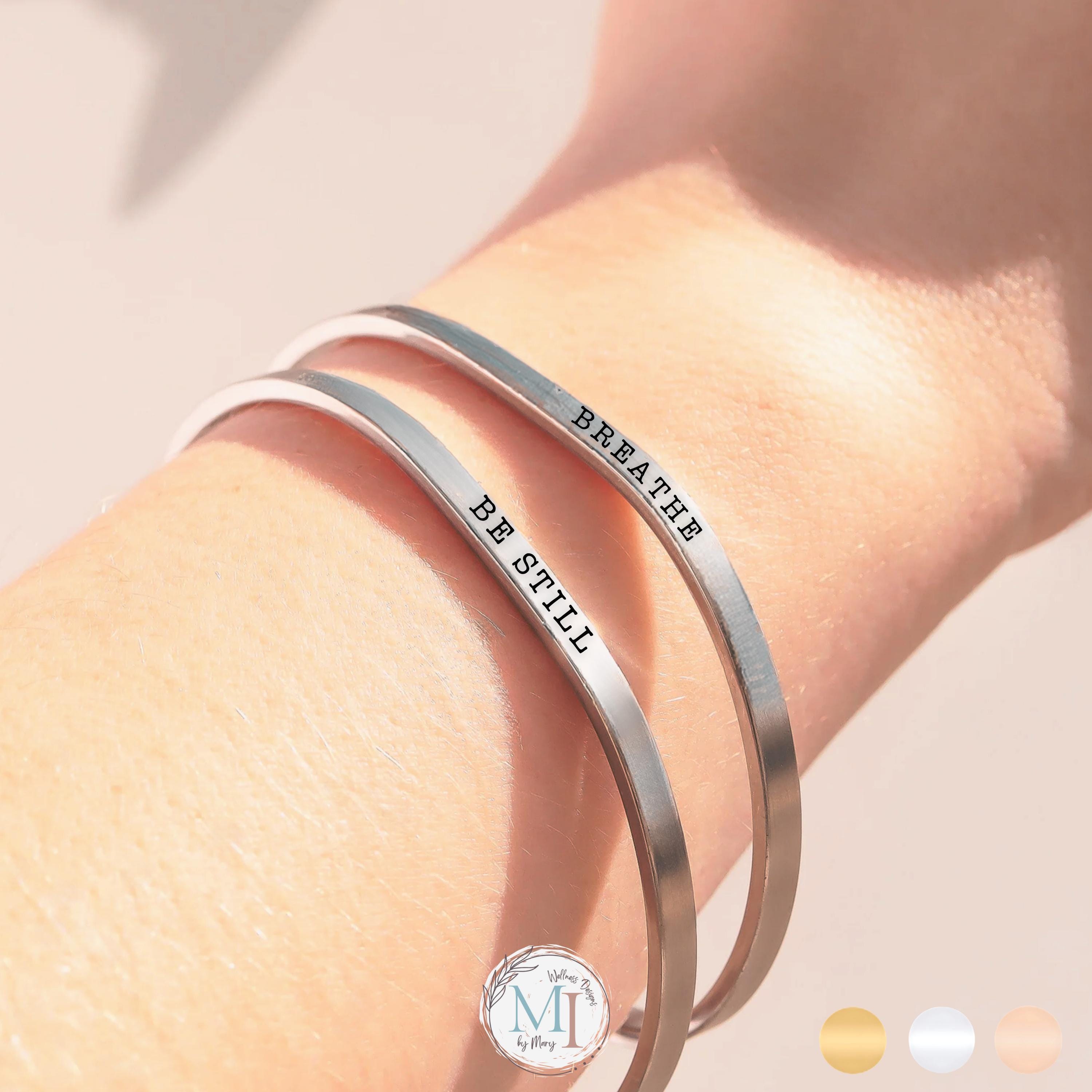 Choose your favorite motivational phrase—or create your own—with our sleek and minimal engraved cuff bracelets. Made from durable 304 stainless steel and available in silver, gold, or rose gold, these cuffs are designed to inspire and empower every day.