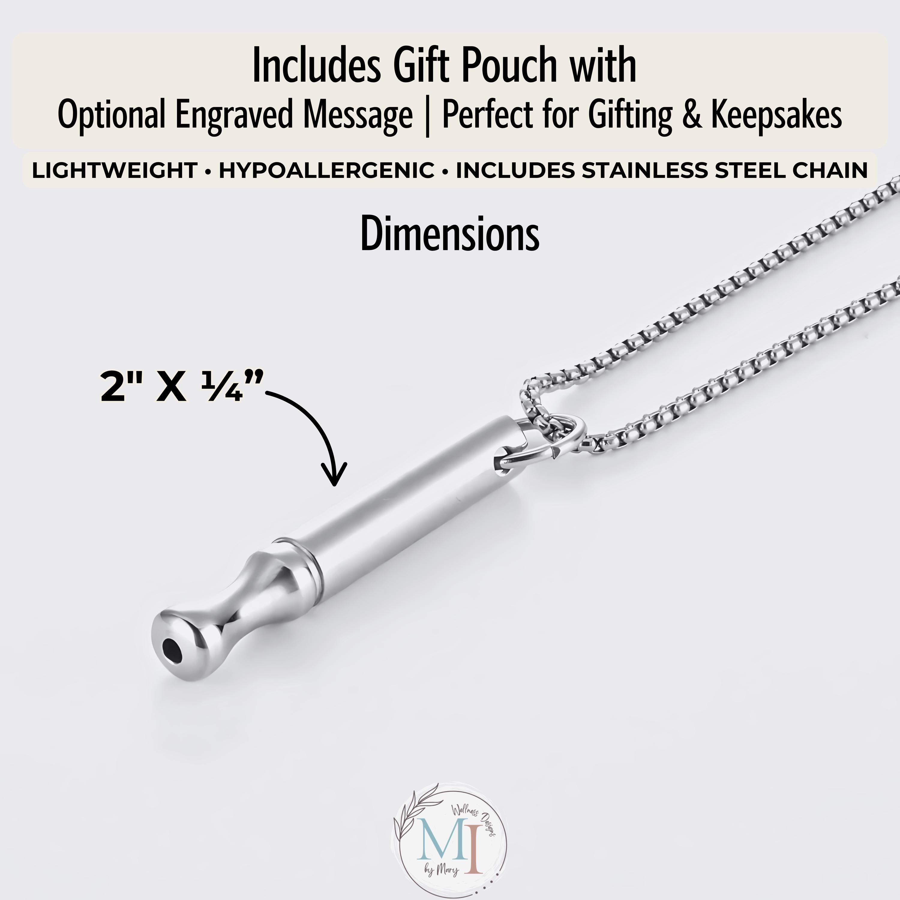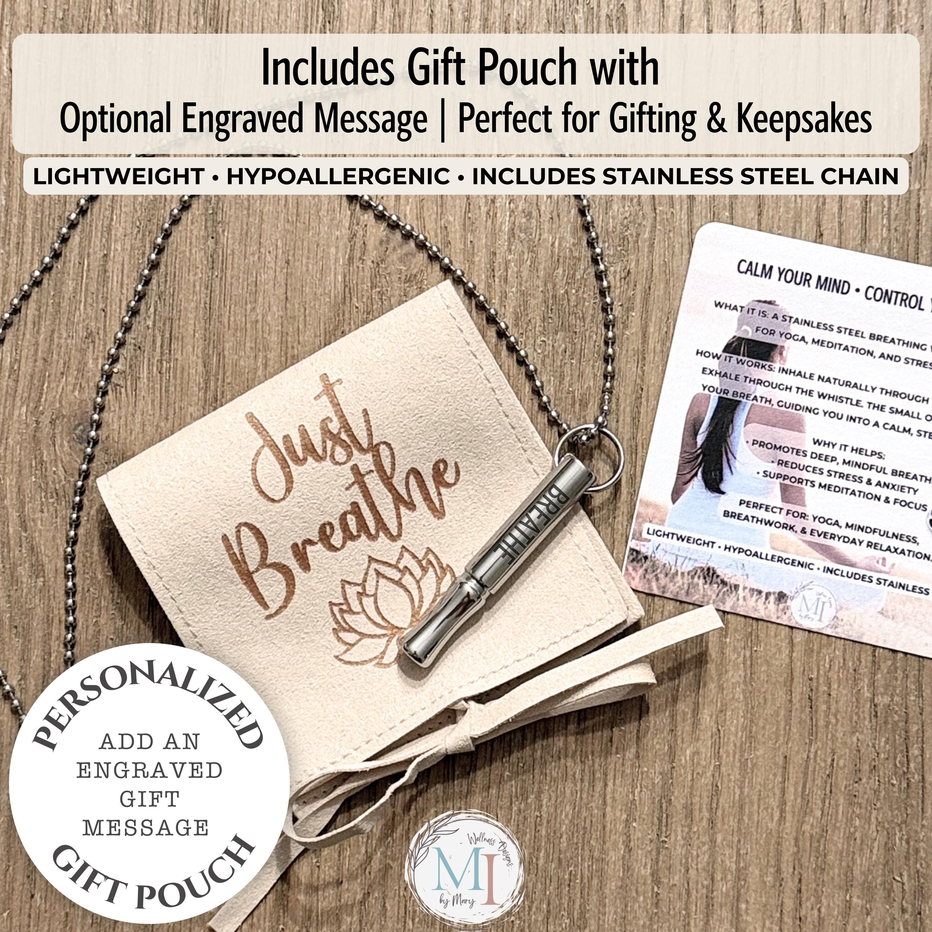 This stainless steel yoga whistle necklace is designed to slow and regulate your exhale, helping reduce stress and anxiety while promoting relaxation and mindfulness. Comes ready to gift in an engraved suede gift pouch!