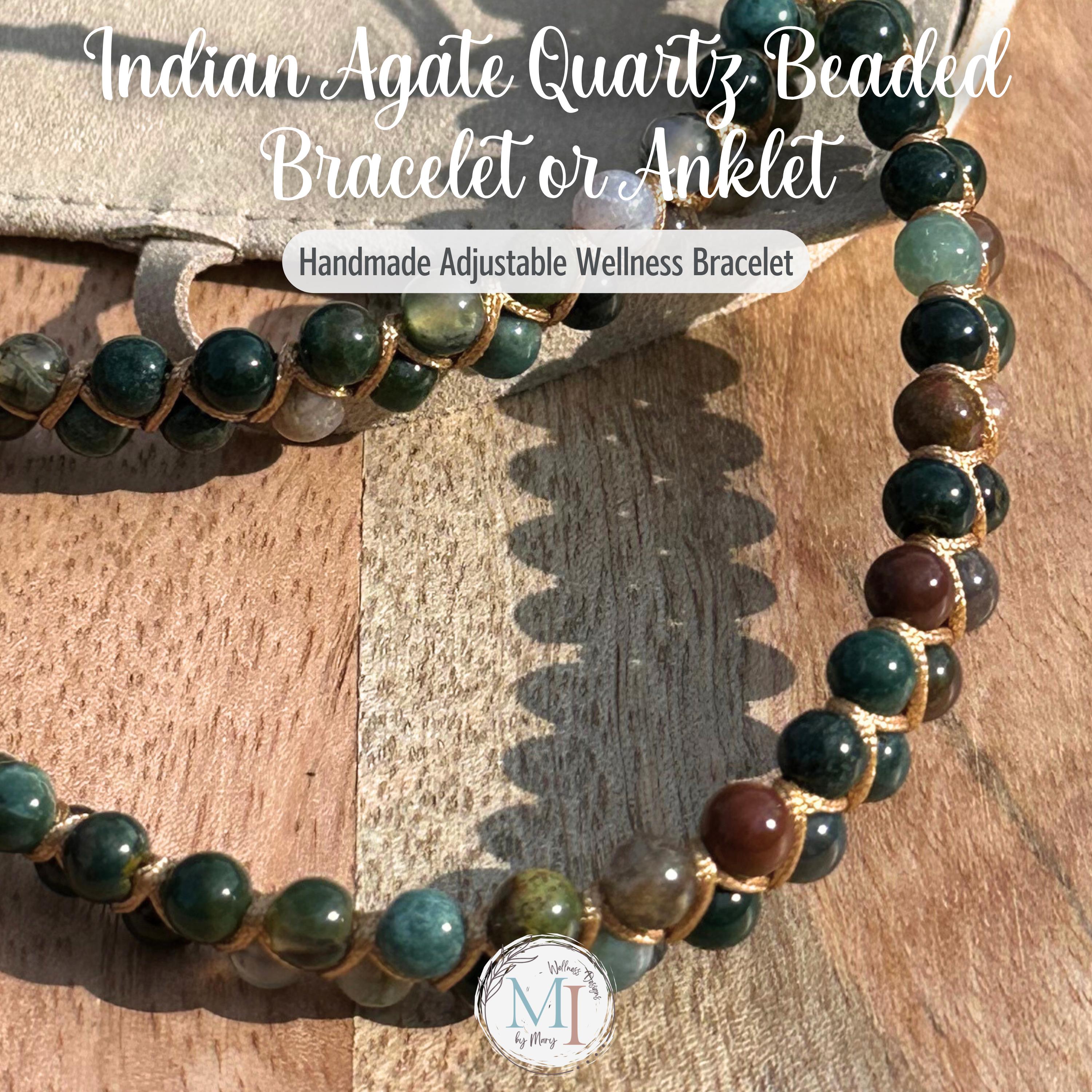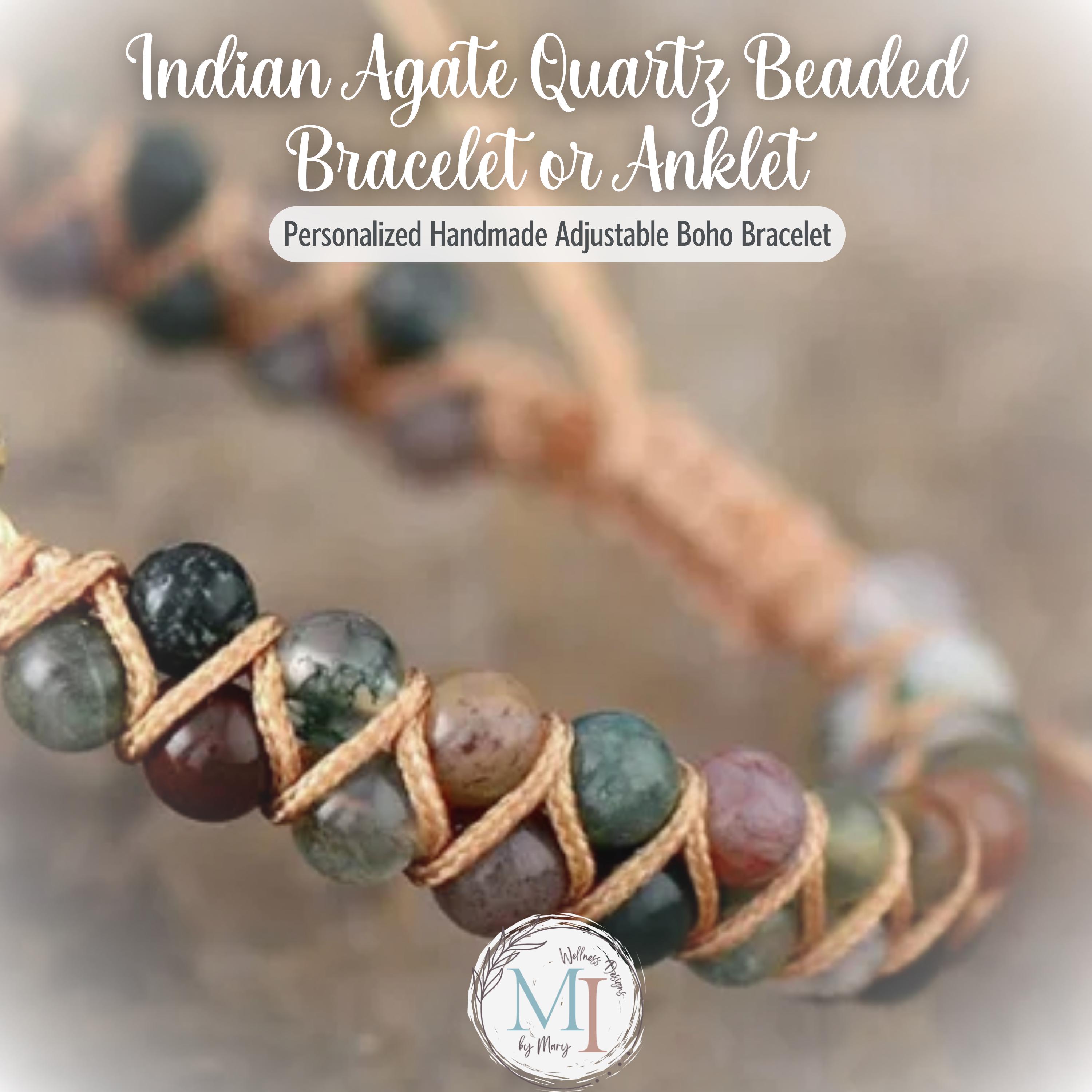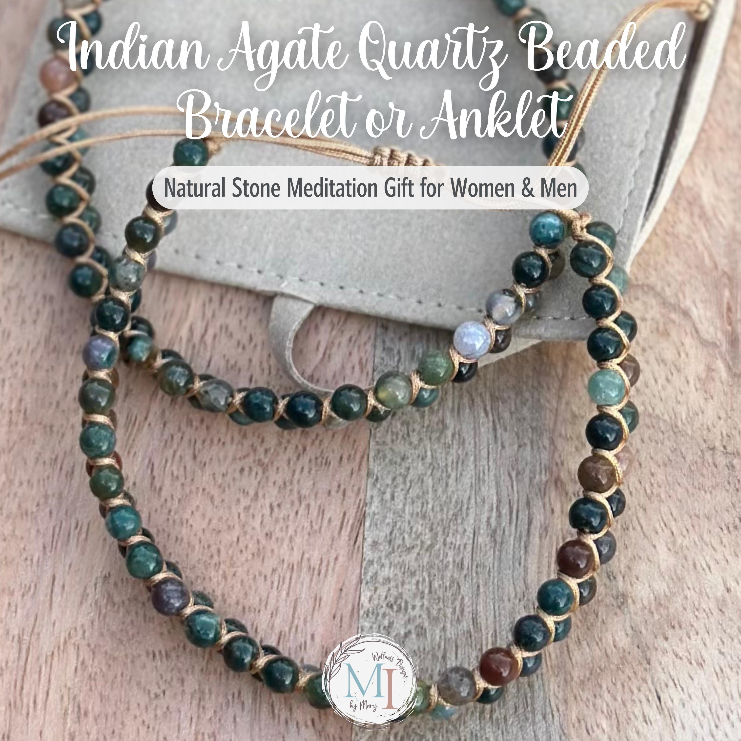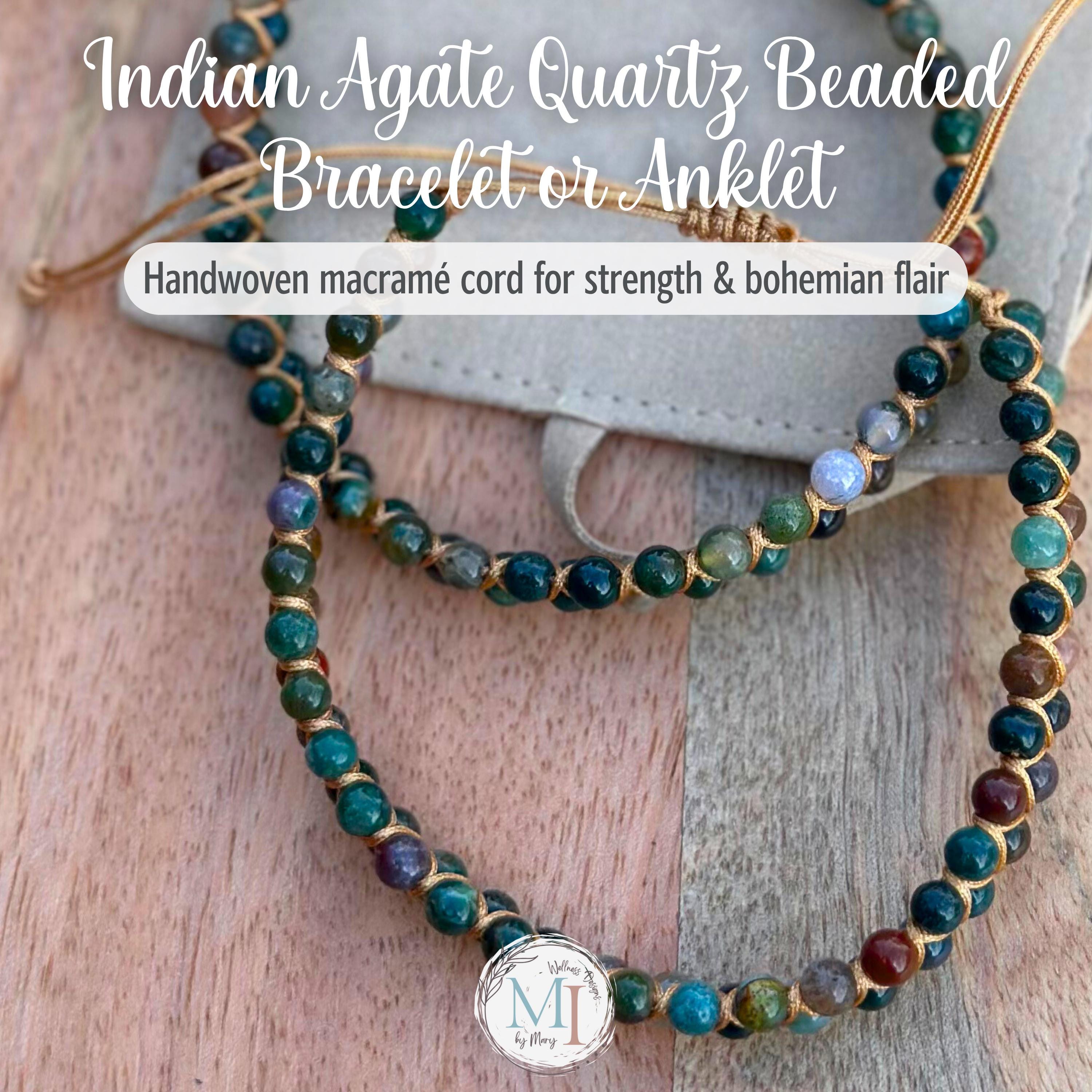 Bring balance and earthy beauty to your style with this handmade Indian Agate quartz bracelet or anklet, woven with genuine natural stone beads and durable cord. Each bead is unique, displaying shades of green, brown, red, and gold that give every piece its own character.