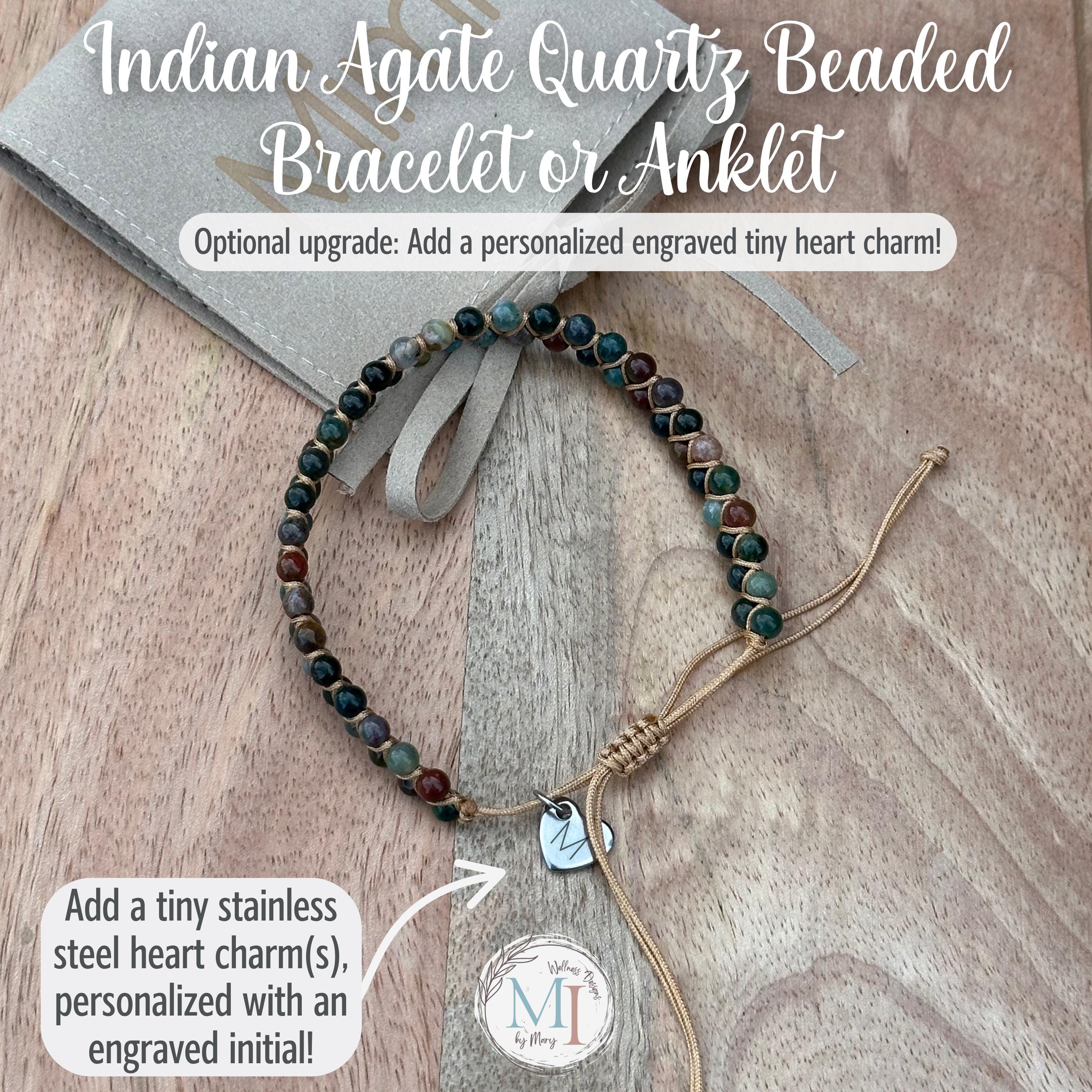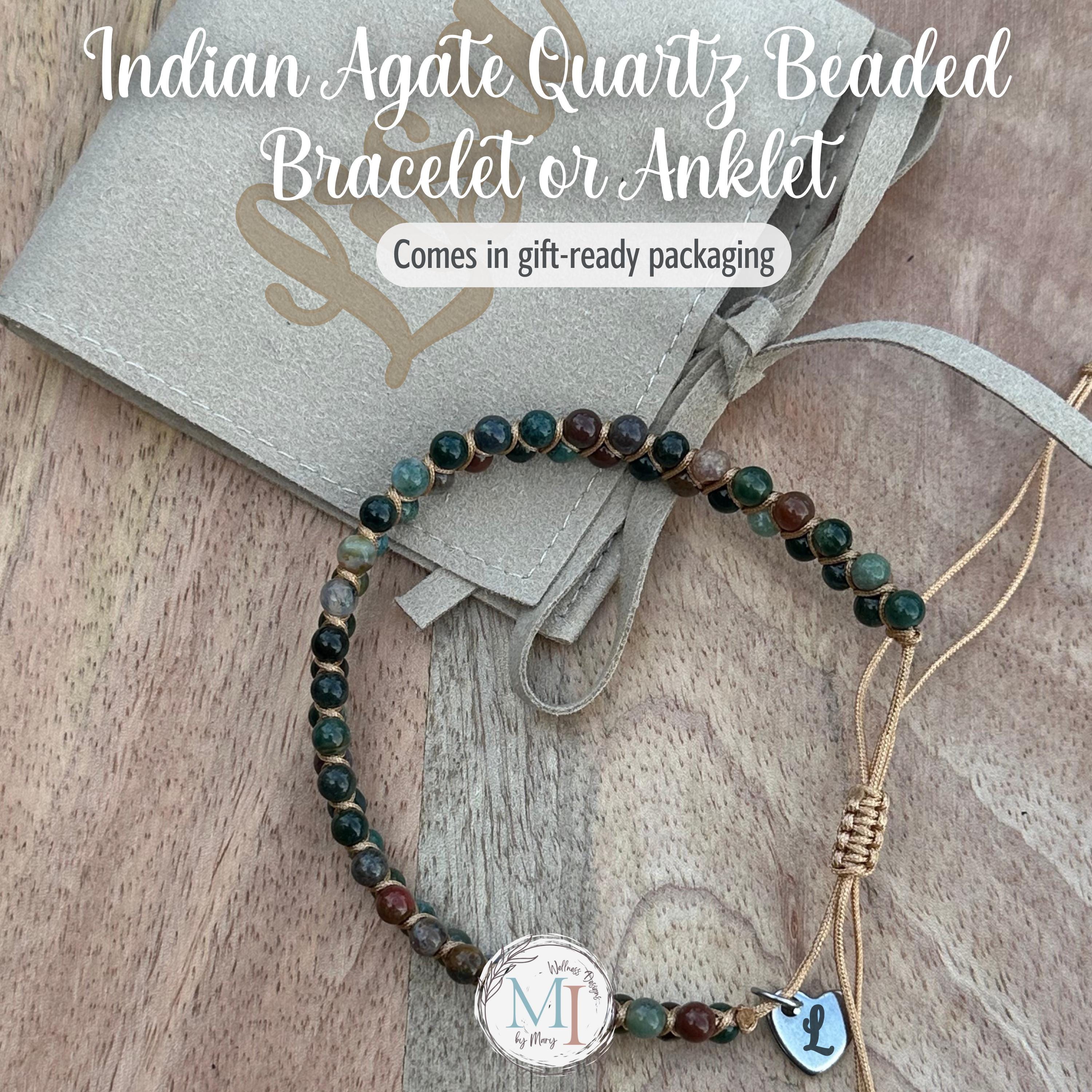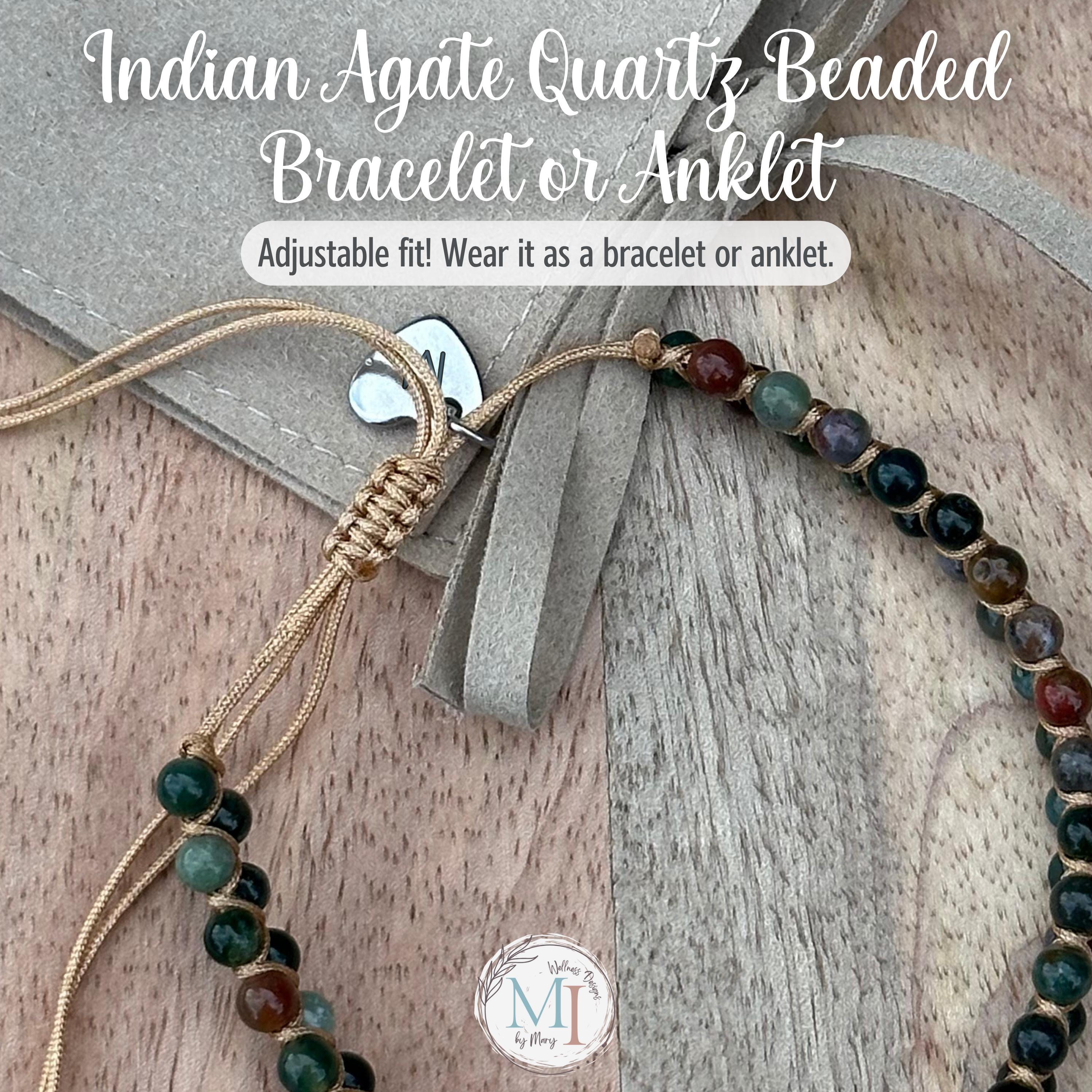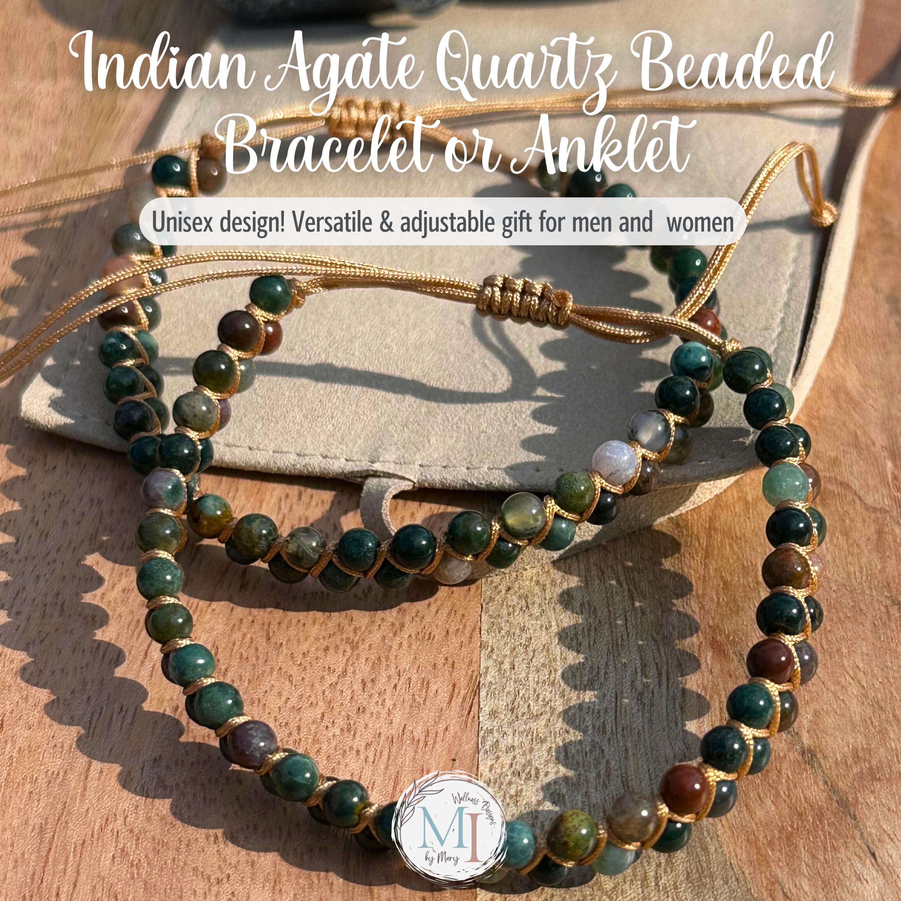 Bring balance and earthy beauty to your style with this handmade Indian Agate quartz bracelet or anklet, woven with genuine natural stone beads and durable cord. Each bead is unique, displaying shades of green, brown, red, and gold that give every piece its own character.