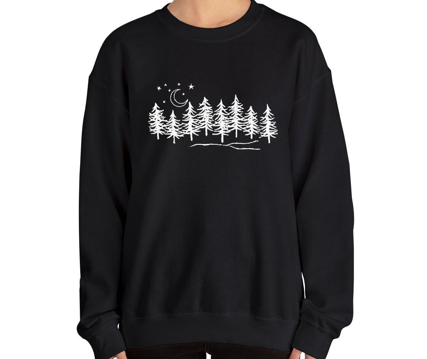 Bring the beauty of the night forest to your wardrobe with this Evergreen Treeline Embroidered Sweatshirt. Featuring a minimalist design of pine trees under the moon and stars, this cozy pullover is the perfect balance of nature and style.