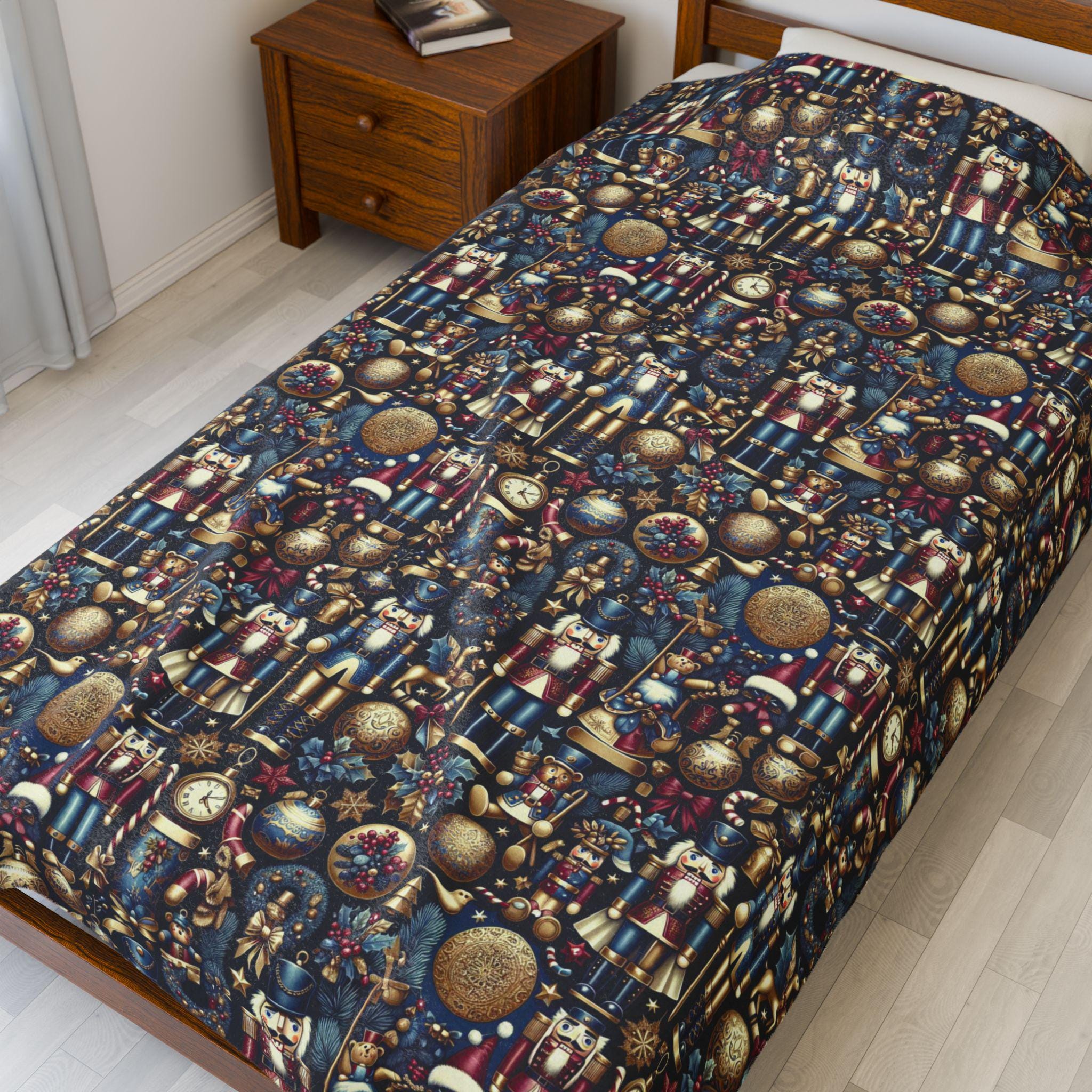 Bring timeless holiday charm into your home with this Nutcracker Fleece Blanket — a cozy, lightweight throw that’s as beautiful as it is practical. Featuring an elegant nutcracker pattern with classic holiday icons, this soft fleece blanket adds warmth, style, and nostalgia to any room. Perfect for curling up with a book, layering on the bed, or gifting to someone special this season.