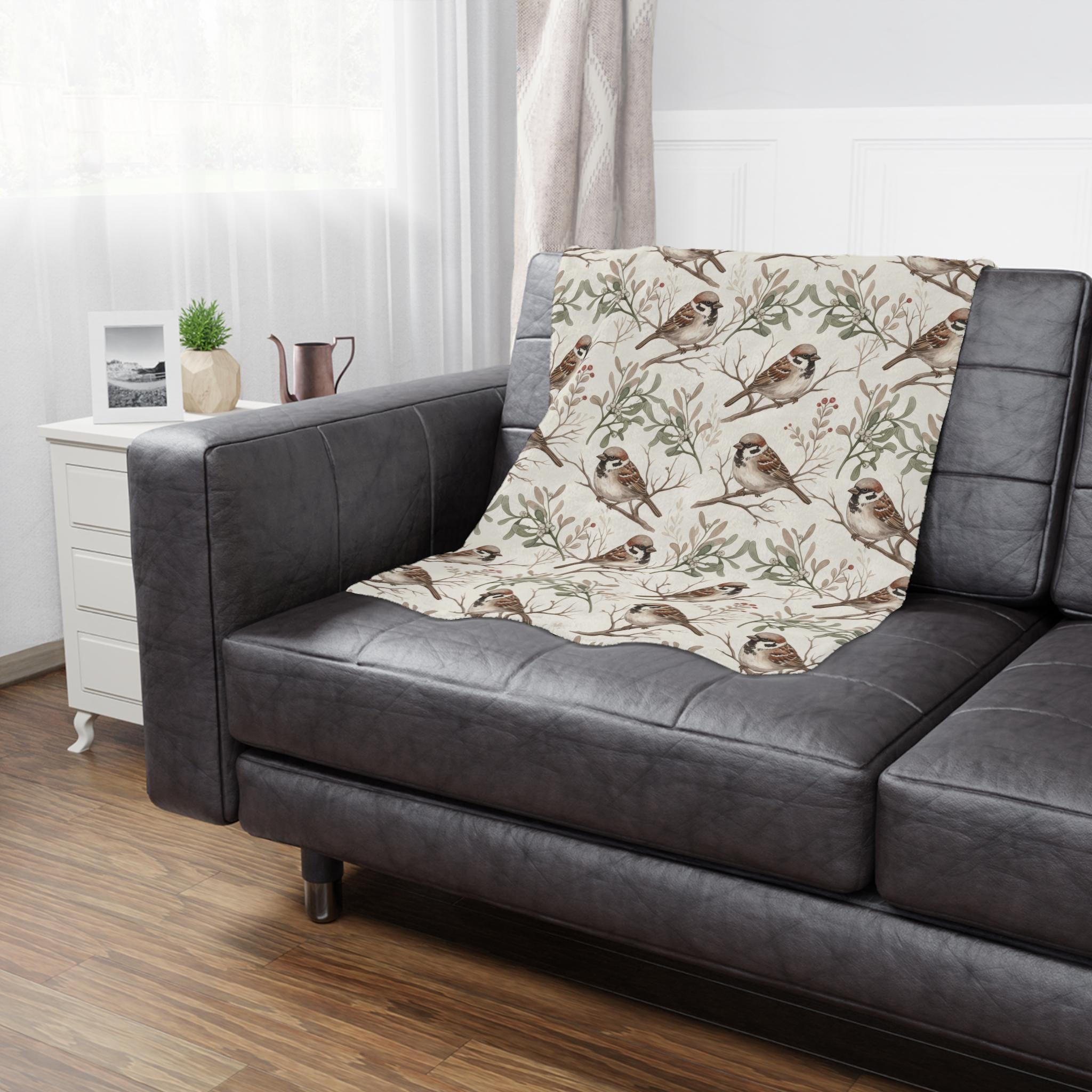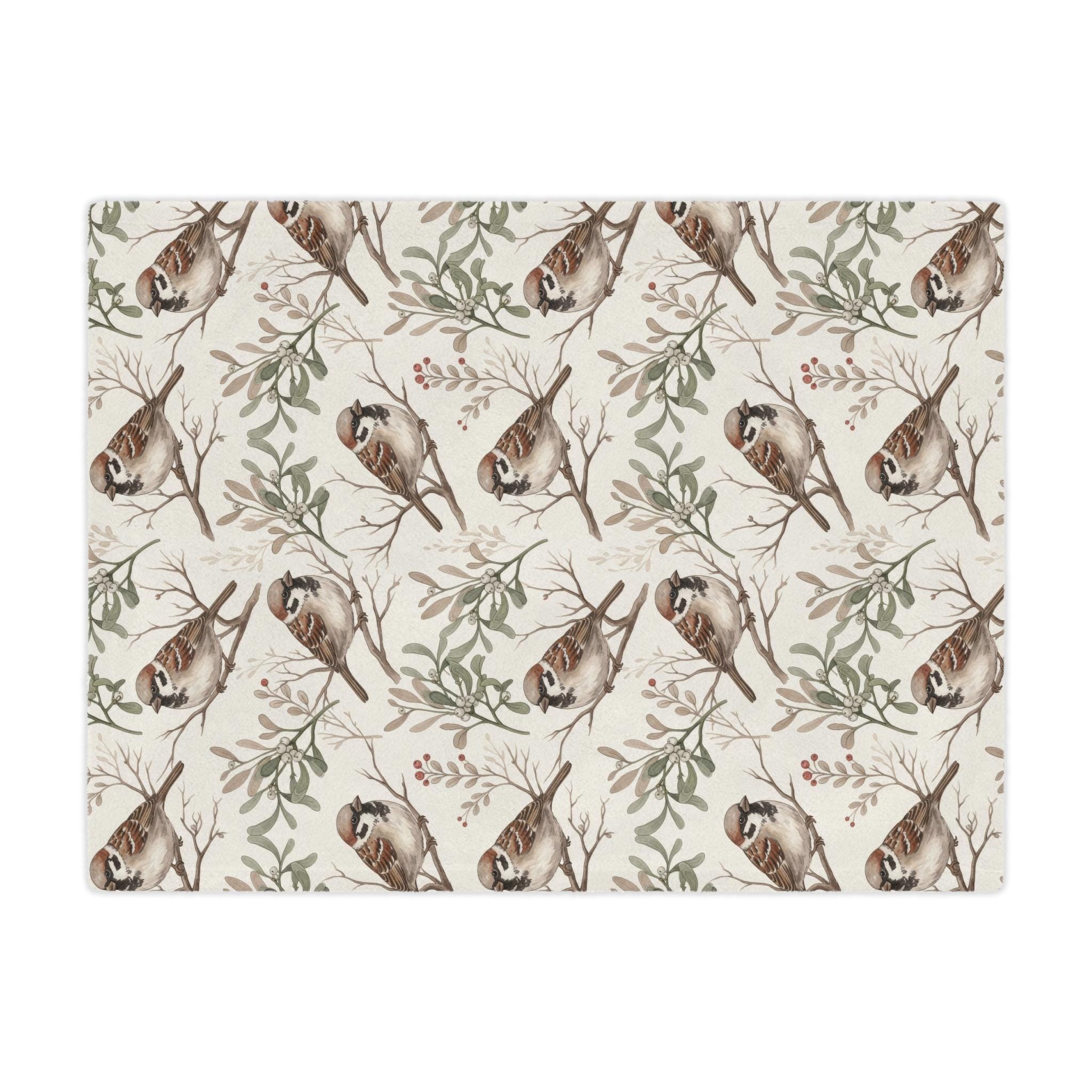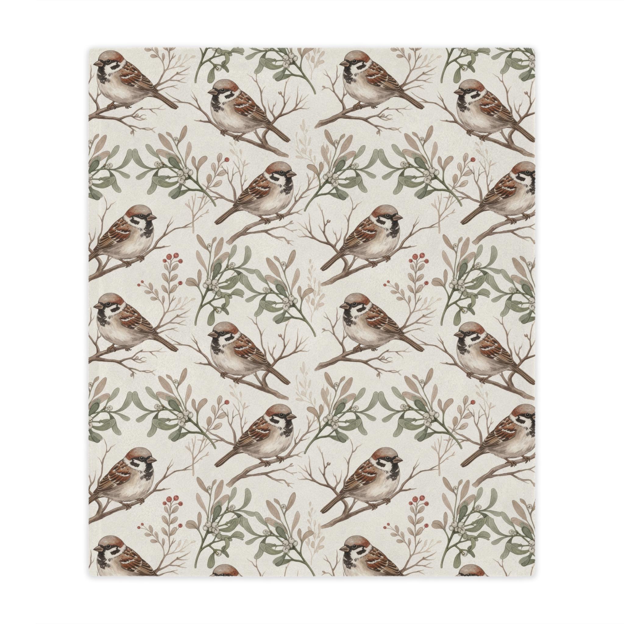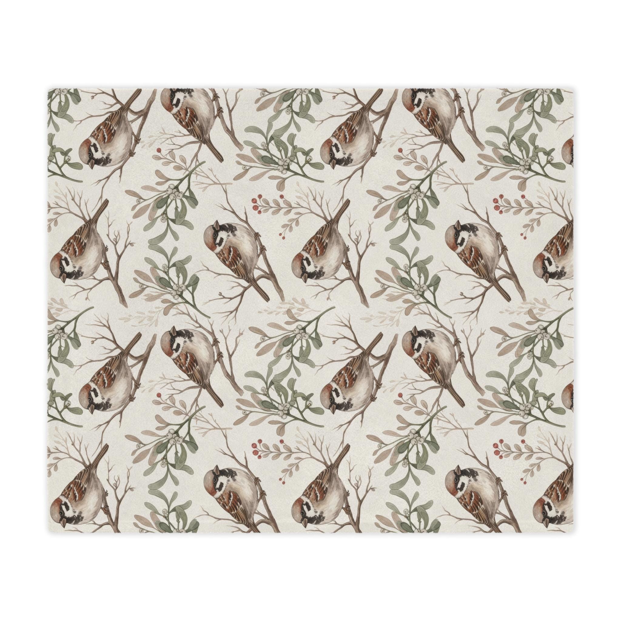 Each blanket showcases soft watercolor tones of brown, sage, and cream with sweet sparrows perched among mistletoe and delicate branches — bringing a touch of the outdoors inside for a calming, organic look.