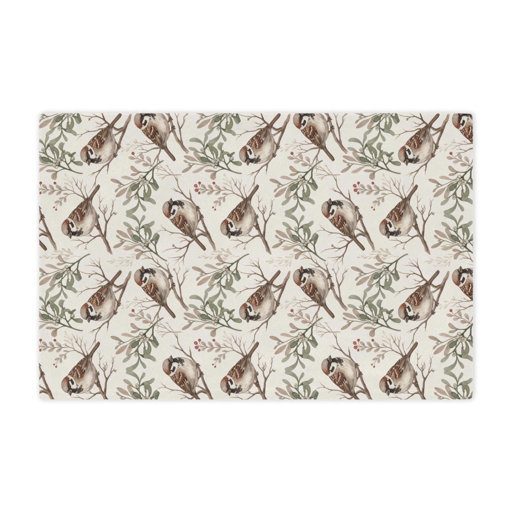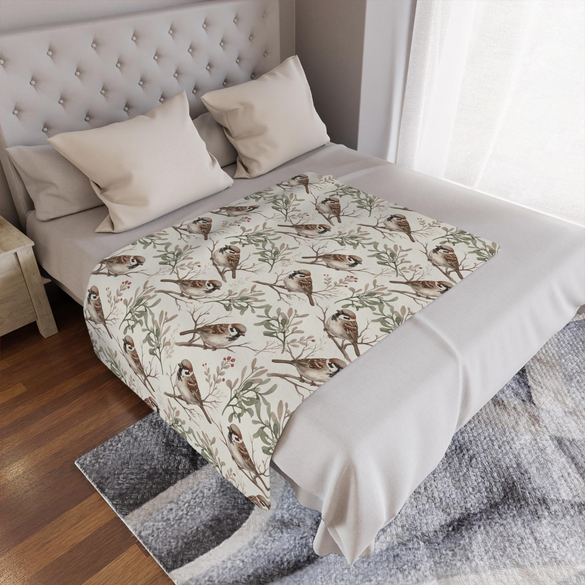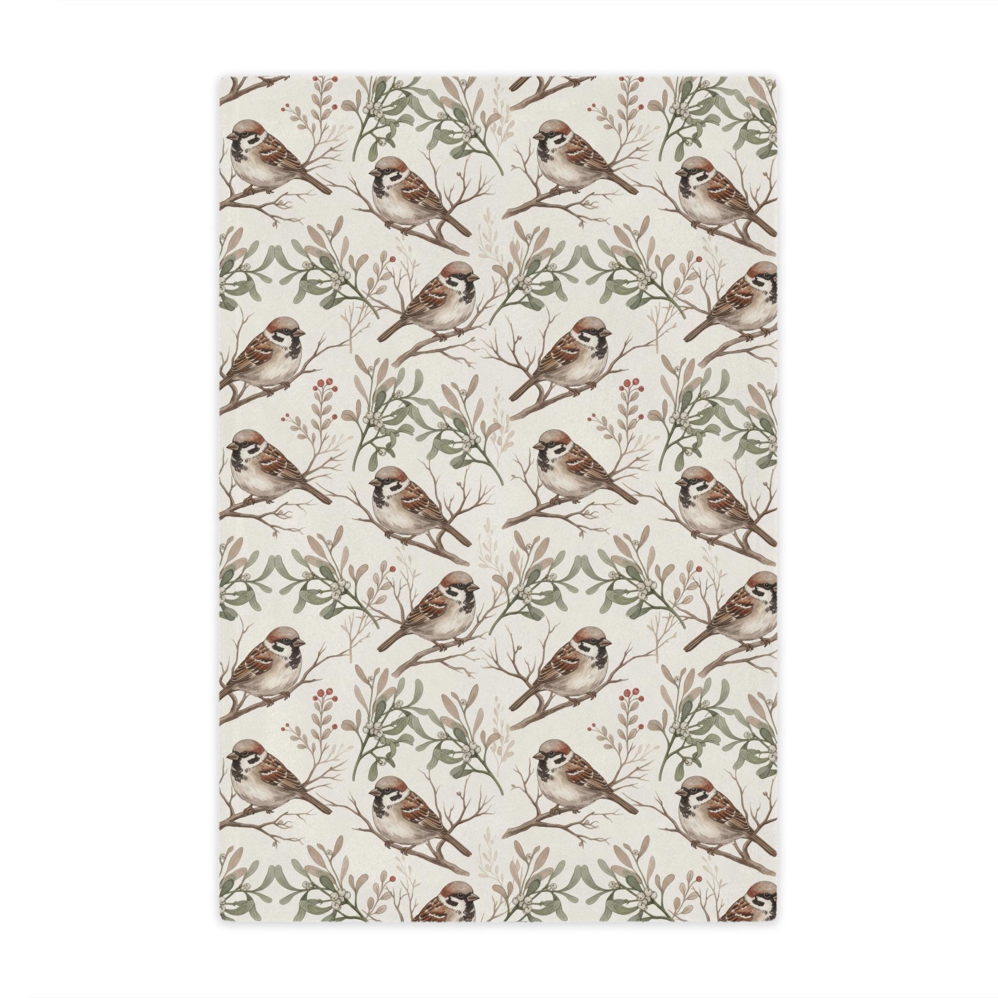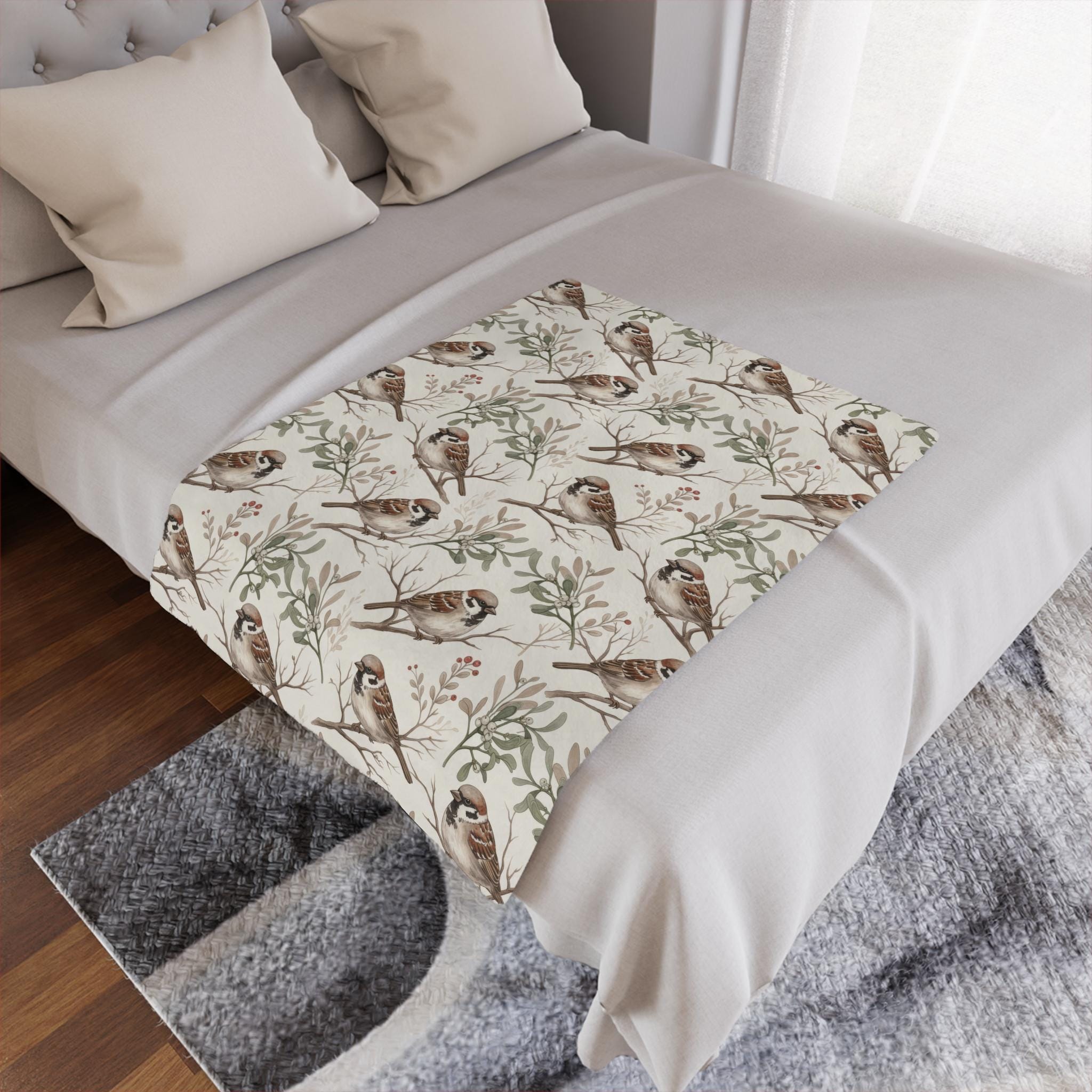 Each blanket showcases soft watercolor tones of brown, sage, and cream with sweet sparrows perched among mistletoe and delicate branches — bringing a touch of the outdoors inside for a calming, organic look.