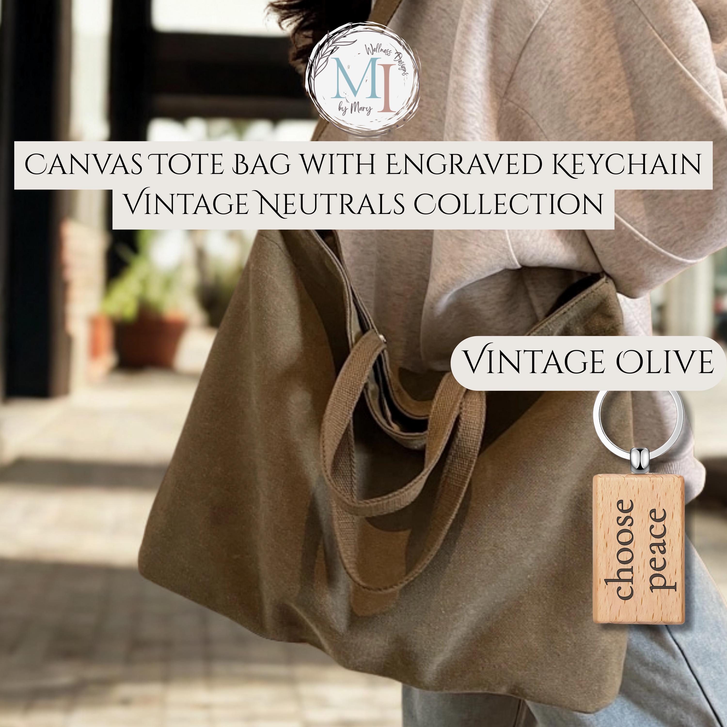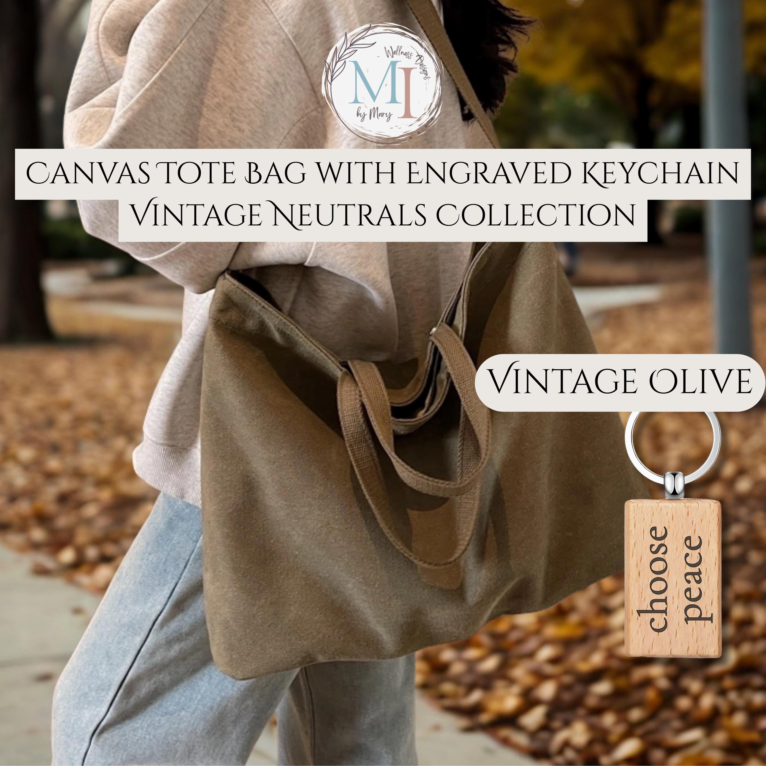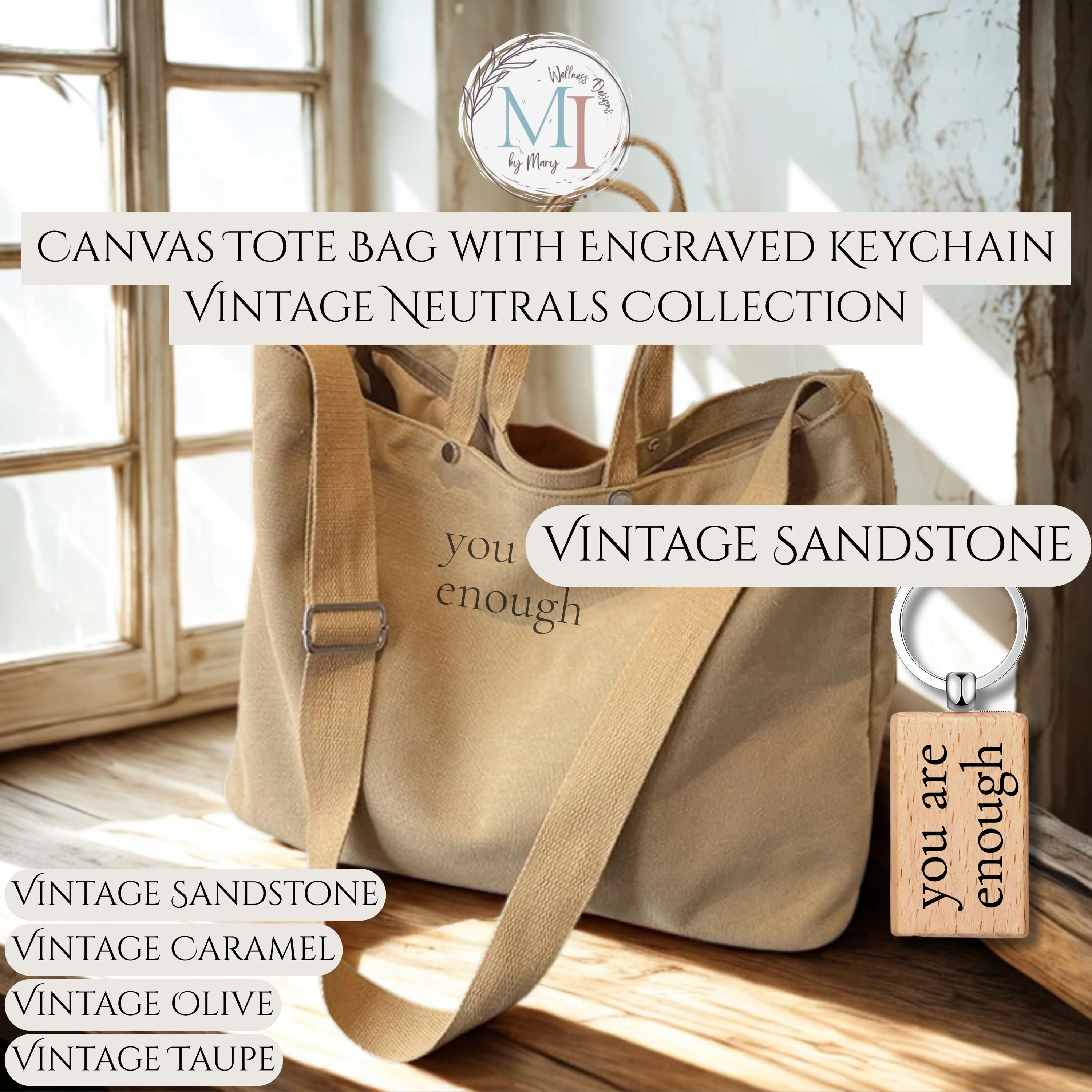 This personalized sublimation canvas tote bag features a minimalist affirmation design permanently infused into the fabric, paired with a matching engraved wood keychain. Designed in timeless vintage neutrals, this everyday tote blends calm design with practical function.