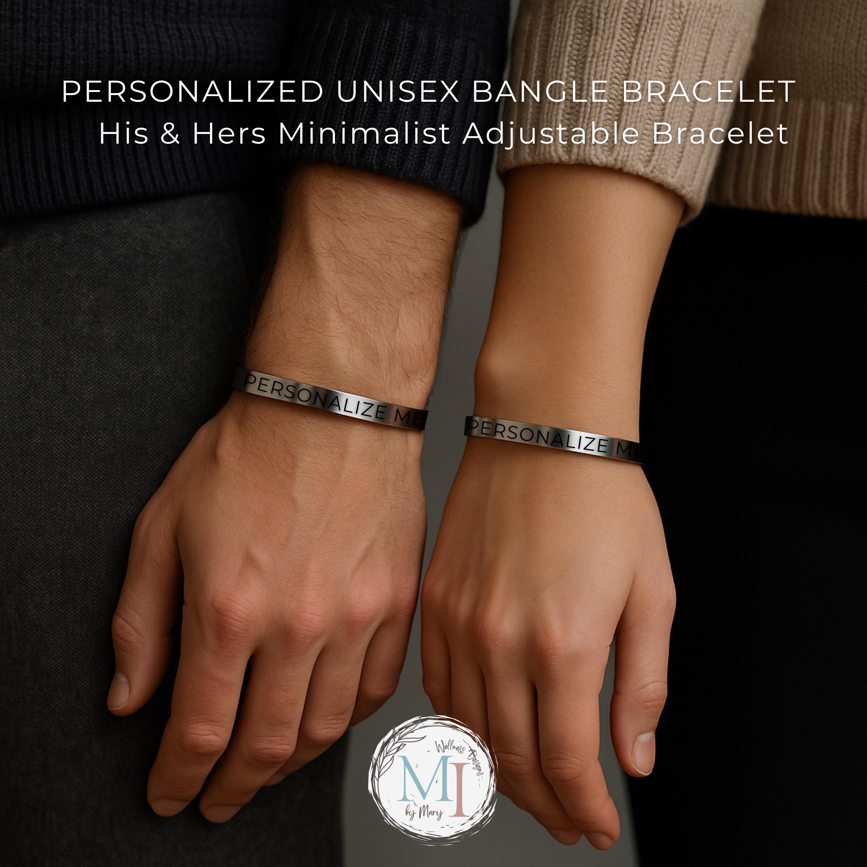 Our personalized engraved bangle bracelets are crafted from premium 304 stainless steel — hypoallergenic, anti-tarnish, and water-resistant — designed to last through everyday wear. Each bracelet is adjustable for a comfortable fit and can be engraved inside, outside, or on both sides with your choice of text, initials, coordinates, or symbols.