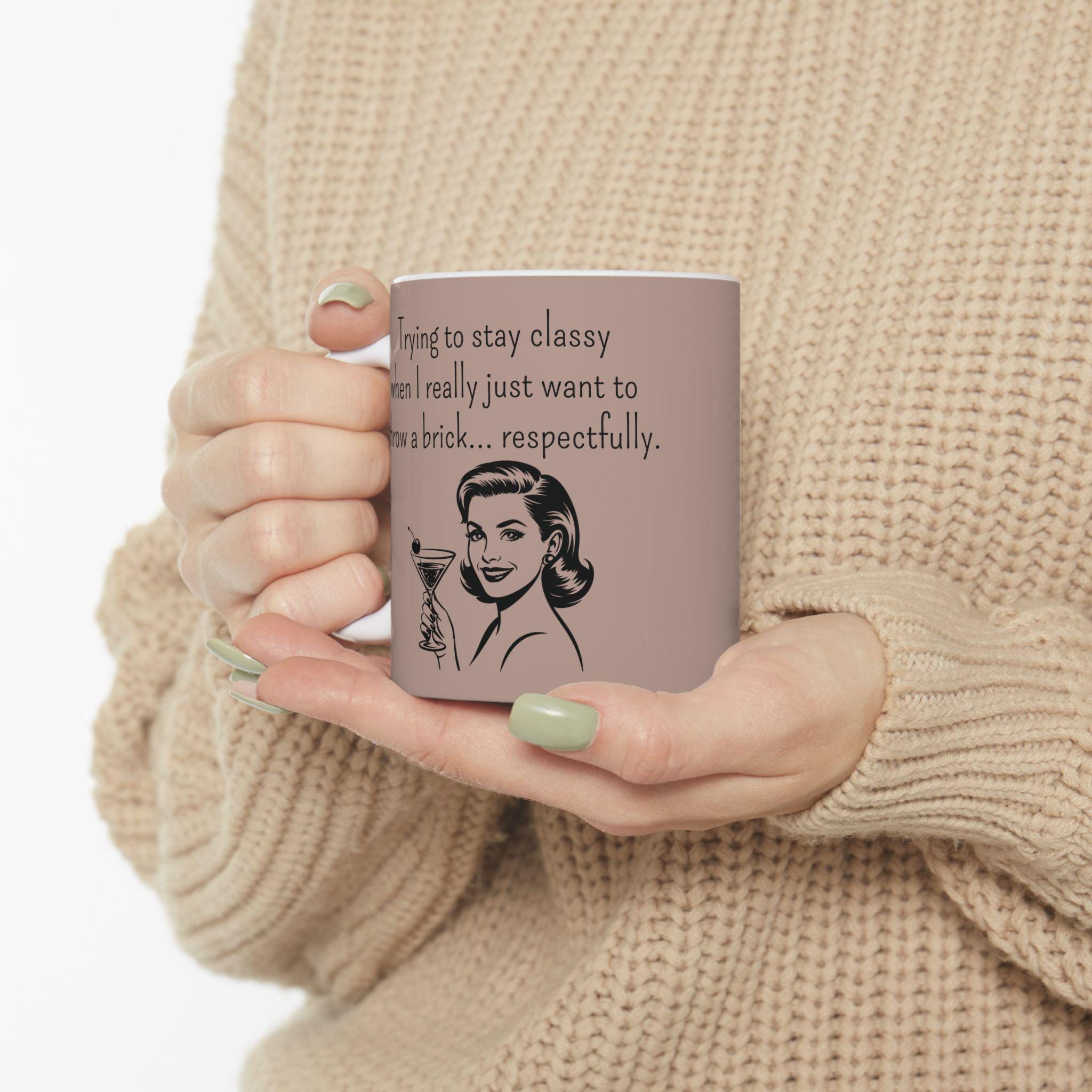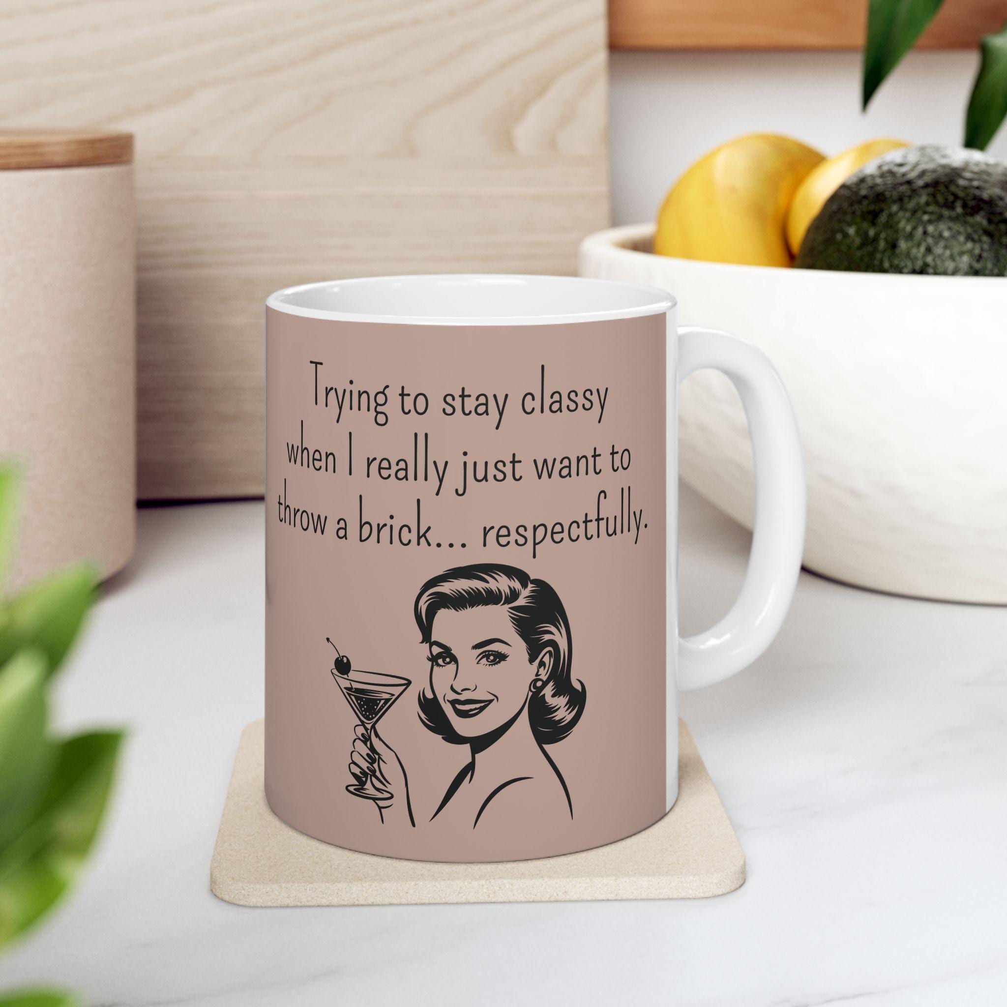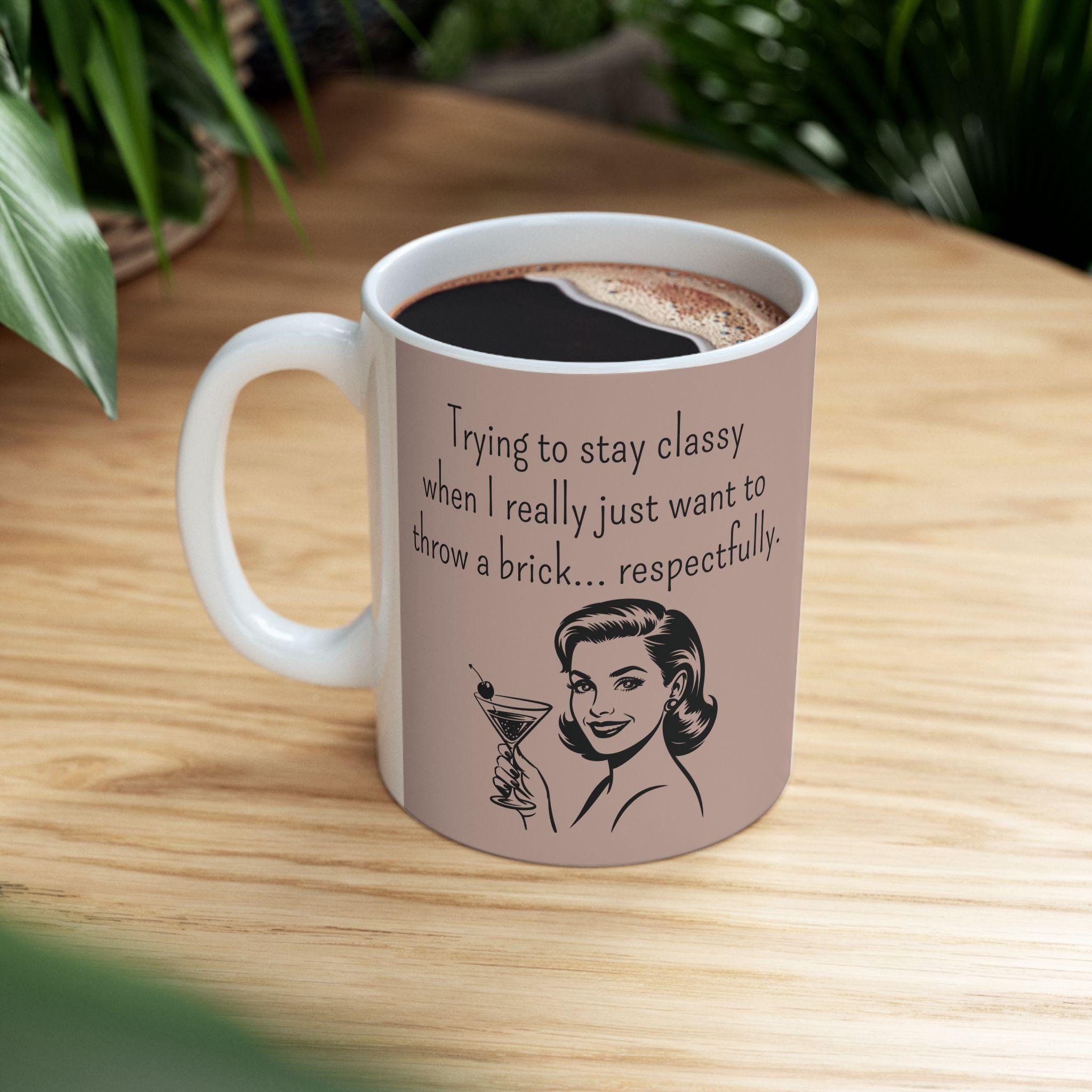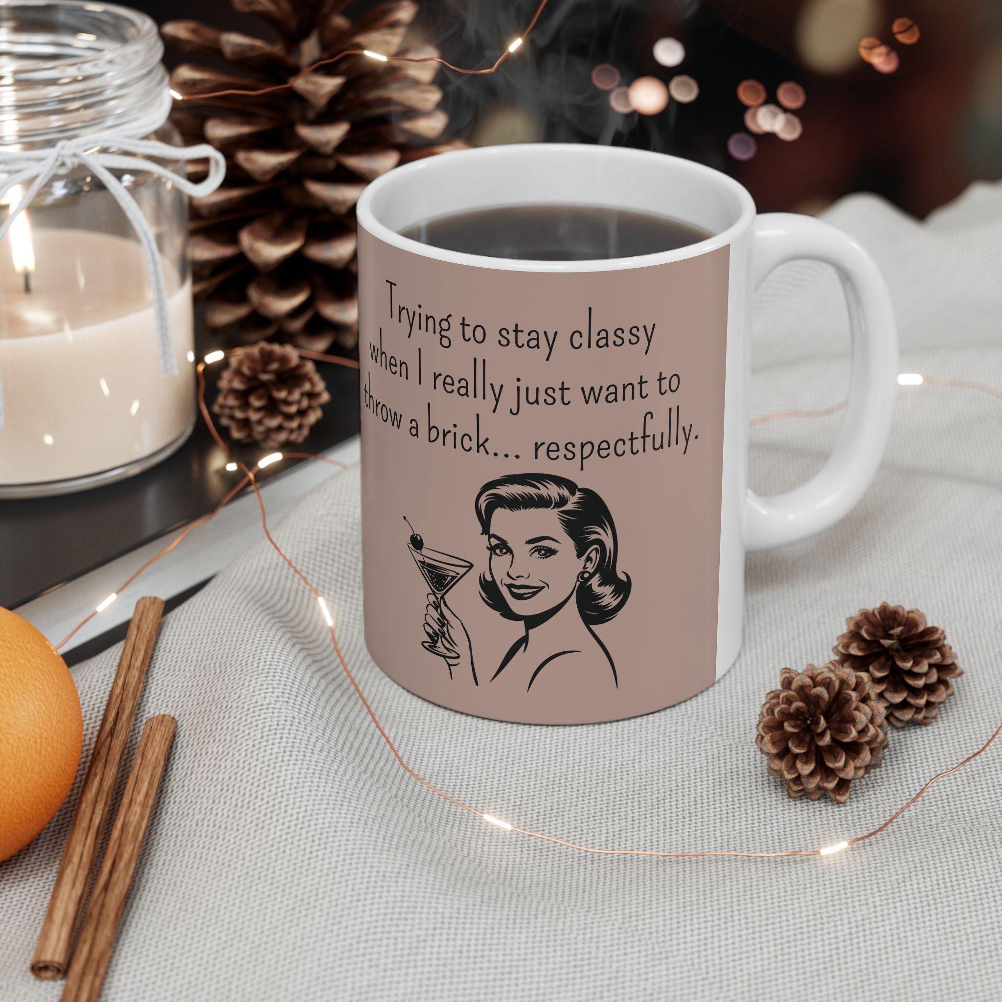 ☕ Sip in style with this retro “Trying to Stay Classy” mug, the perfect blend of sass and sophistication. Ideal for work humor, girlfriends, or gifting!
