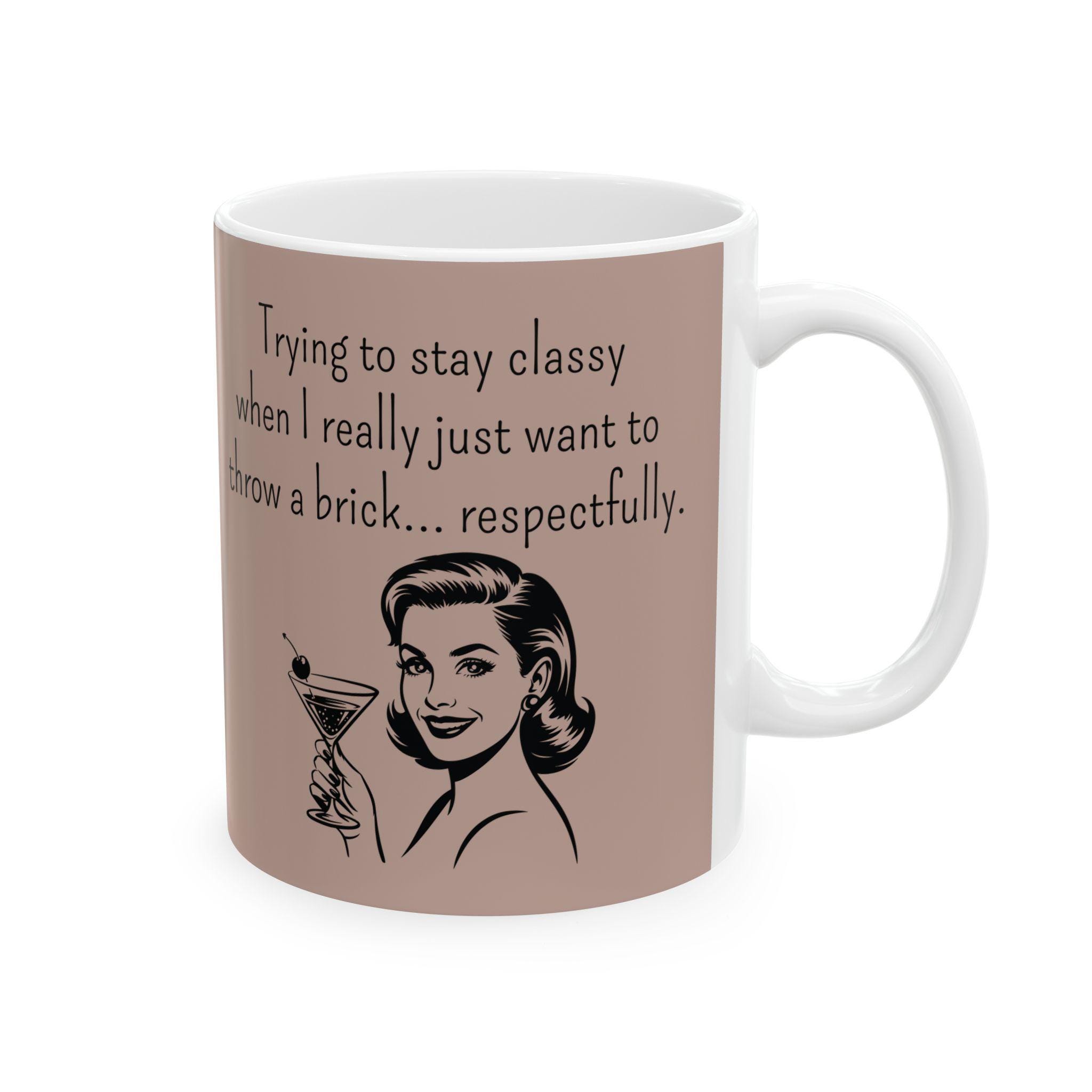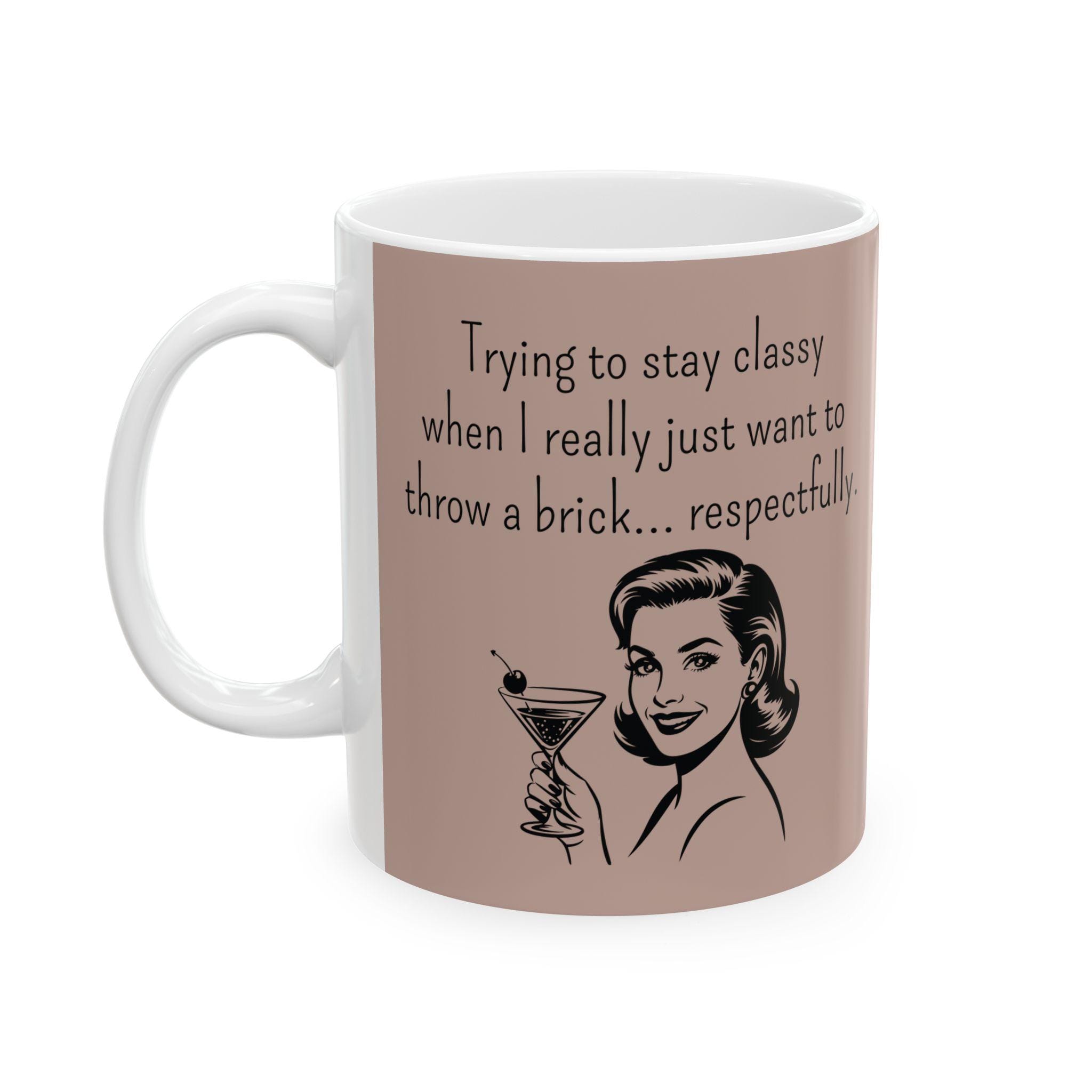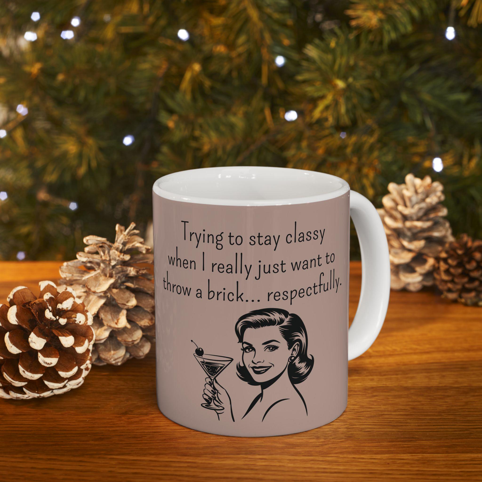 ☕ Sip in style with this retro “Trying to Stay Classy” mug, the perfect blend of sass and sophistication. Ideal for work humor, girlfriends, or gifting!