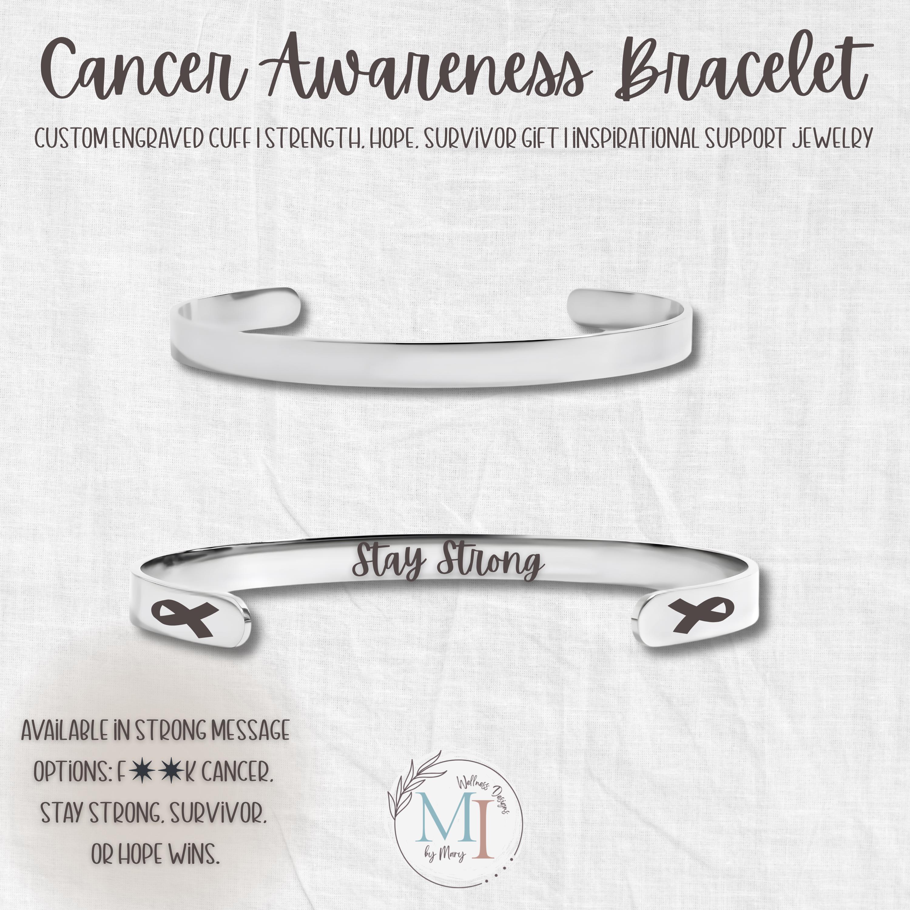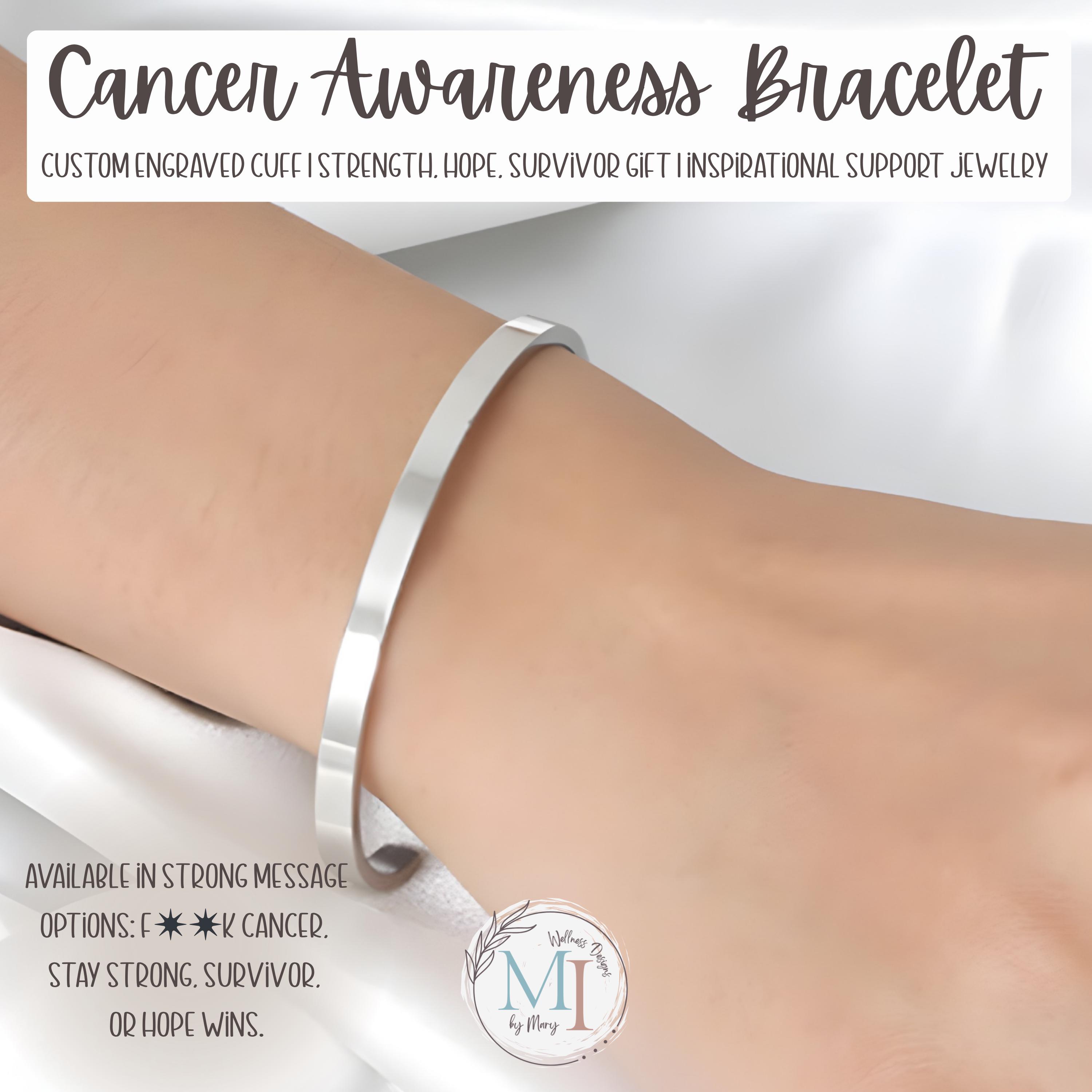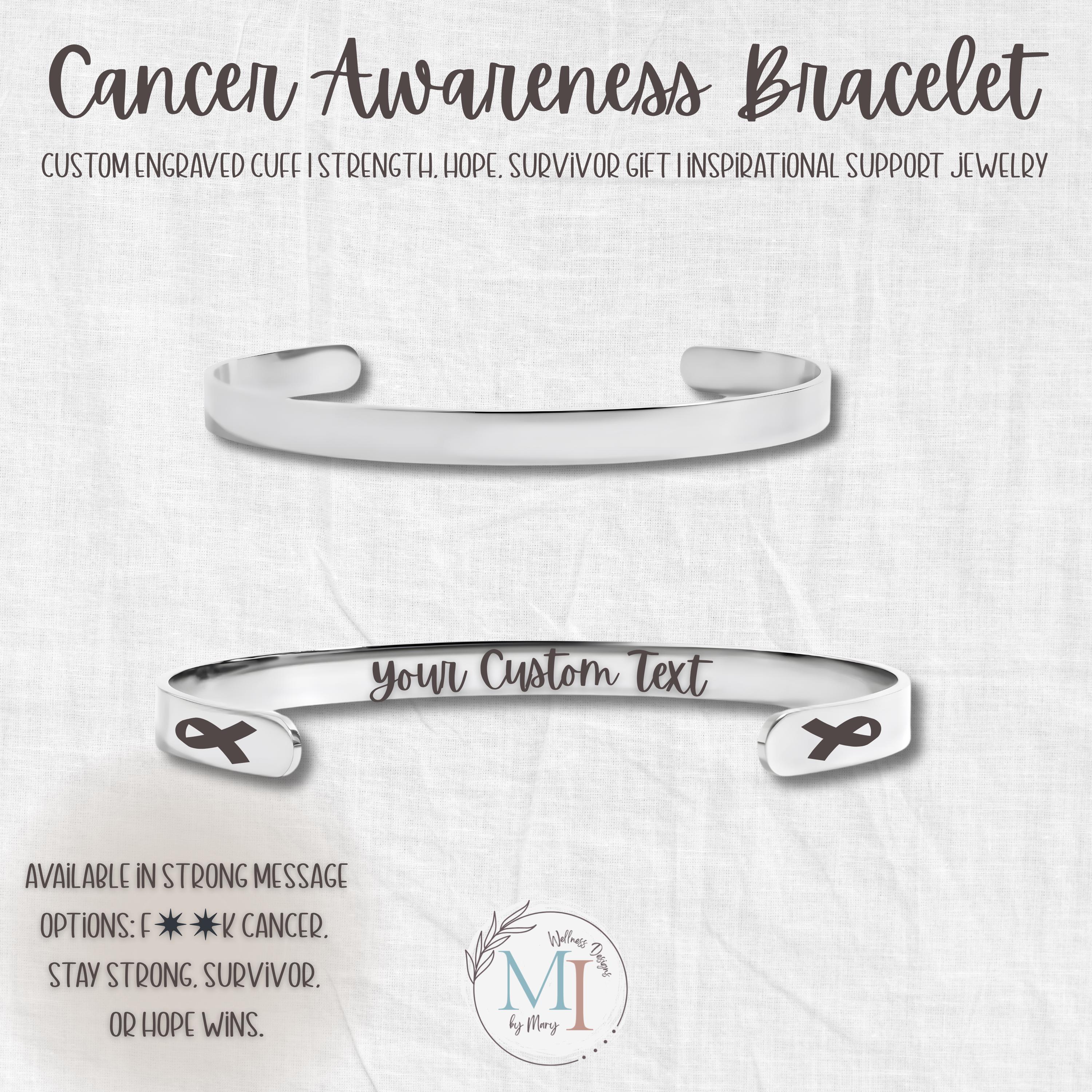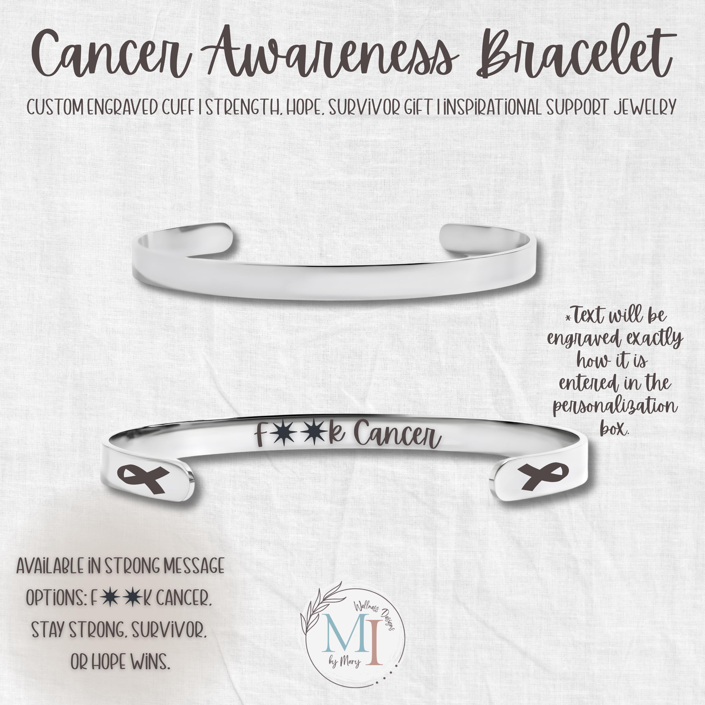 🌿 A bold reminder of strength and resilience. Handcrafted stainless steel cuff — personalize inside with “F✴︎✴︎k Cancer,” “Stay Strong,” “Survivor,” or your own message of courage.