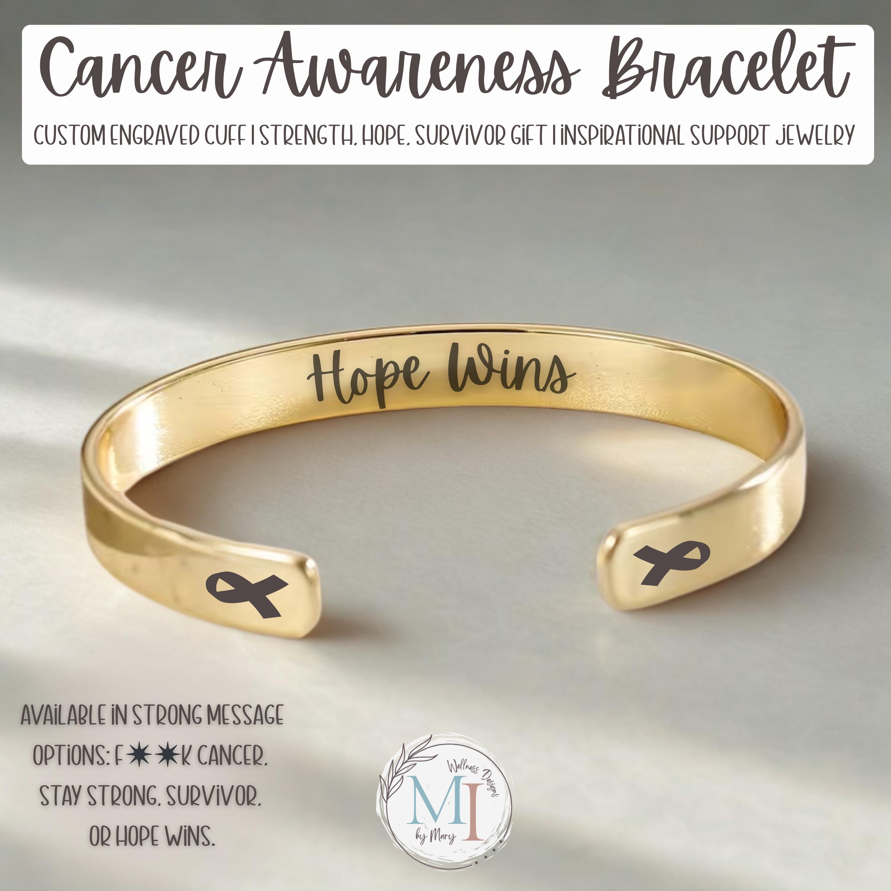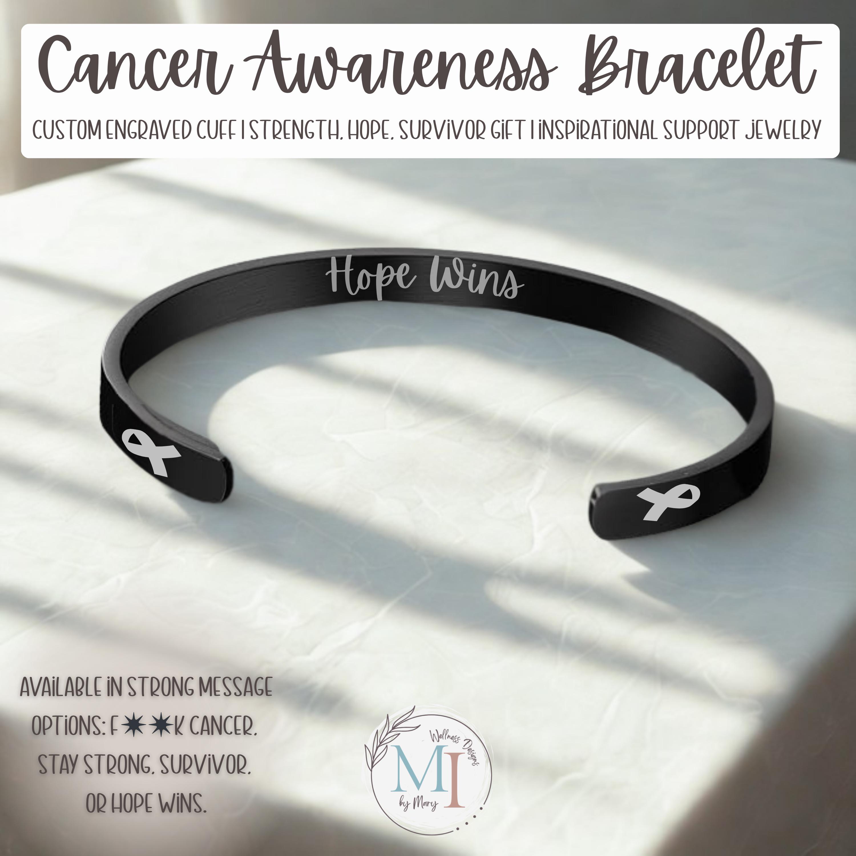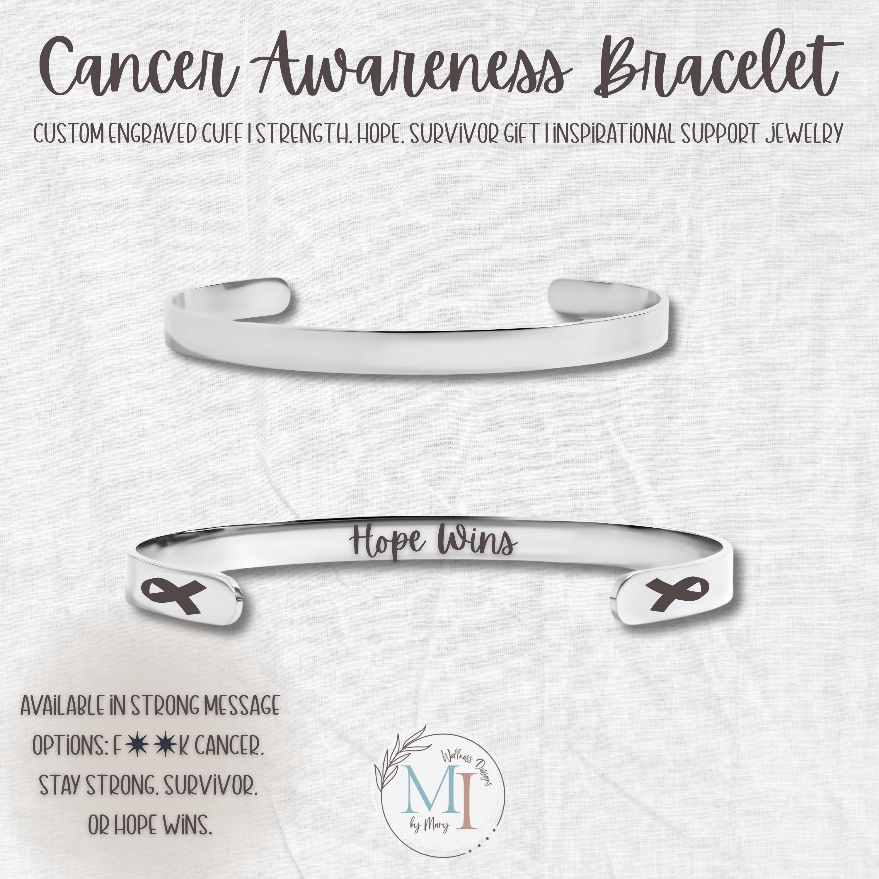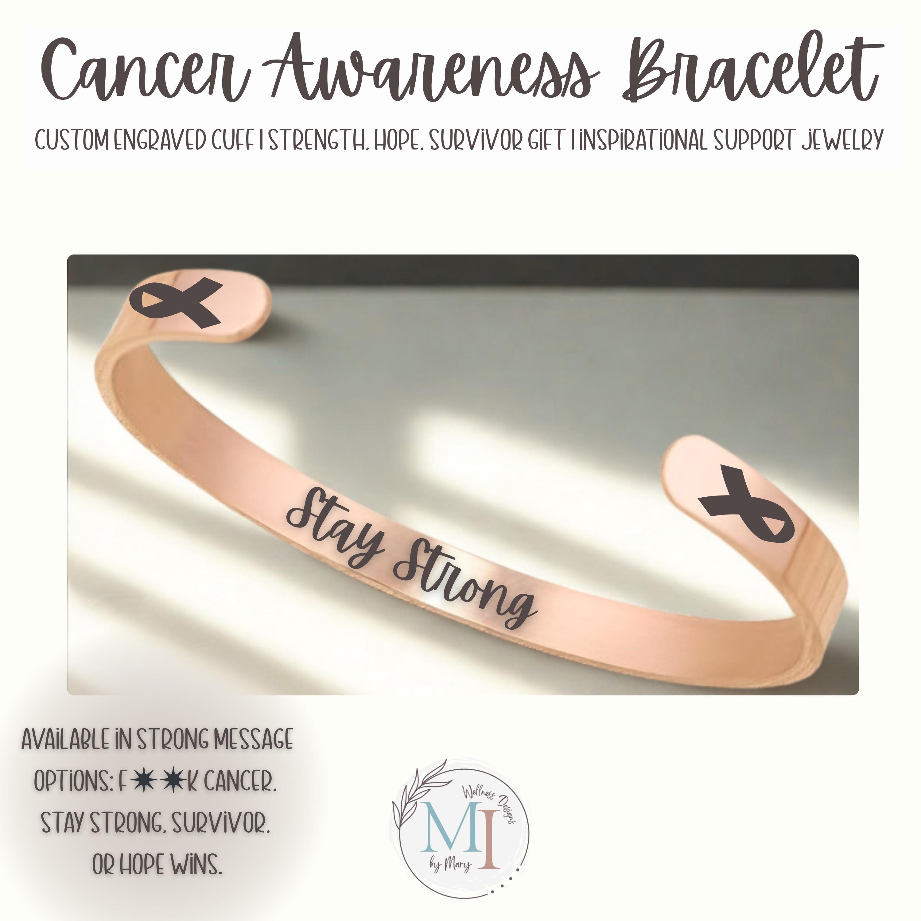 🌿 A bold reminder of strength and resilience. Handcrafted stainless steel cuff — personalize inside with “F✴︎✴︎k Cancer,” “Stay Strong,” “Survivor,” or your own message of courage.