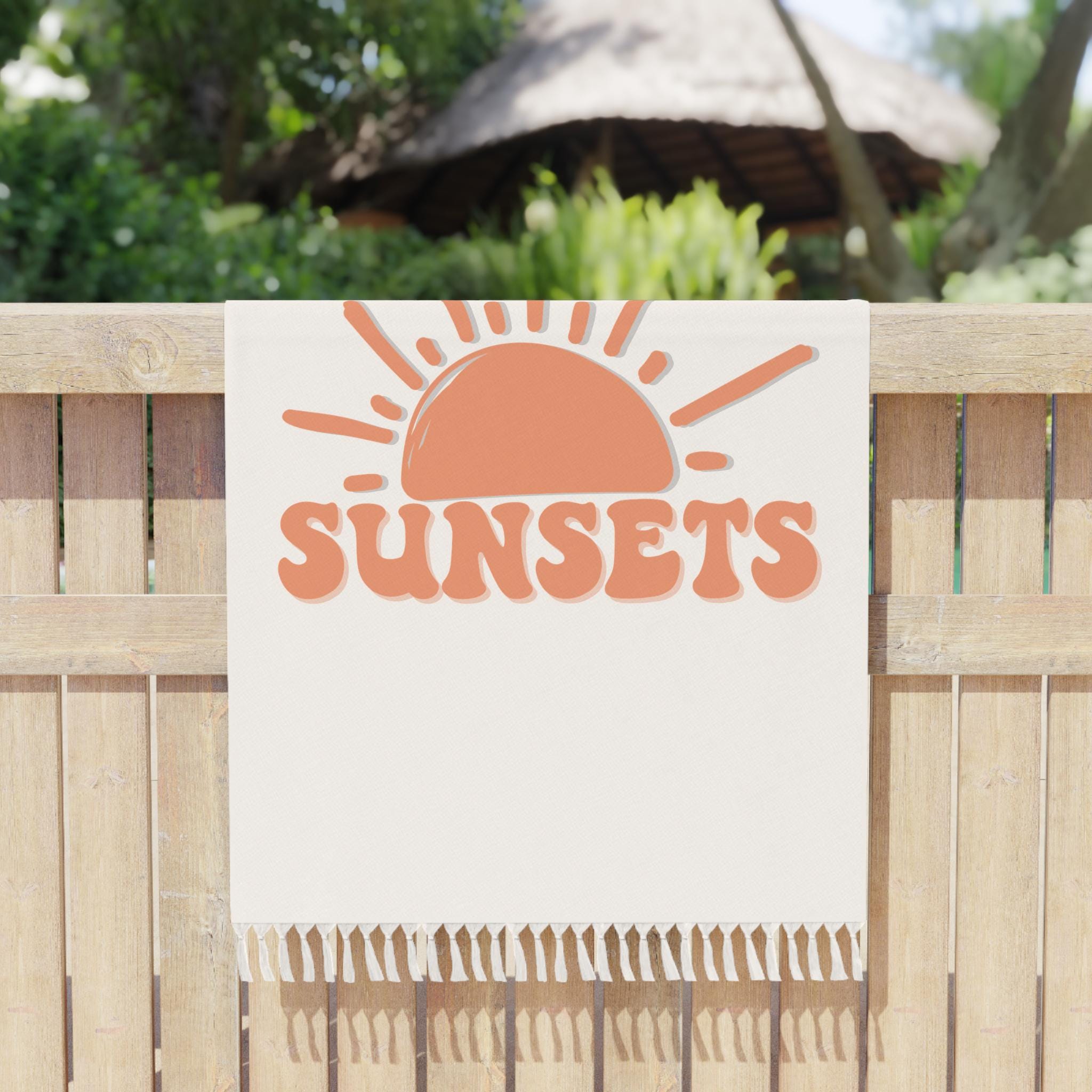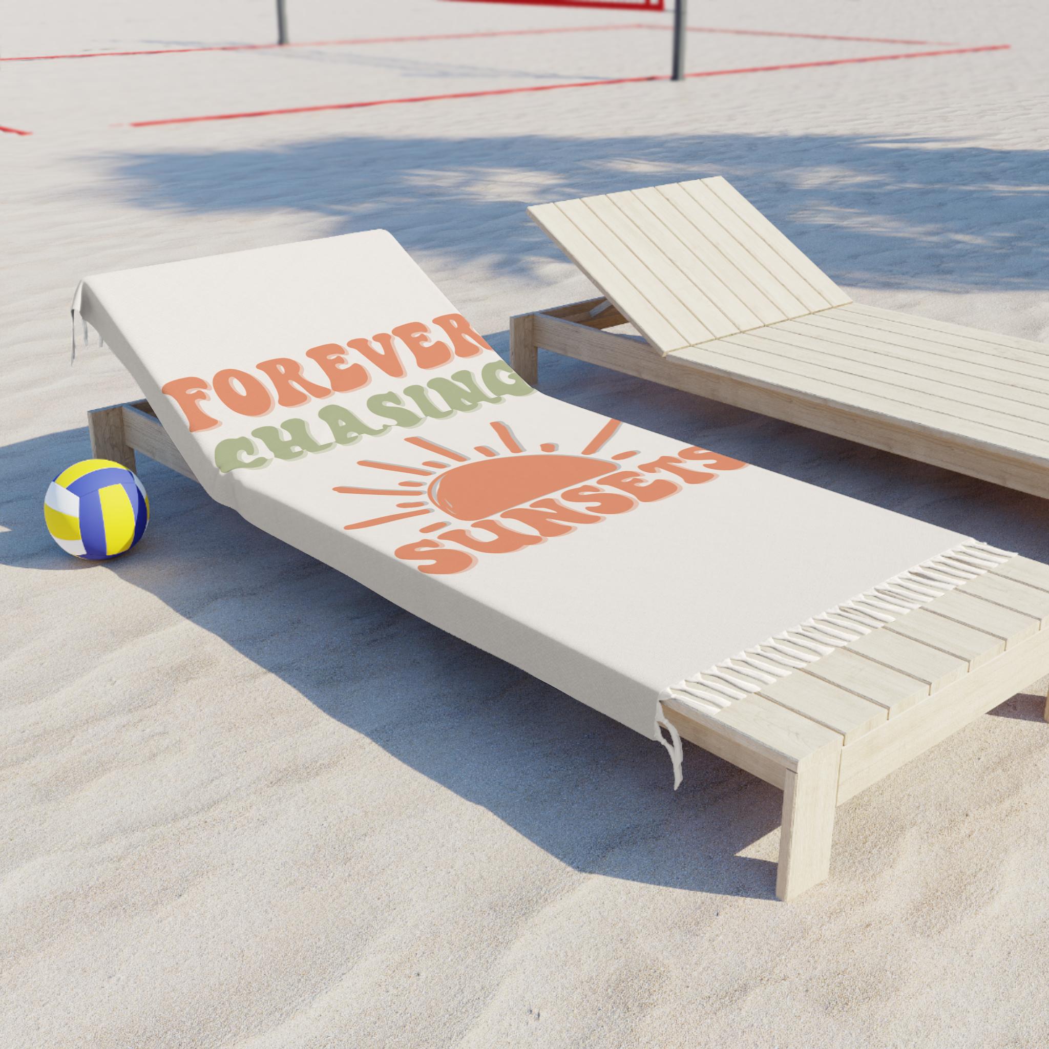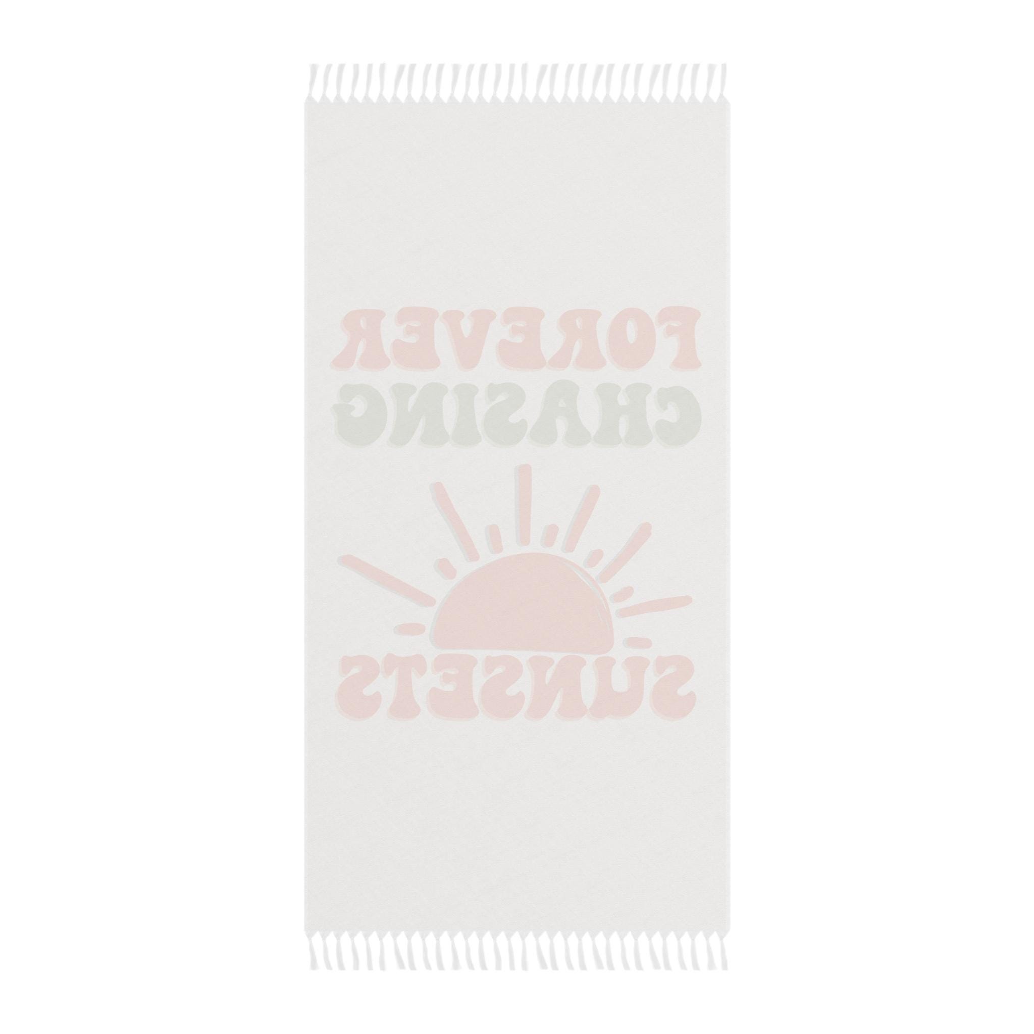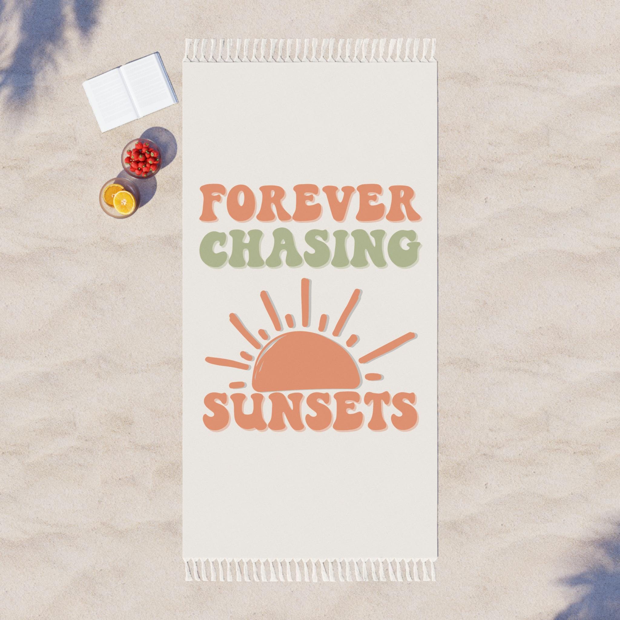 Soft, sun-soaked afternoons and sandy toes — this lightweight beach cloth carries a quiet, bohemian summer mood. Warm terracotta and muted sage type reads "Forever Chasing Sunsets" above a simple half-sun illustration, printed on one side of a long, tasselled cloth. It spreads out easily for lounging at the shore, doubles as a travel wrap on cool evenings, and folds small enough to slip into a daypack. The durable polyester dries fast and keeps the colors vivid, so the design stays bright through salty air and repeated washes. Bring it to a sunset stakeout, wear it as a breezy cover when the sea breeze kicks up, or layer it on top of a picnic blanket to add a touch of retro, carefree style.