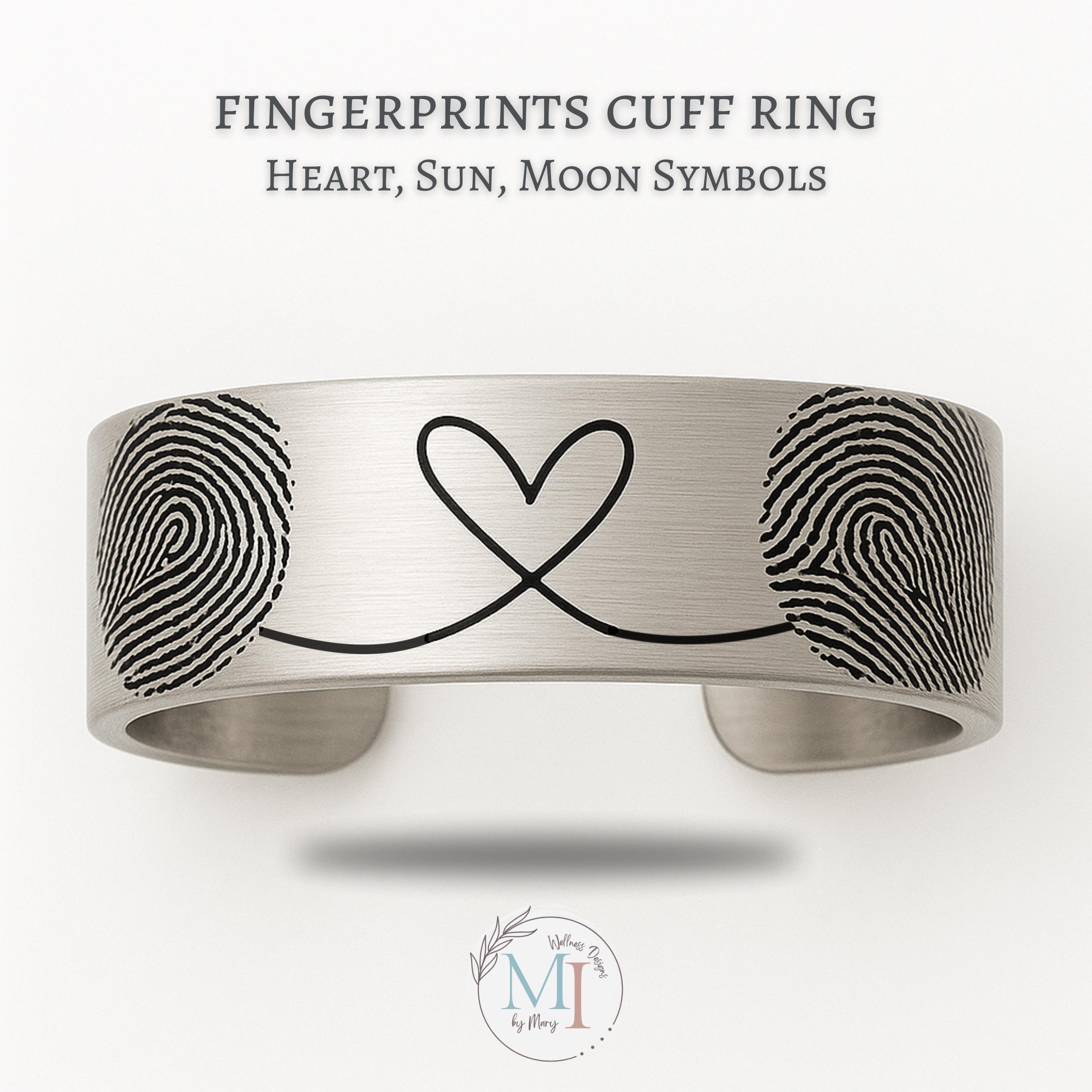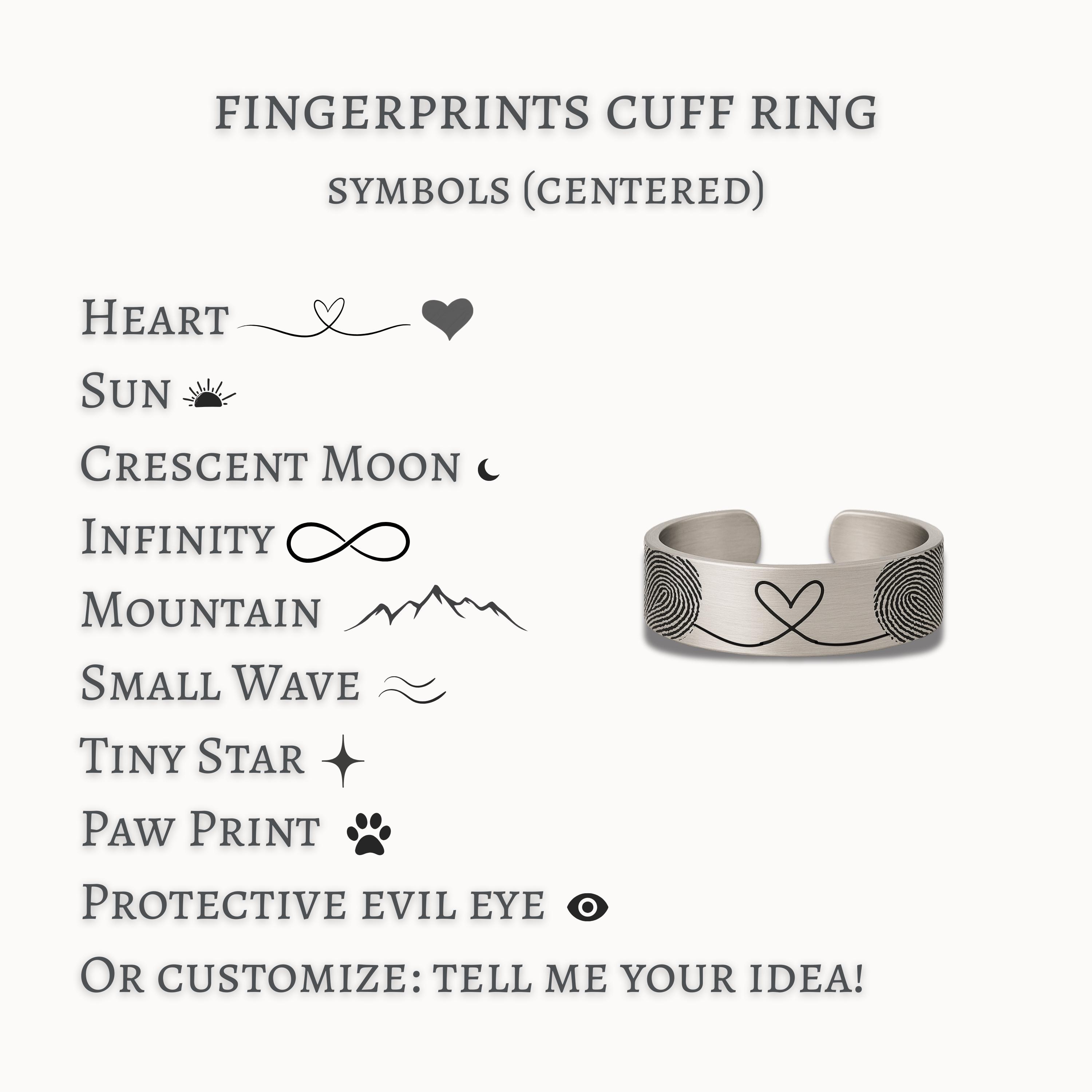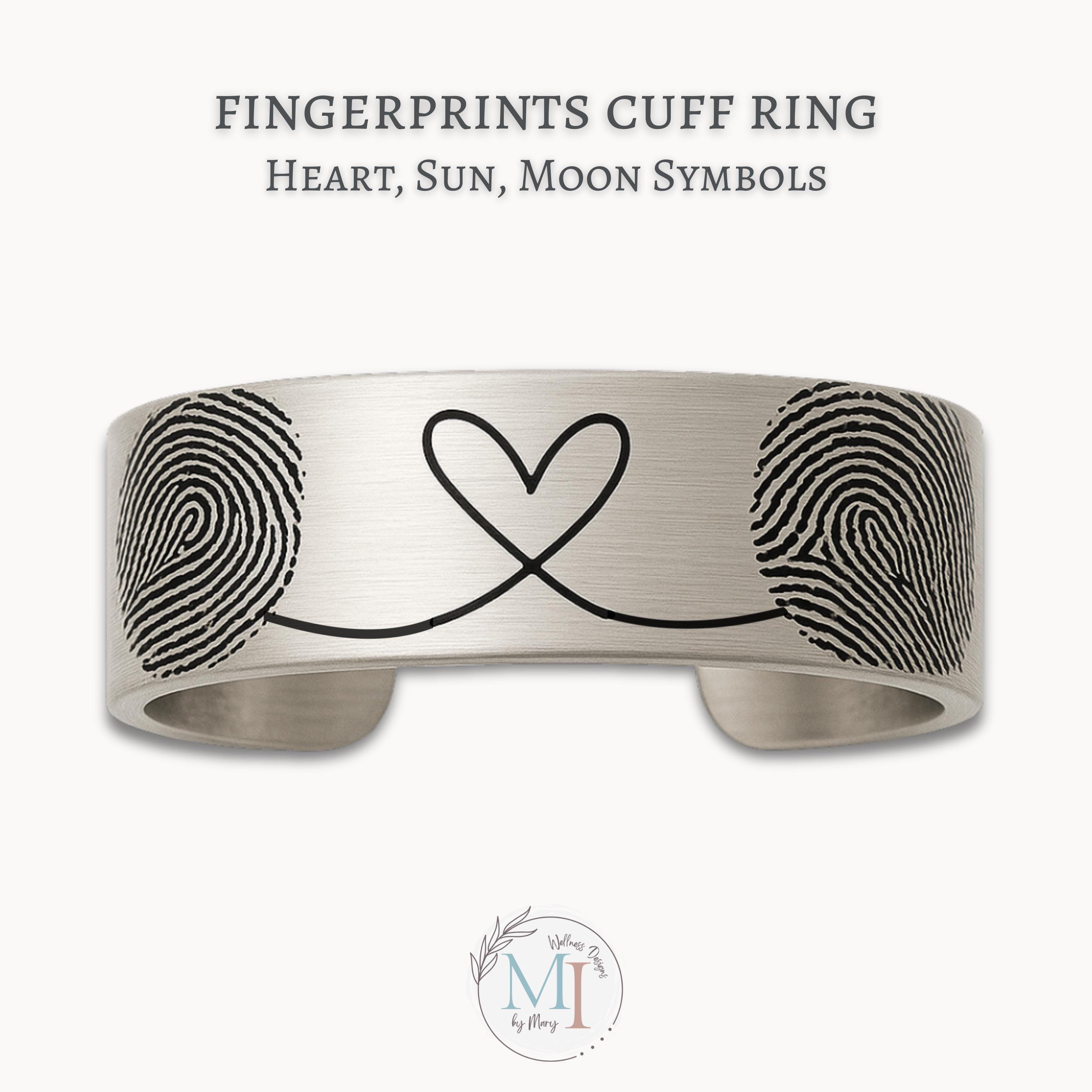 This adjustable fingerprint cuff ring is designed for the people you love most. Your choice of one or two fingerprints wraps naturally around a sleek stainless-steel band, centered with your choice of symbol β heart, sun, moon, infinity sign, wave, mountain, star, or paw print.