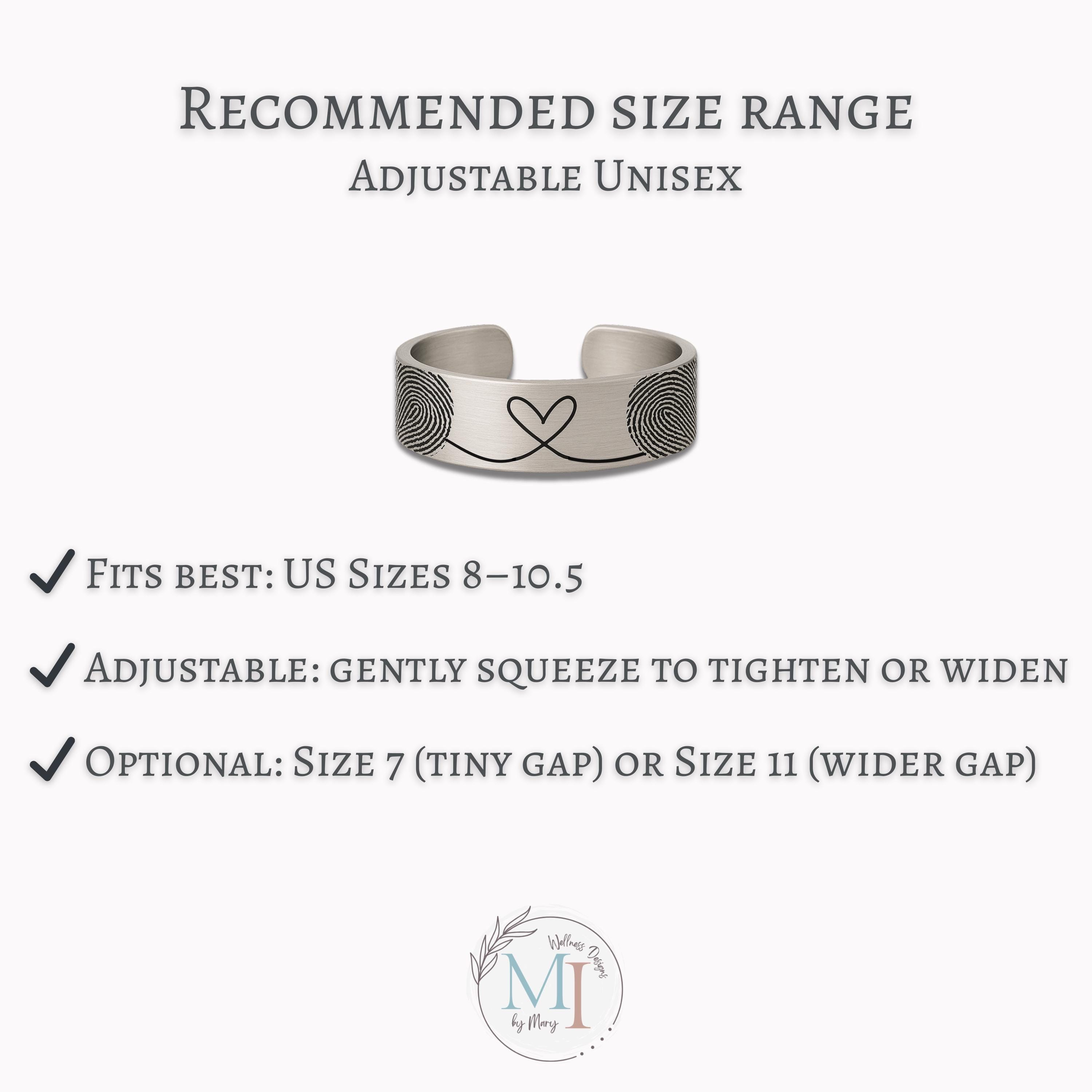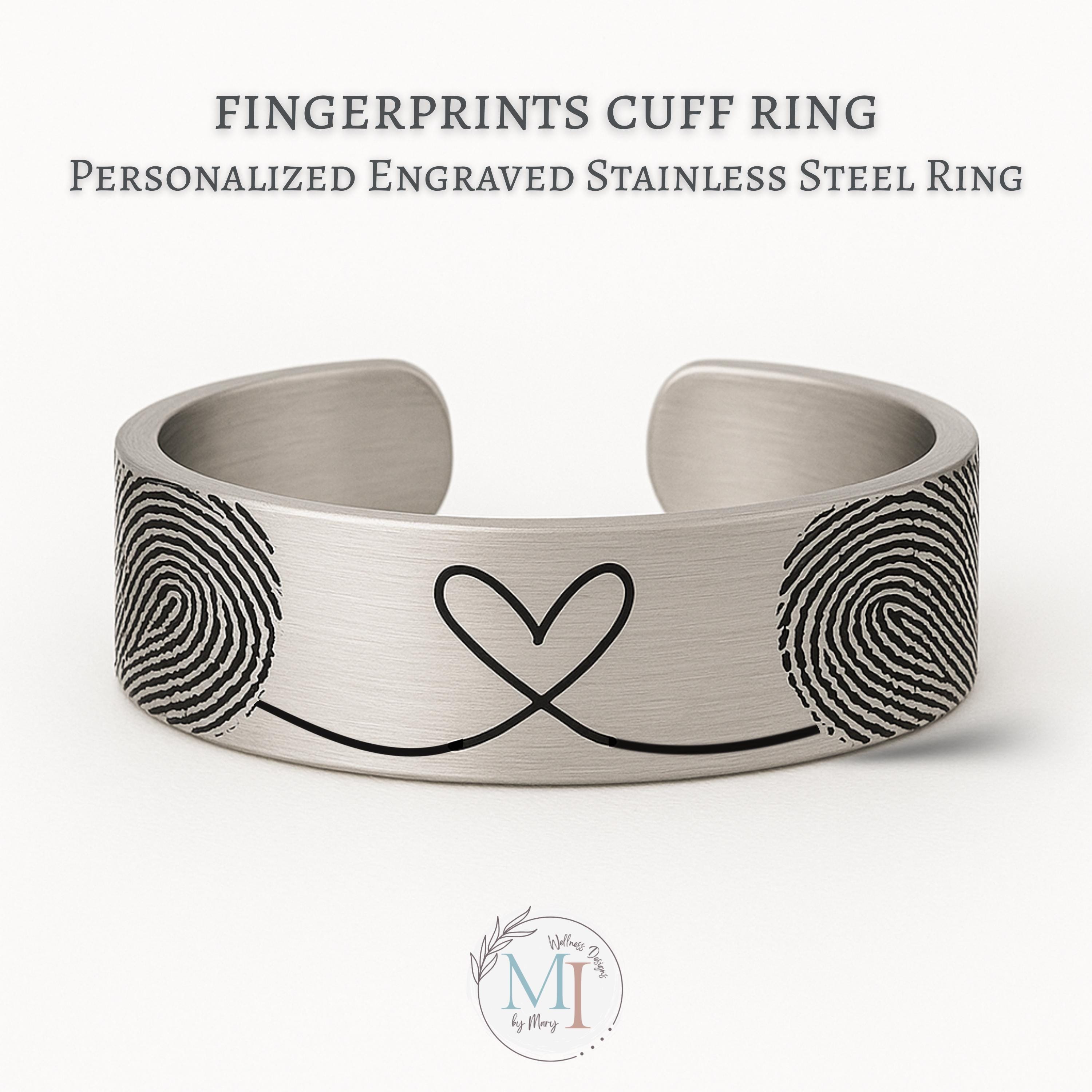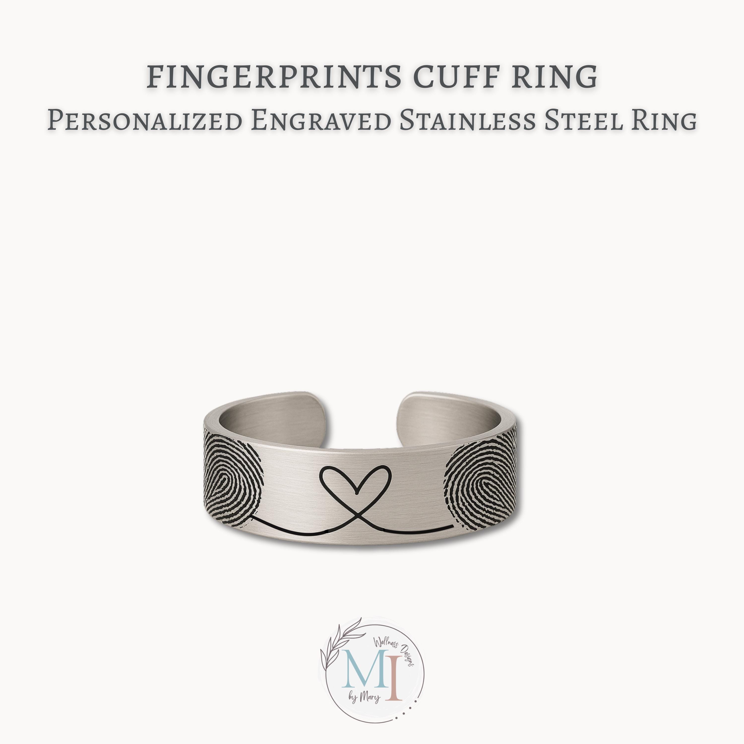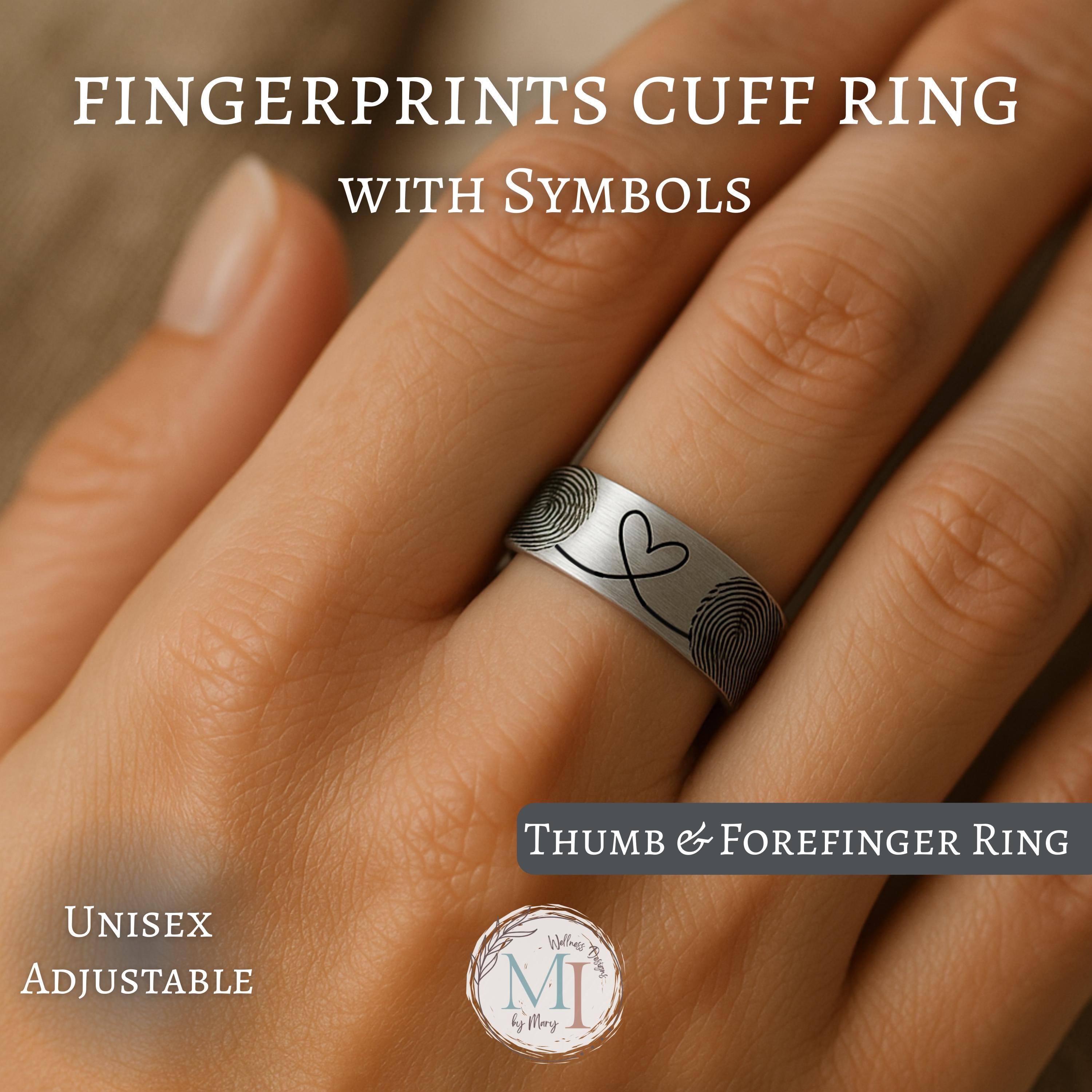 This adjustable fingerprint cuff ring is designed for the people you love most. Your choice of one or two fingerprints wraps naturally around a sleek stainless-steel band, centered with your choice of symbol β heart, sun, moon, infinity sign, wave, mountain, star, or paw print.