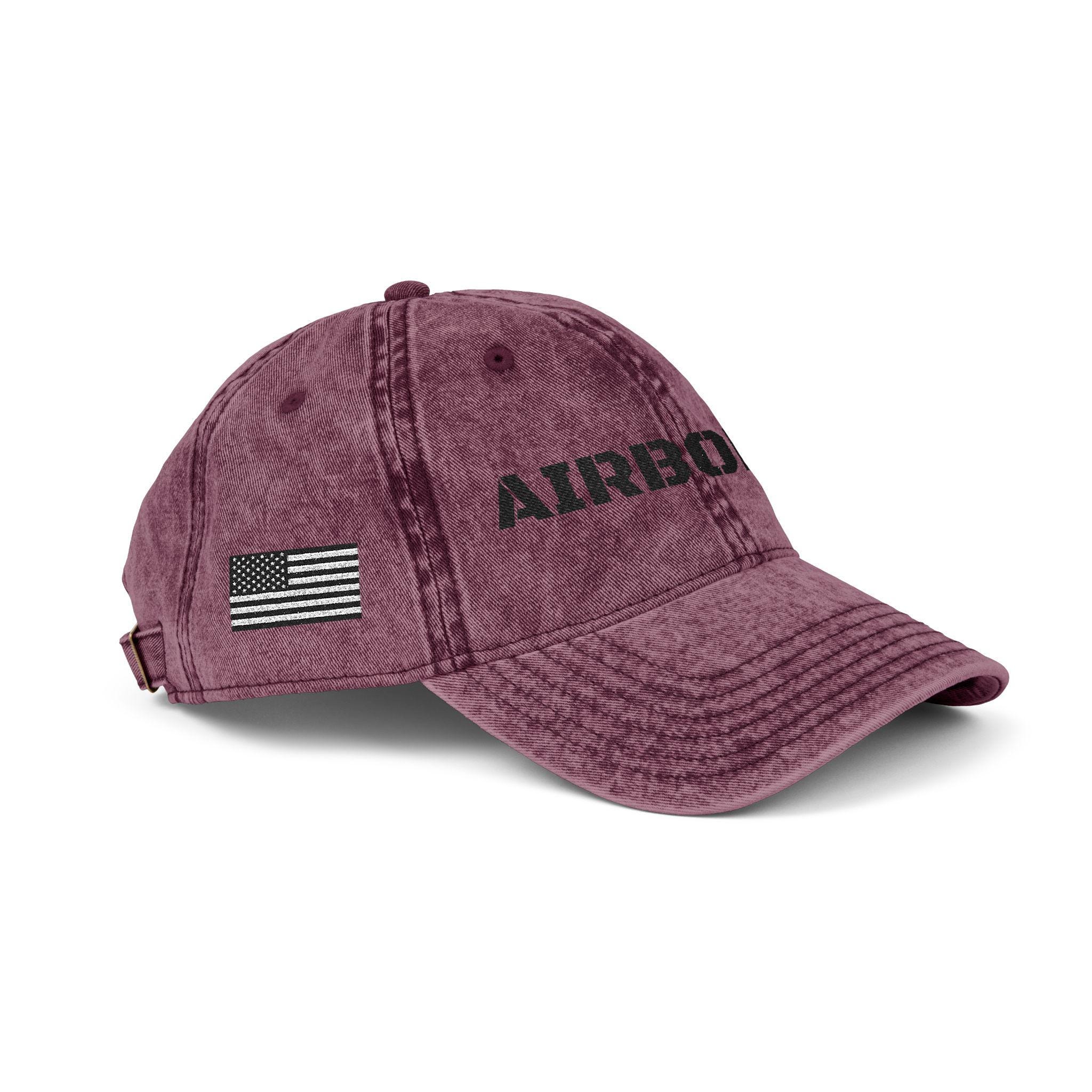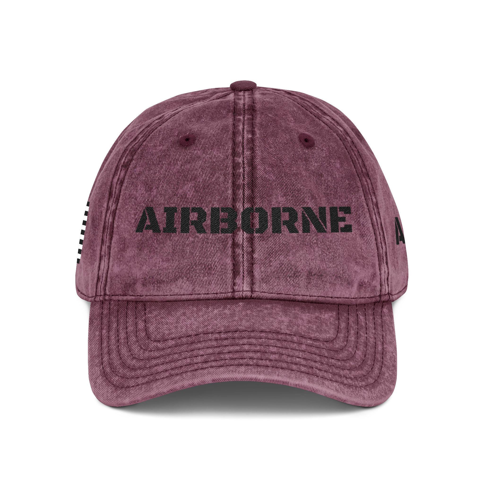 The front embroidery reads โAIRBORNEโ in bold stencil lettering, the side features a monochrome American flag, and the back includes paratrooper jump wings โ a nod to the elite legacy of the airborne soldier.