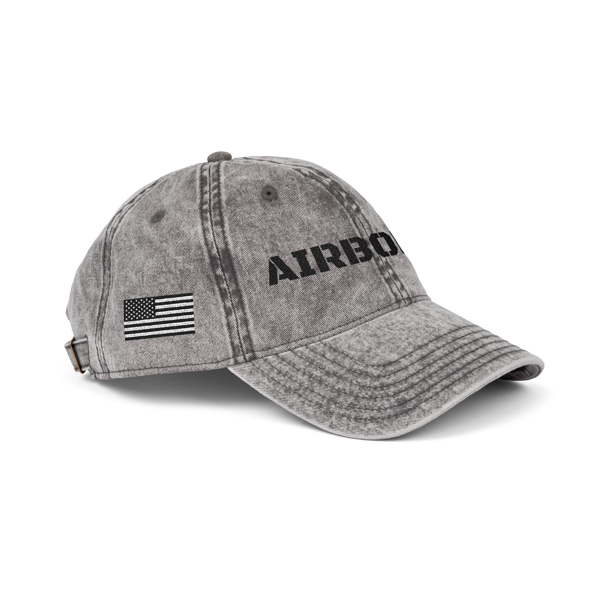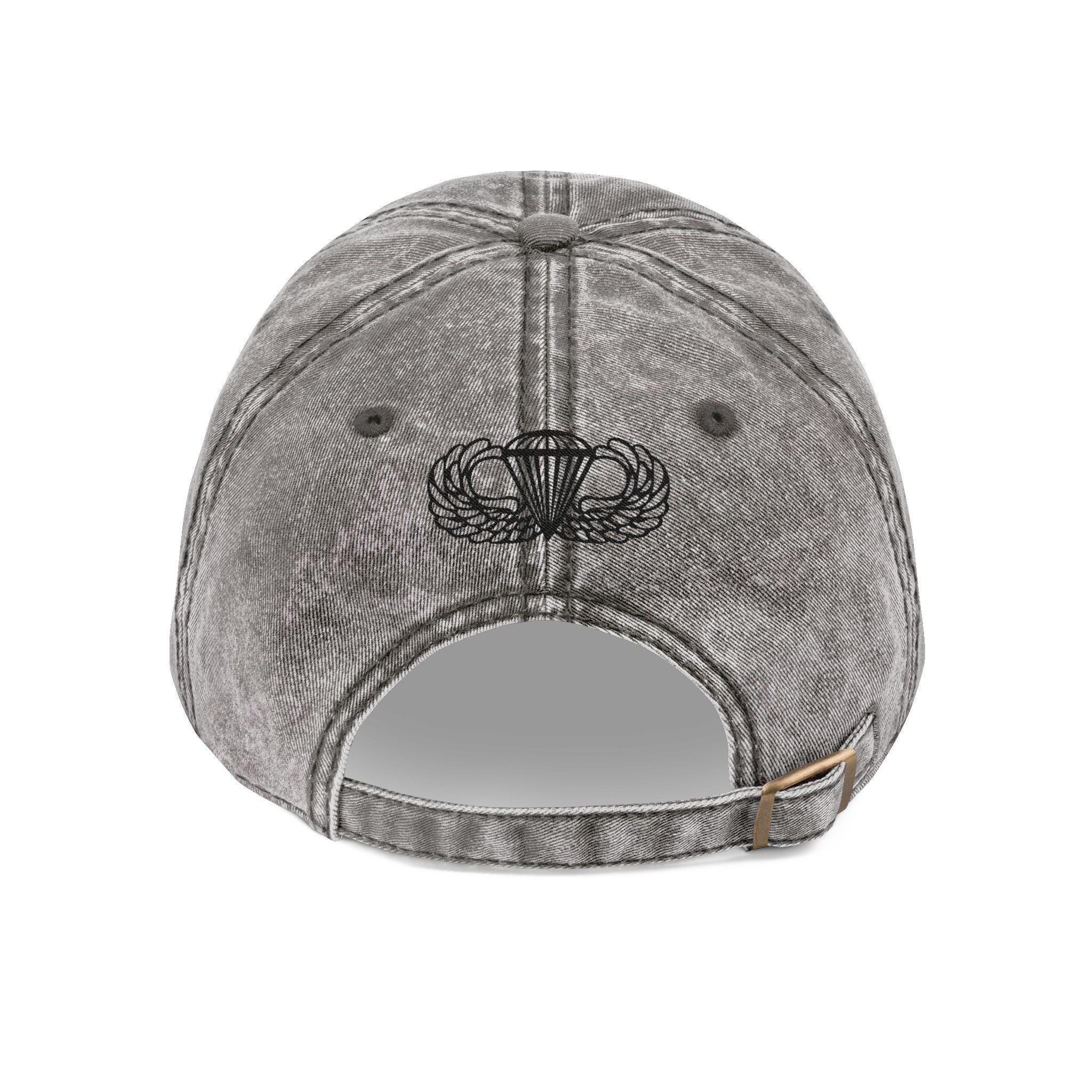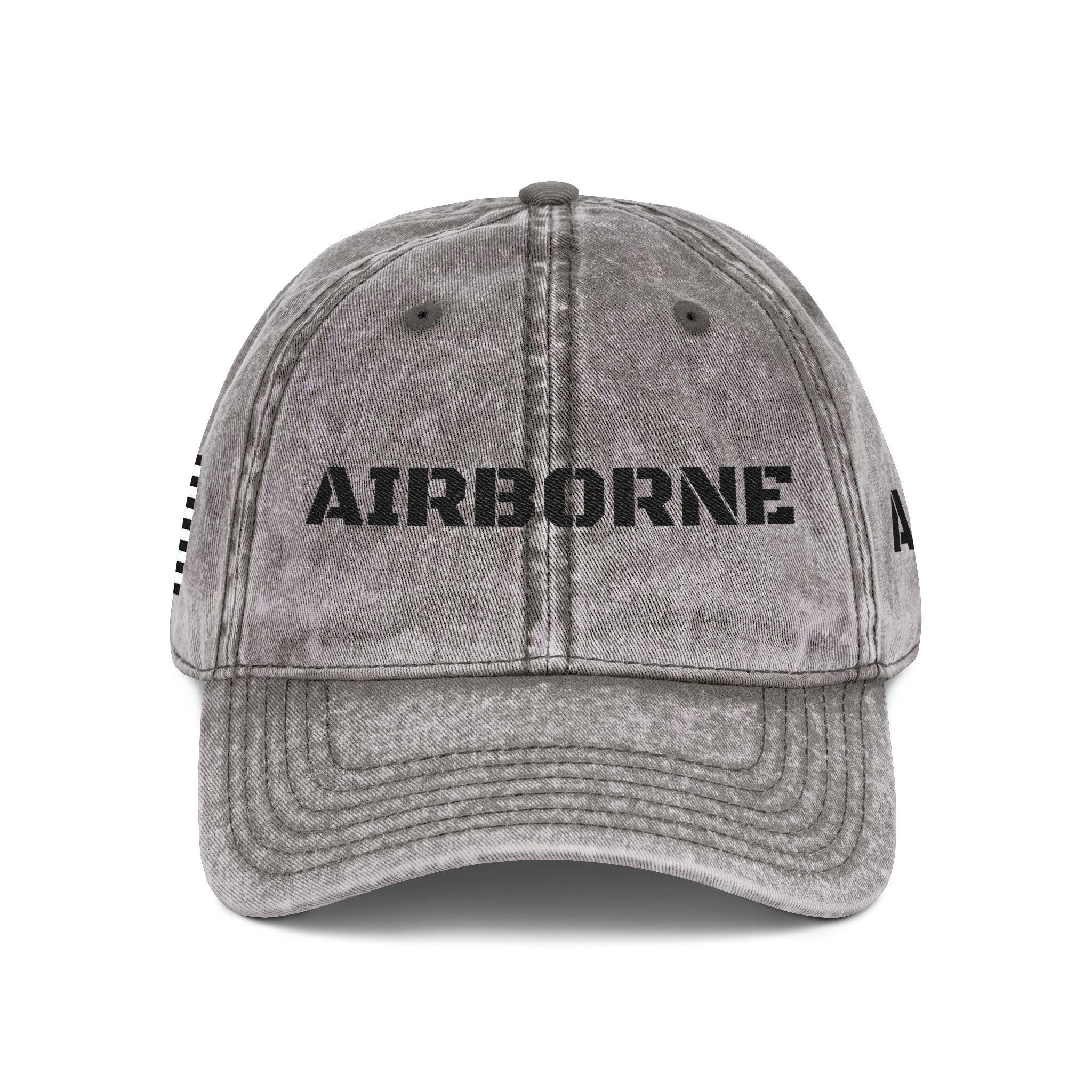 Front view of gray vintage Airborne cap with bold black embroidery.