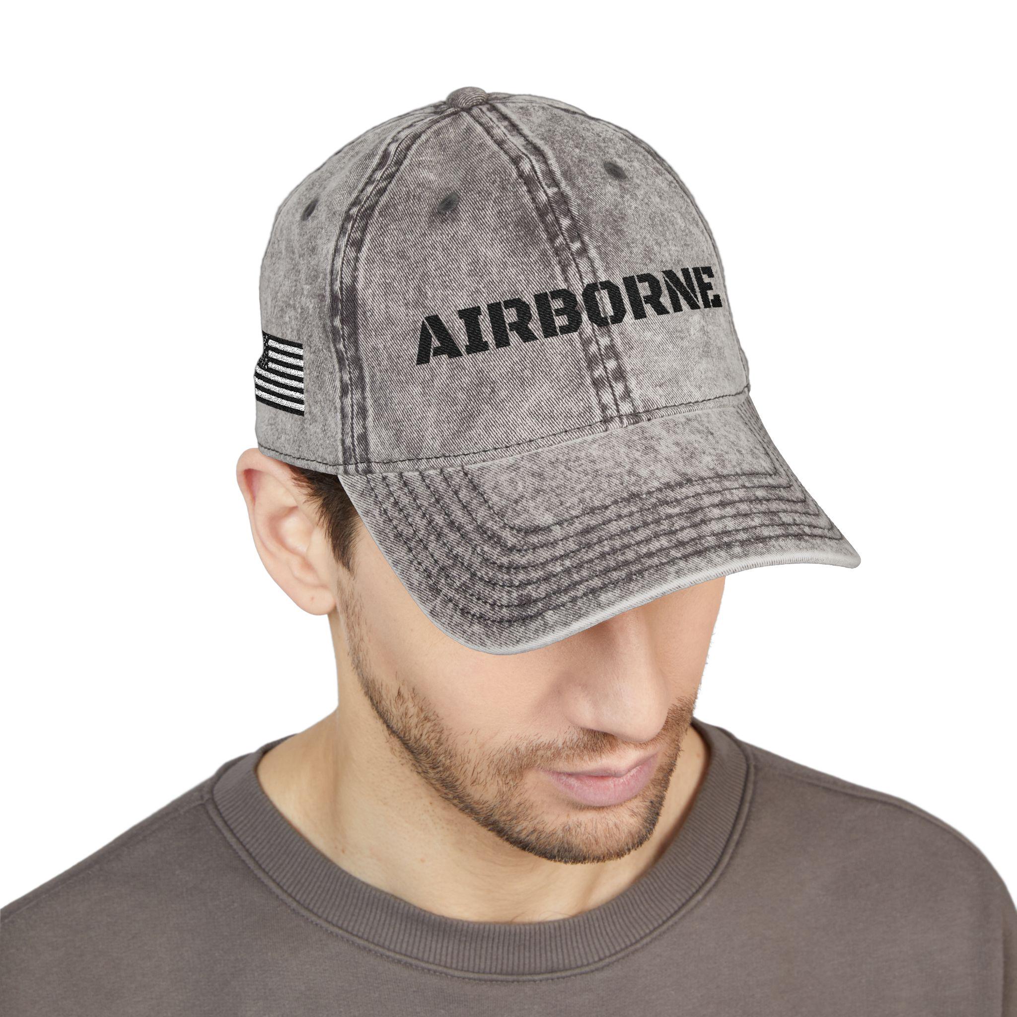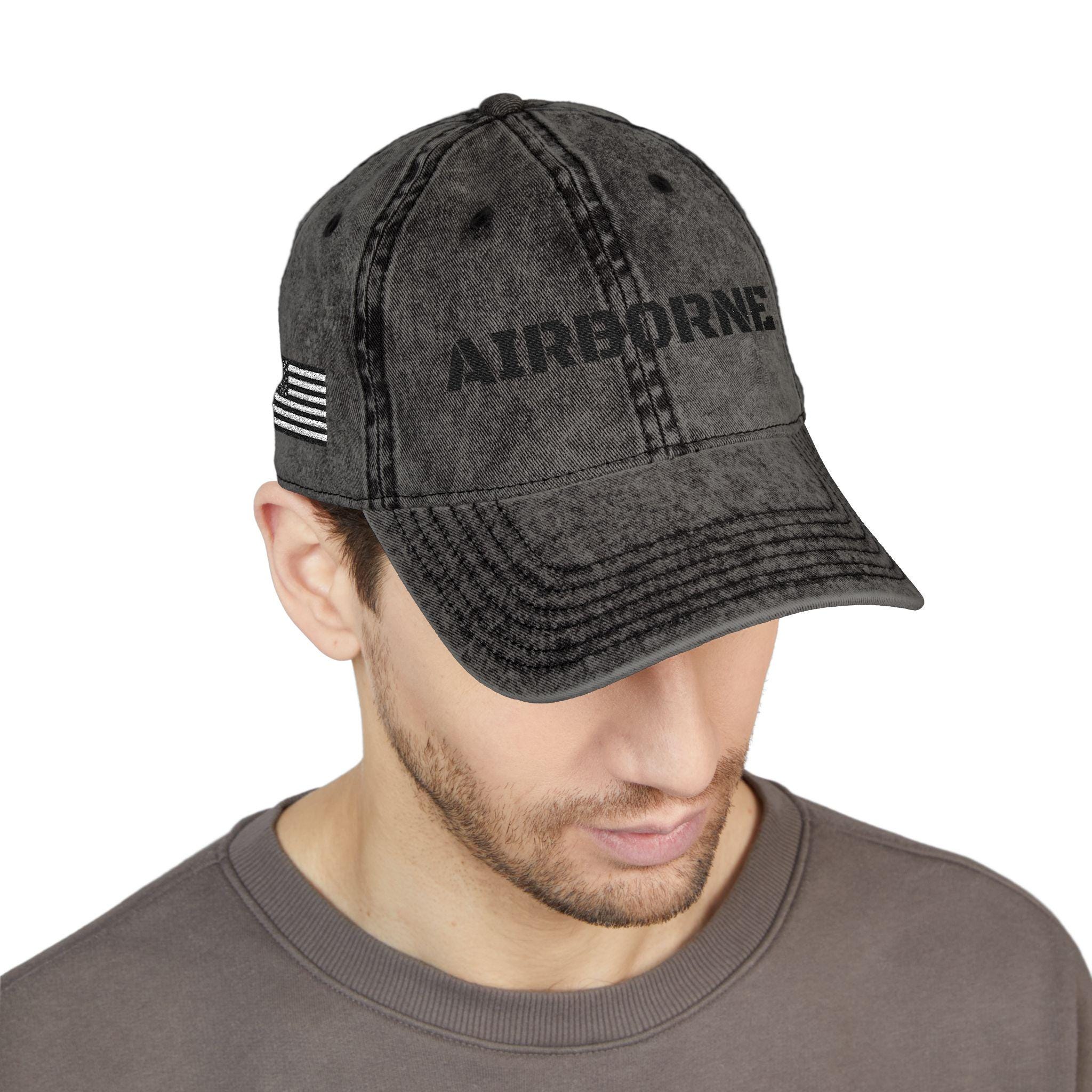 Lifestyle photo: man wearing black Airborne cap.