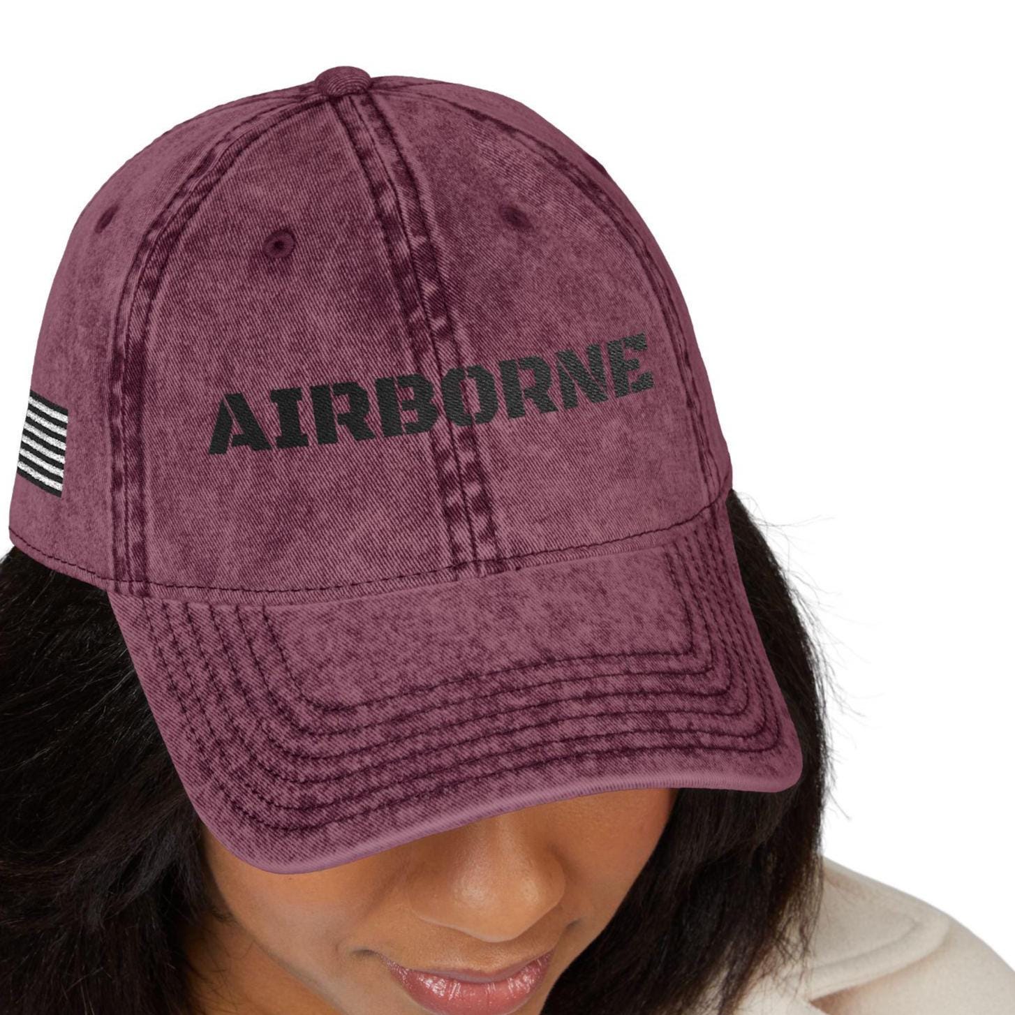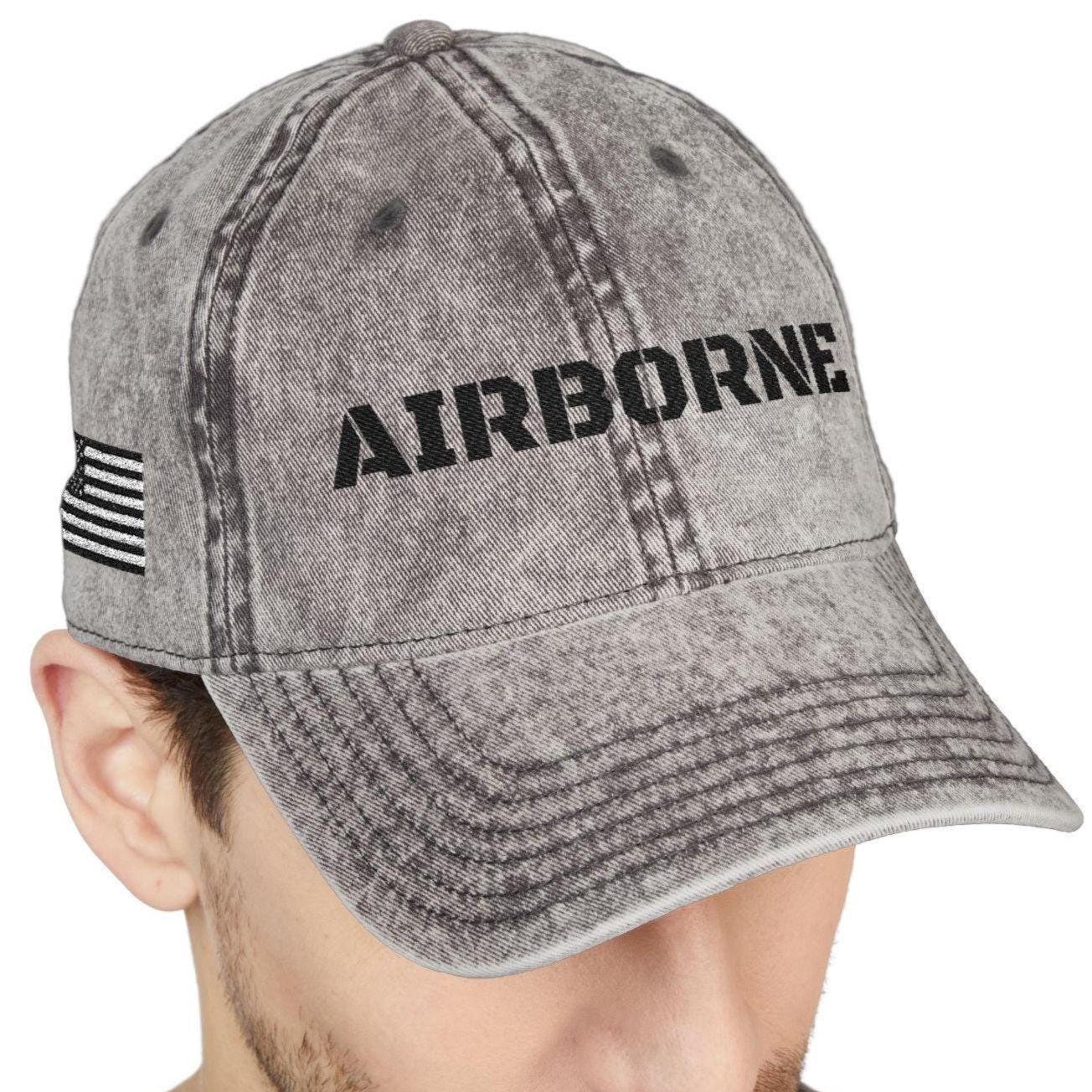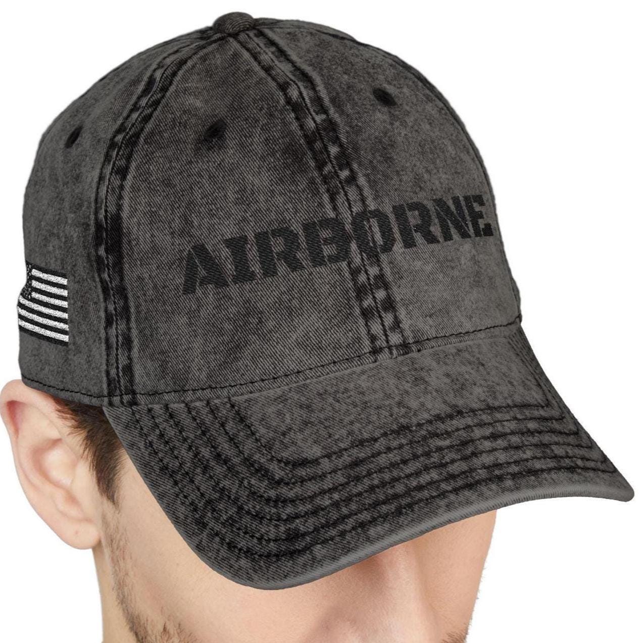 The front embroidery reads โAIRBORNEโ in bold stencil lettering, the side features a monochrome American flag, and the back includes paratrooper jump wings โ a nod to the elite legacy of the airborne soldier.