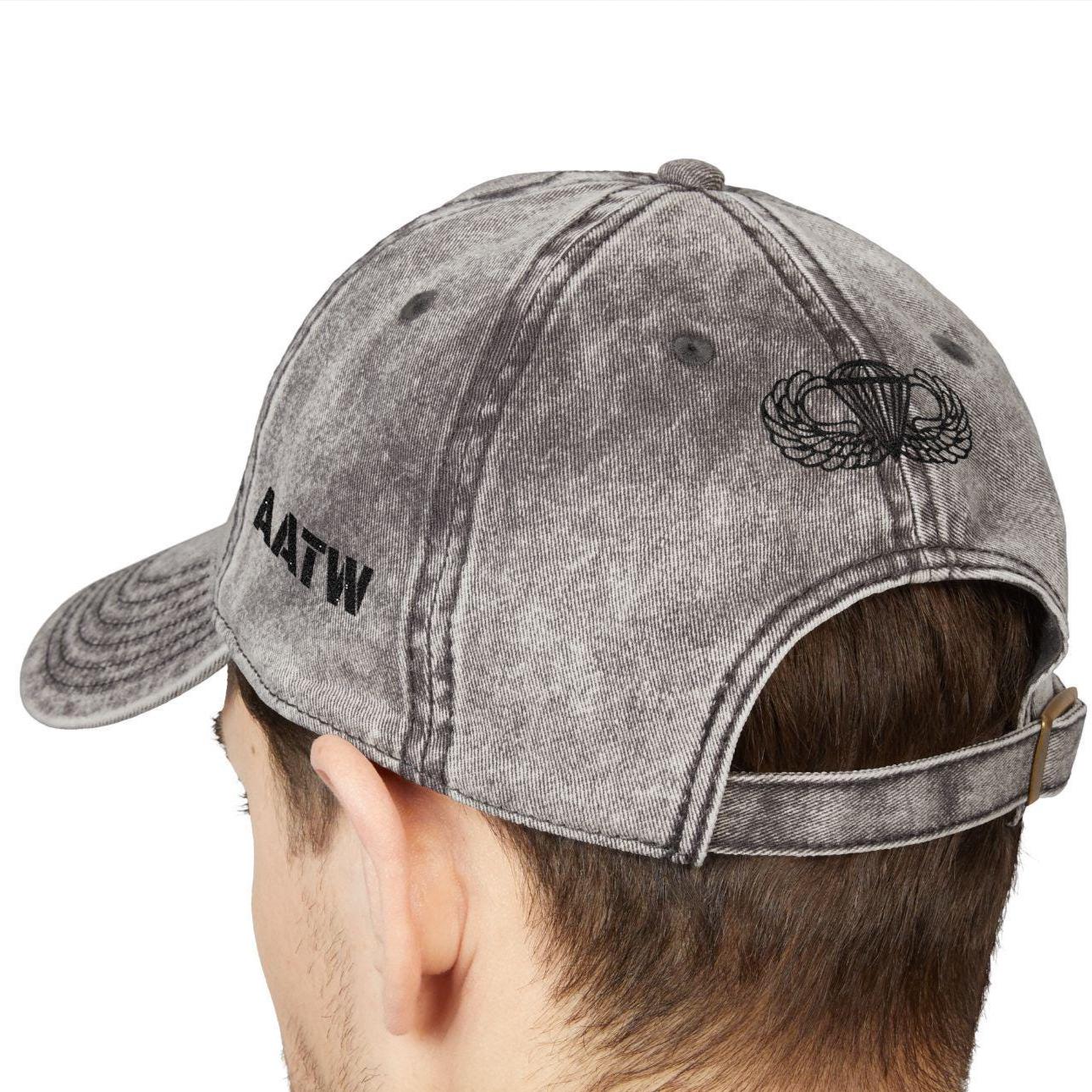 Front view of gray vintage Airborne cap with bold black embroidery.