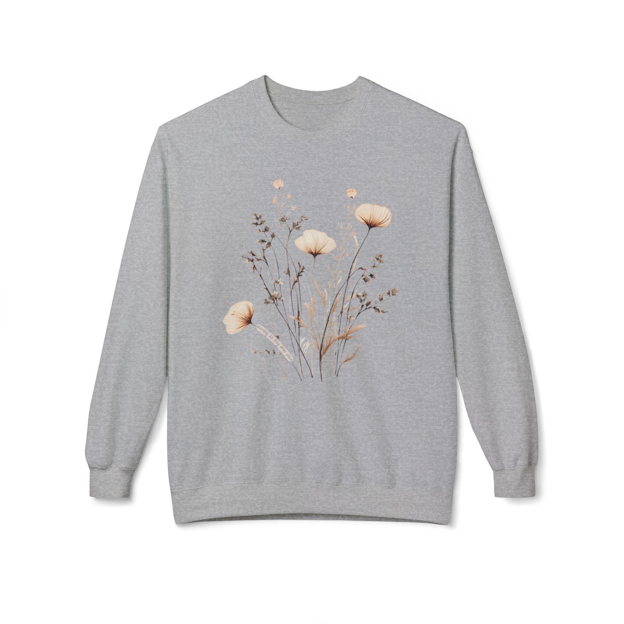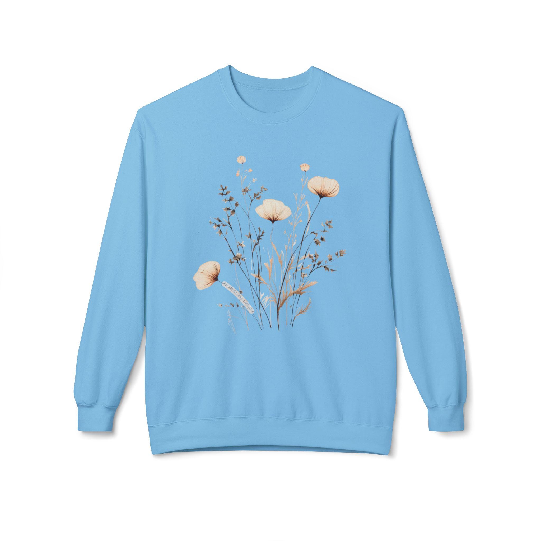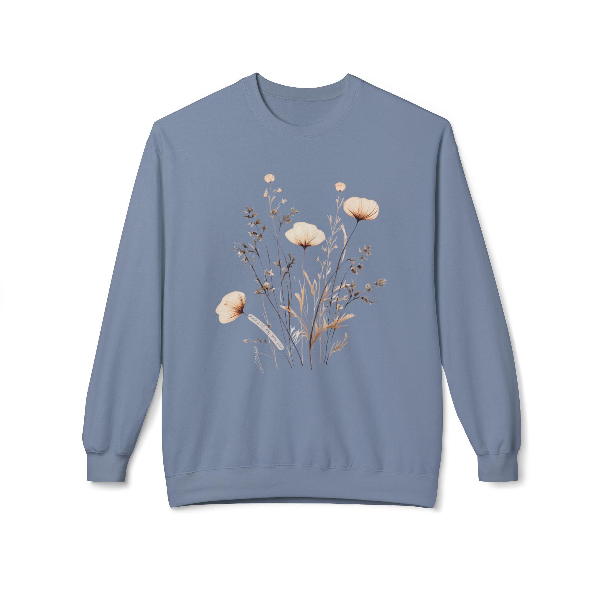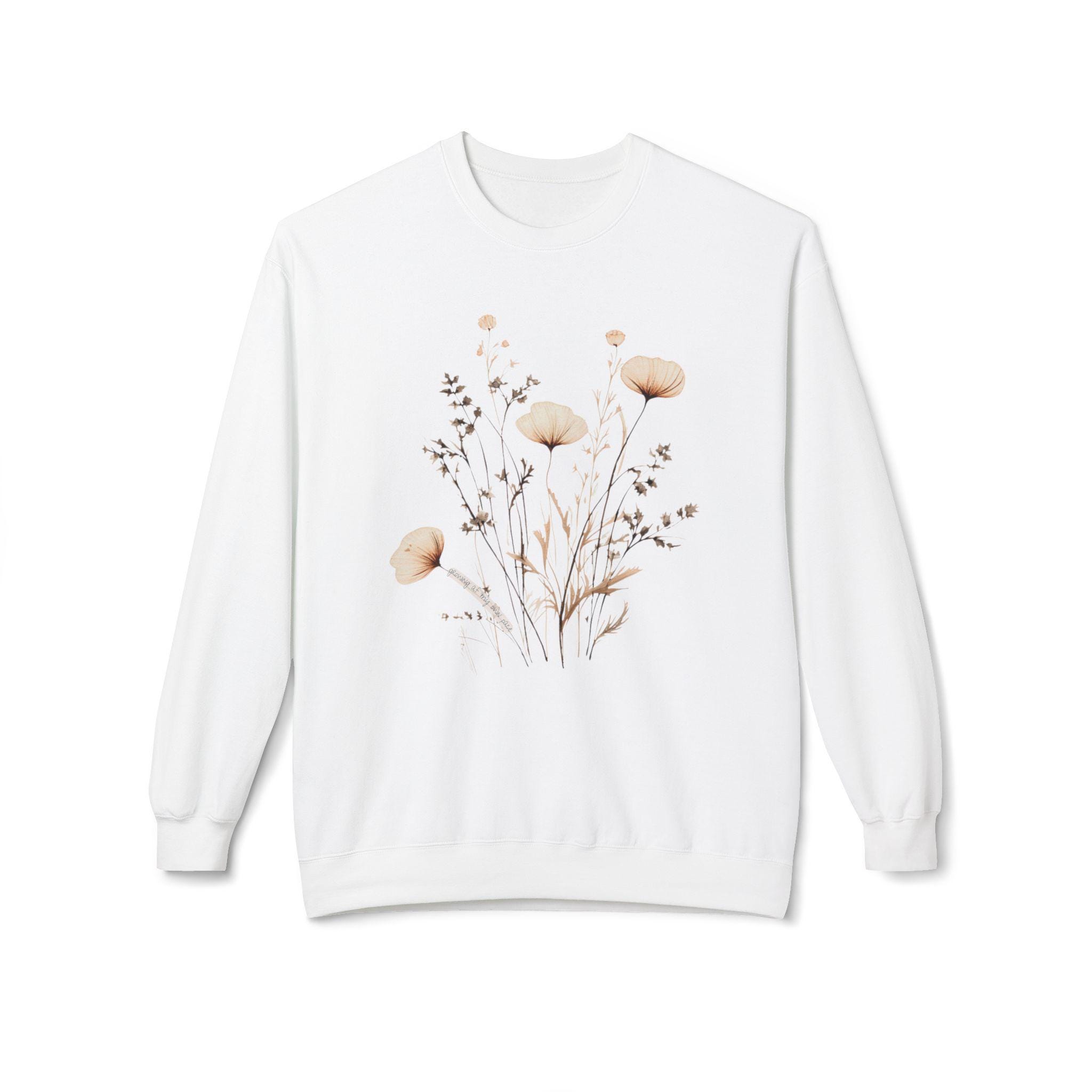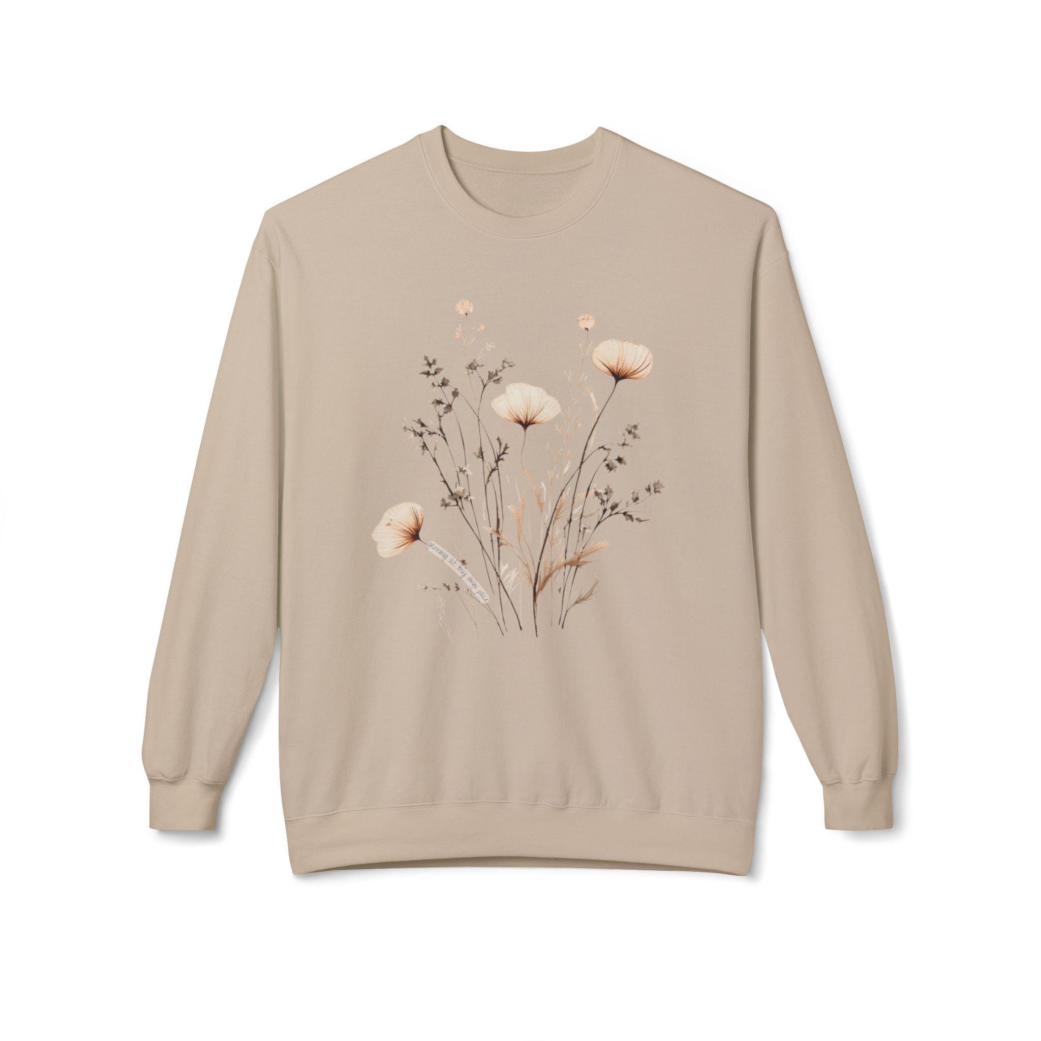 Light, quiet, and effortlessly worn, this midweight crewneck brings a soft hum of countryside calm into weekday routines and slow weekends alike. The delicate watercolor blooms rest low on the chest — muted beige petals and fine, airy stems that look like they were gathered on a stroll at golden hour.