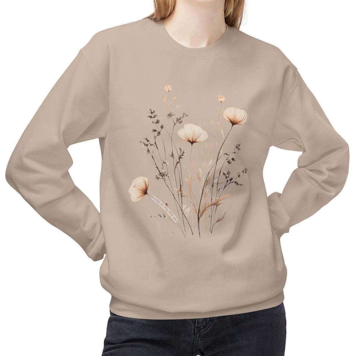 This beautiful wildflower sweatshirt features neutral botanical artwork with the phrase “growing at my own pace” subtly woven along the stem — a quiet affirmation you can carry with you throughout your day.
