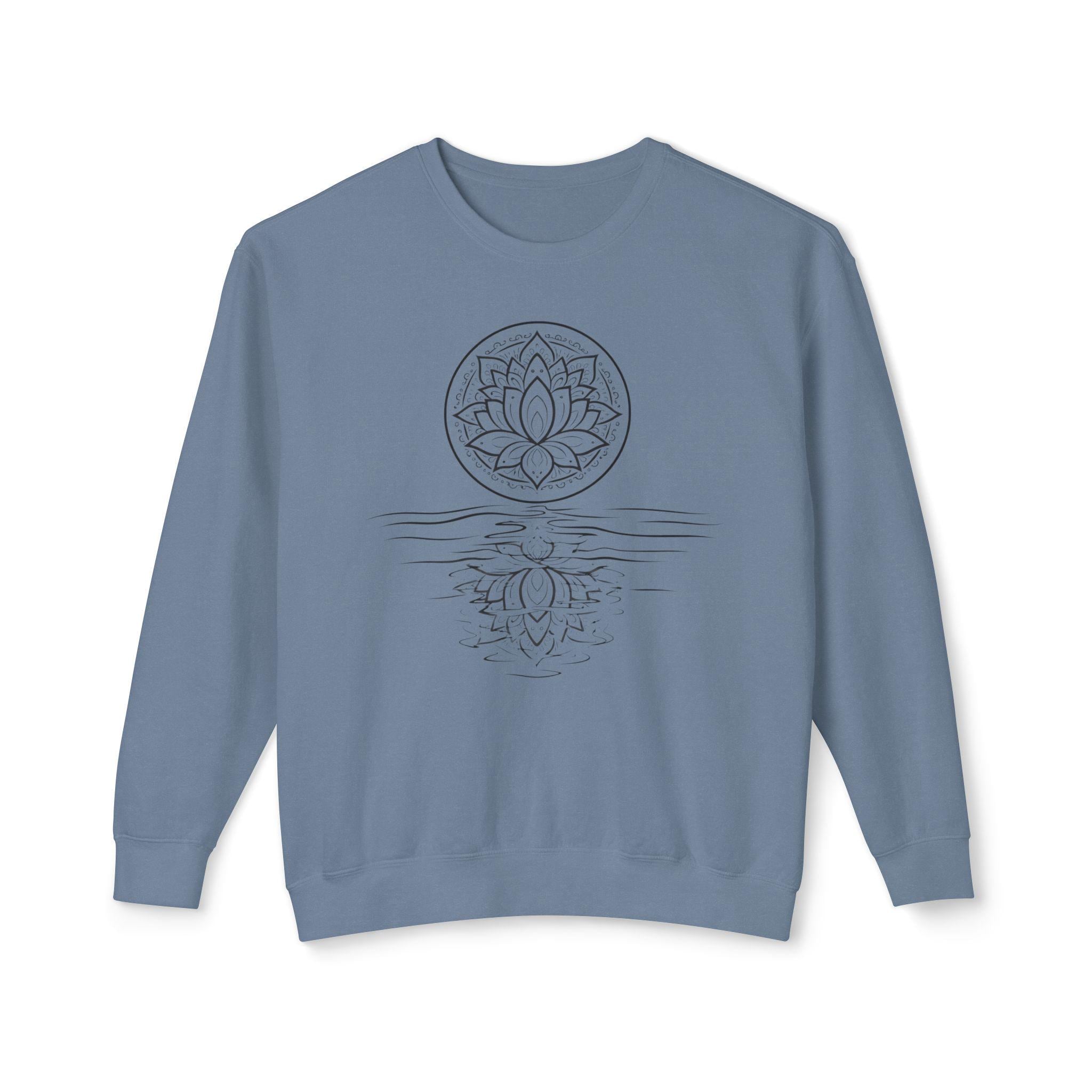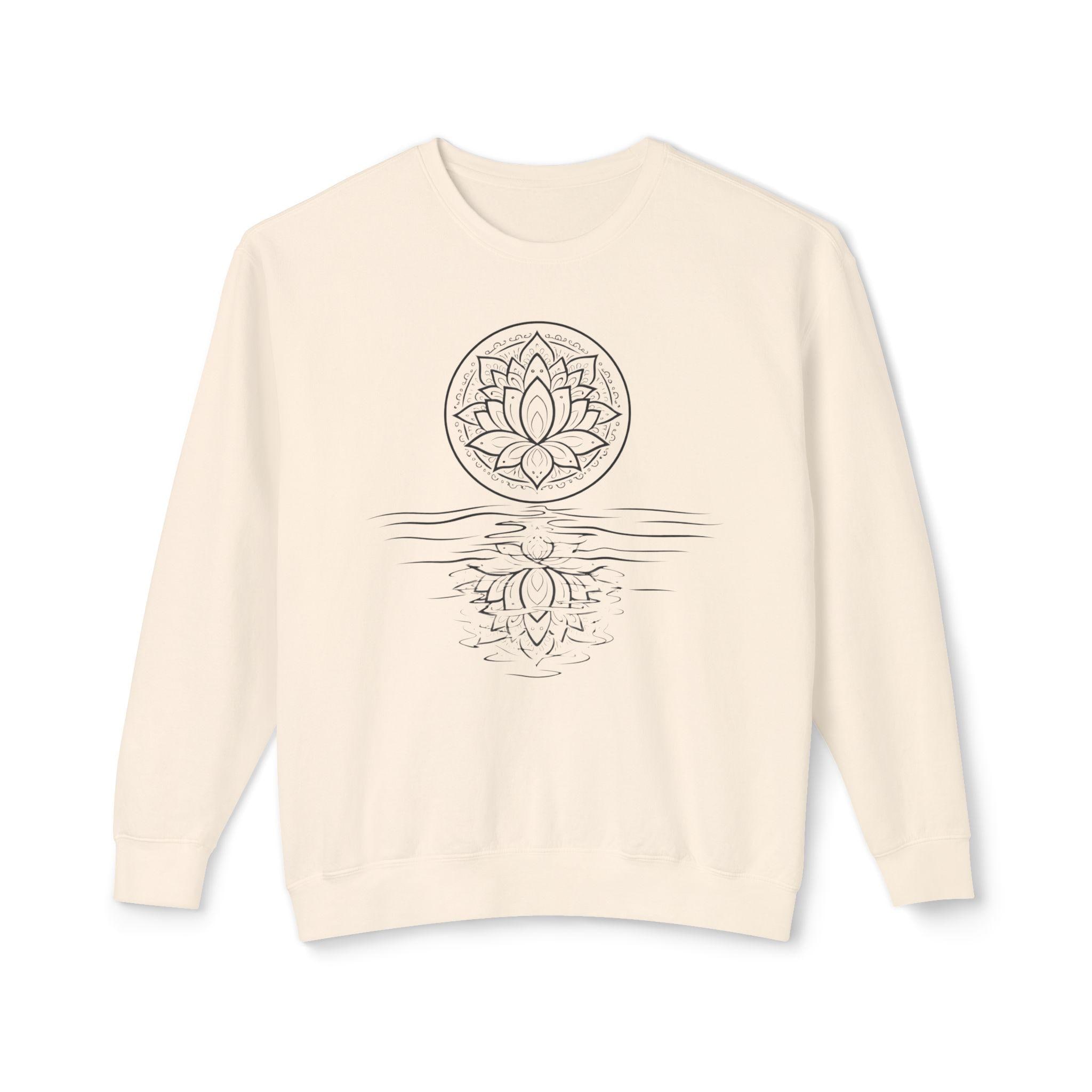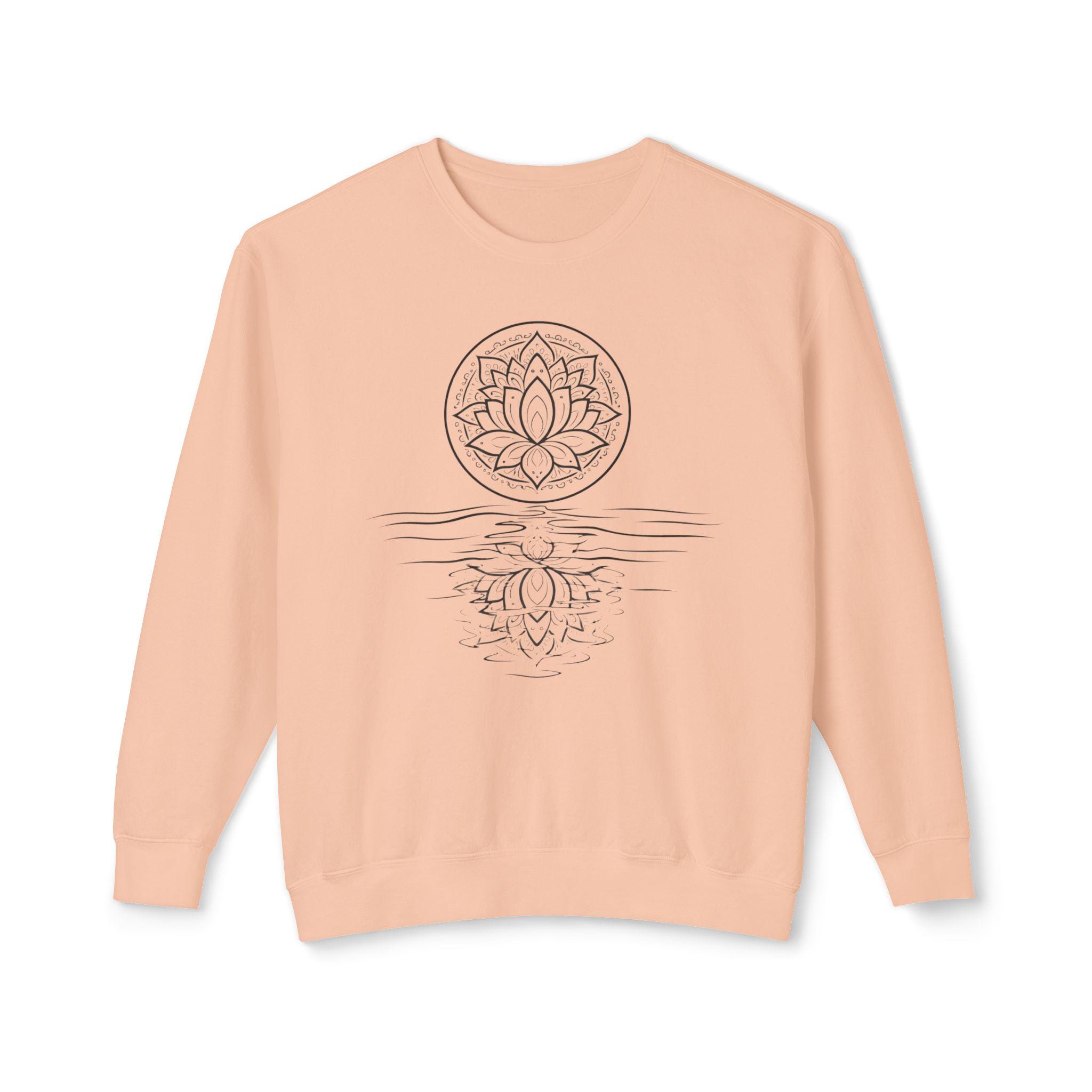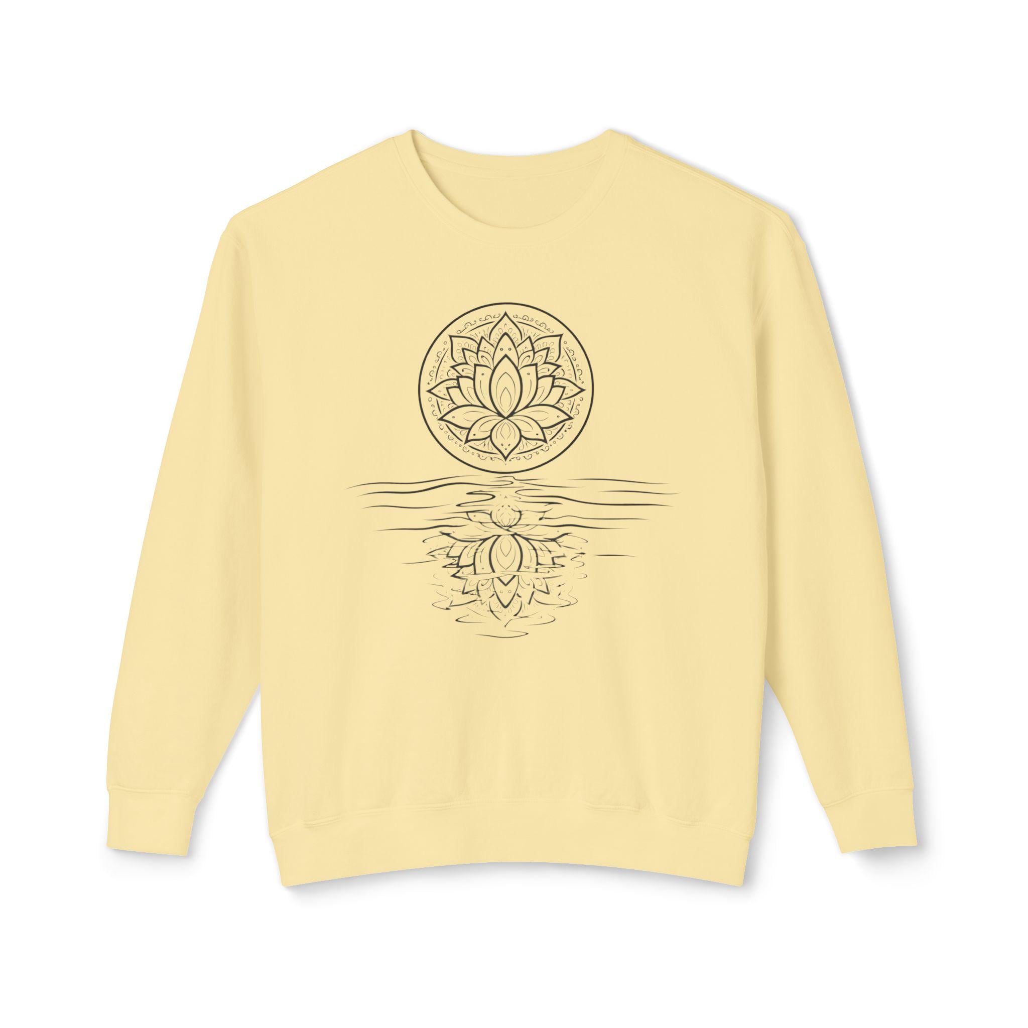 A lightweight Comfort Colors crewneck with a hand-drawn lotus reflection — soft, relaxed, and made for slow mornings, yoga, and mindful living.
