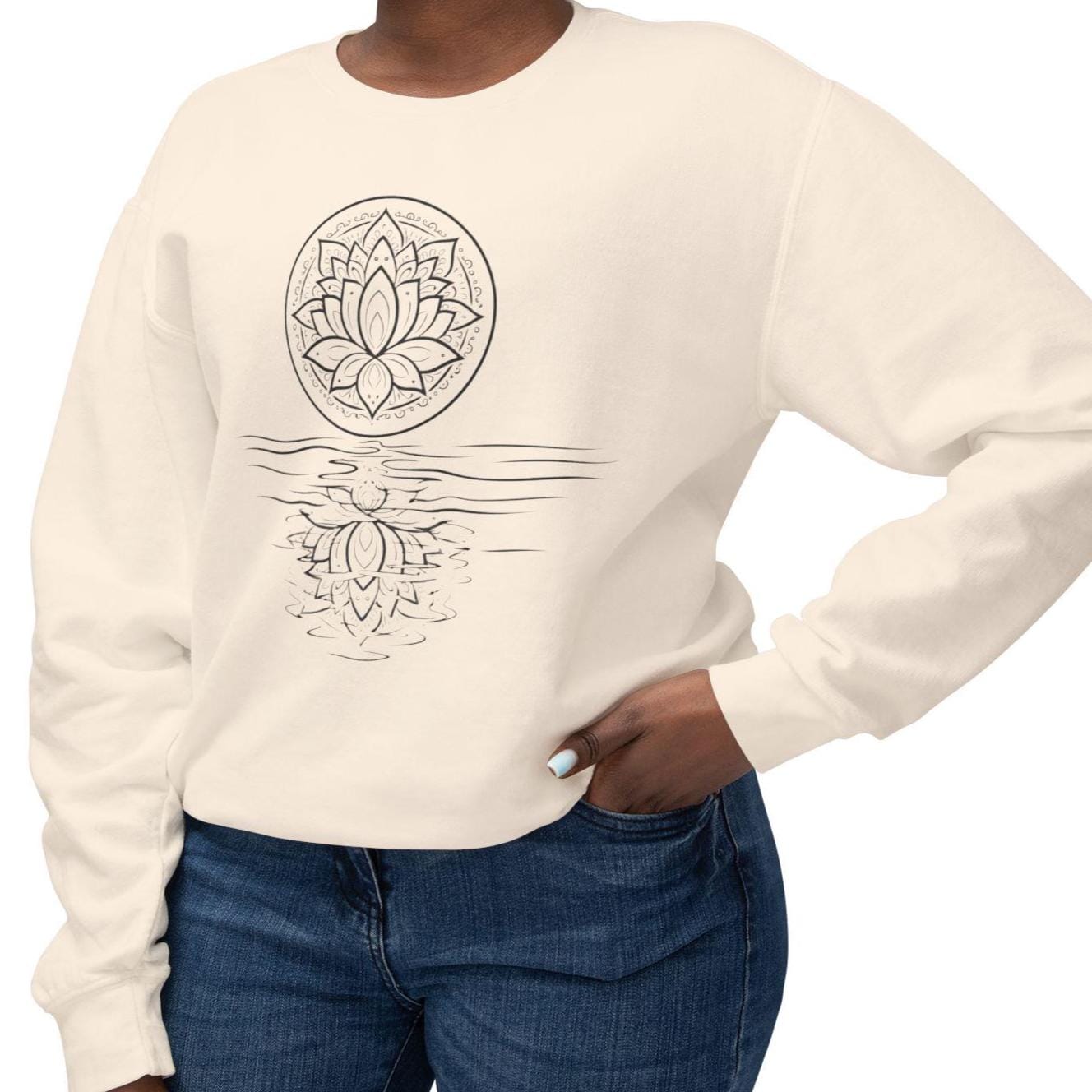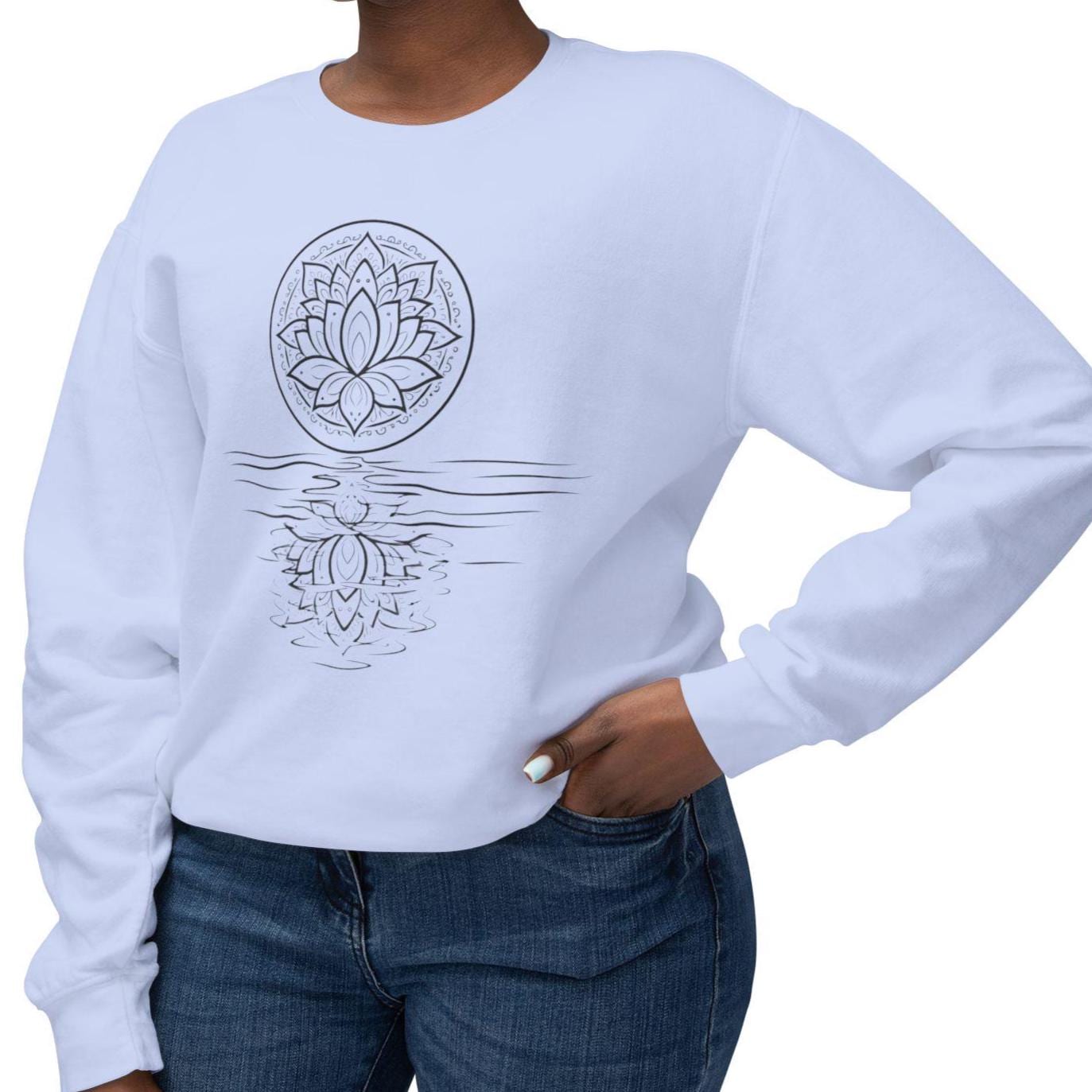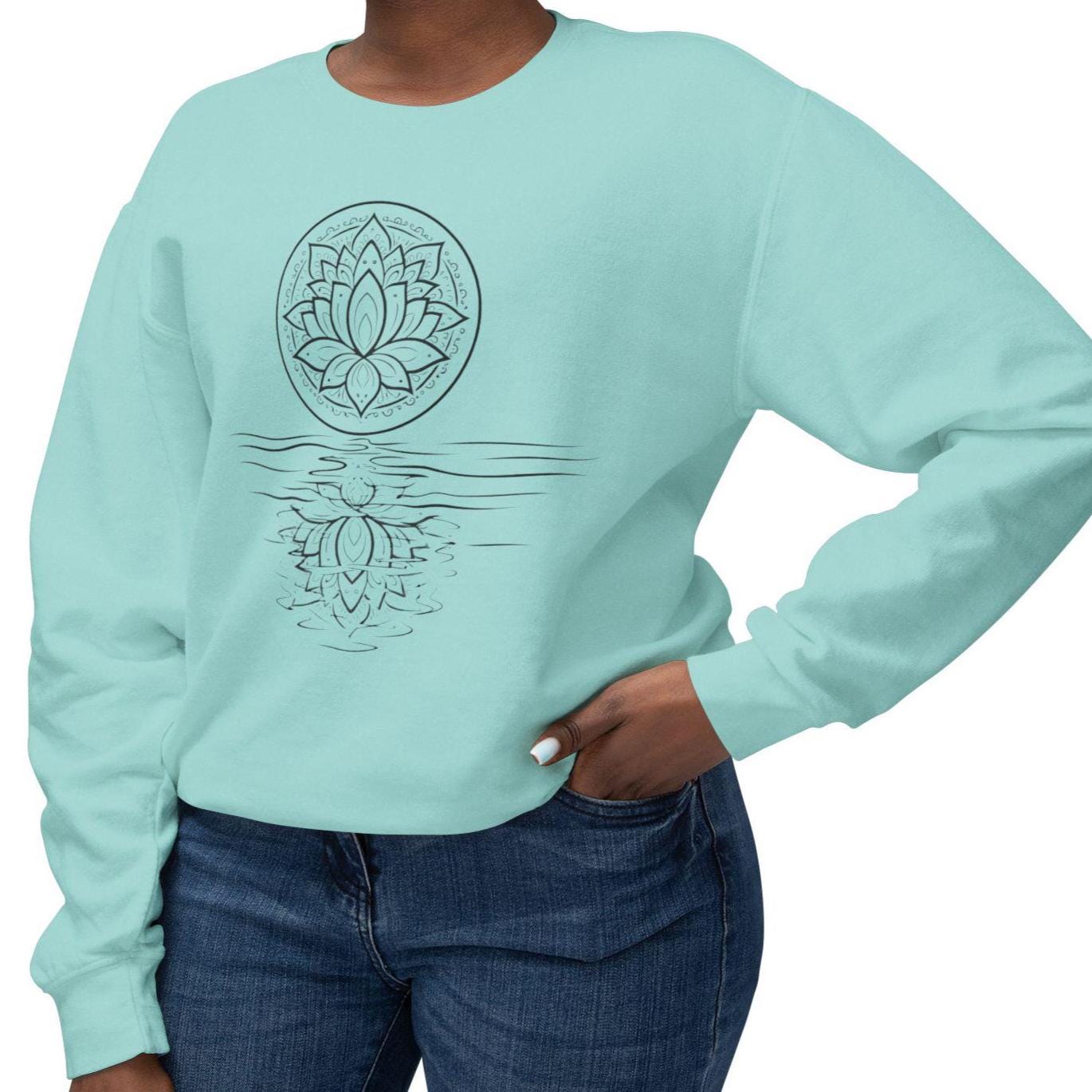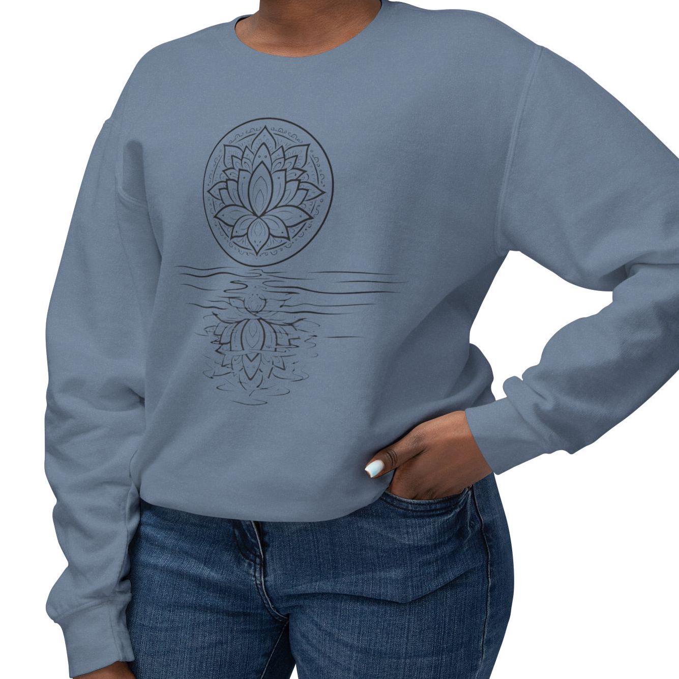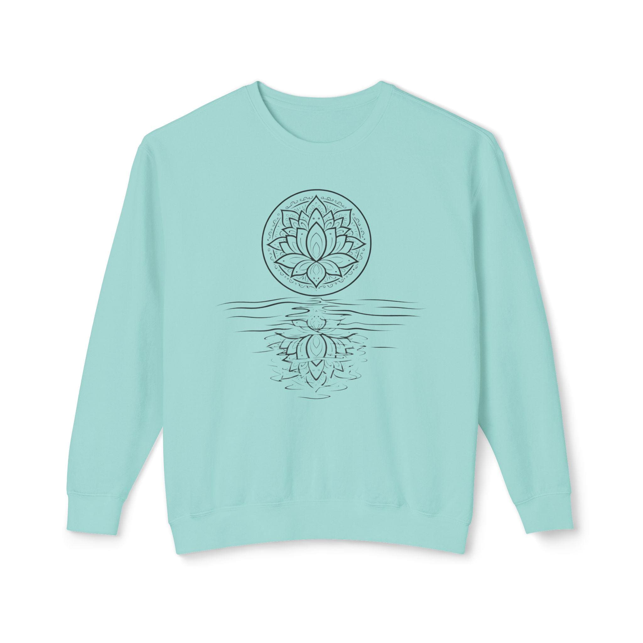 A lightweight Comfort Colors crewneck with a hand-drawn lotus reflection — soft, relaxed, and made for slow mornings, yoga, and mindful living.