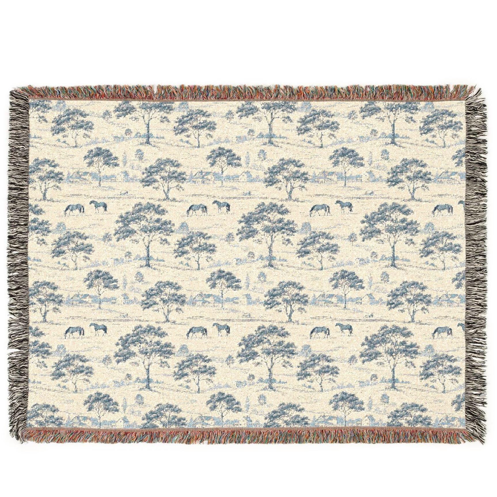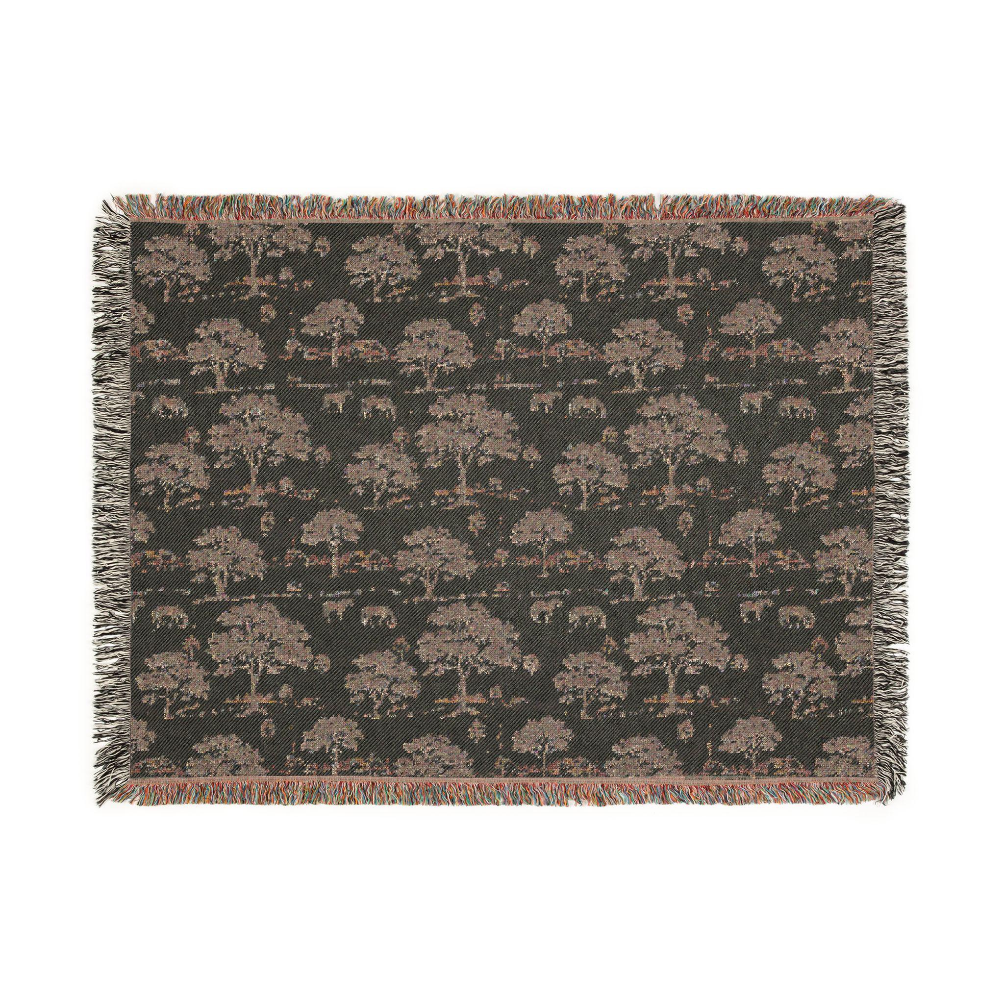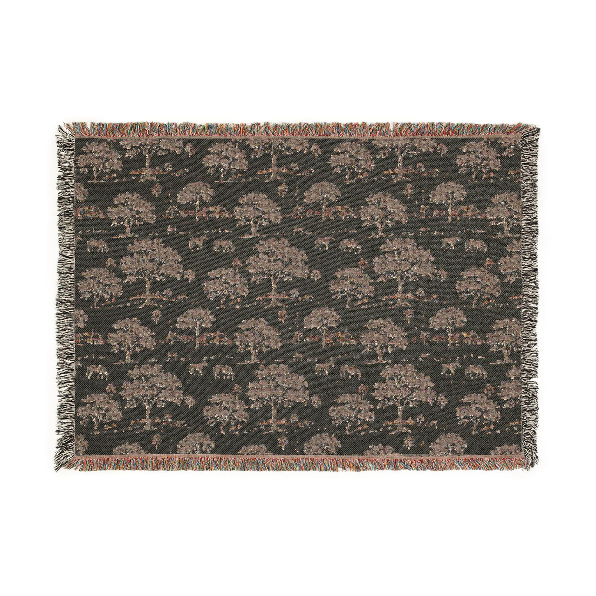 🌿 A storybook-inspired woven blanket featuring a peaceful countryside scene with trees, homes, and grazing animals. Heavyweight, textured, and rich with nostalgic charm.