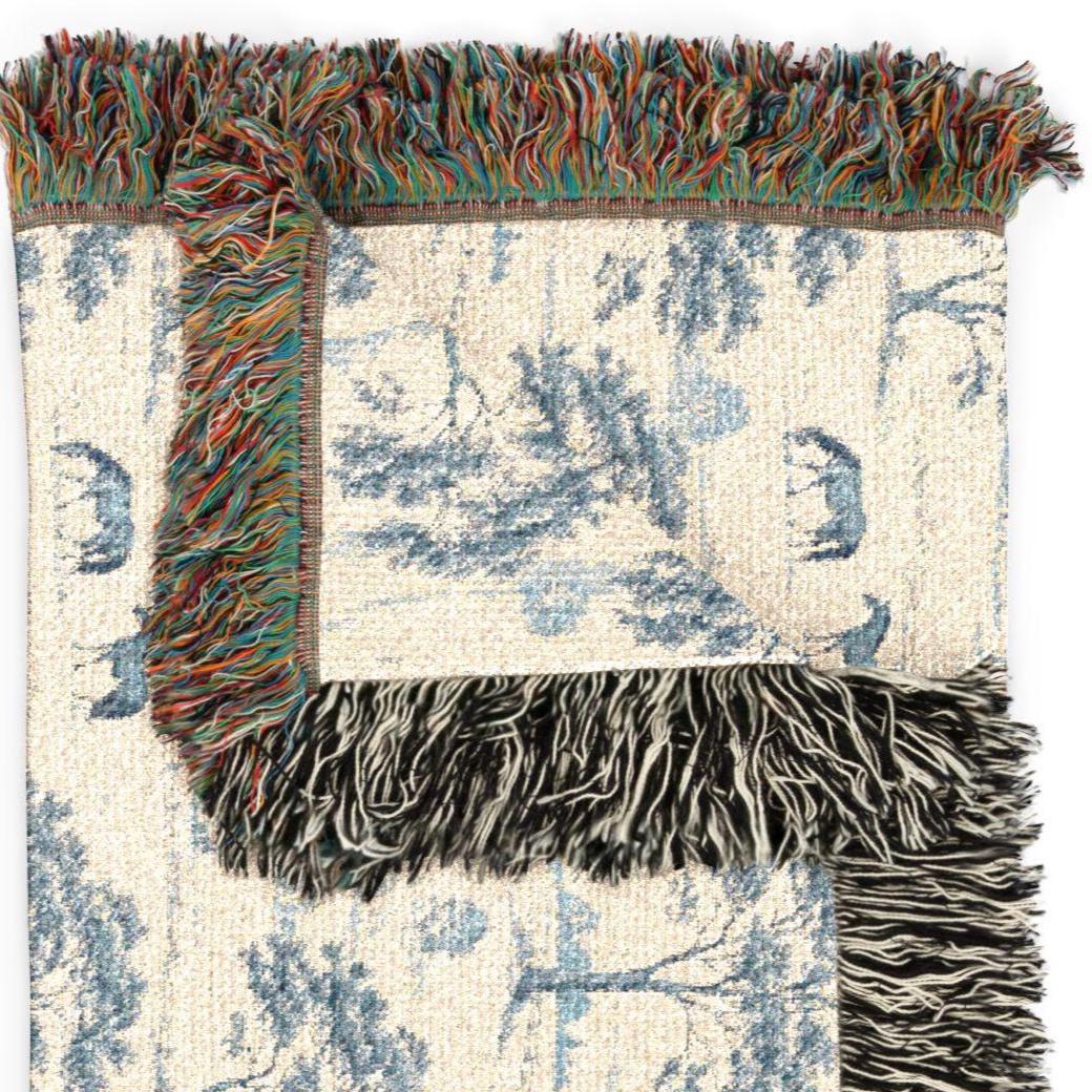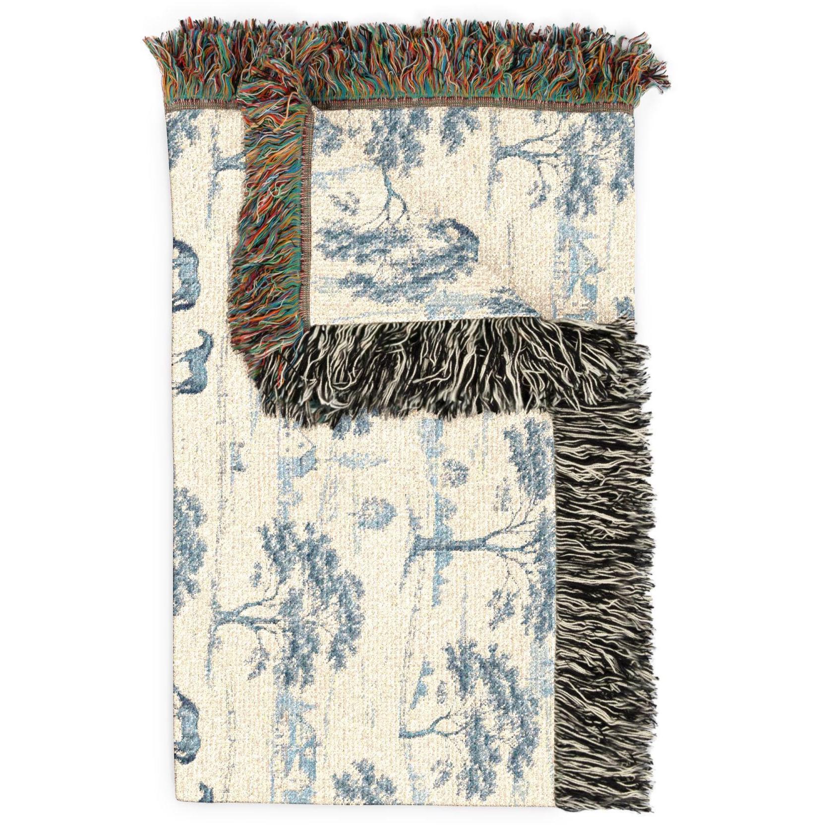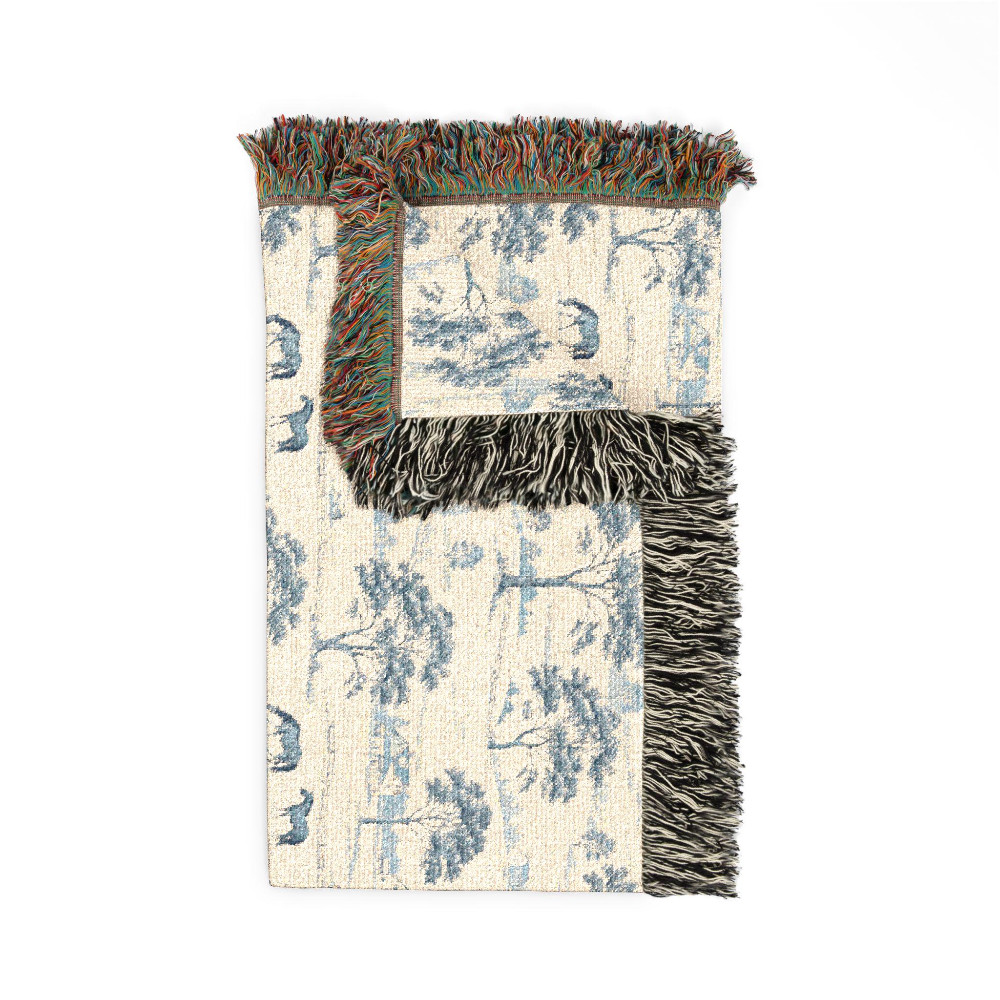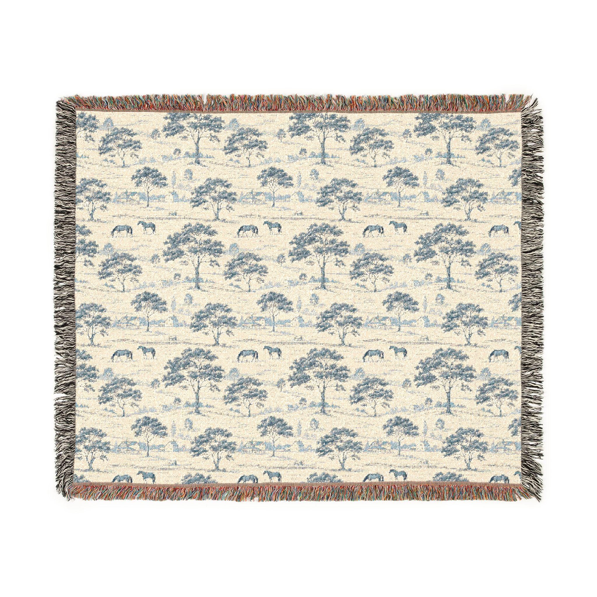 🌿 A storybook-inspired woven blanket featuring a peaceful countryside scene with trees, homes, and grazing animals. Heavyweight, textured, and rich with nostalgic charm.