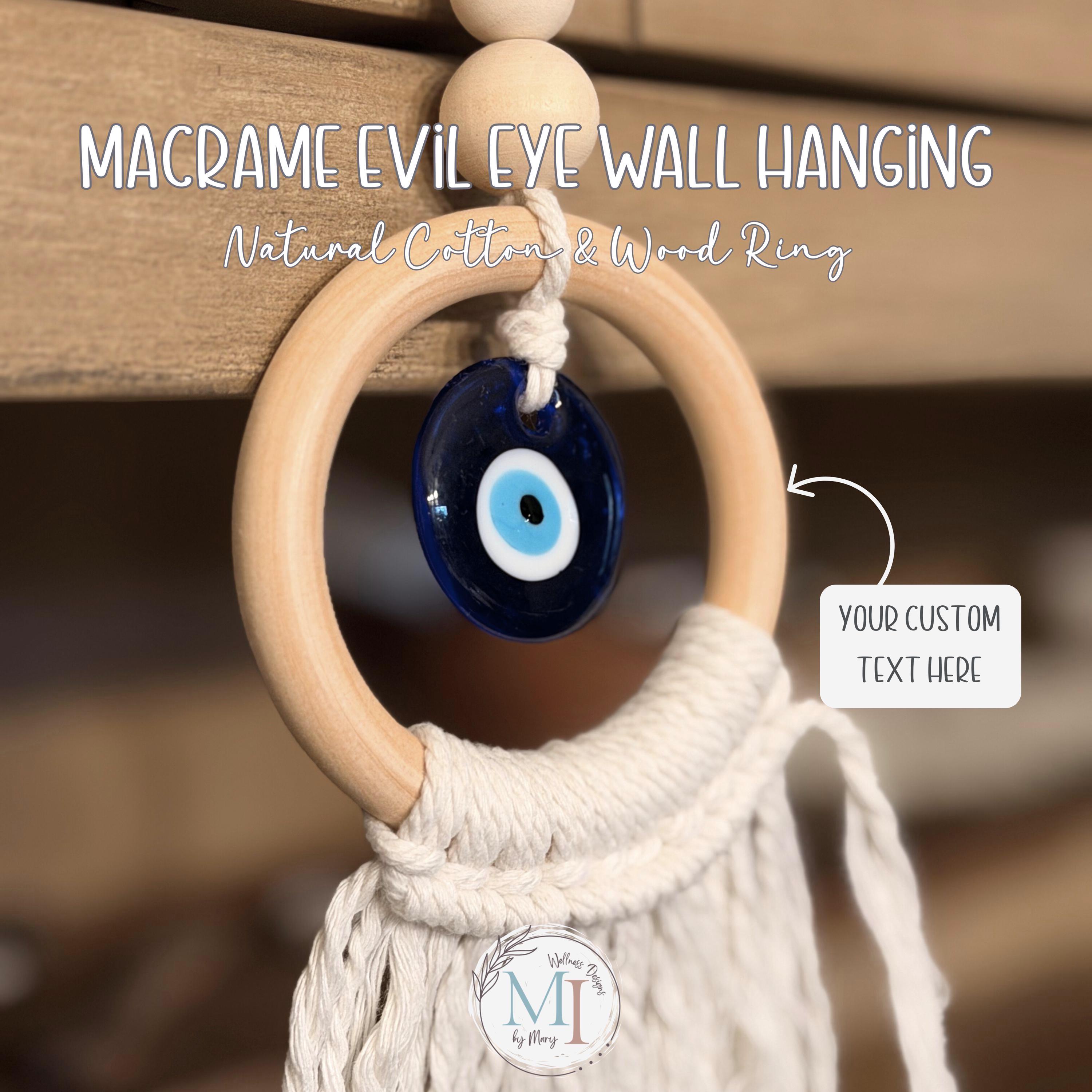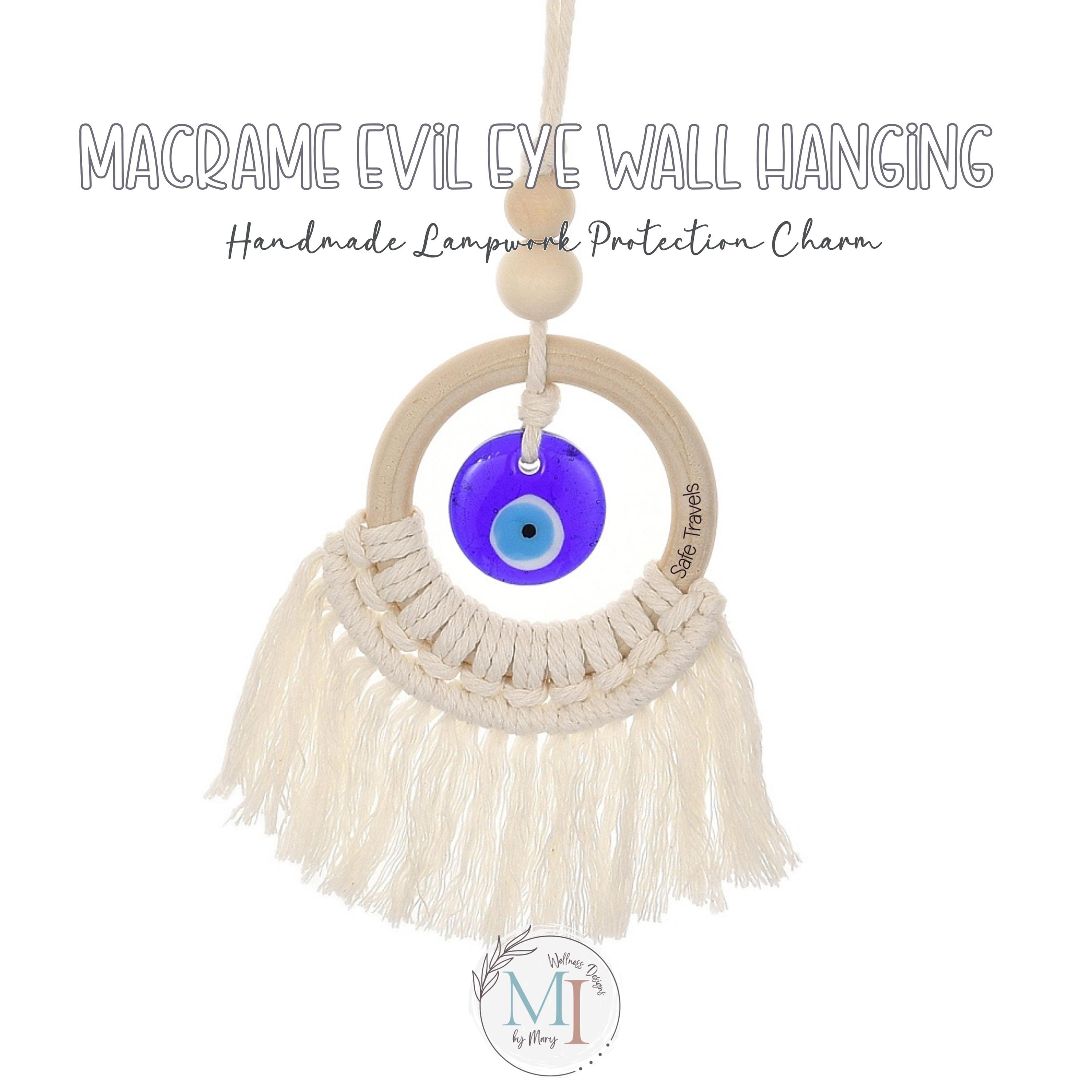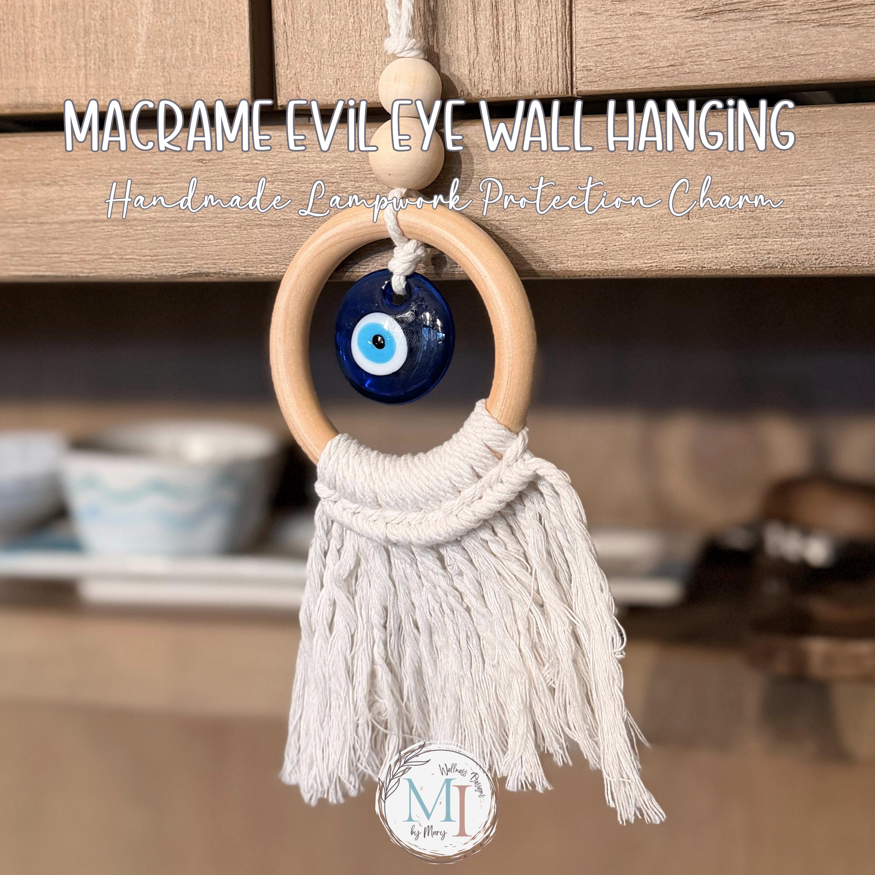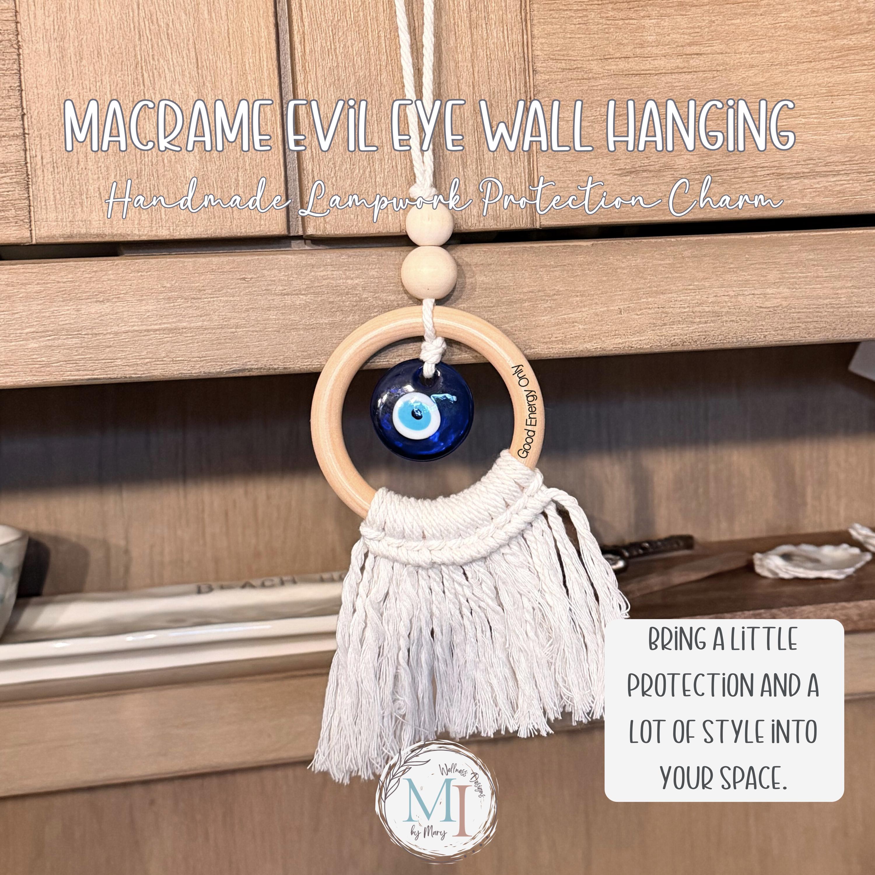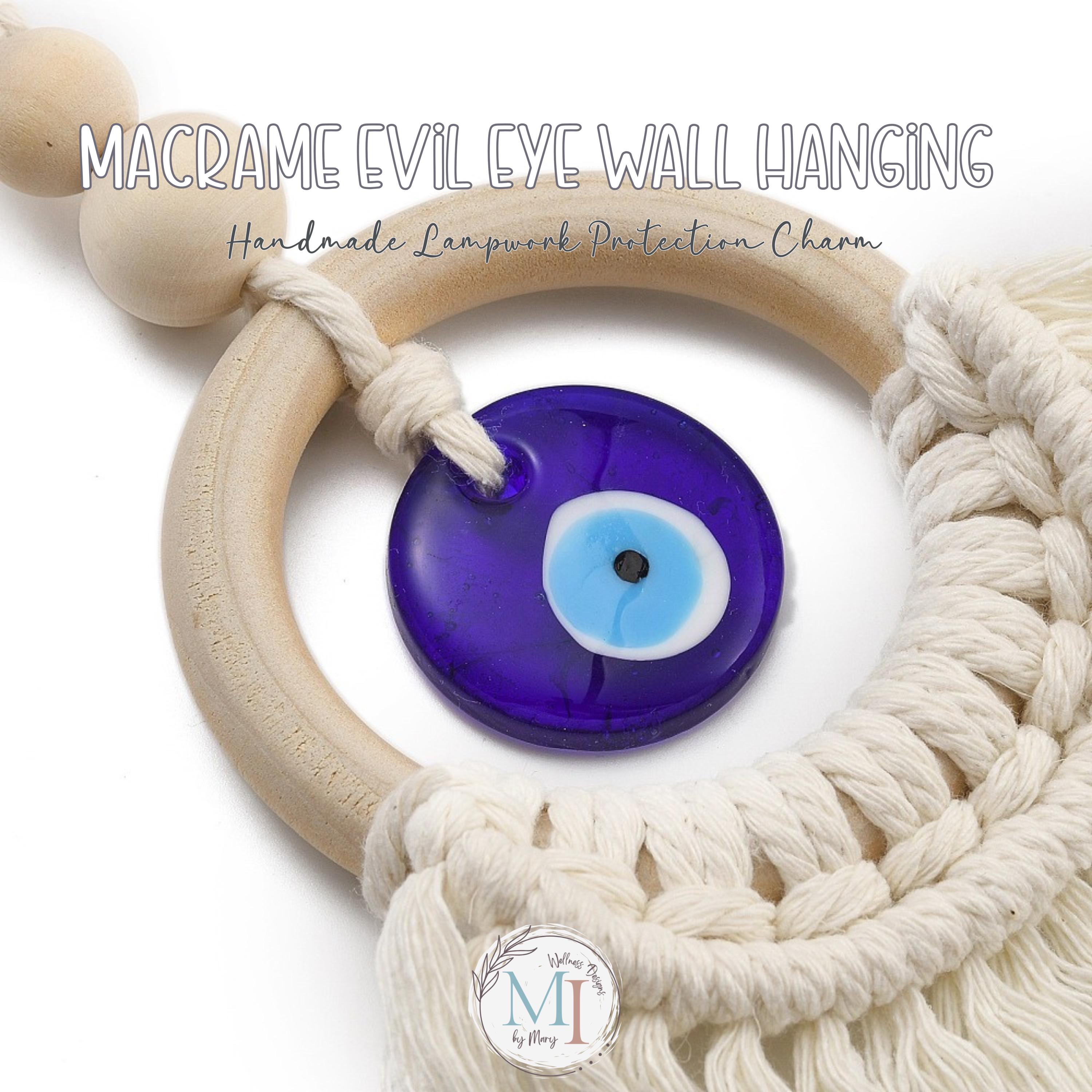 This handmade macrame evil eye wall hanging blends soft cotton macramé, a smooth natural wood ring, and a handcrafted blue lampwork eye — traditionally believed to help protect, invite peace, and keep negative energy away.