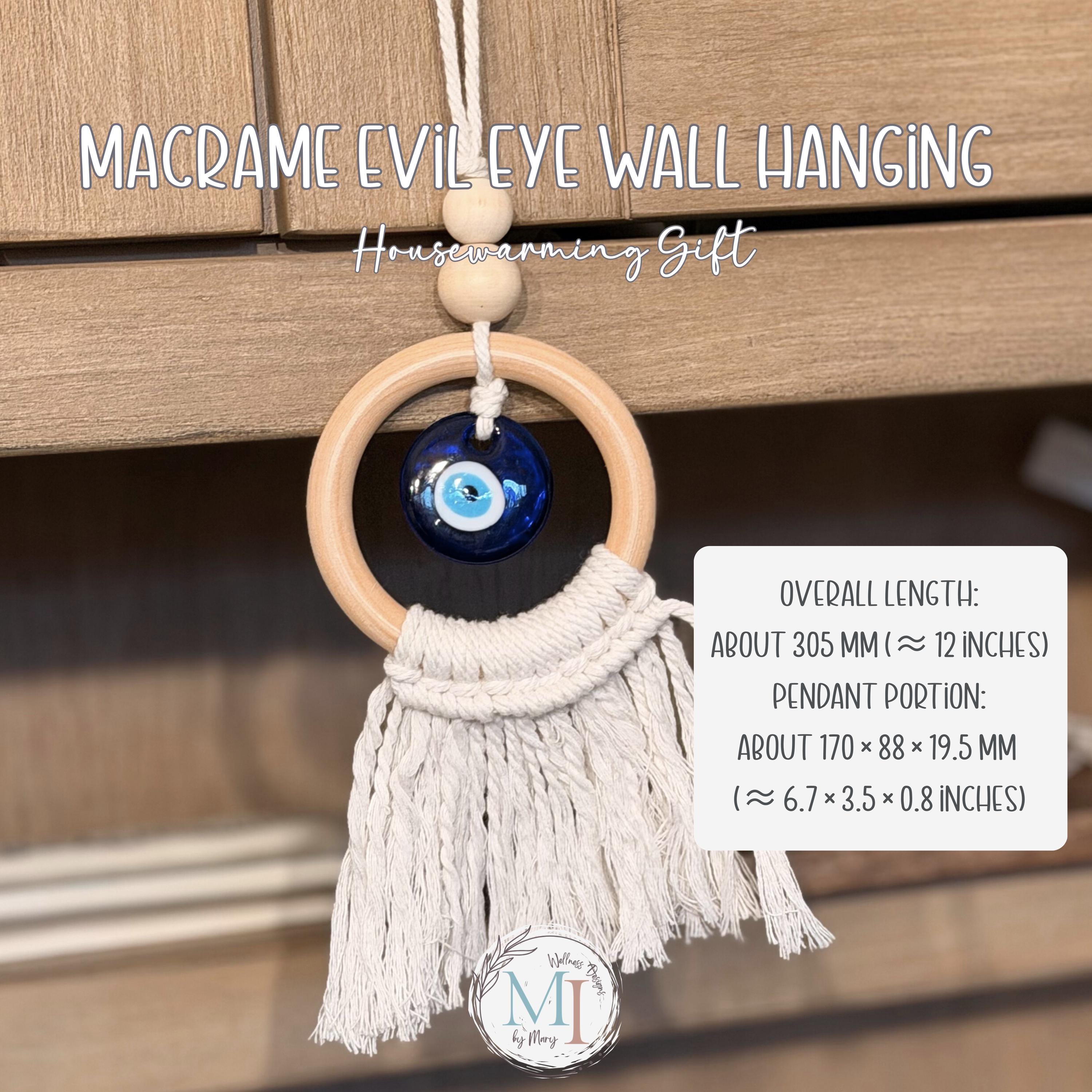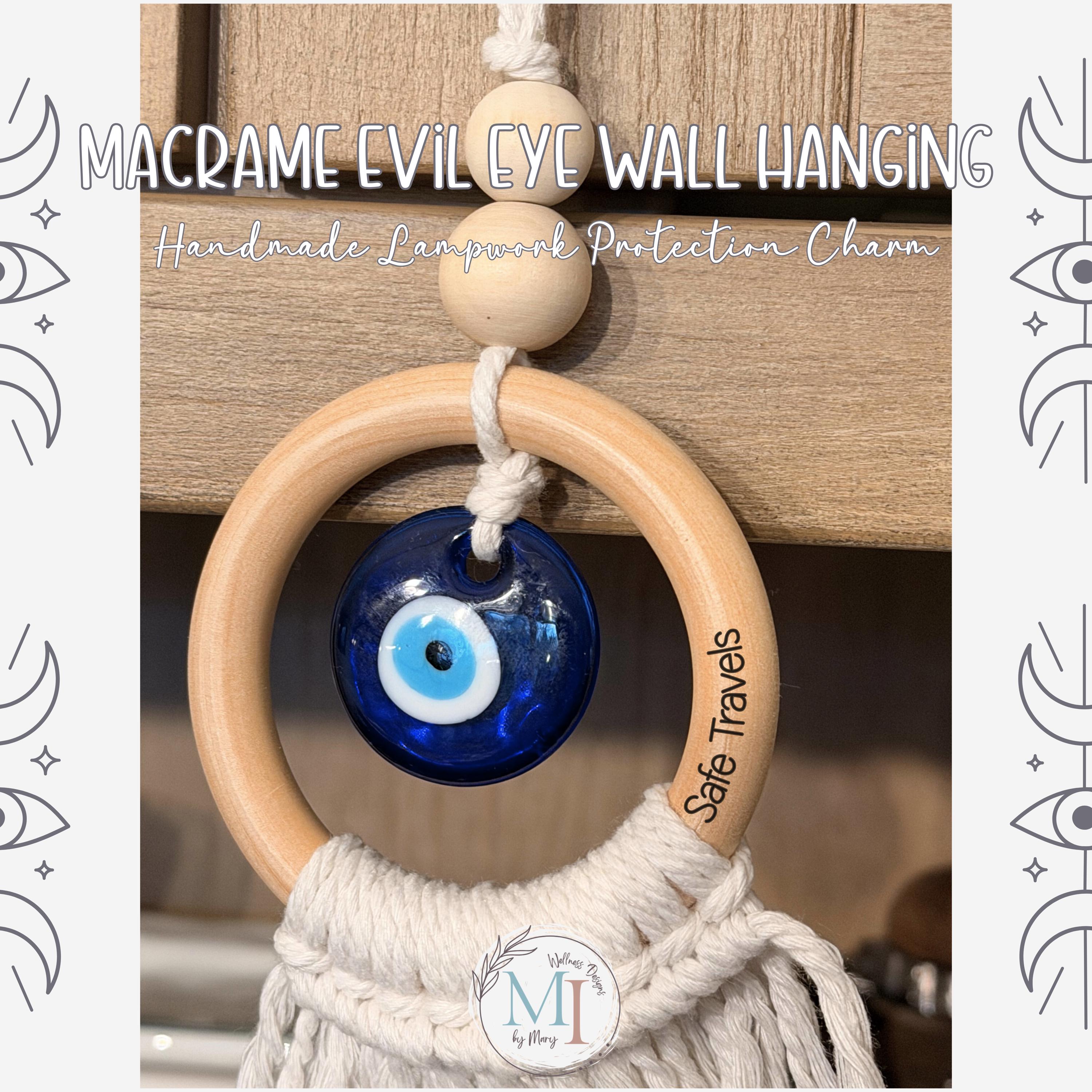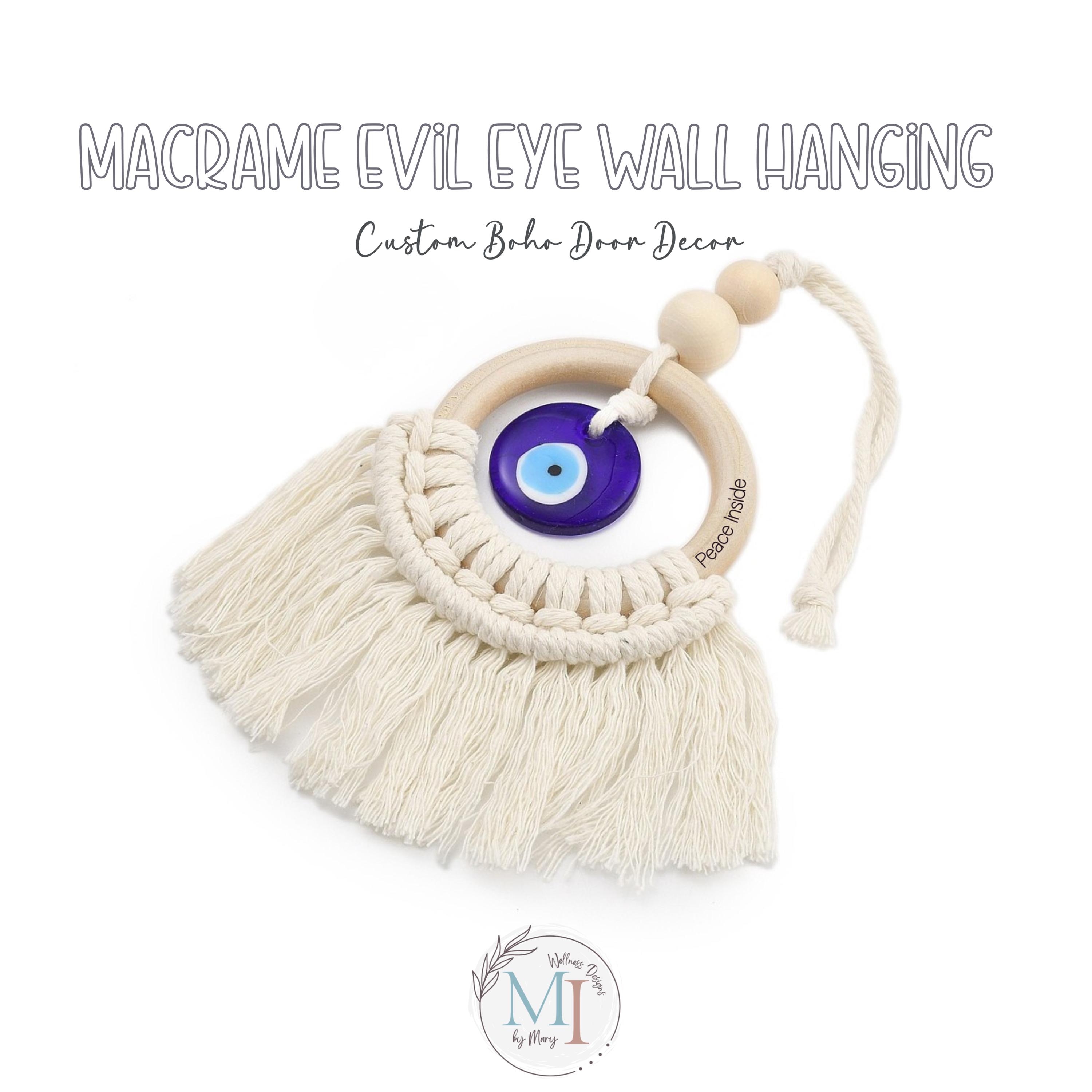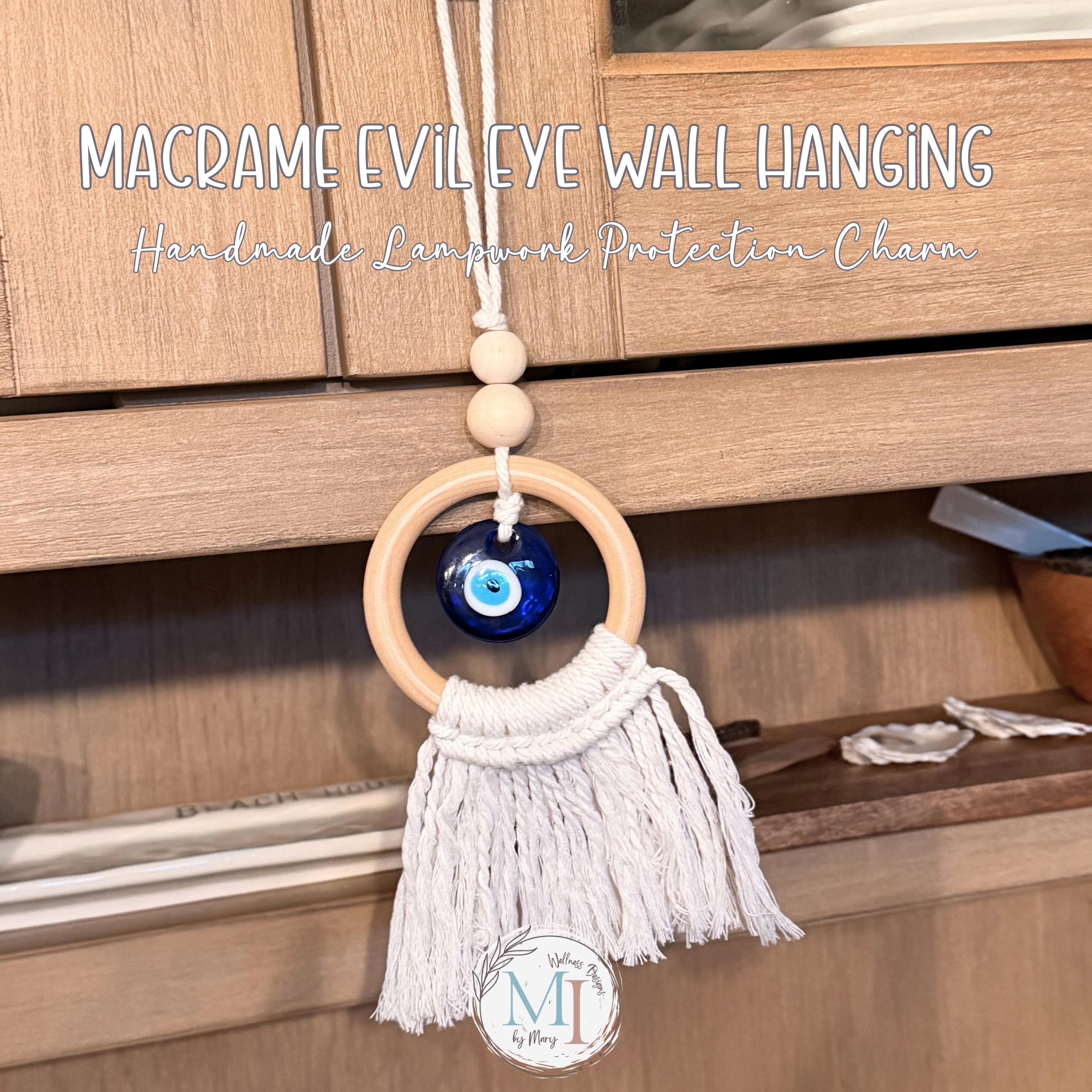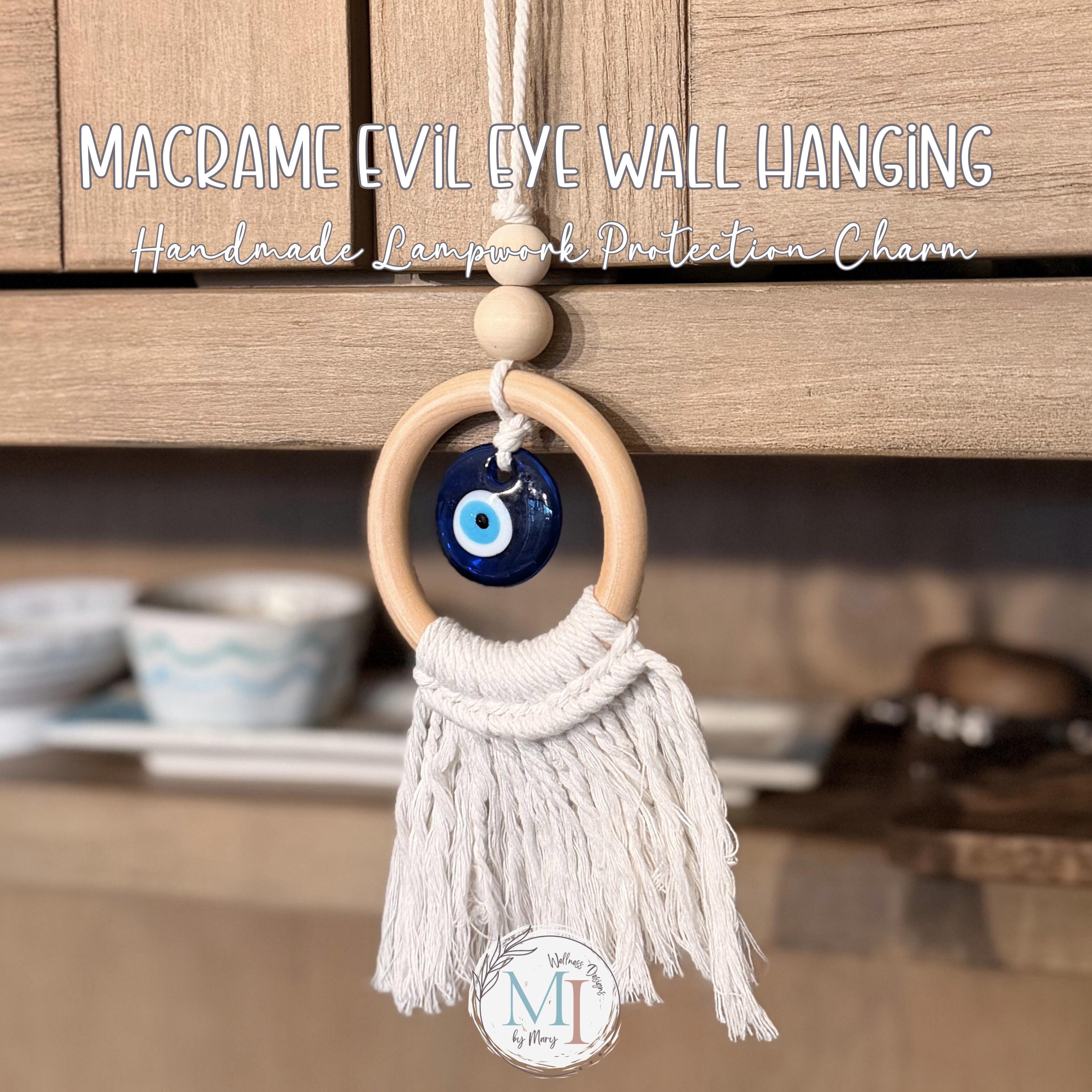 This handmade macrame evil eye wall hanging blends soft cotton macramé, a smooth natural wood ring, and a handcrafted blue lampwork eye — traditionally believed to help protect, invite peace, and keep negative energy away.