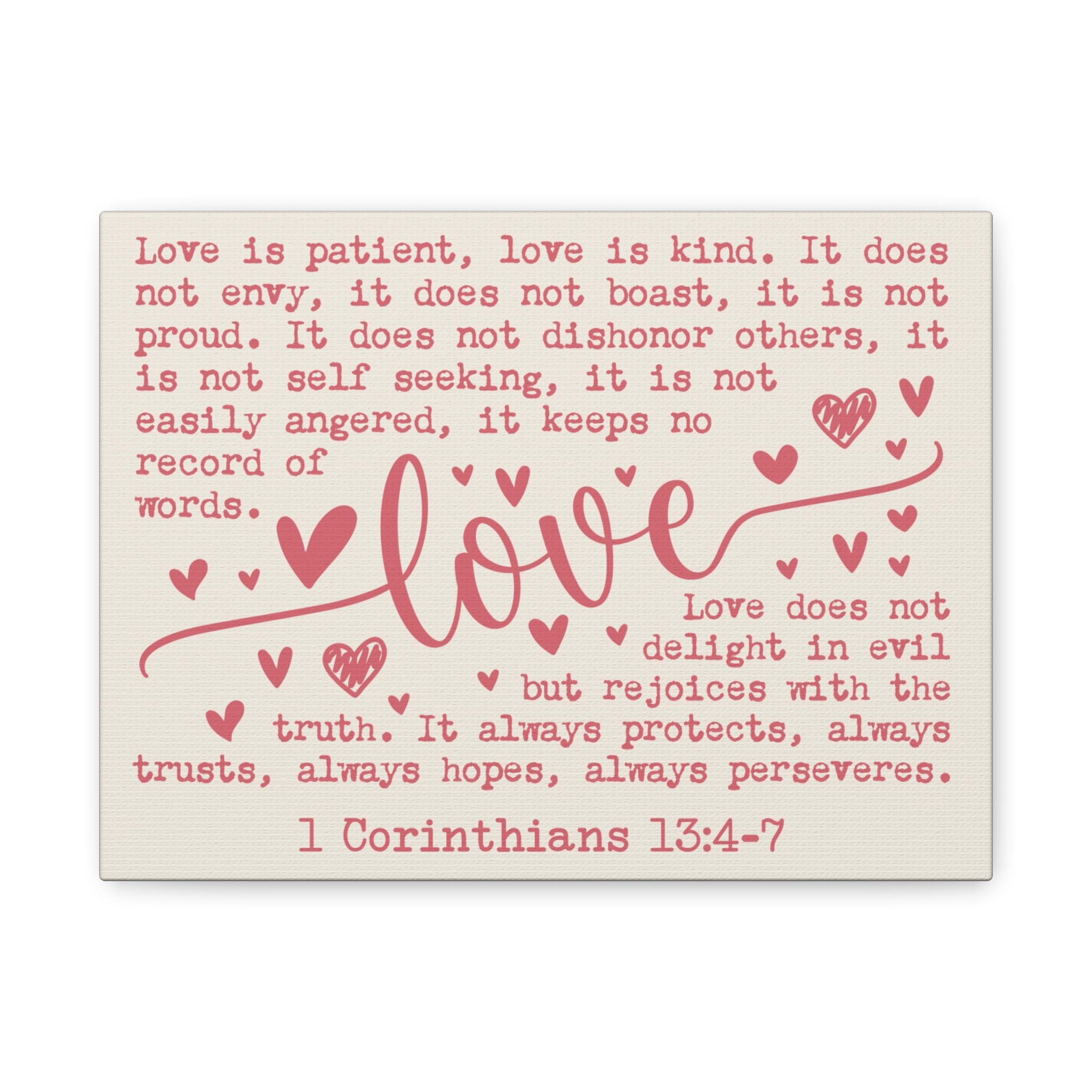 This matte stretched canvas quietly carries the words of 1 Corinthians 13:4–7 into your home with gentle, handwritten pink script on a cream backdrop.