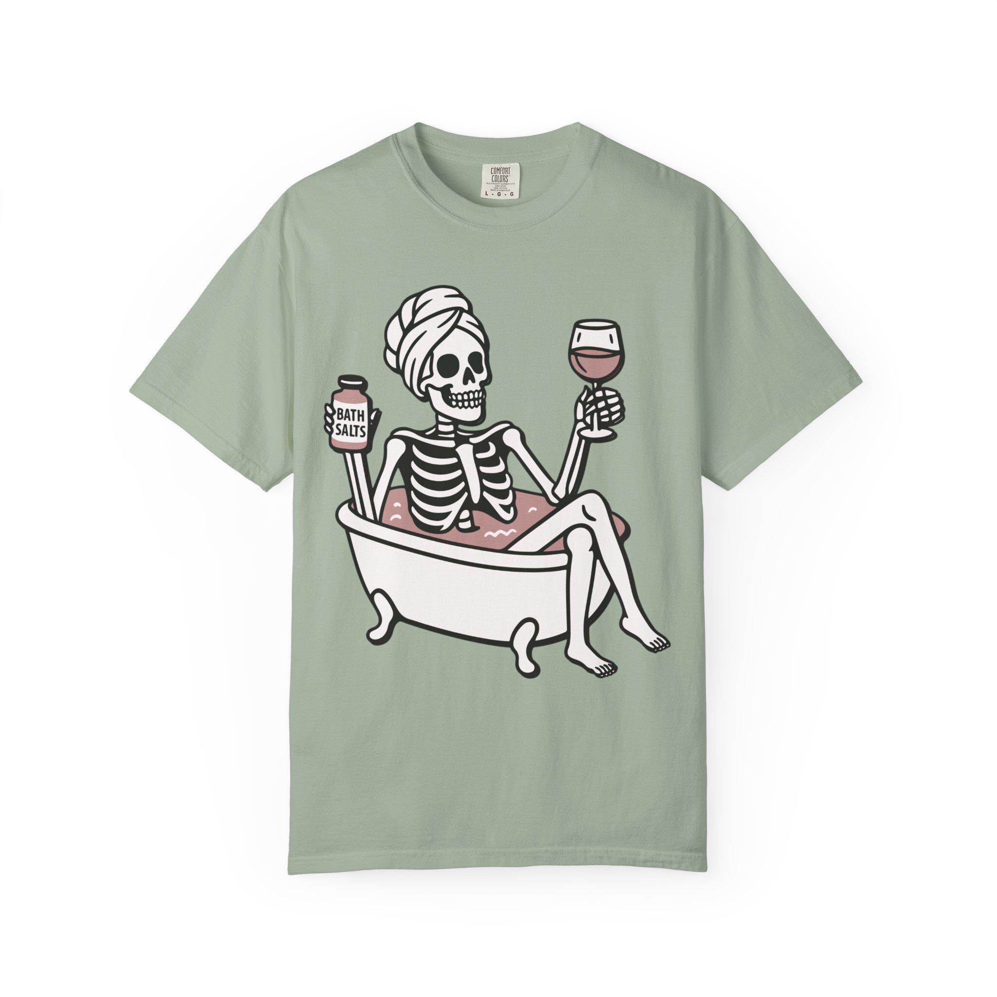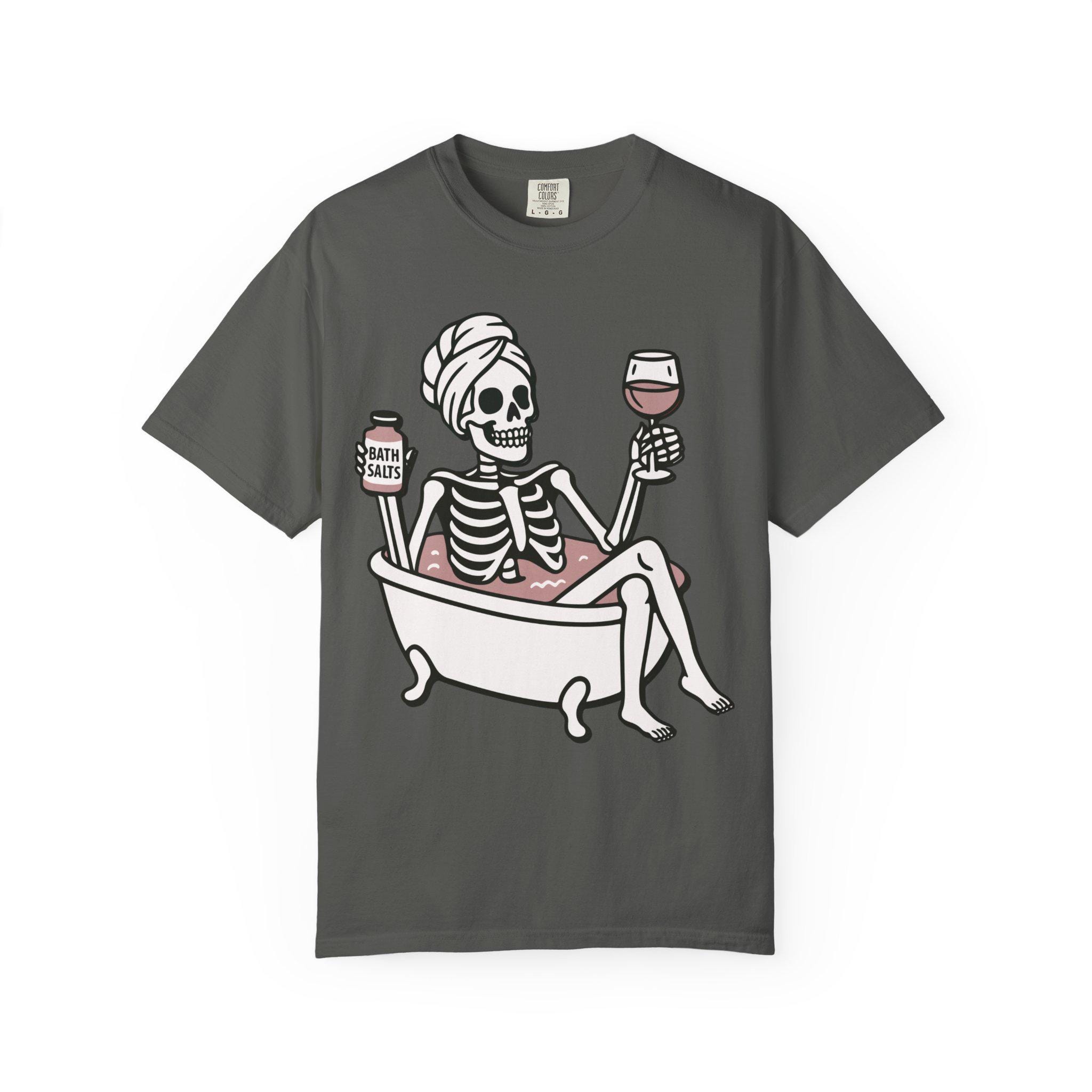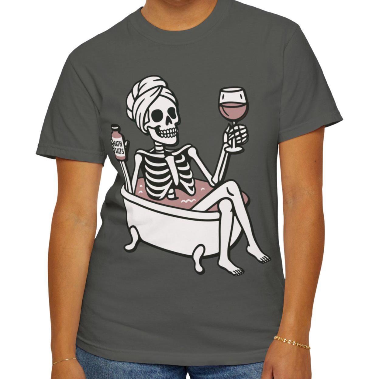 This skeleton bath shirt features a relaxed skeleton soaking in a clawfoot tub, holding bath salts in one hand and a glass of wine in the other — because rest is sacred, even in the afterlife.