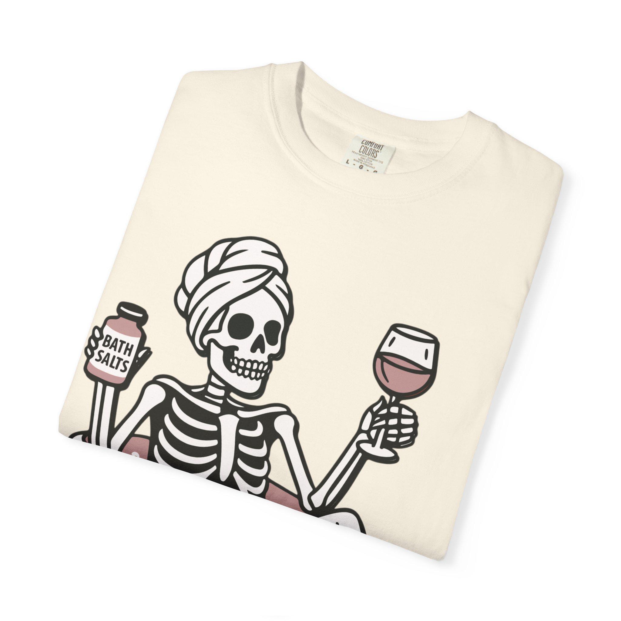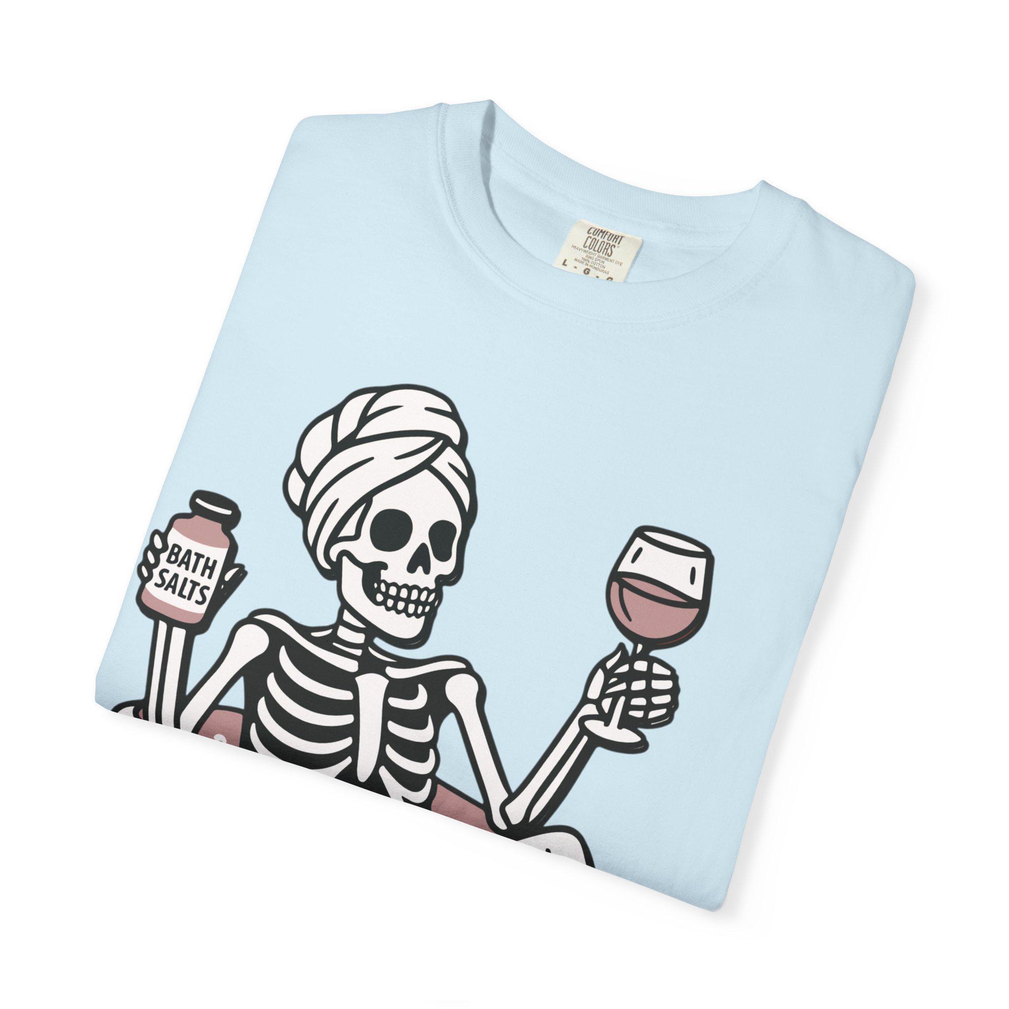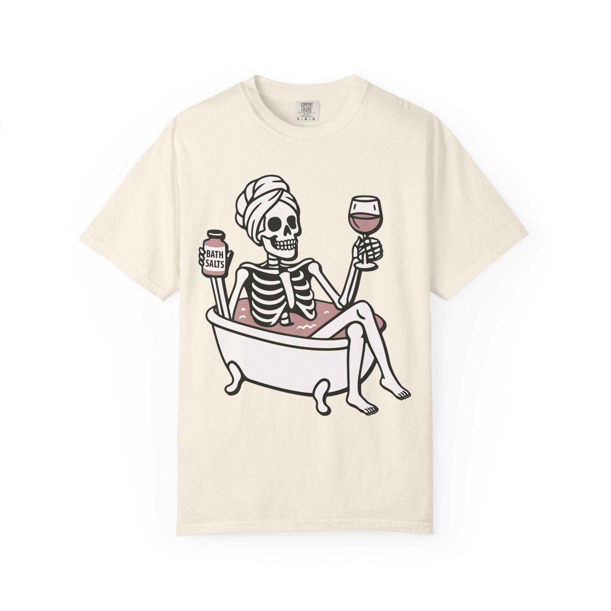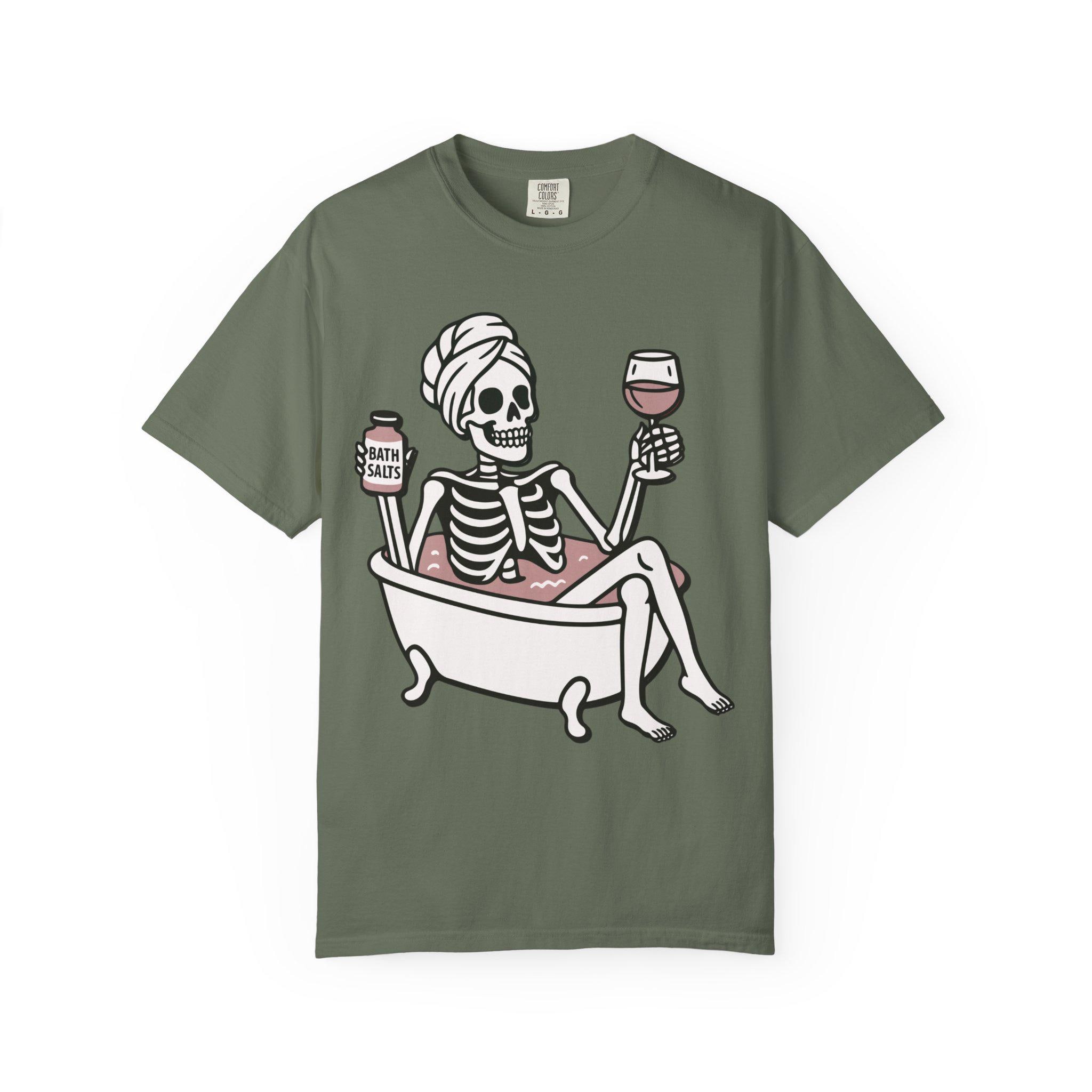 This skeleton bath shirt features a relaxed skeleton soaking in a clawfoot tub, holding bath salts in one hand and a glass of wine in the other — because rest is sacred, even in the afterlife.