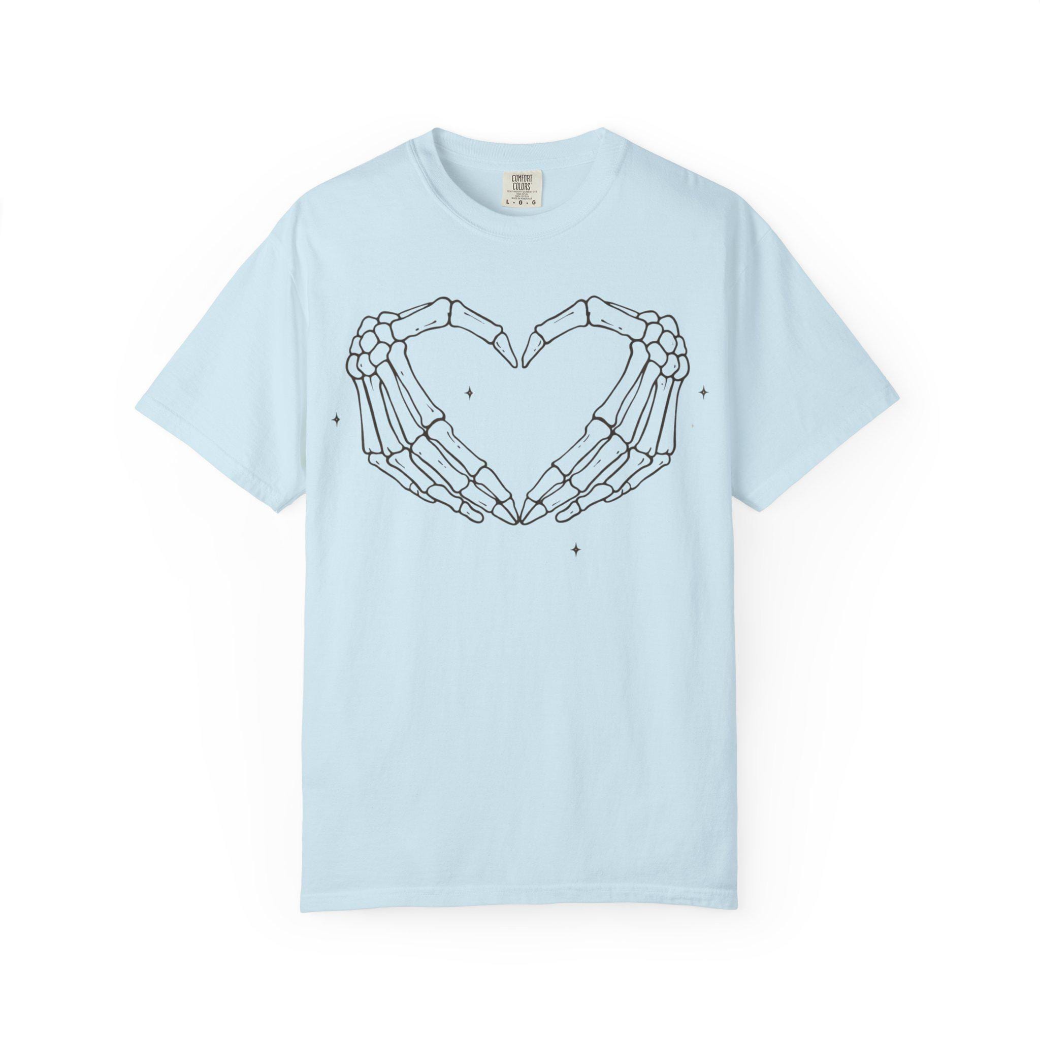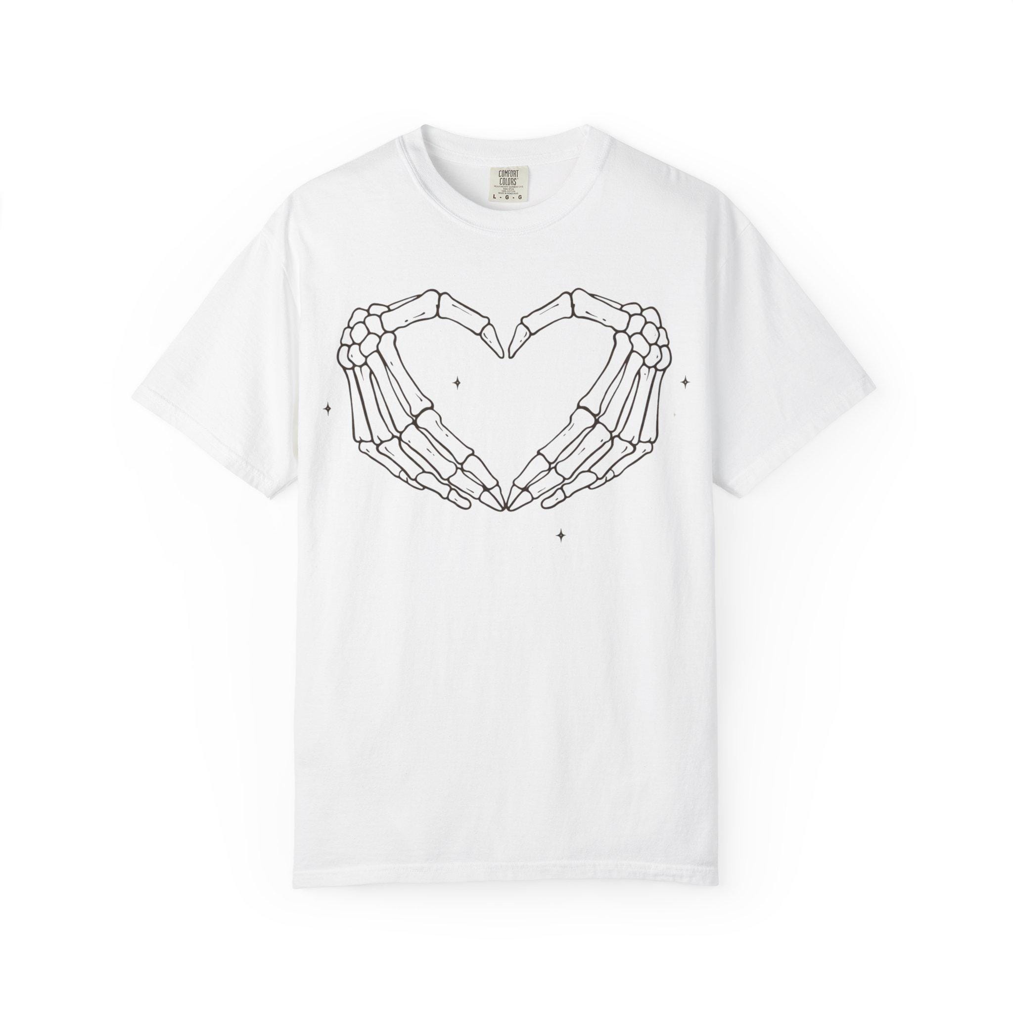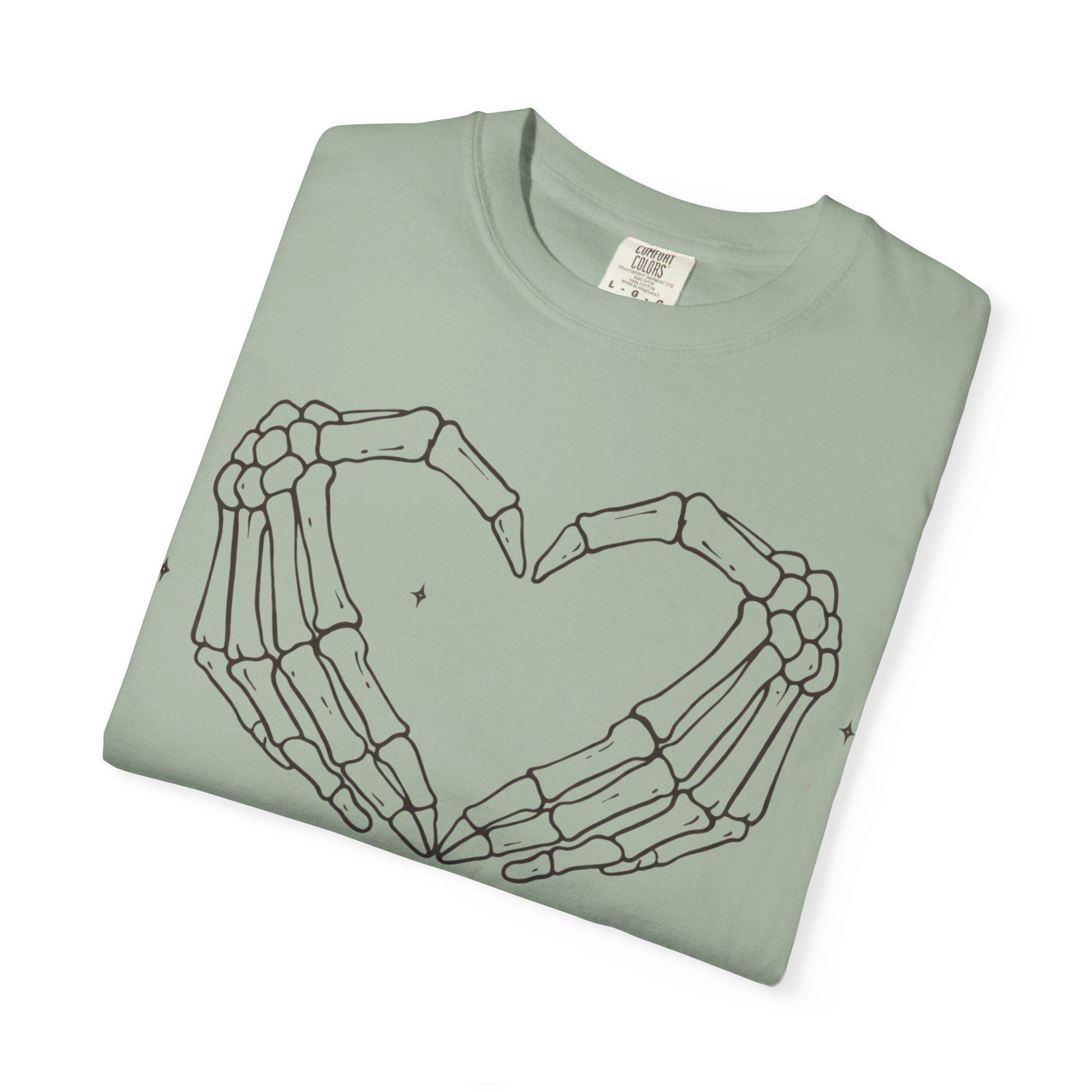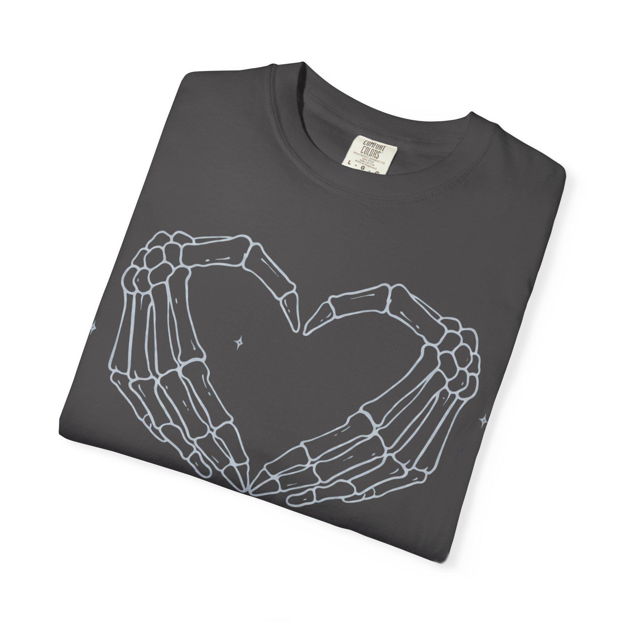 This skeleton heart hands shirt features two skeletal hands forming a heart shape, symbolizing connection, devotion, and love that transcends time, bodies, and expectations.