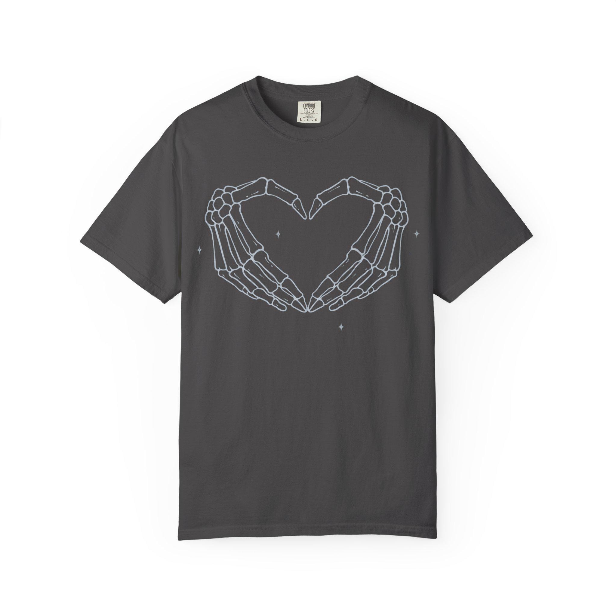This soft goth skeleton heart hands shirt features two skeletal hands forming a heart ā a quiet symbol of devotion, connection, and love that lasts.