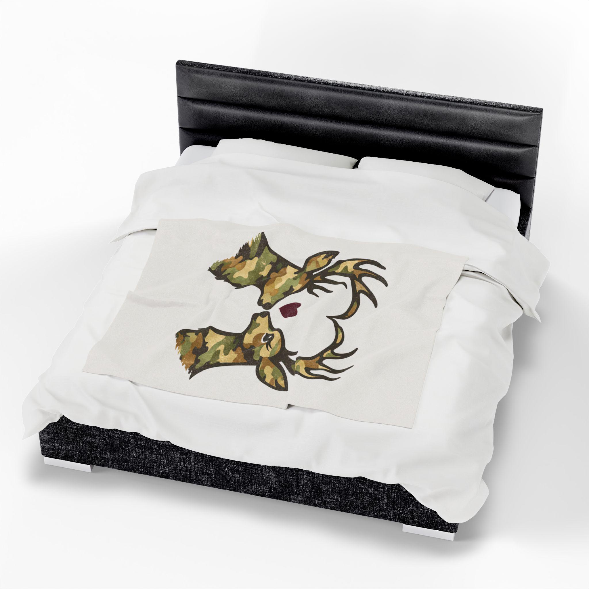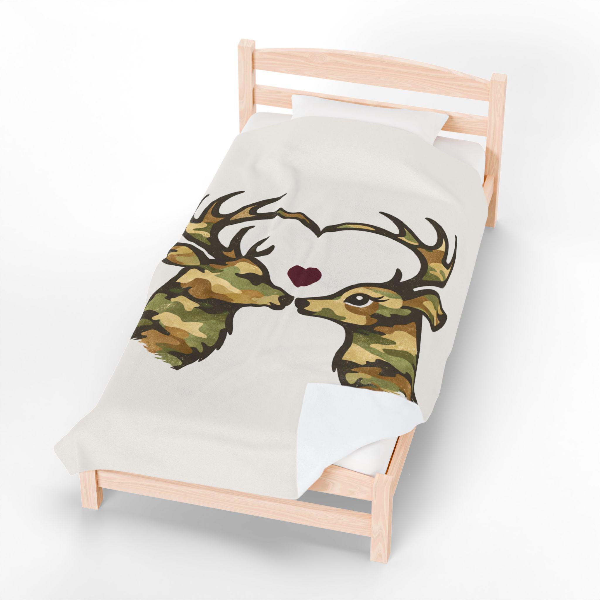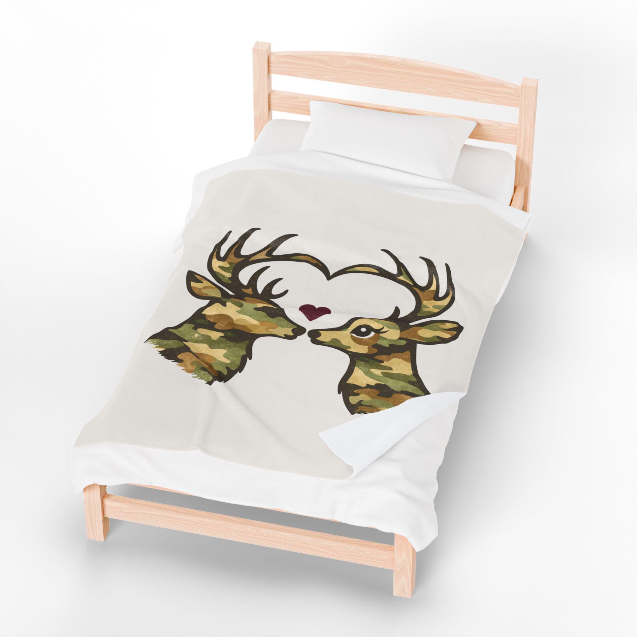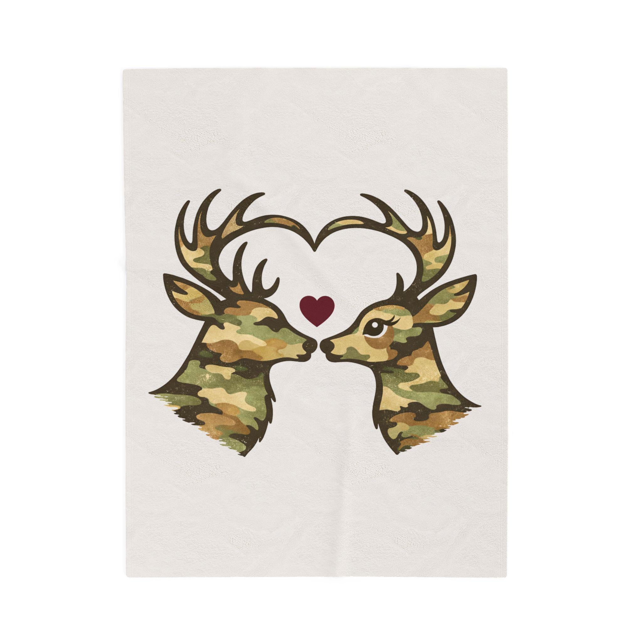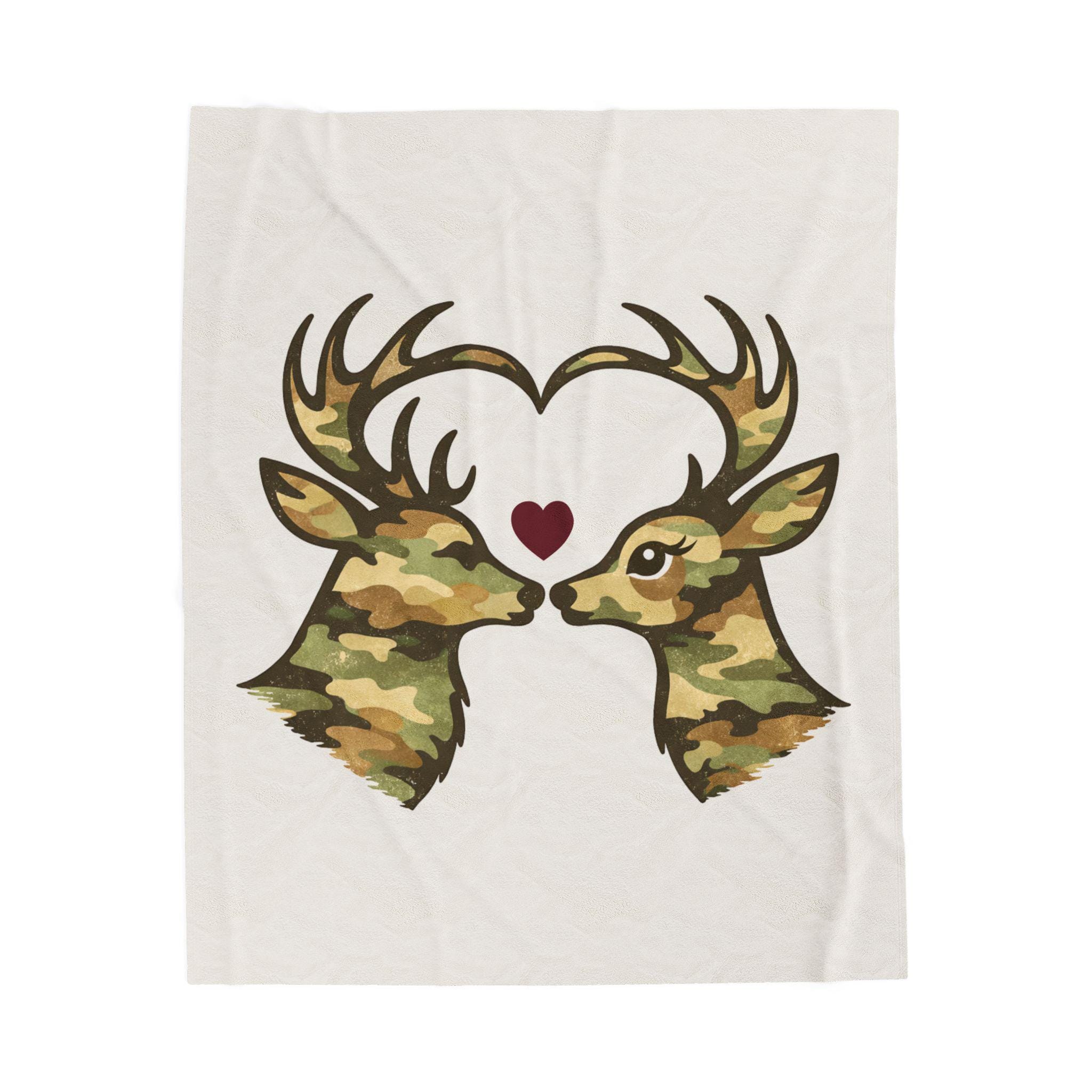 A cozy velveteen throw blanket featuring two camo deer forming a heart, finished with a subtle burgundy accent. Soft, rustic homeware perfect for cabins, couches, beds, and meaningful gifting.