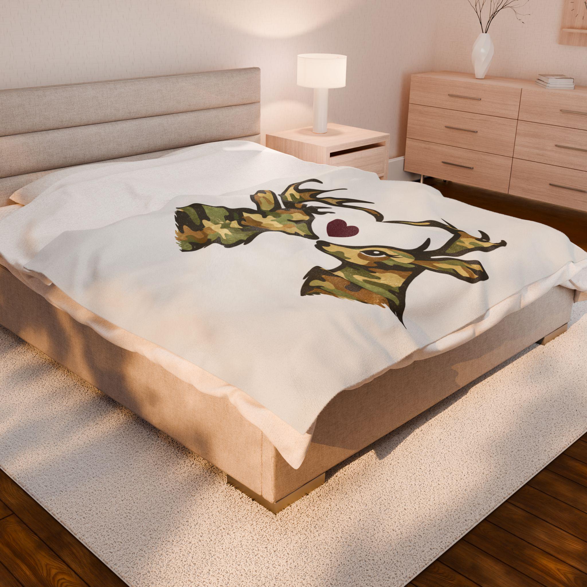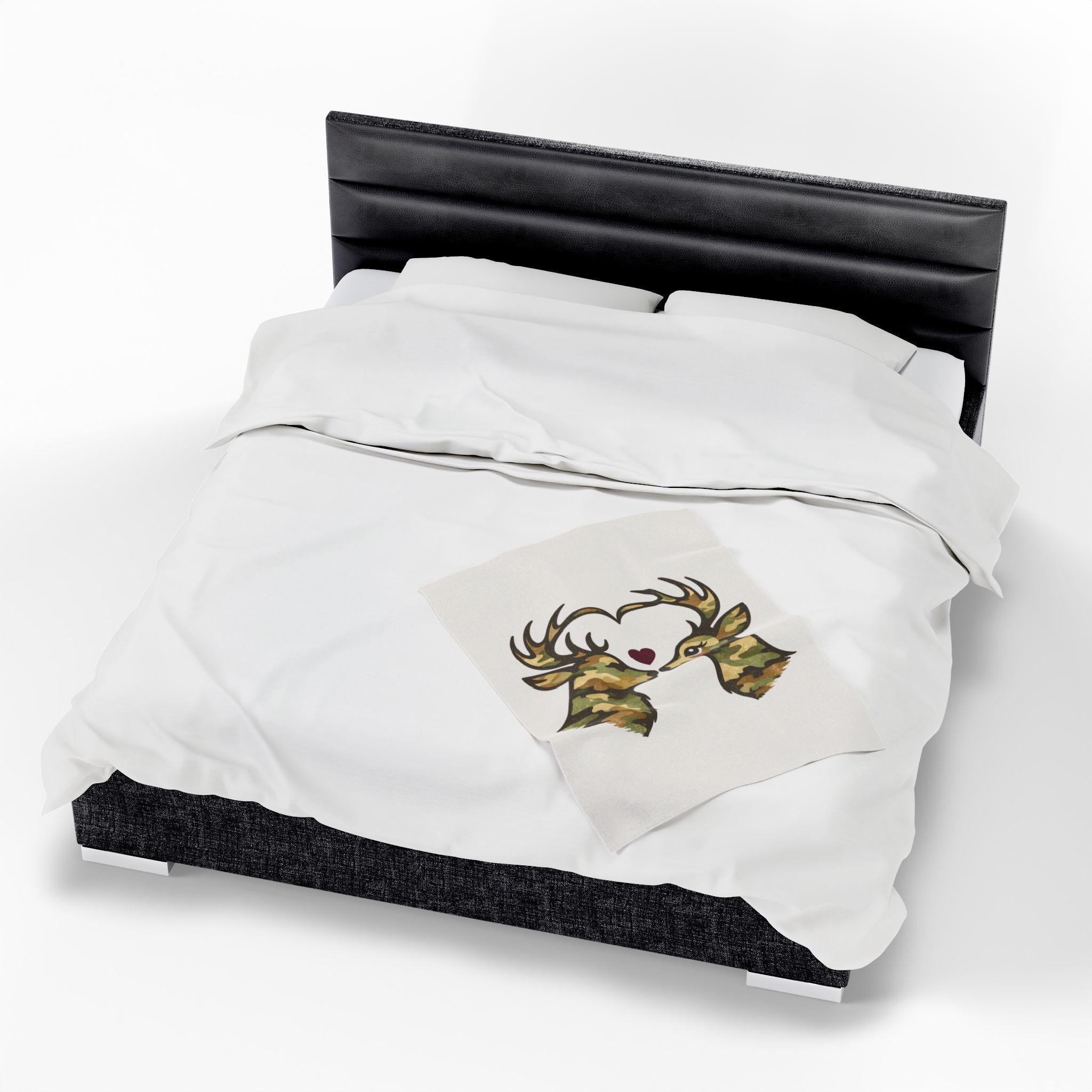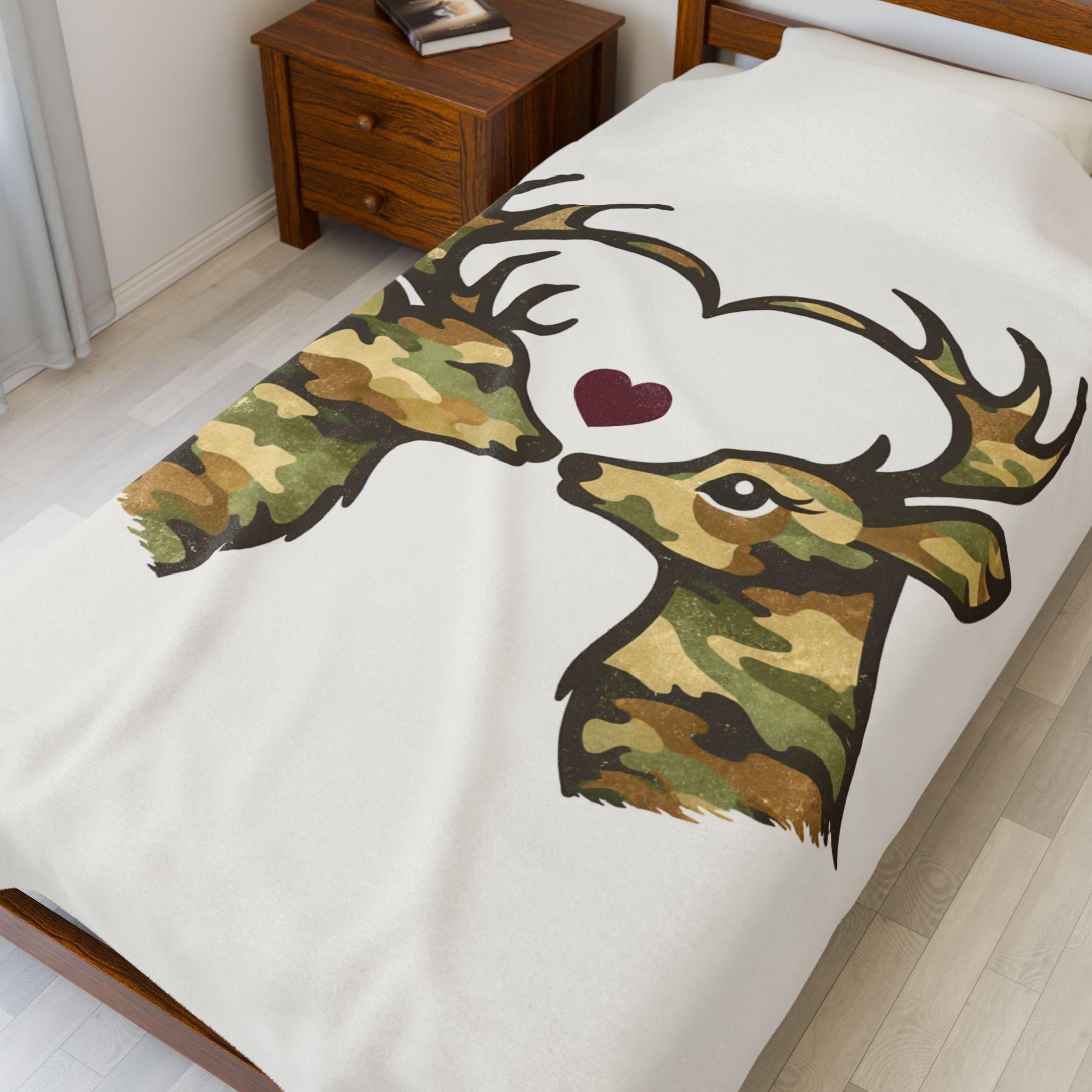 Add warmth, comfort, and quiet woodland romance to your home with this camo deer velveteen plush blanket, designed as cozy rustic homeware for outdoorsy living. Two camo-patterned deer face one another, their antlers forming a heart, with a small burgundy heart nestled between their noses — a subtle, heartfelt detail that feels warm and intentional without being loud.
