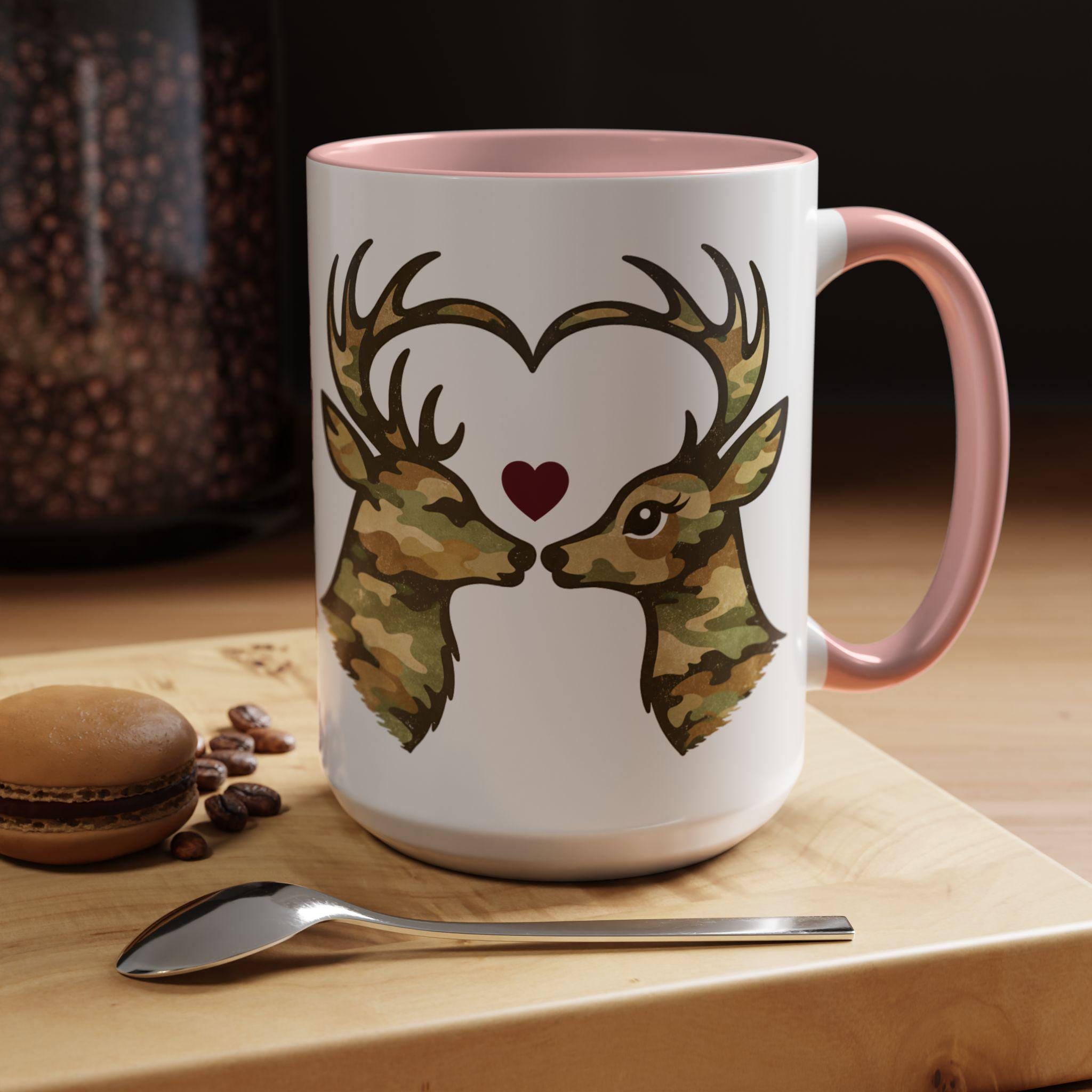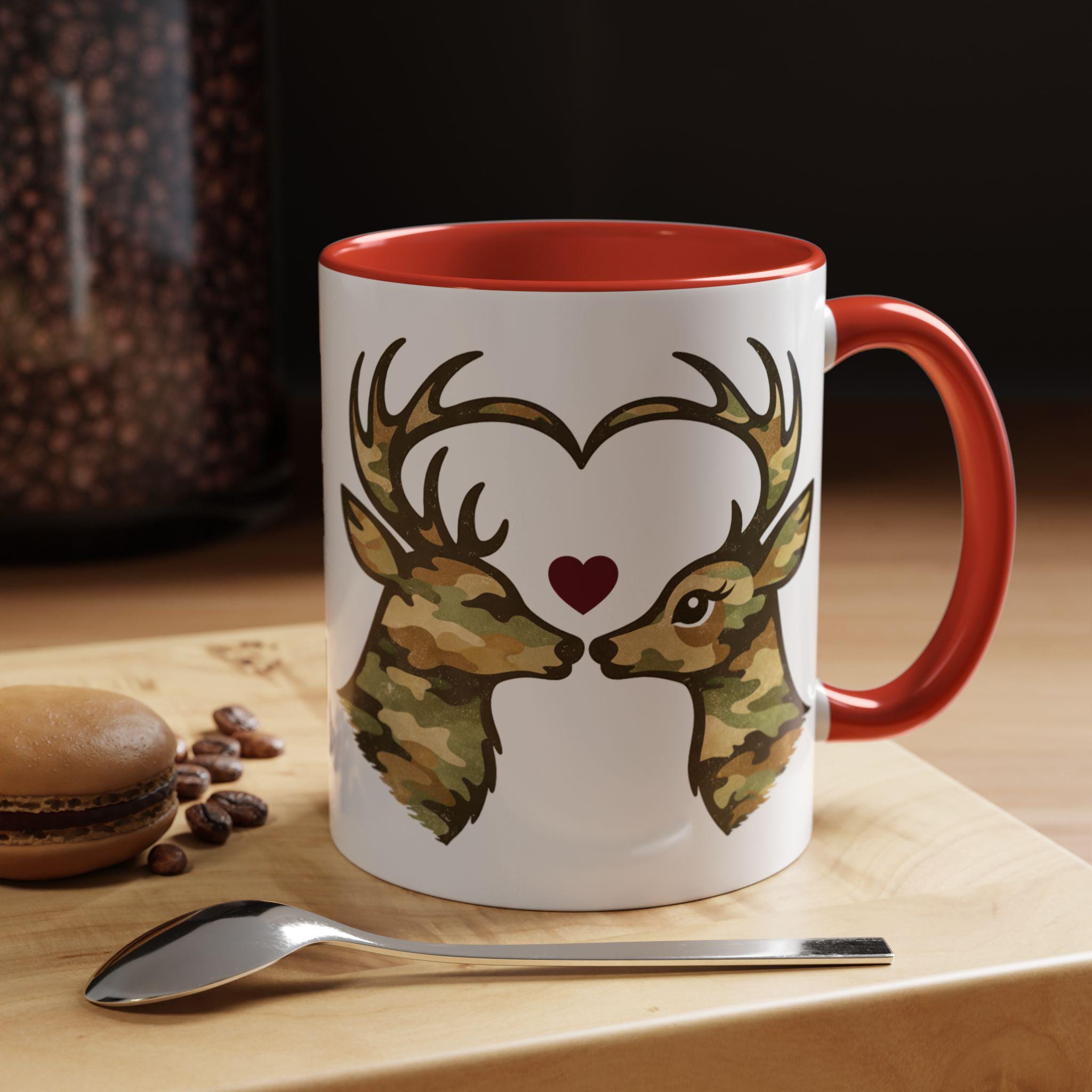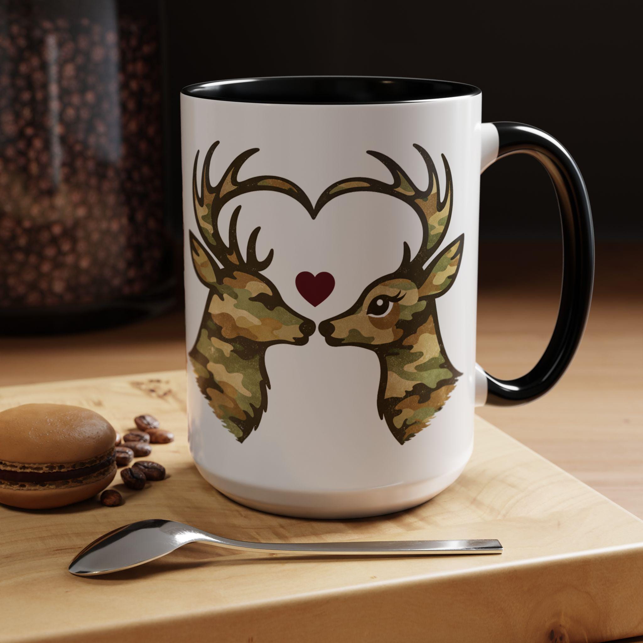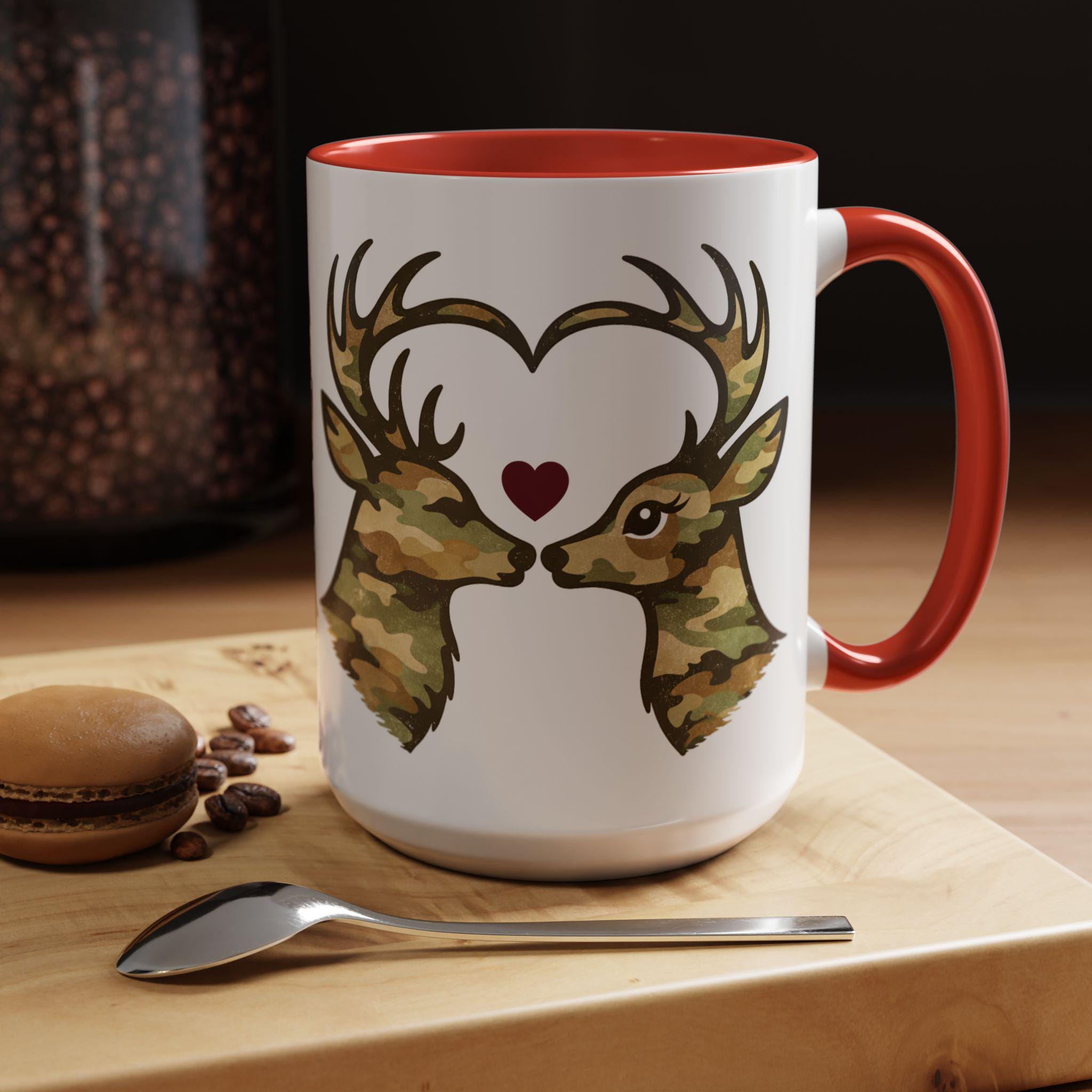 🦌 A cozy camo deer mug featuring two woodland deer forming a heart, finished with a subtle burgundy accent. A rustic, outdoorsy coffee mug perfect for Valentine’s Day or everyday cabin vibes.