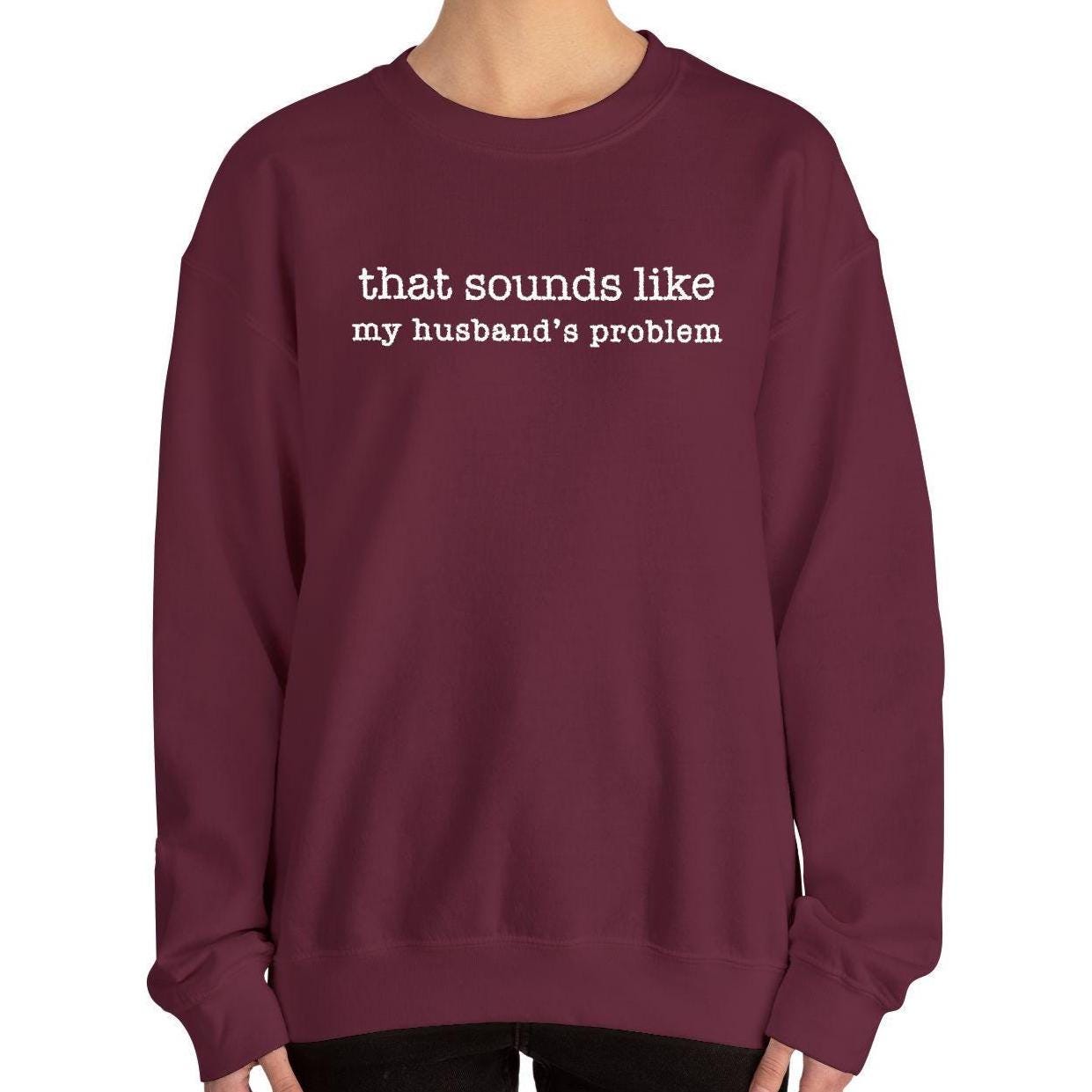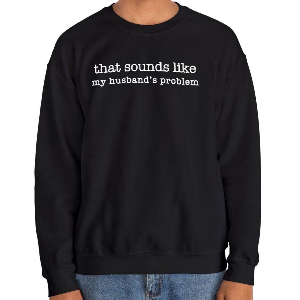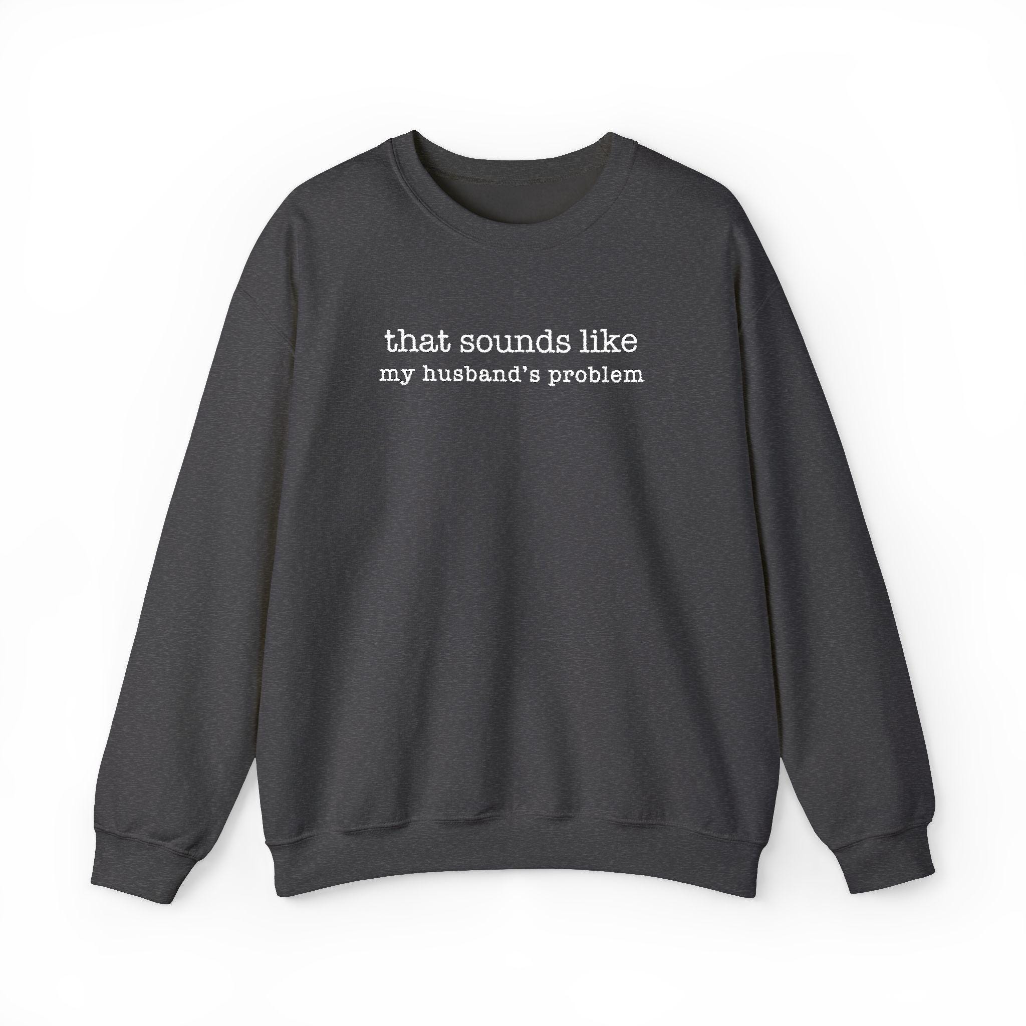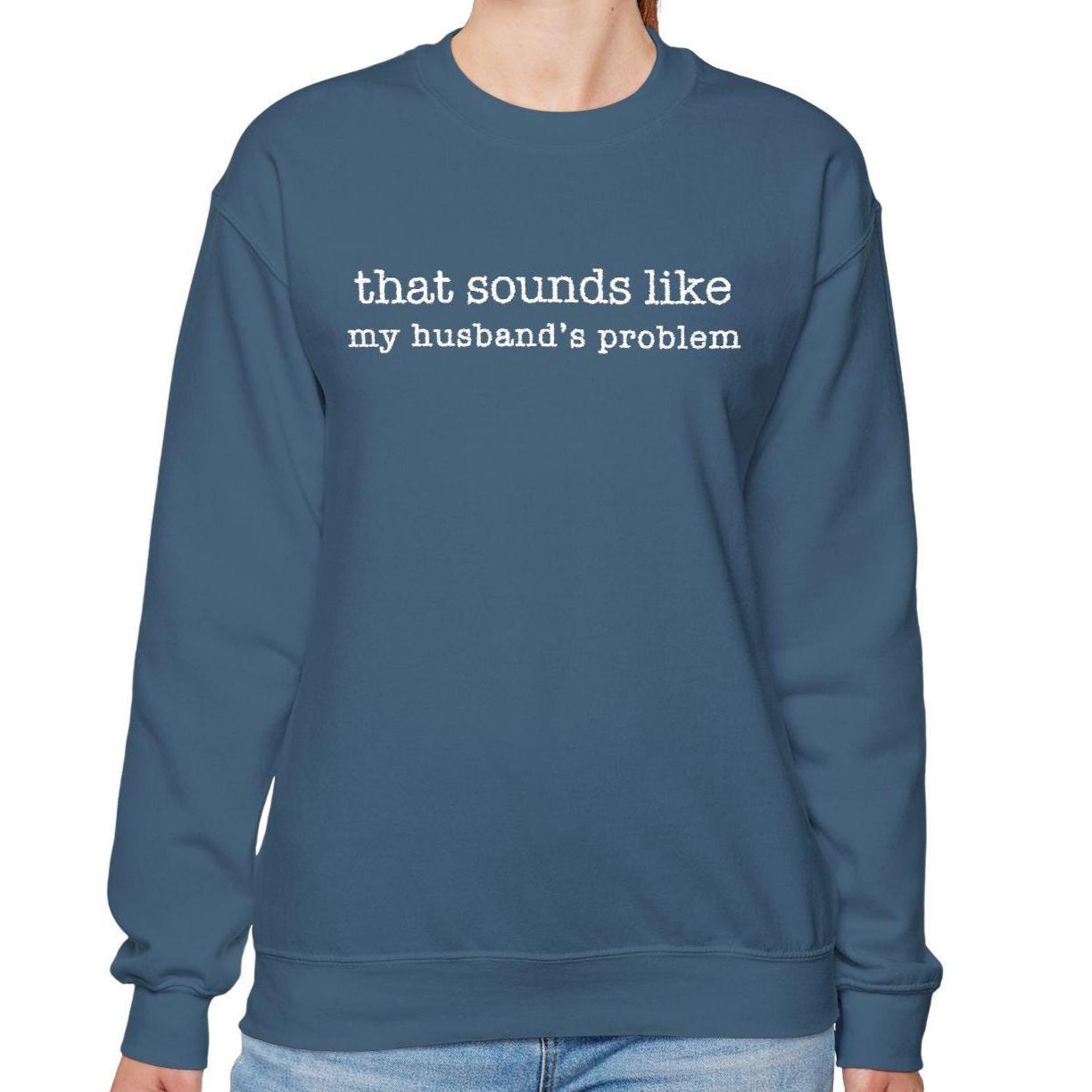 This embroidered crewneck features the quote âThat sounds like my husbandâs problemâ in bold, high-contrast stitching. Dry humor, married-life energy, and zero emotional labor.