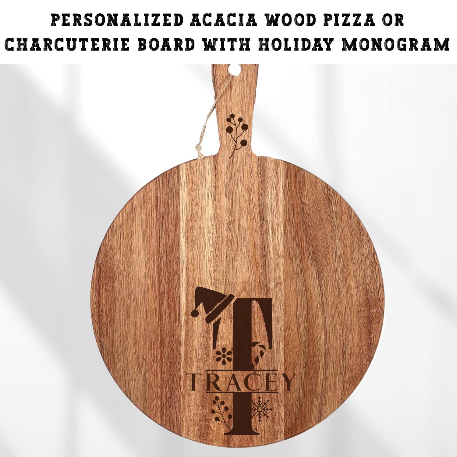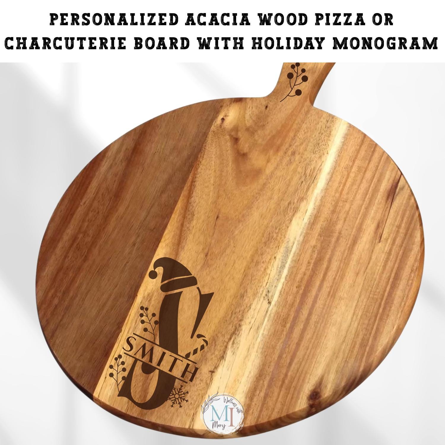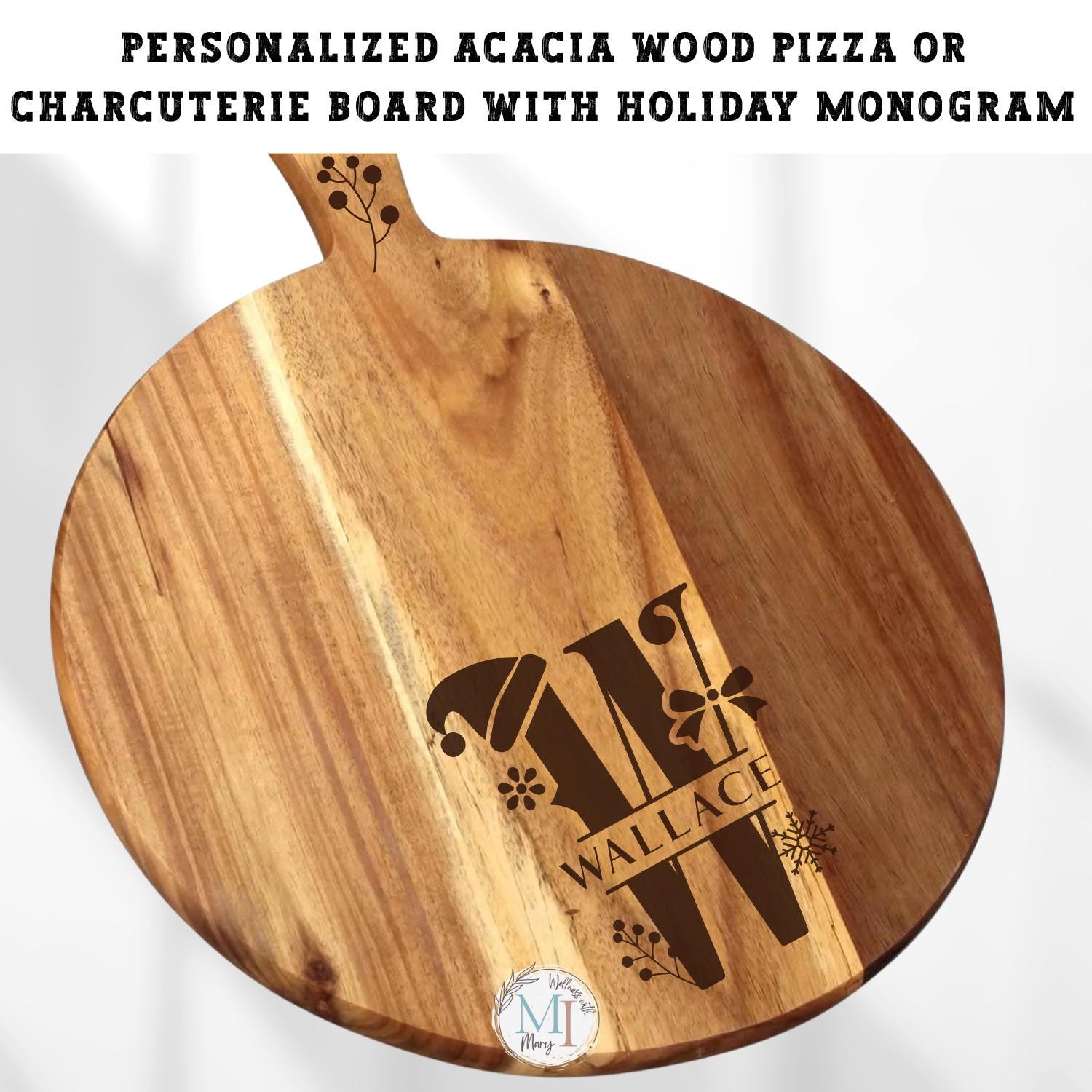 Serve and celebrate in style with this personalized acacia wood pizza or charcuterie board, custom-engraved and hand-finished for lasting beauty. Featuring a festive holiday monogram design with engraved Christmas berry detailing on the handle, this board makes a thoughtful gift for families, hosts, newlyweds, and anyone who loves gathering around good food.