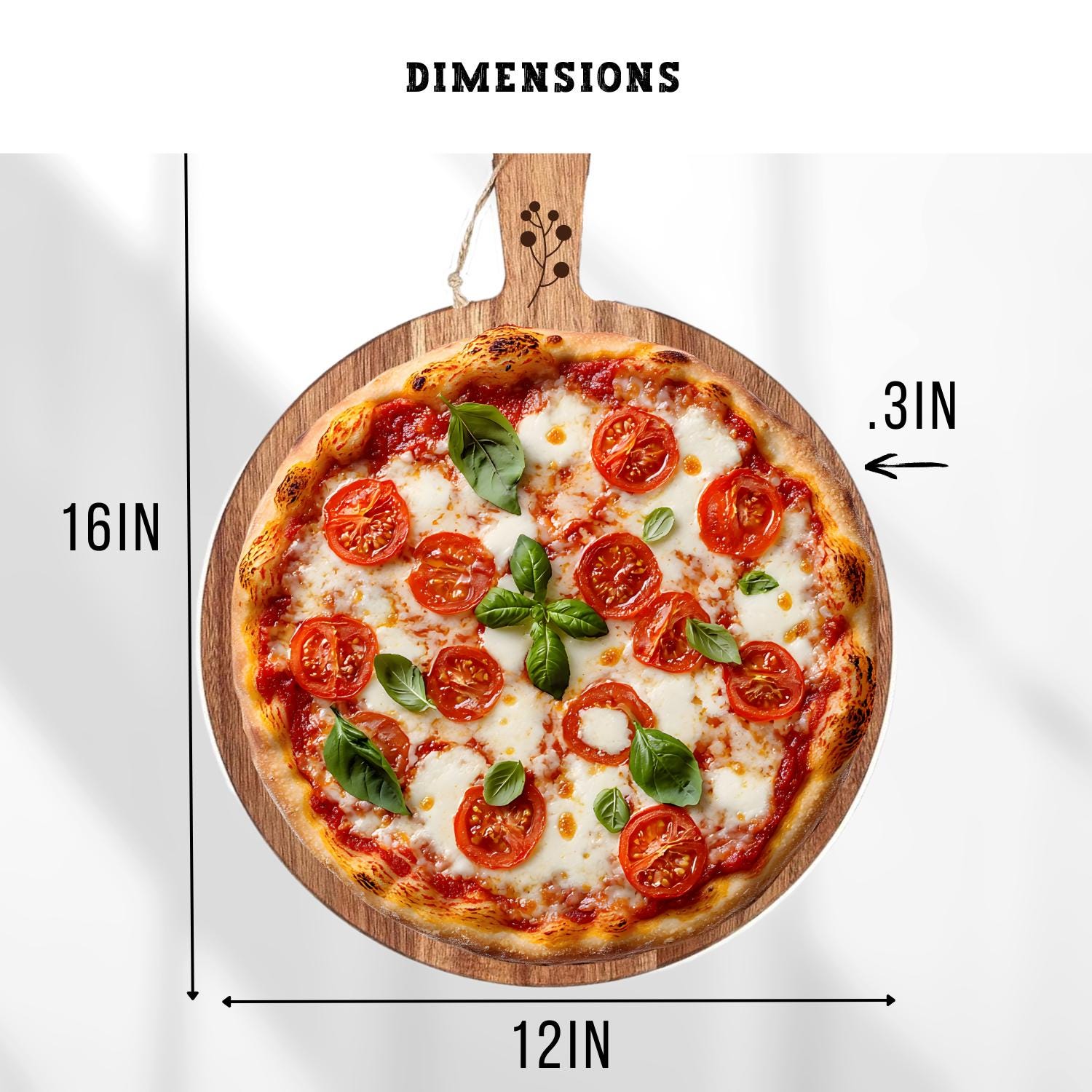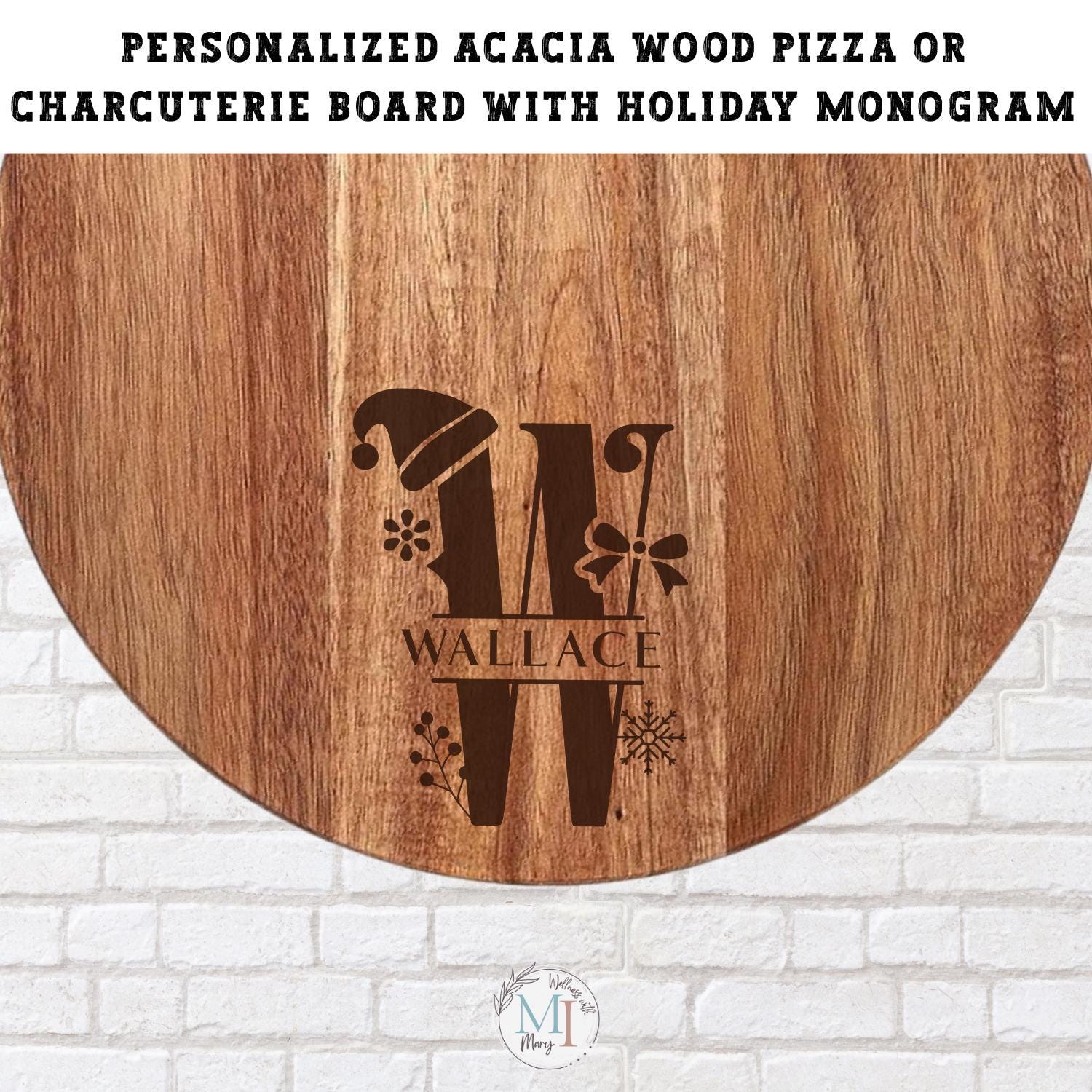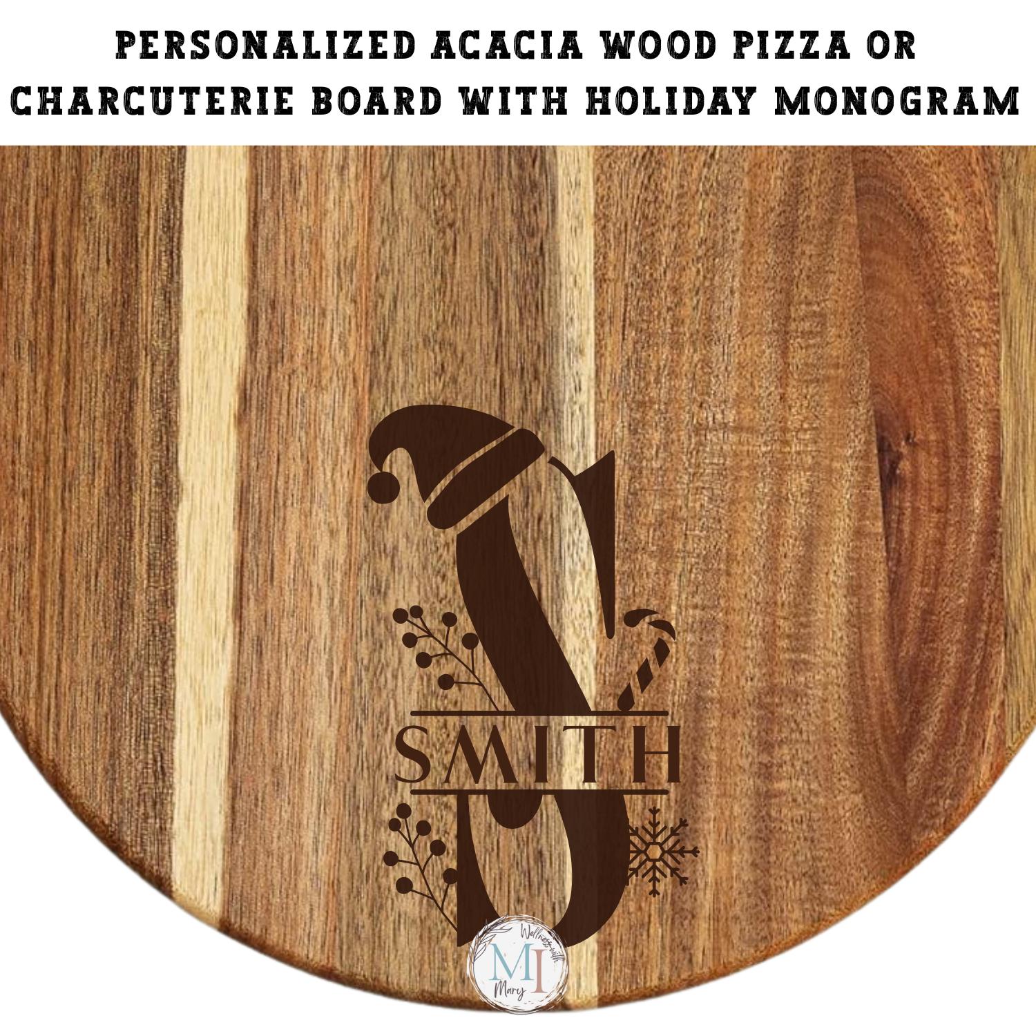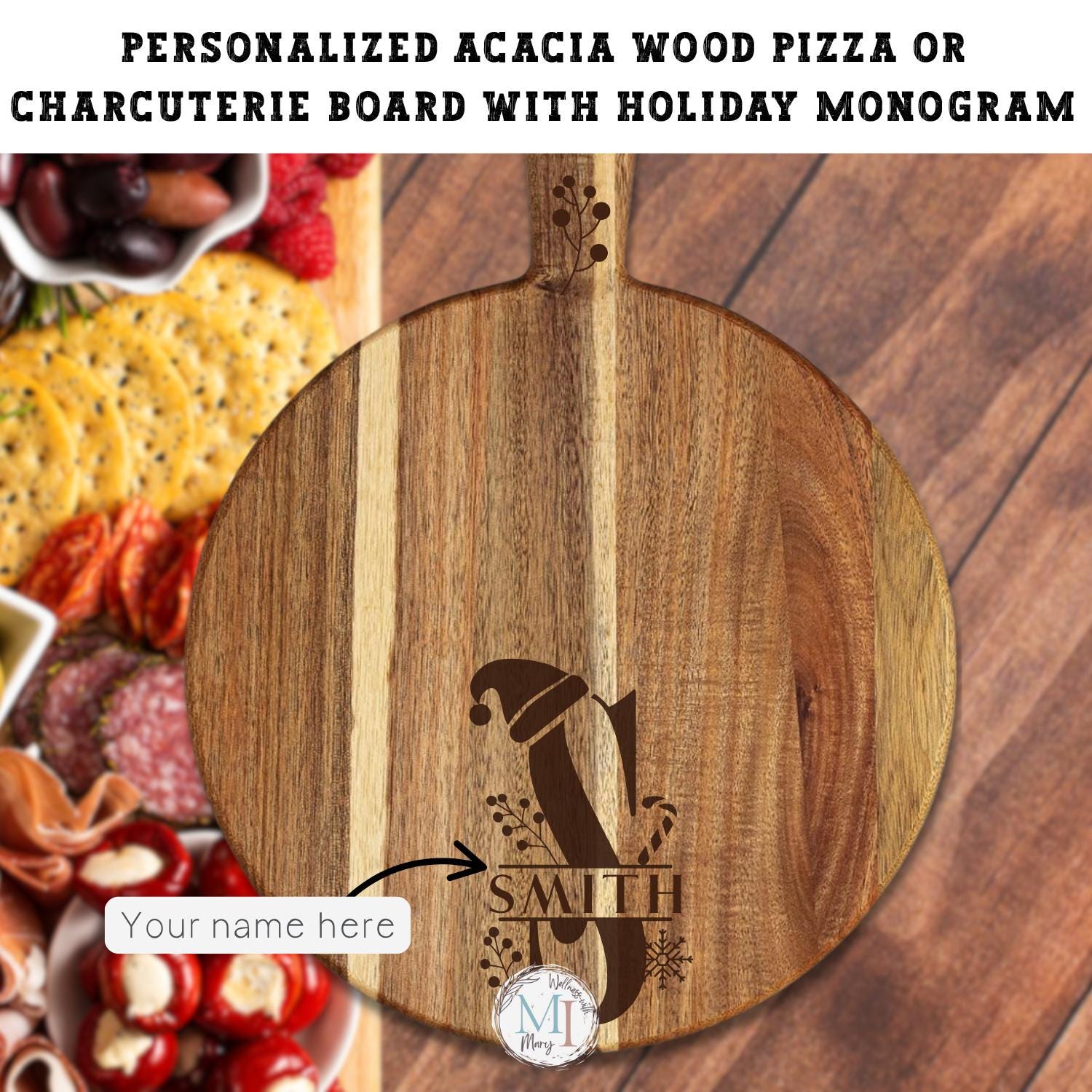 Serve and celebrate in style with this personalized acacia wood pizza or charcuterie board, custom-engraved and hand-finished for lasting beauty. Featuring a festive holiday monogram design with engraved Christmas berry detailing on the handle, this board makes a thoughtful gift for families, hosts, newlyweds, and anyone who loves gathering around good food.