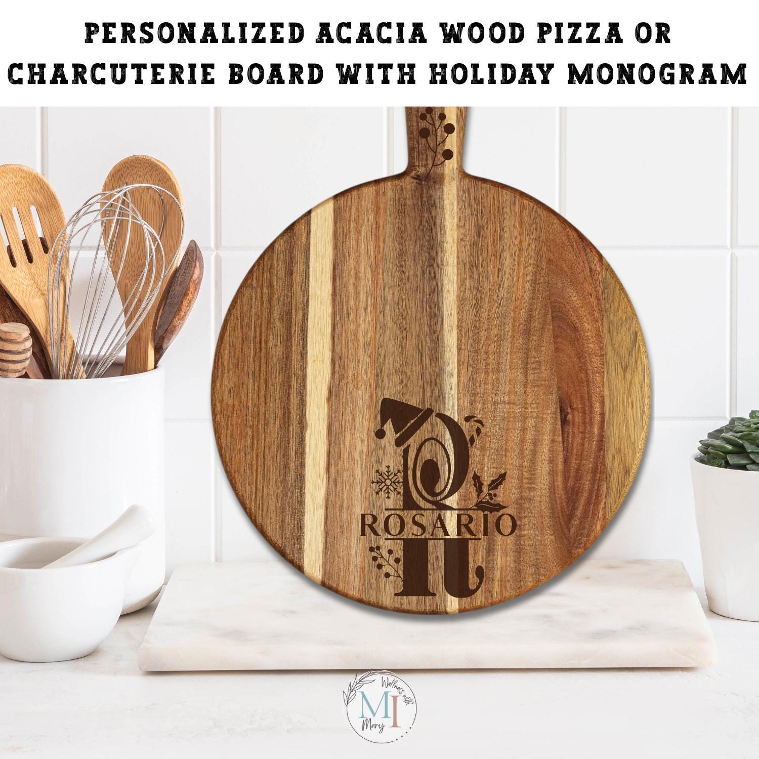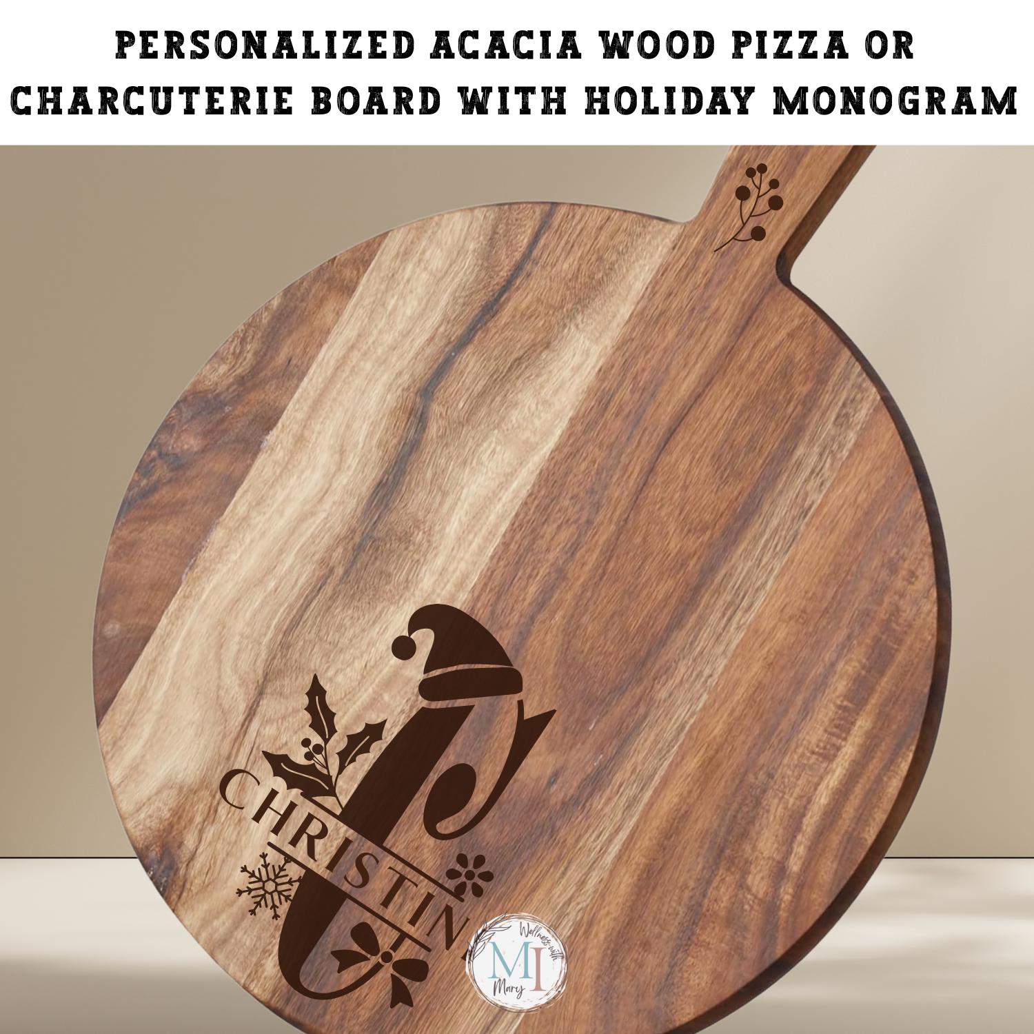 Personalized acacia wood pizza or charcuterie board with engraved holiday monogram and Christmas berry handle detail. A natural, food-safe, handmade keepsake perfect for holiday gifting.