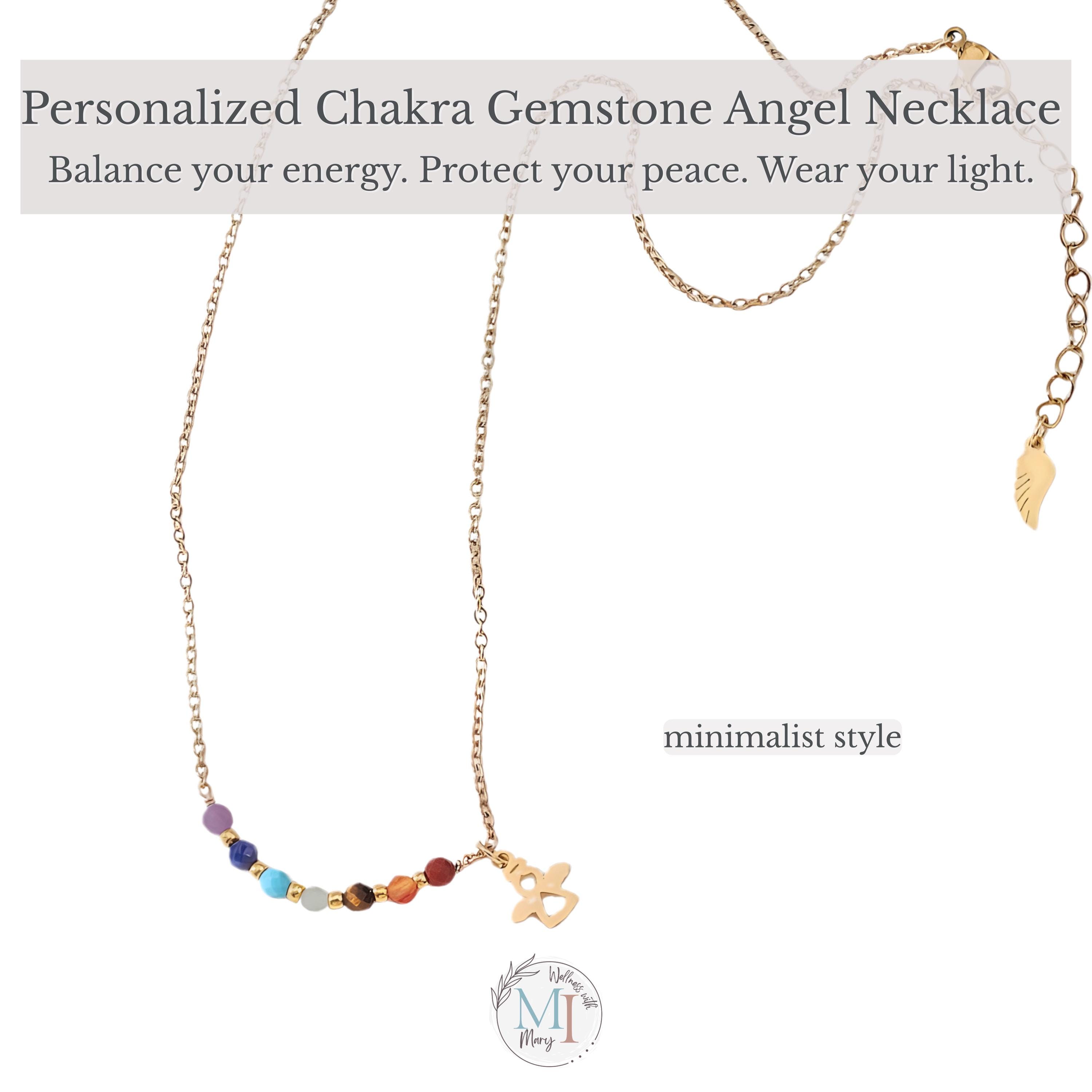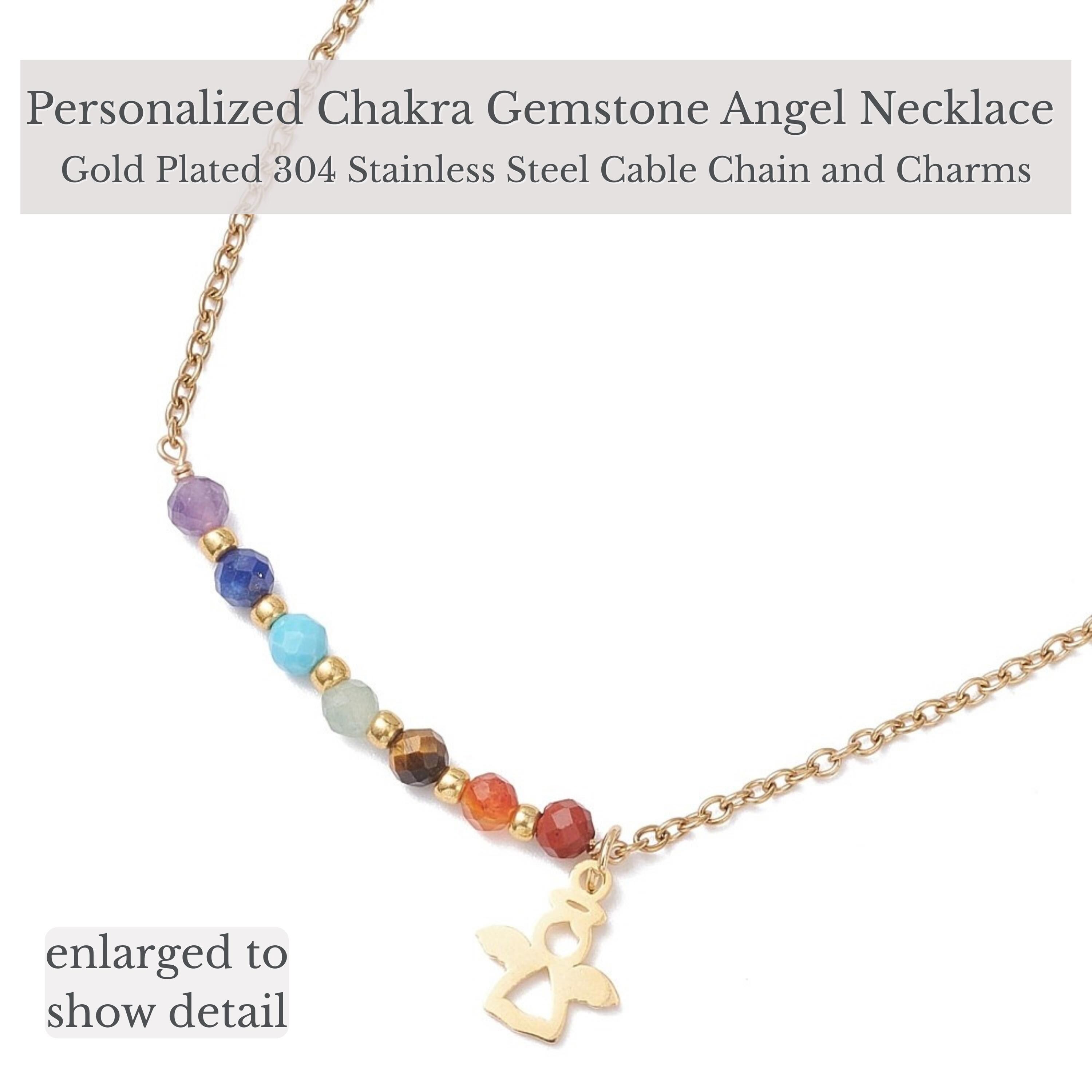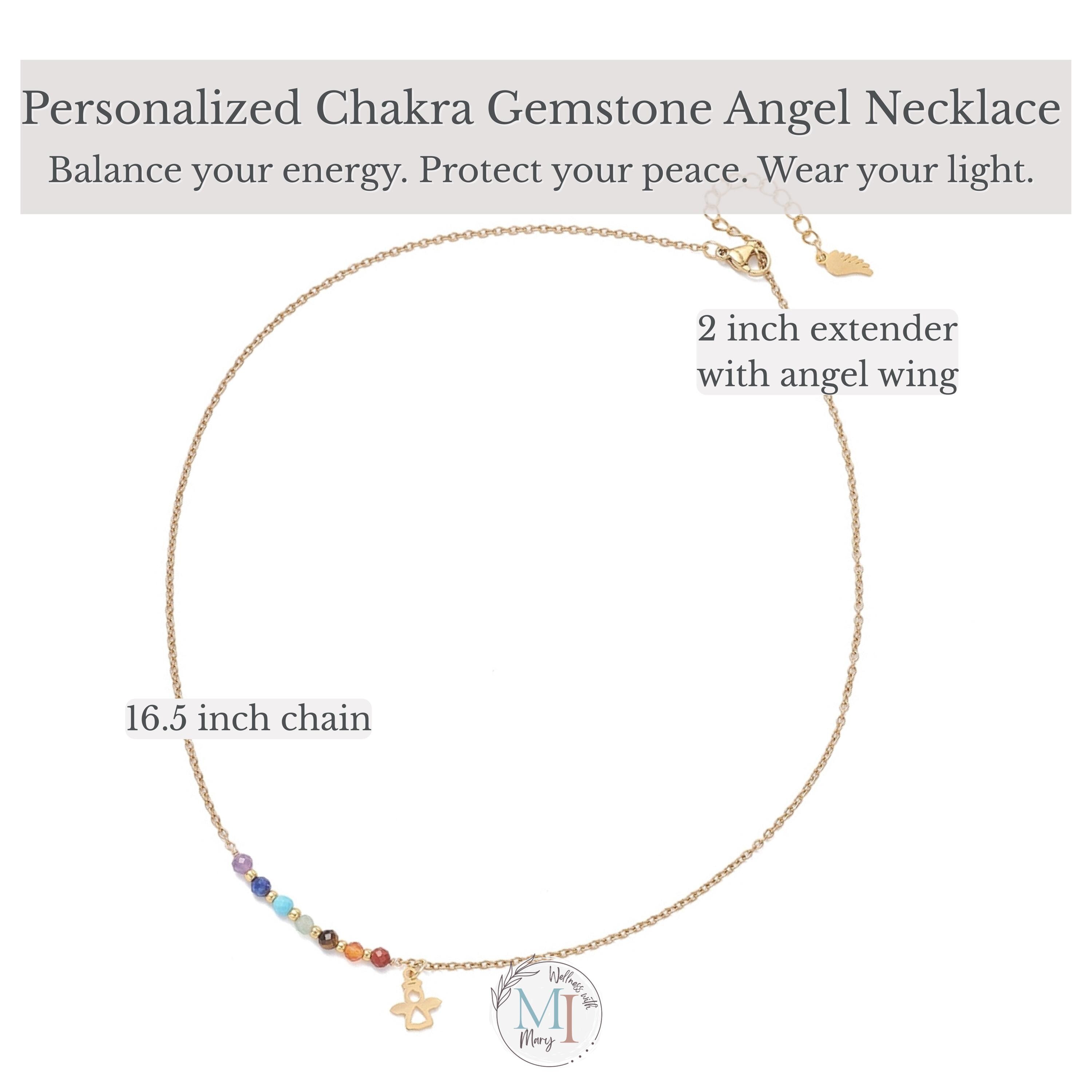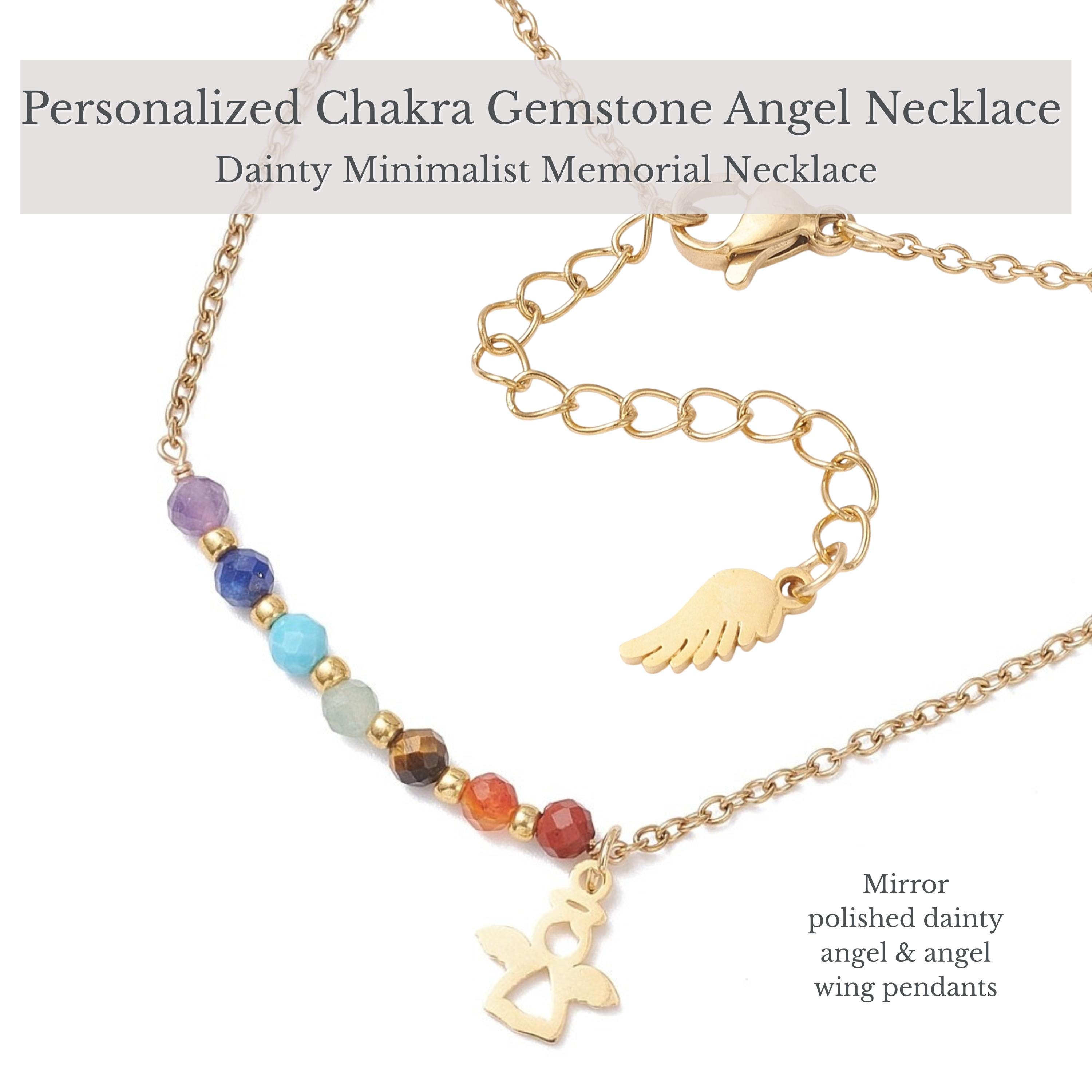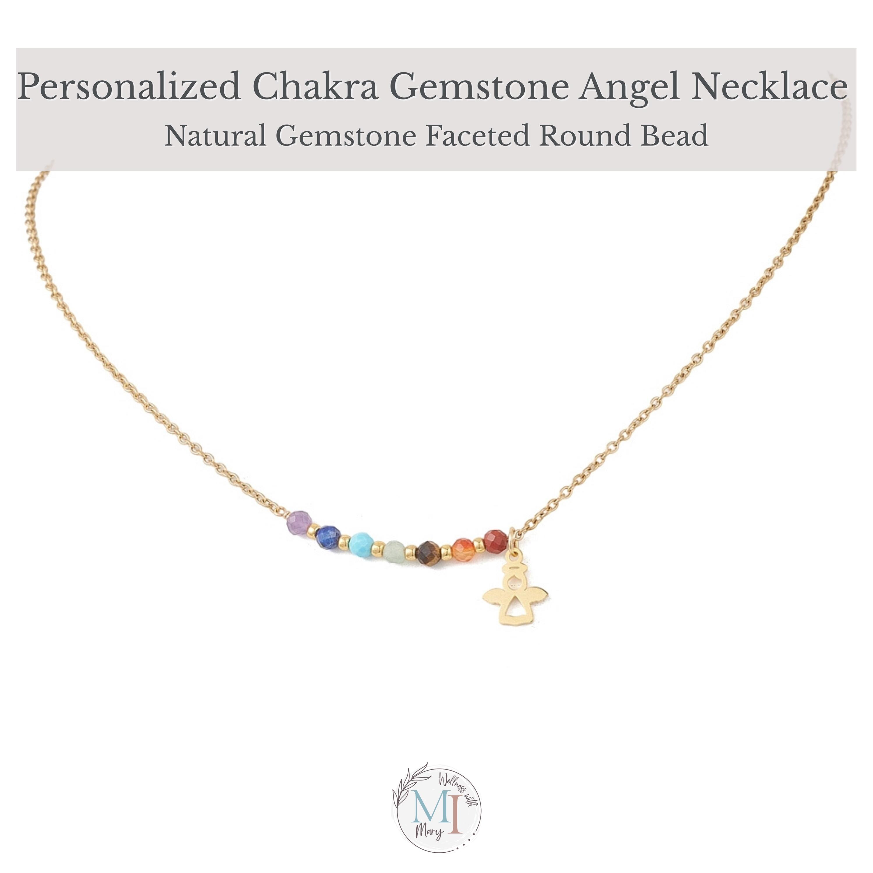 This personalized, delicate chakra gemstone necklace features a row of natural faceted gemstones paired with a golden angel and angel wing charms, a beautiful reminder of protection, guidance, and inner alignment.
