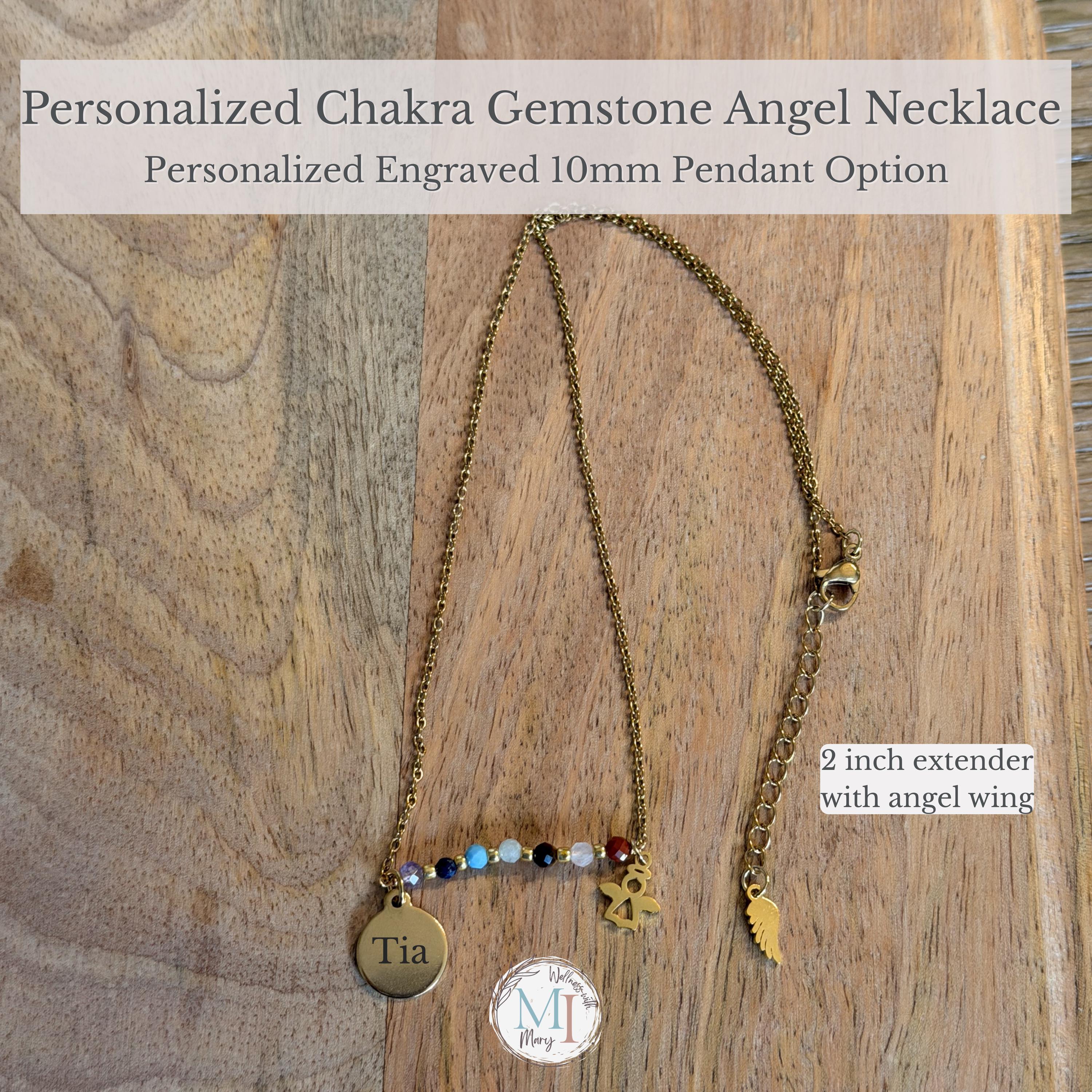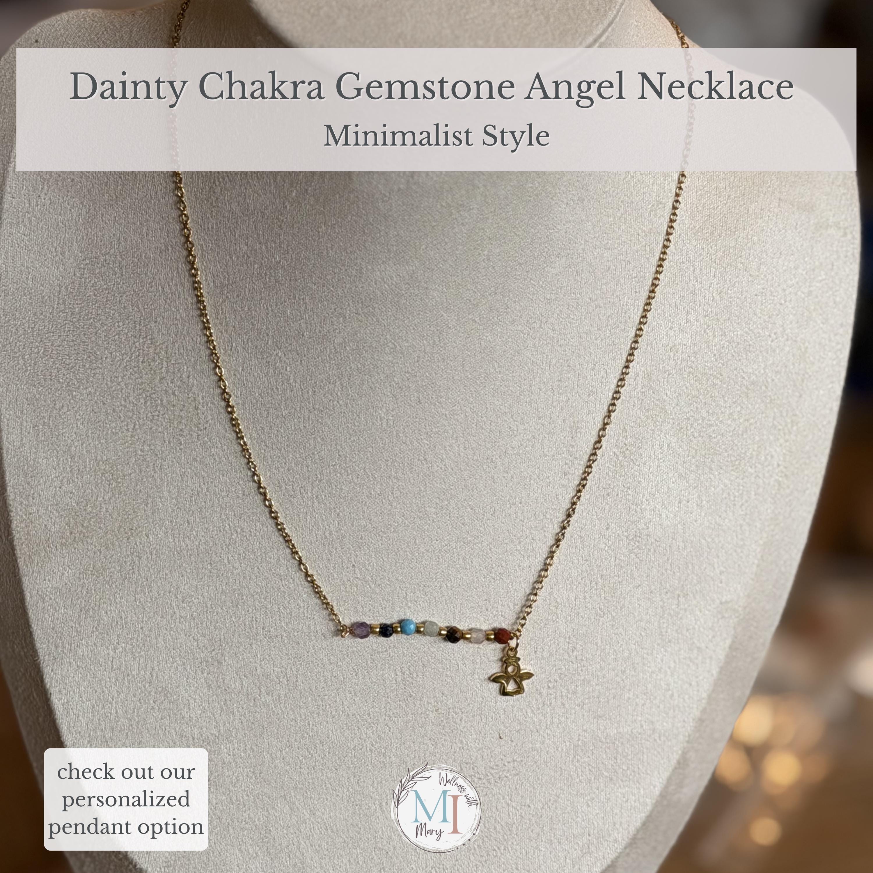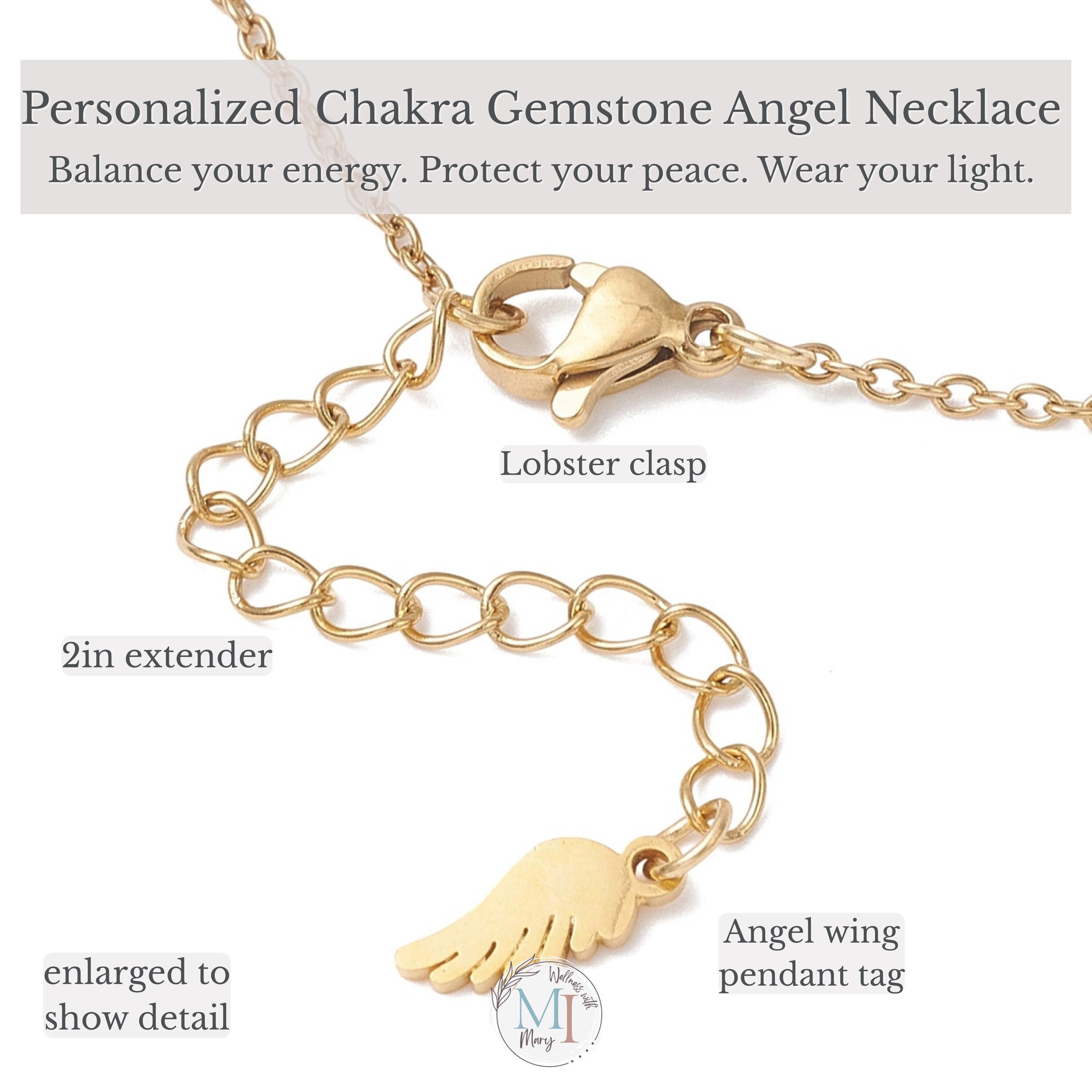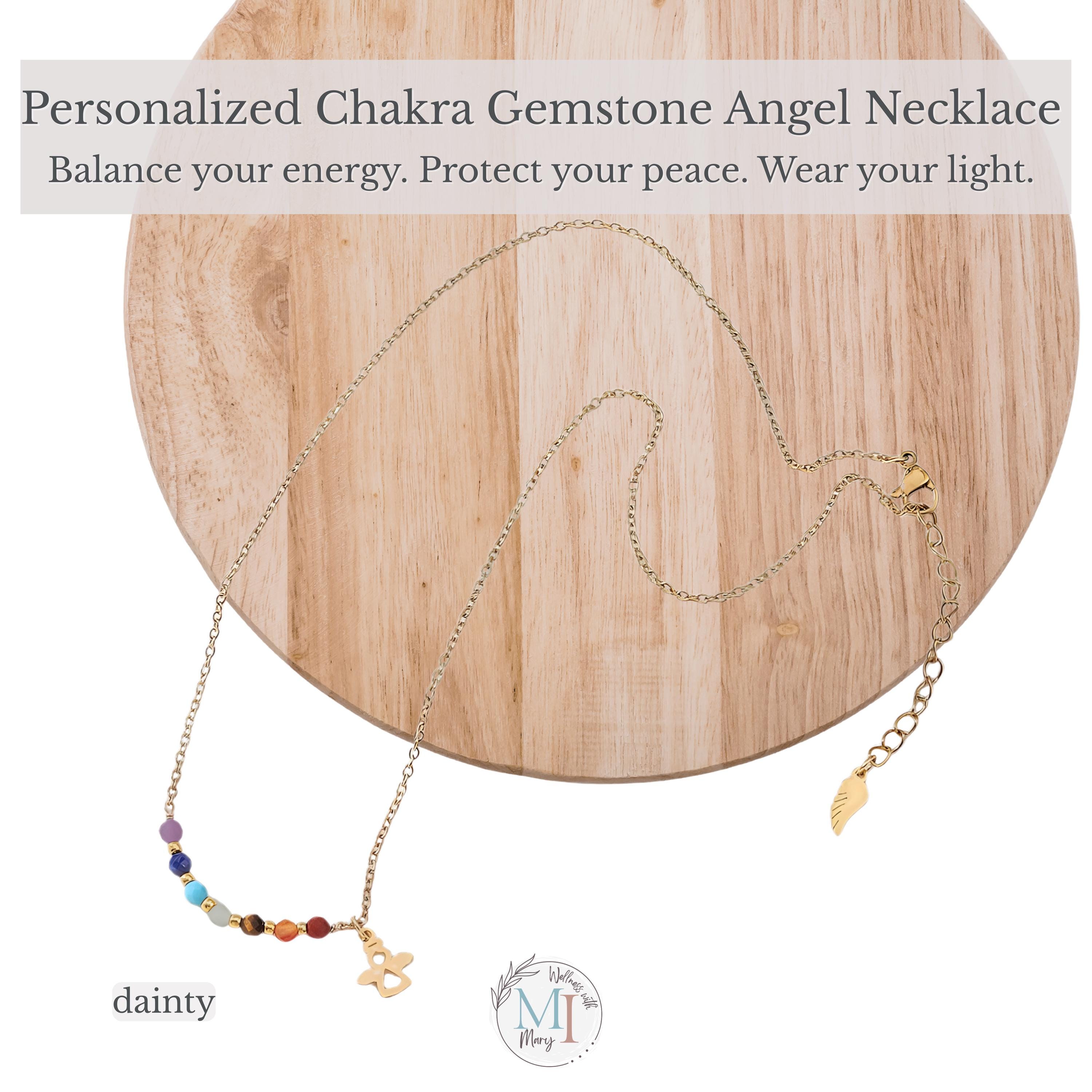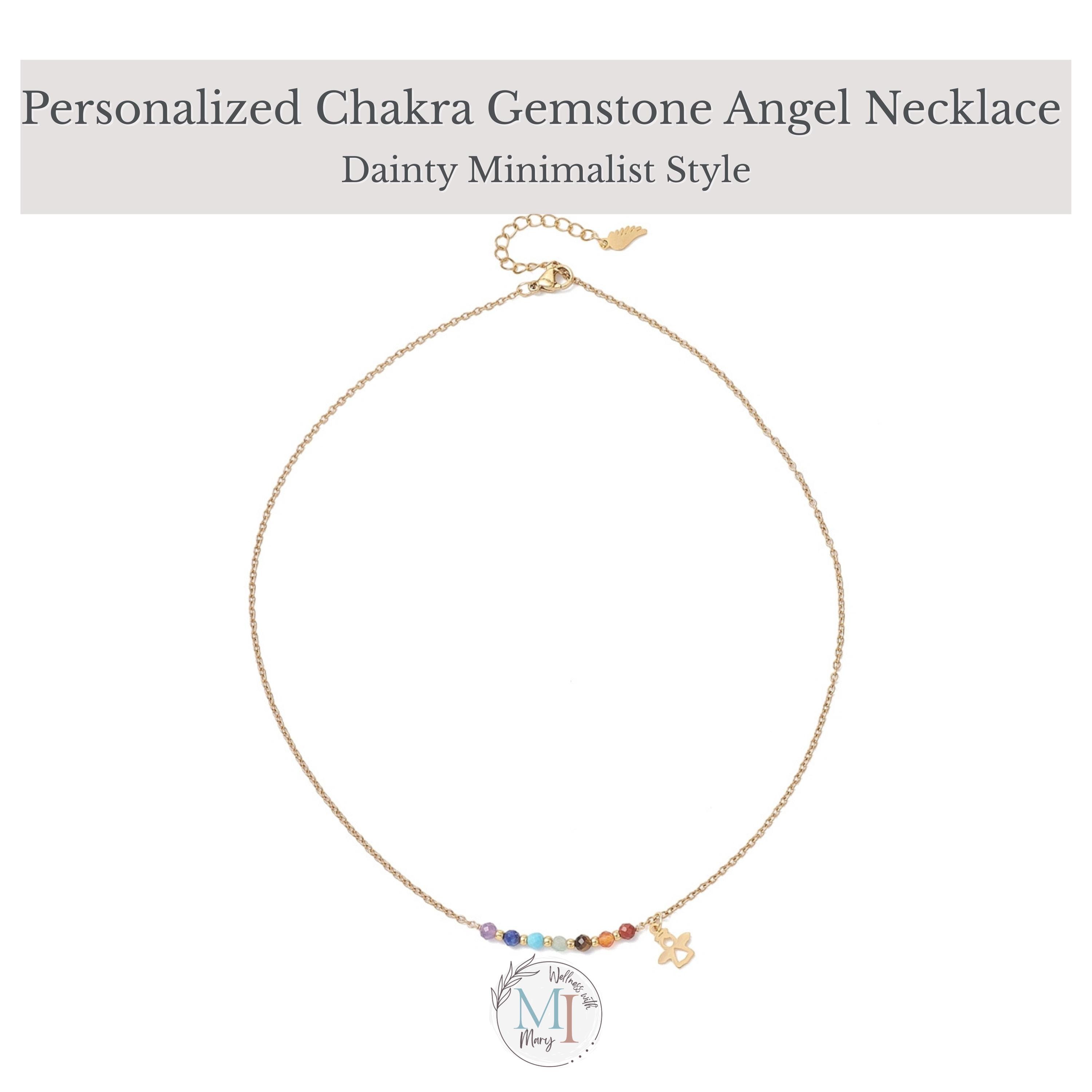 This personalized, delicate chakra gemstone necklace features a row of natural faceted gemstones paired with a golden angel and angel wing charms, a beautiful reminder of protection, guidance, and inner alignment.