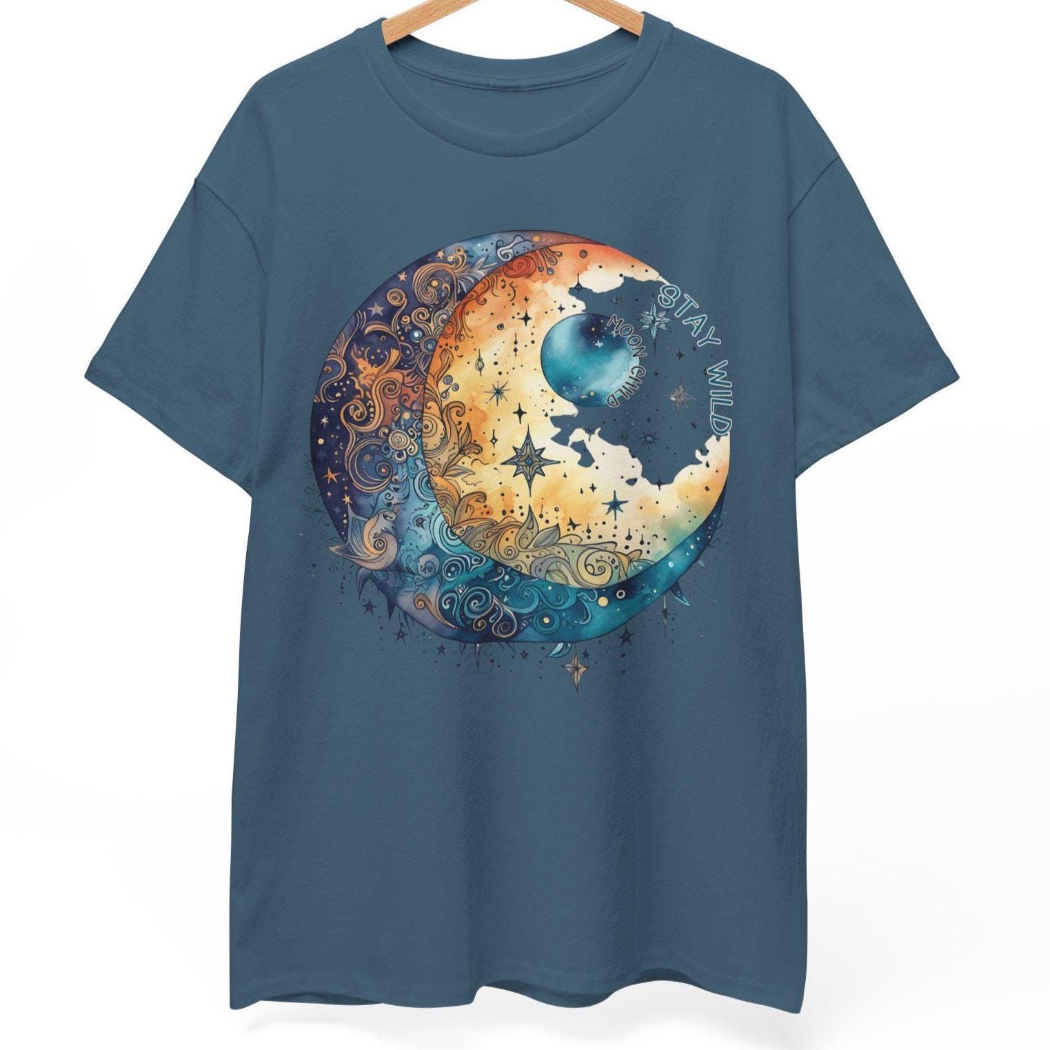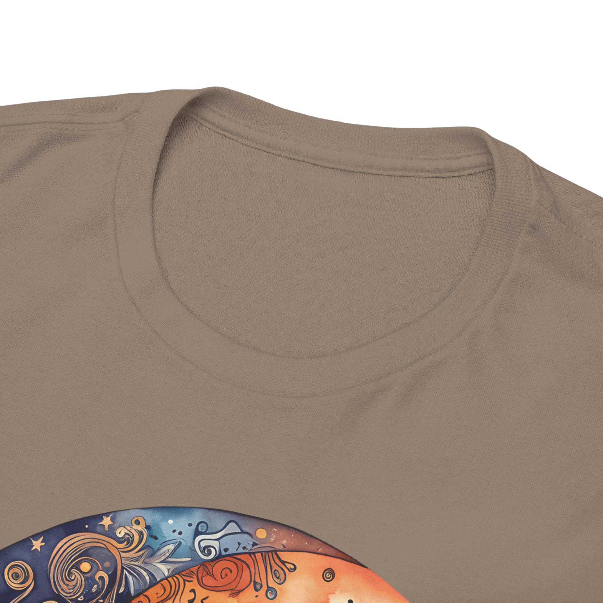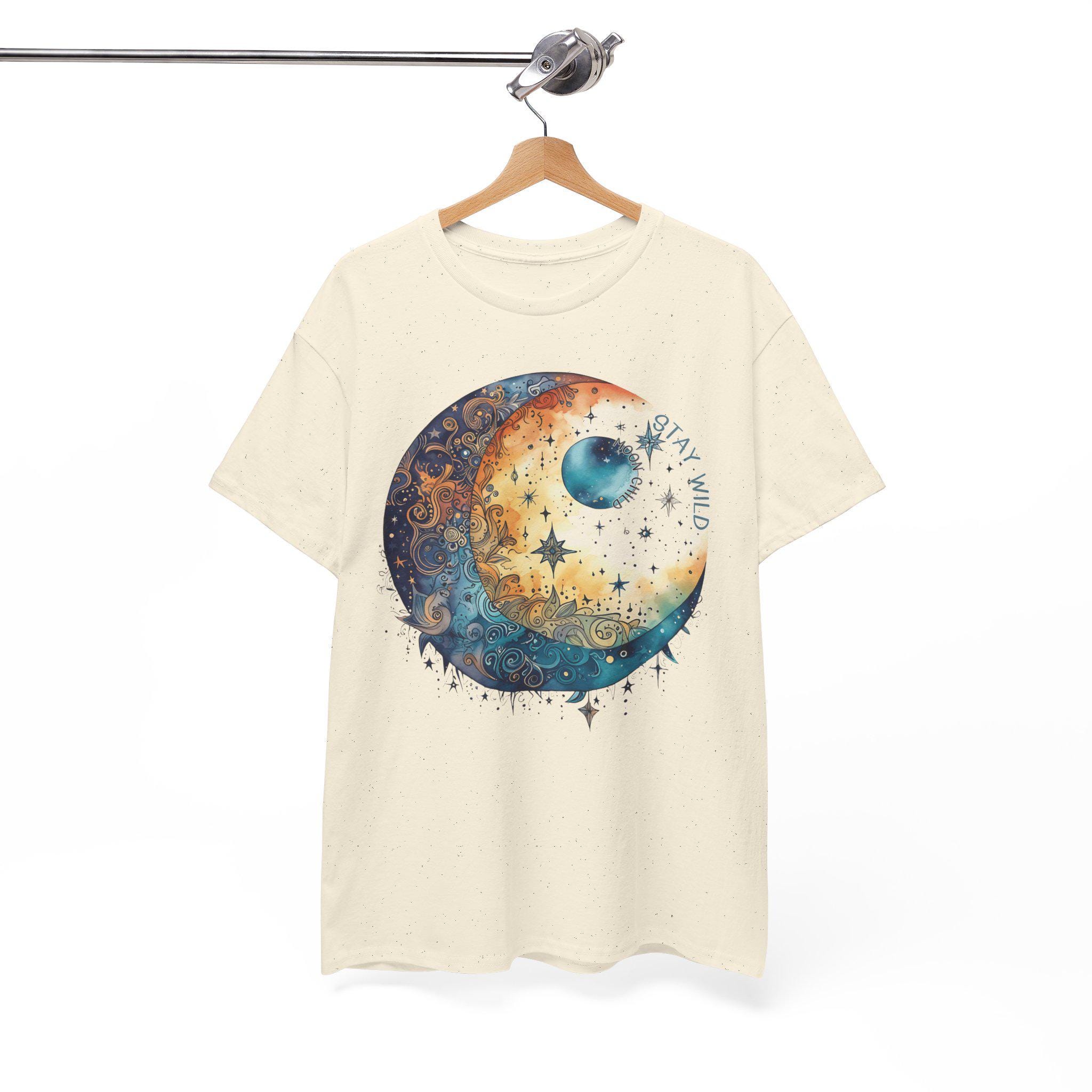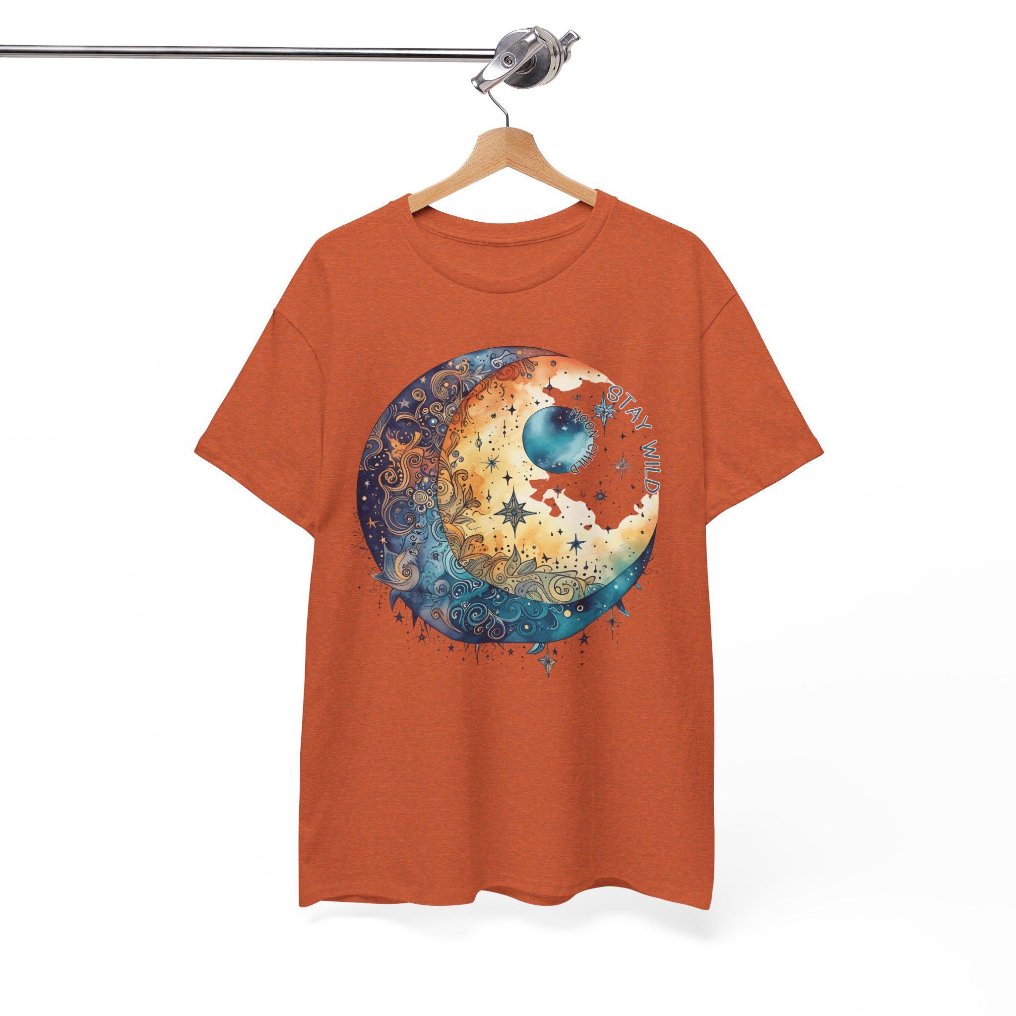 This celestial graphic tee features a hand-painted yin yang-inspired sun and moon design surrounded by soft watercolor stars and swirling galaxy textures. The rich, rust-toned cotton makes the golden highlights glow while the deep blues and cosmic details add depth and contrast.