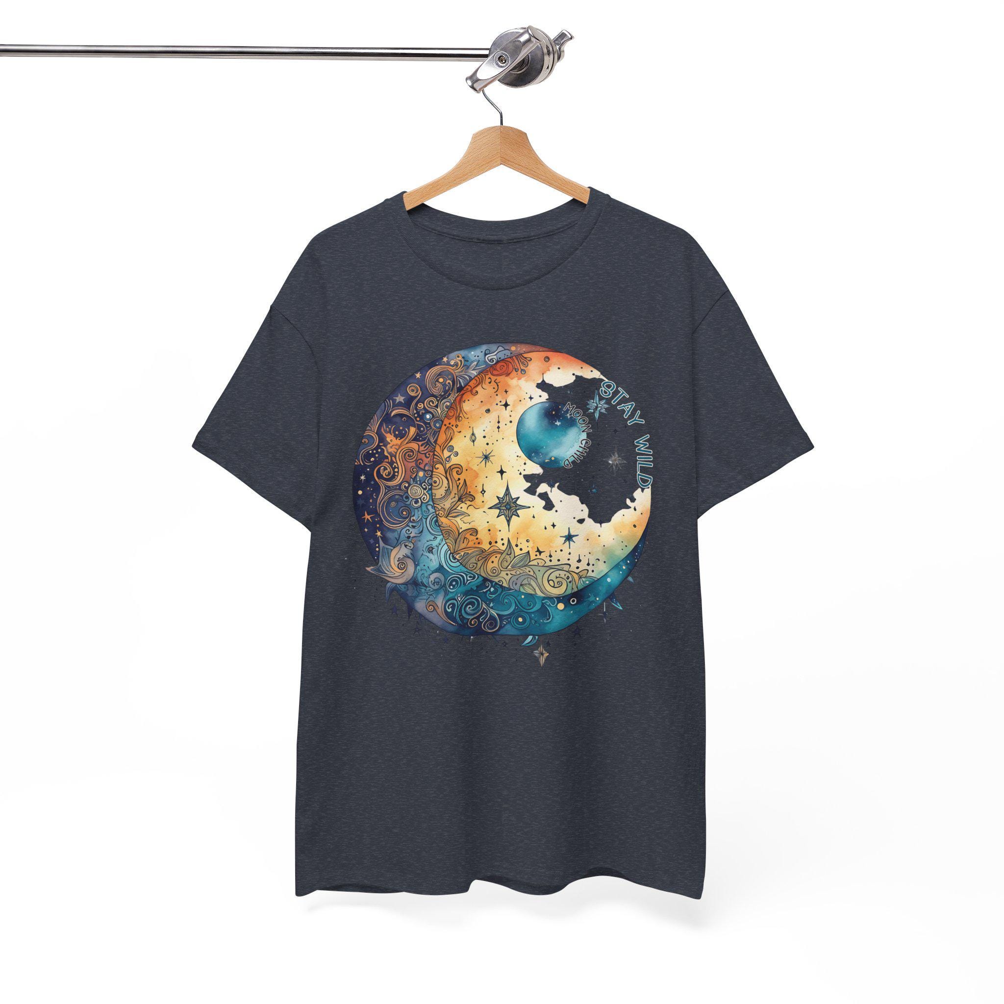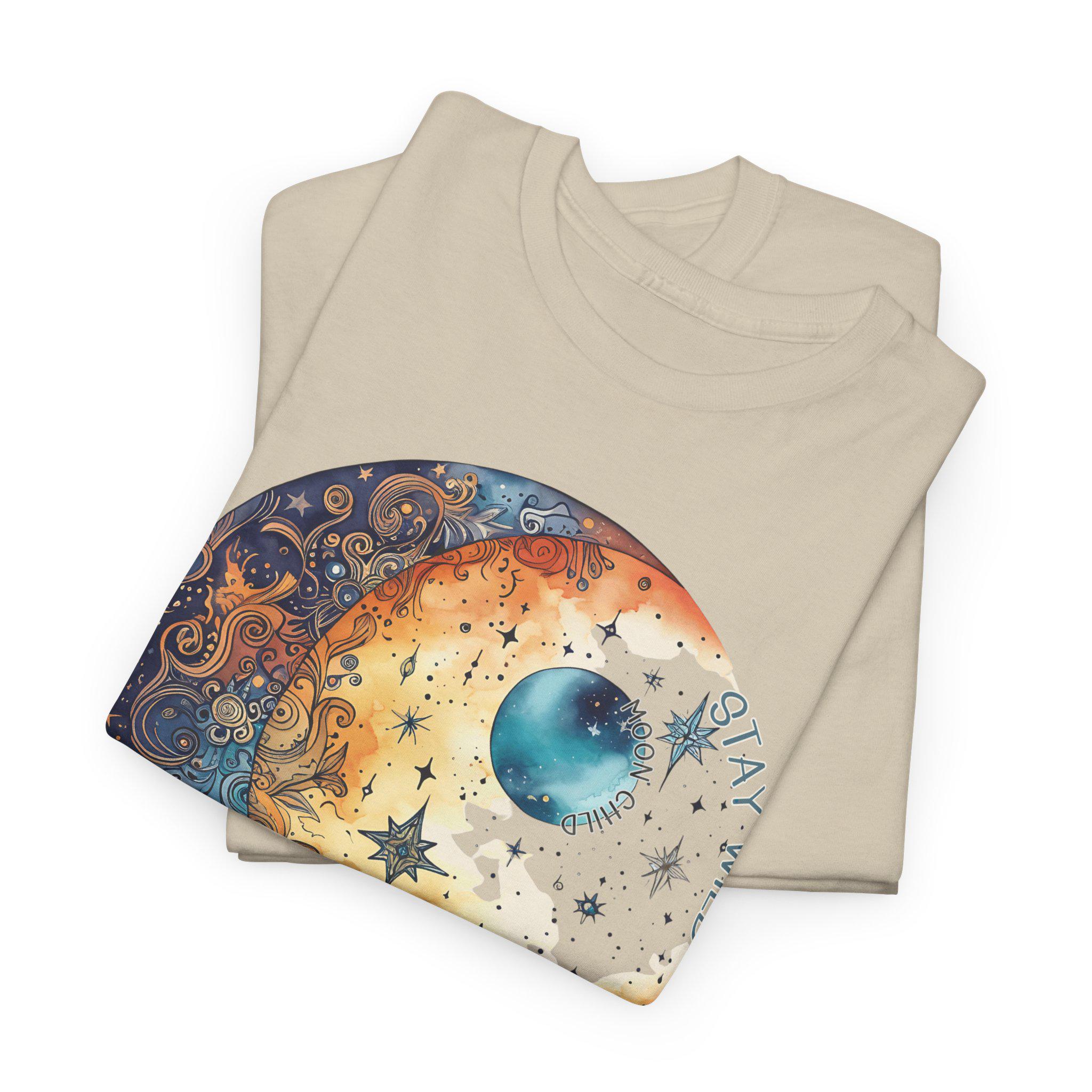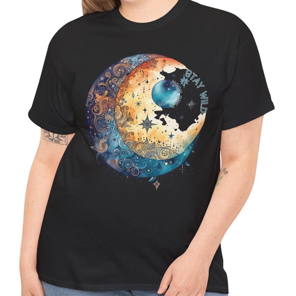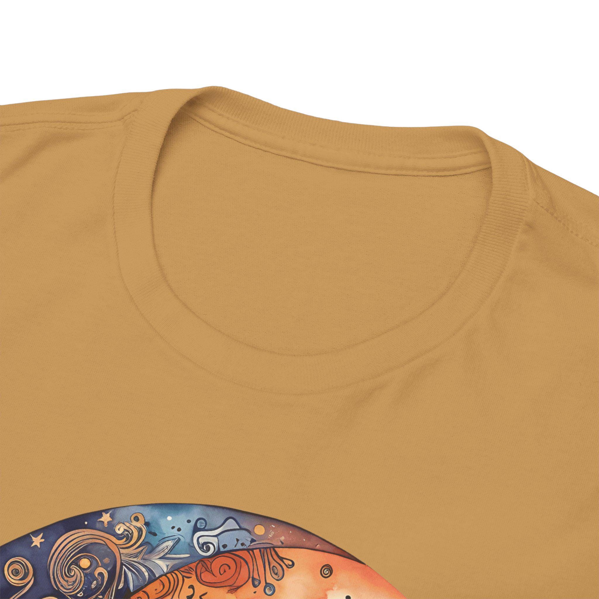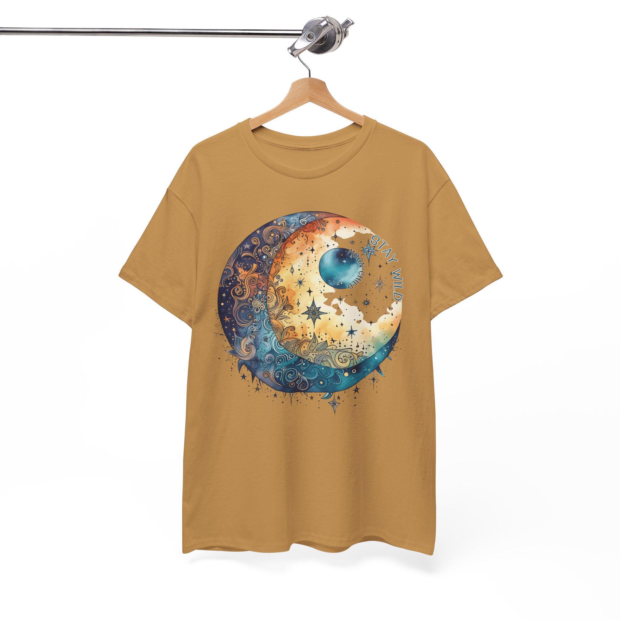 This celestial graphic tee features a hand-painted yin yang-inspired sun and moon design surrounded by soft watercolor stars and swirling galaxy textures. The rich, rust-toned cotton makes the golden highlights glow while the deep blues and cosmic details add depth and contrast.
