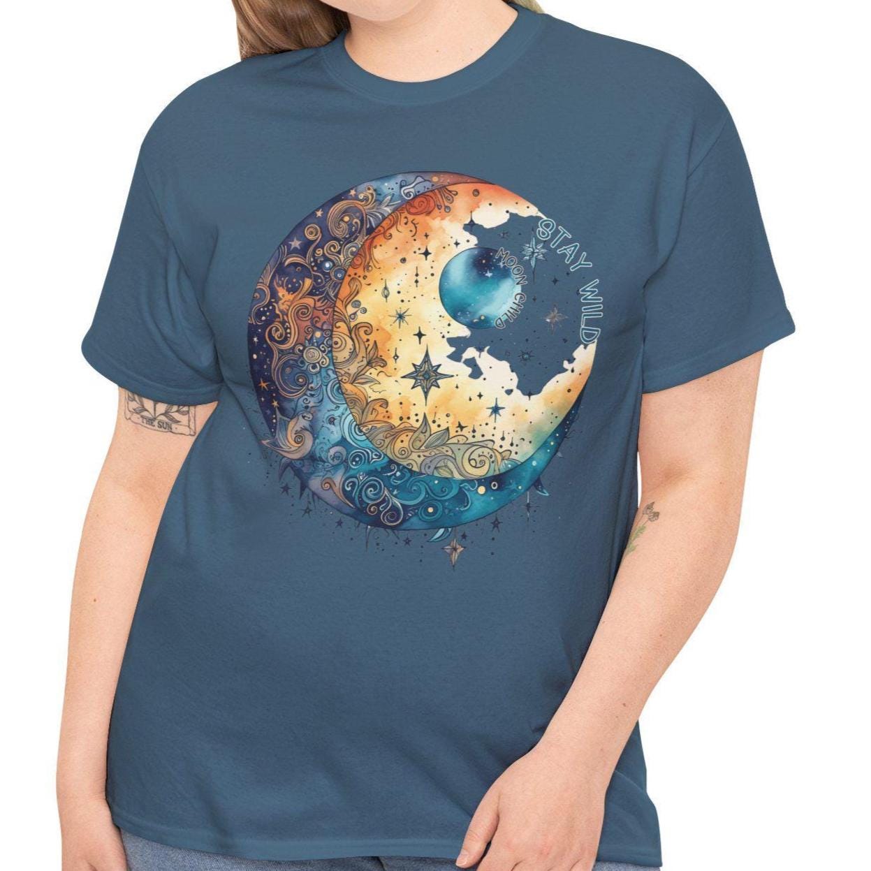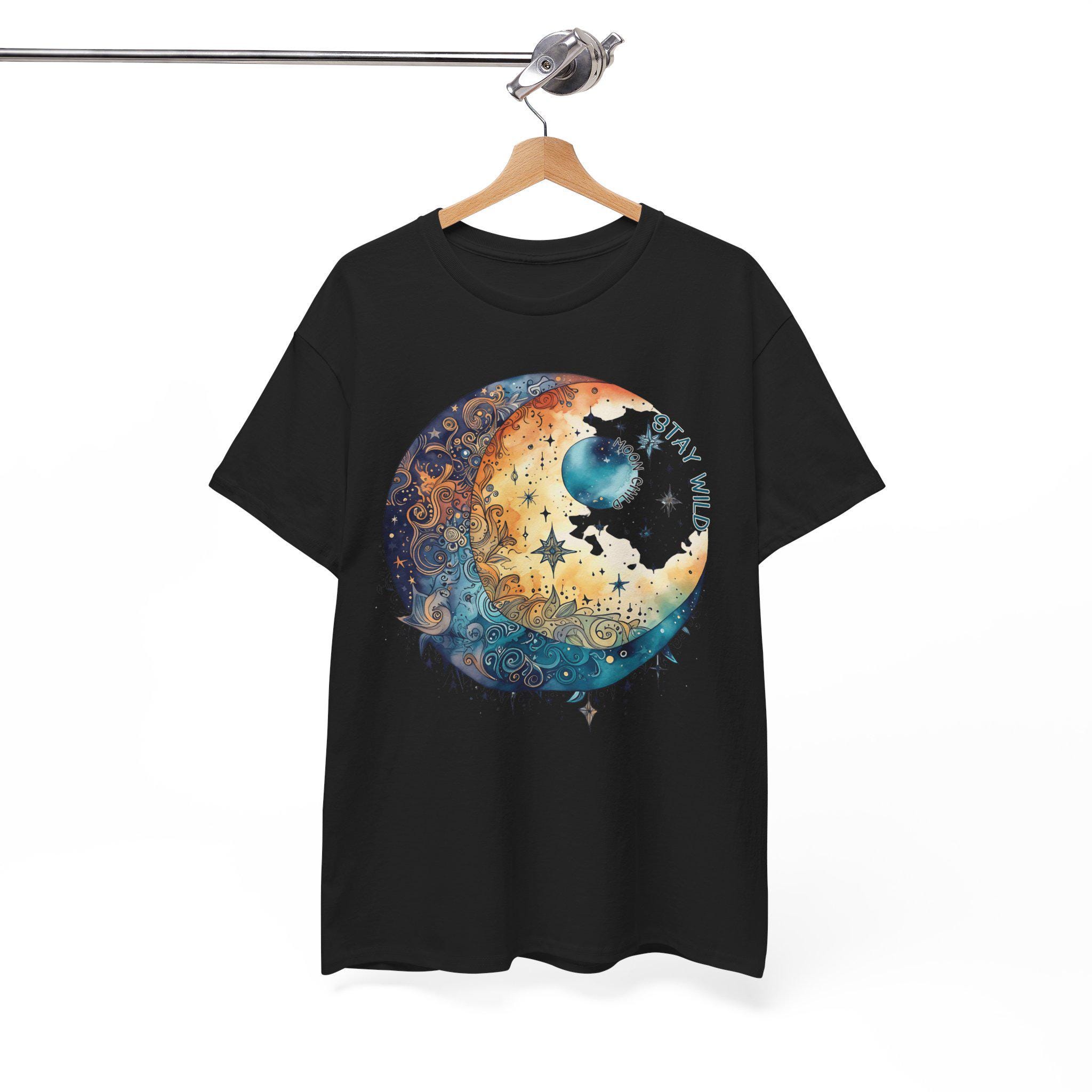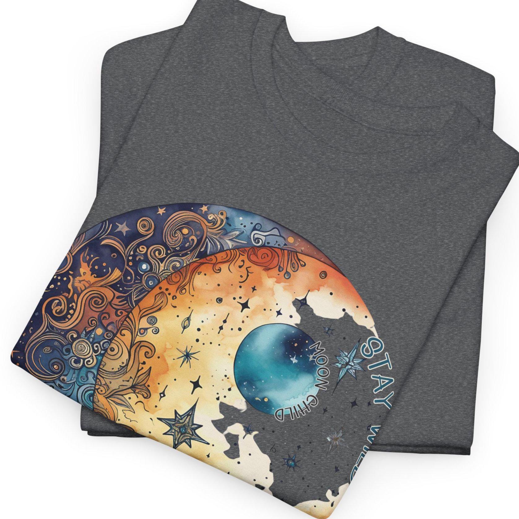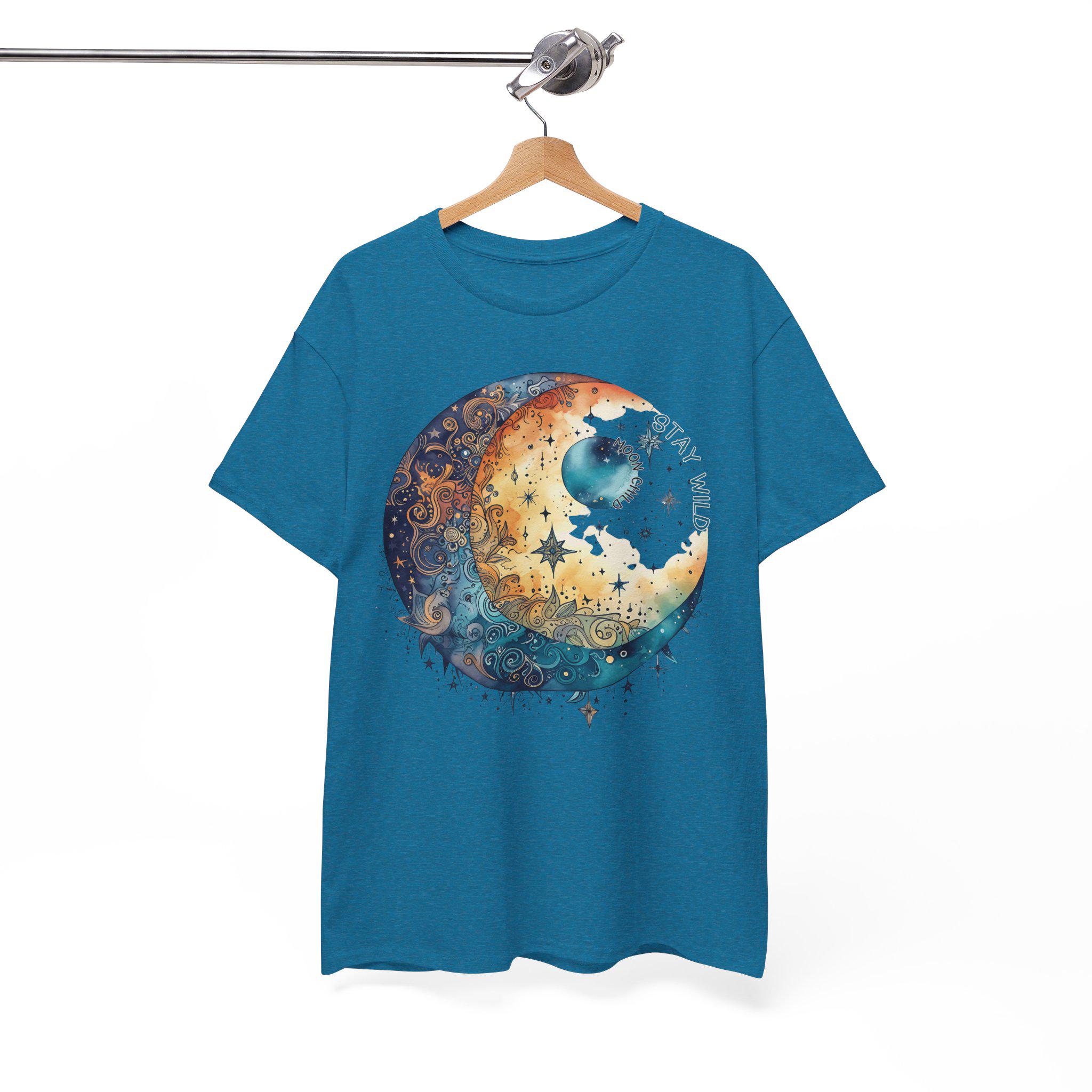 This celestial graphic tee features a hand-painted yin yang-inspired sun and moon design surrounded by soft watercolor stars and swirling galaxy textures. The rich, rust-toned cotton makes the golden highlights glow while the deep blues and cosmic details add depth and contrast.