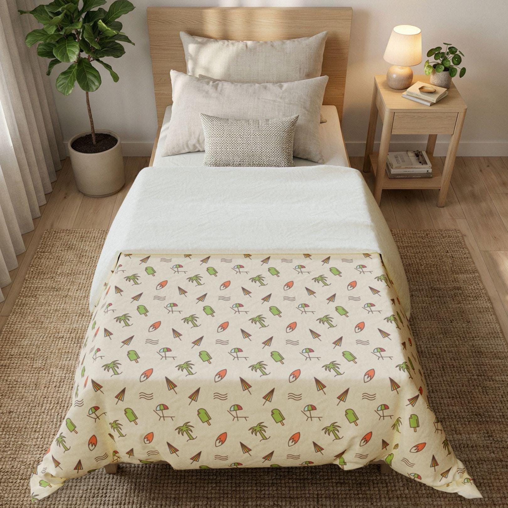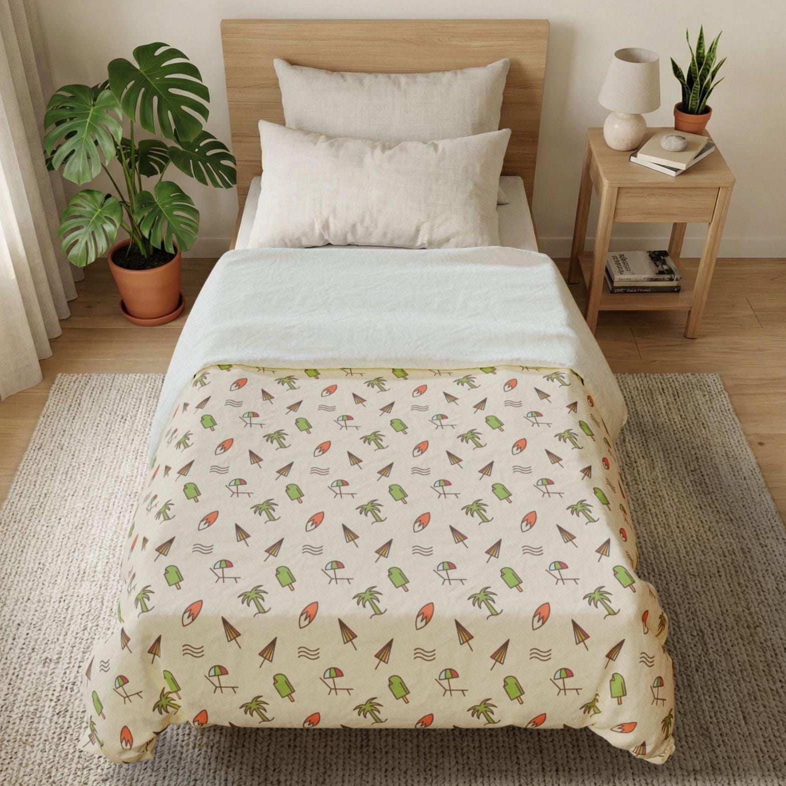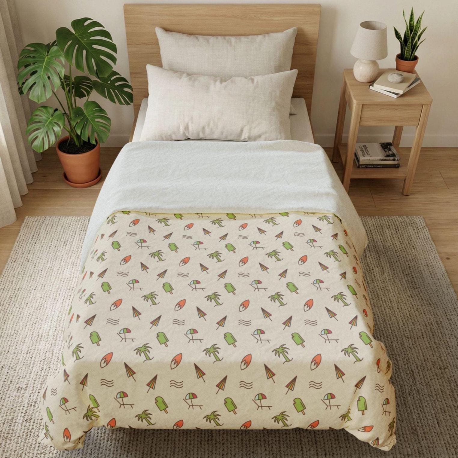 This retro beach duvet cover features a playful summer pattern with palm trees, surfboards, popsicles, beach umbrellas, and ocean wave icons on a soft neutral background. It’s the perfect statement piece for coastal bedrooms, beach house decor, dorm rooms, teen spaces, or anyone who lives for summer vibes year-round.